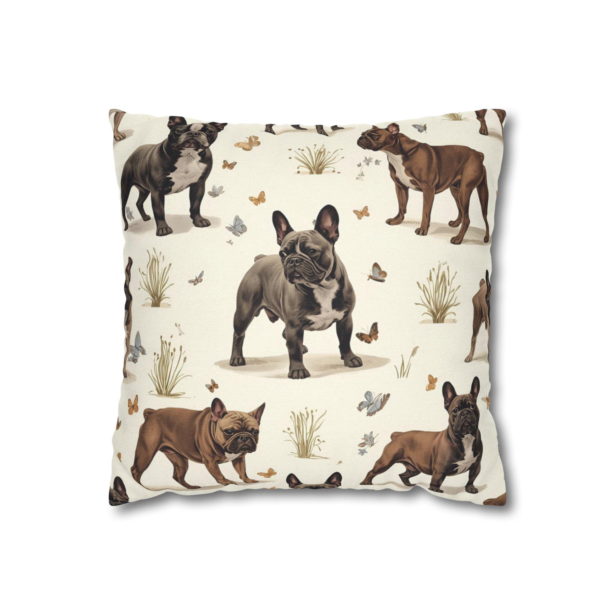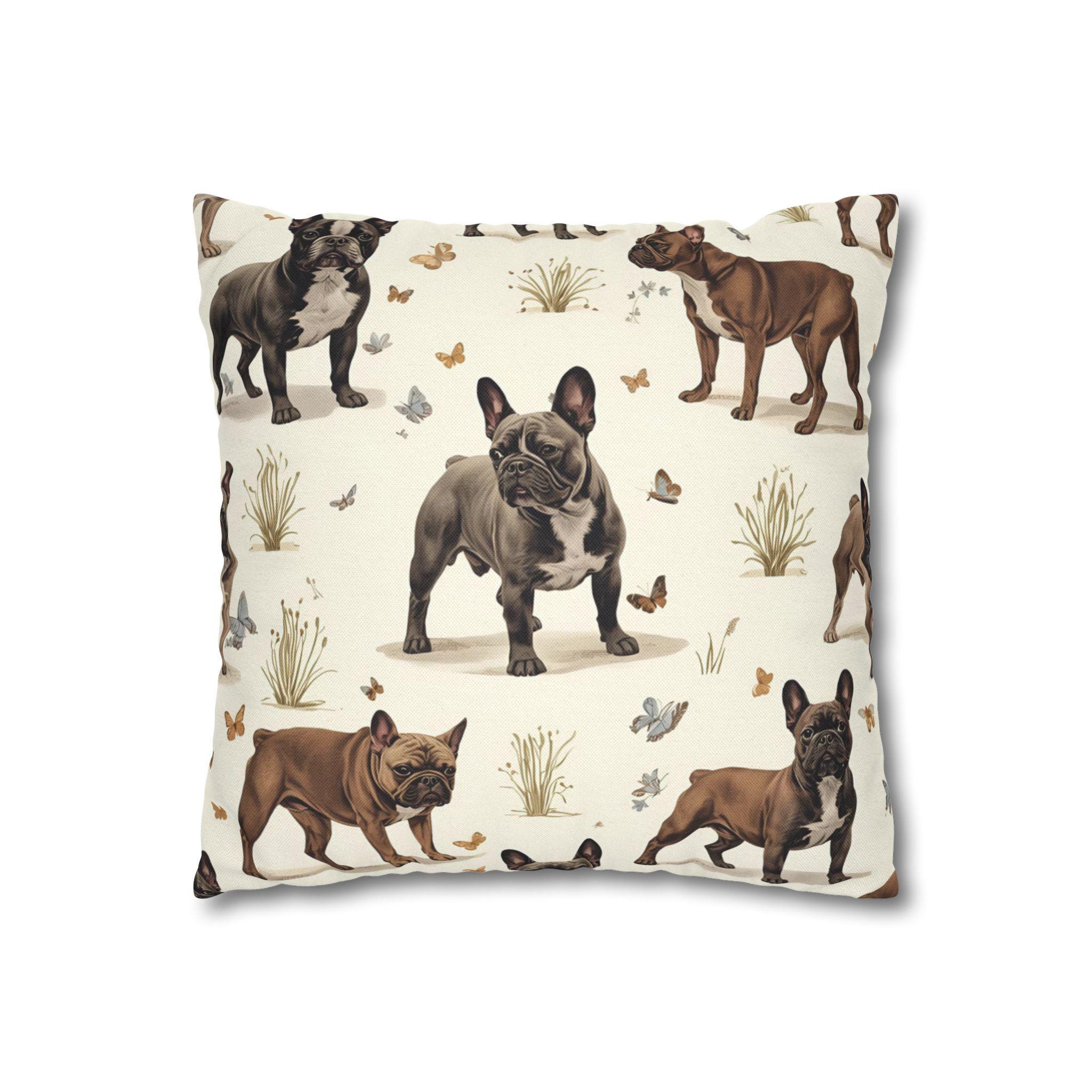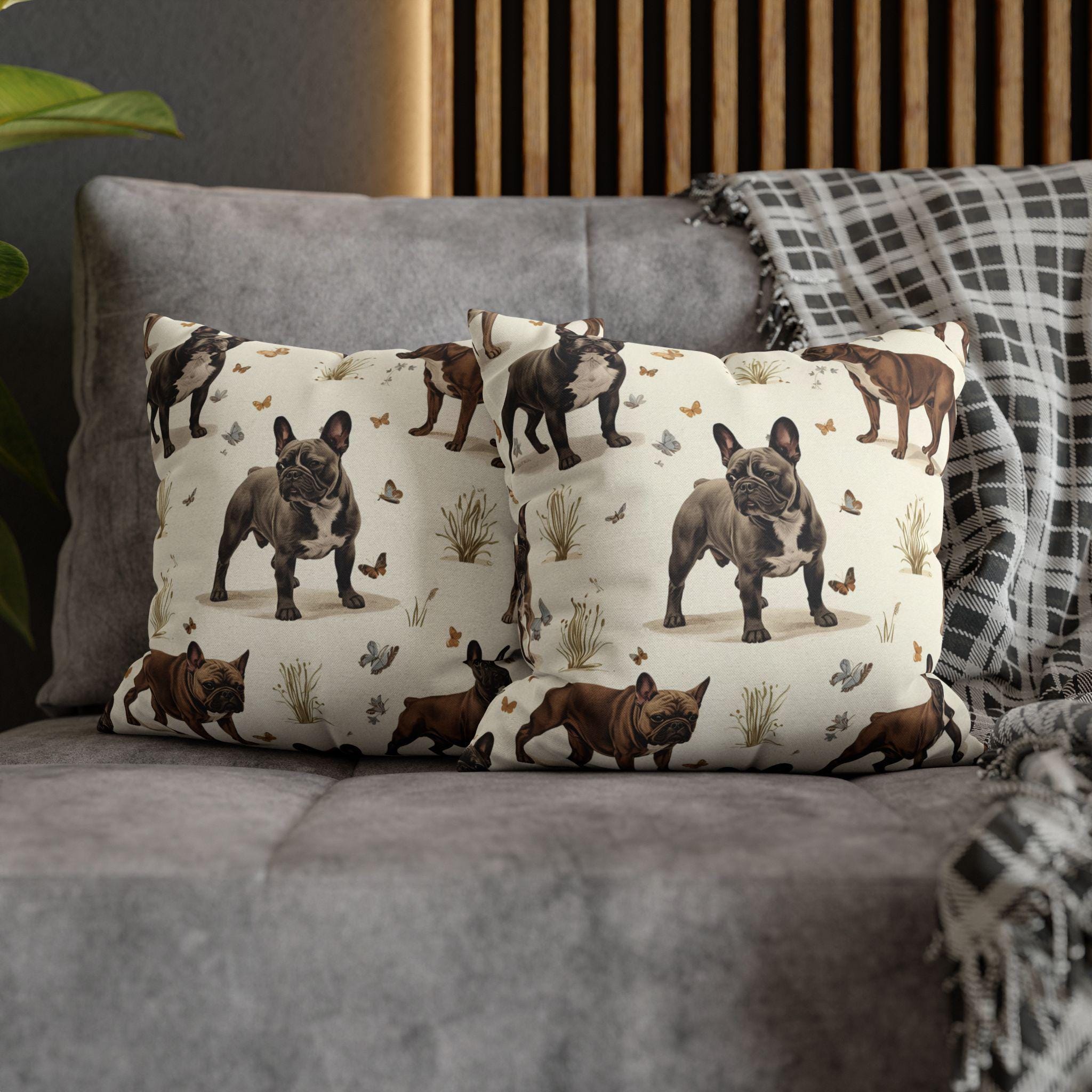 Vintage natural history illustration style pillowcase featuring realistic French Bulldog in side and standing poses with small grass butterflies. This unique pillowcase adds a touch of charm to your home decor, perfect for dog lovers and nature enthusiasts. Ideal for decorating your living room or bedroom, especially during dog-related holidays or animal appreciation days.