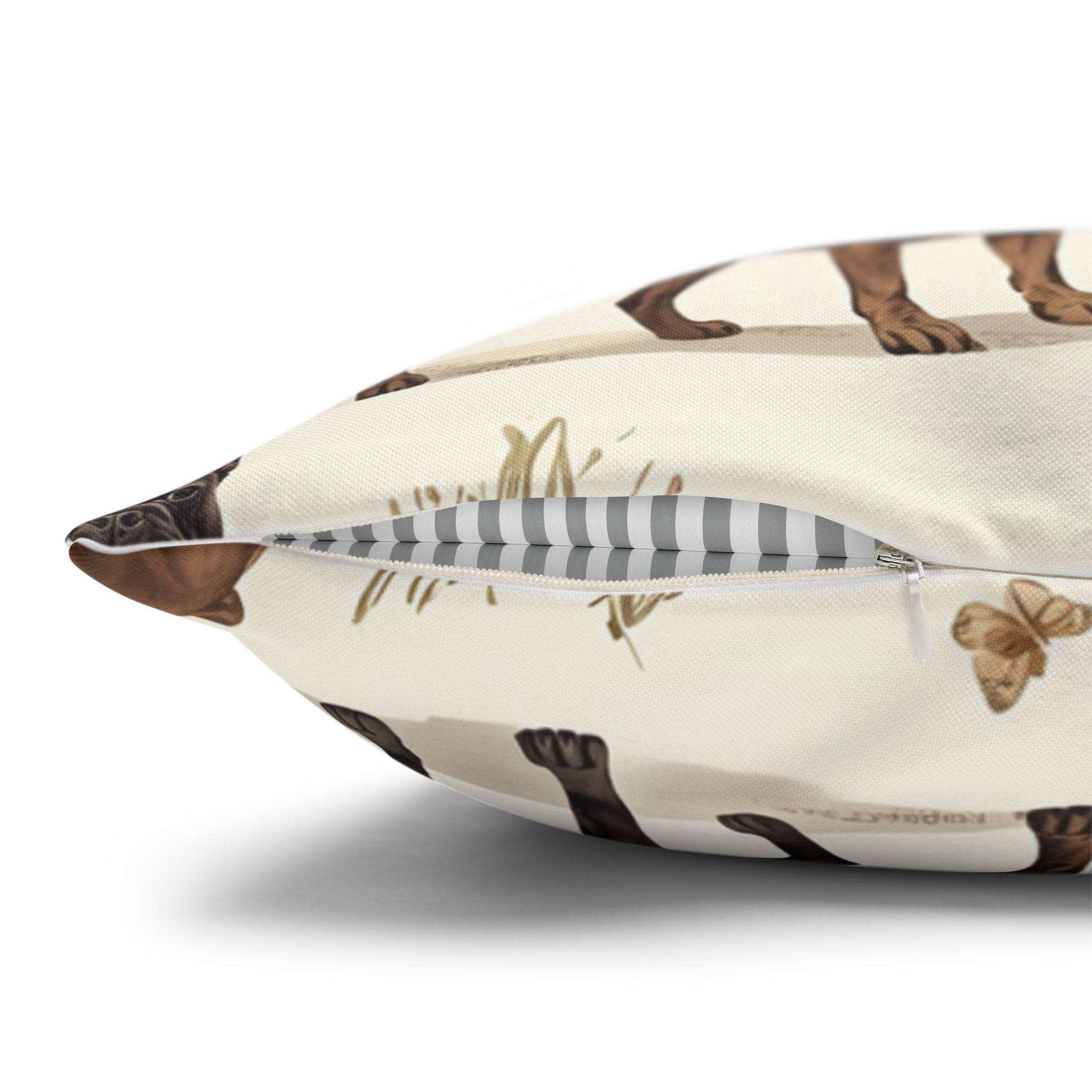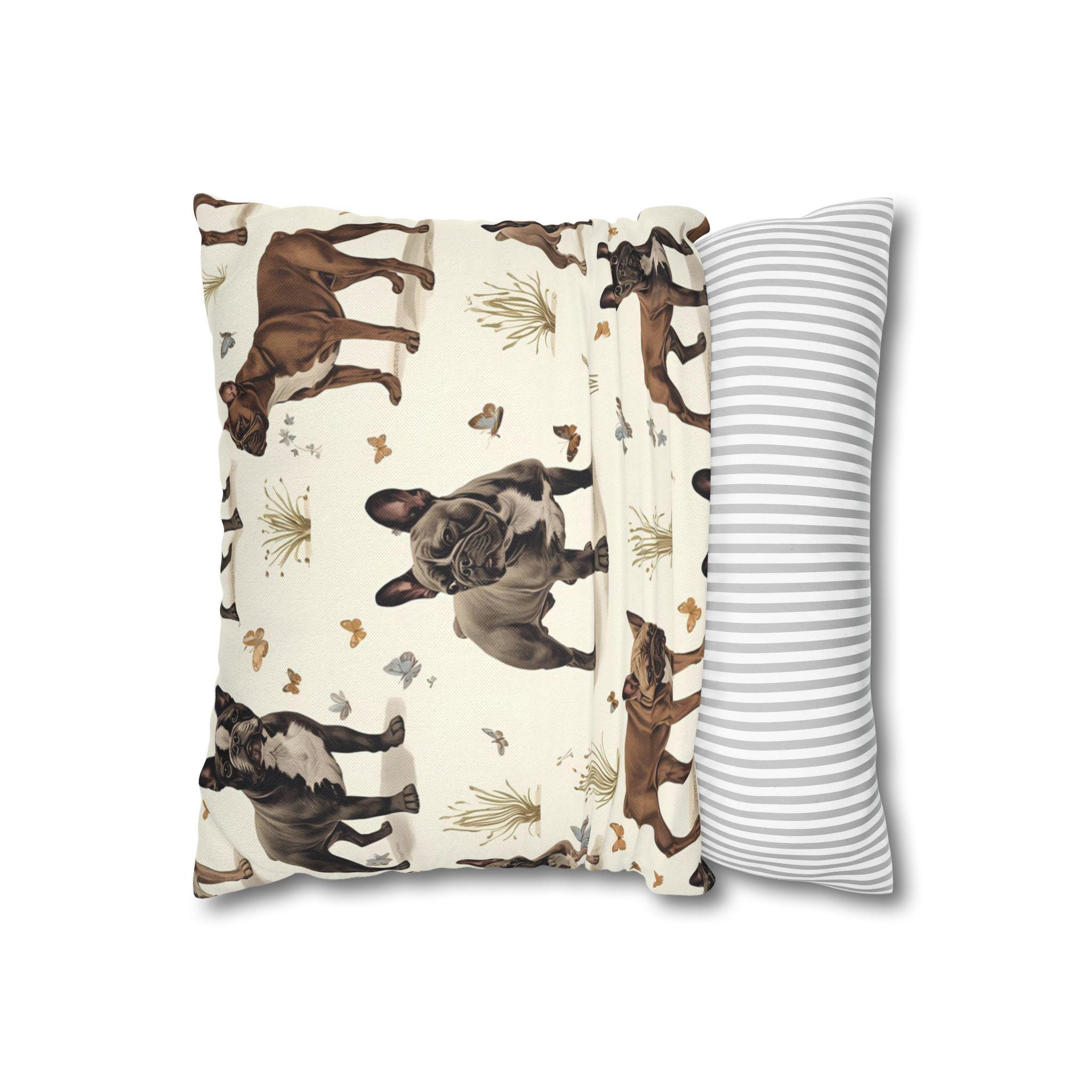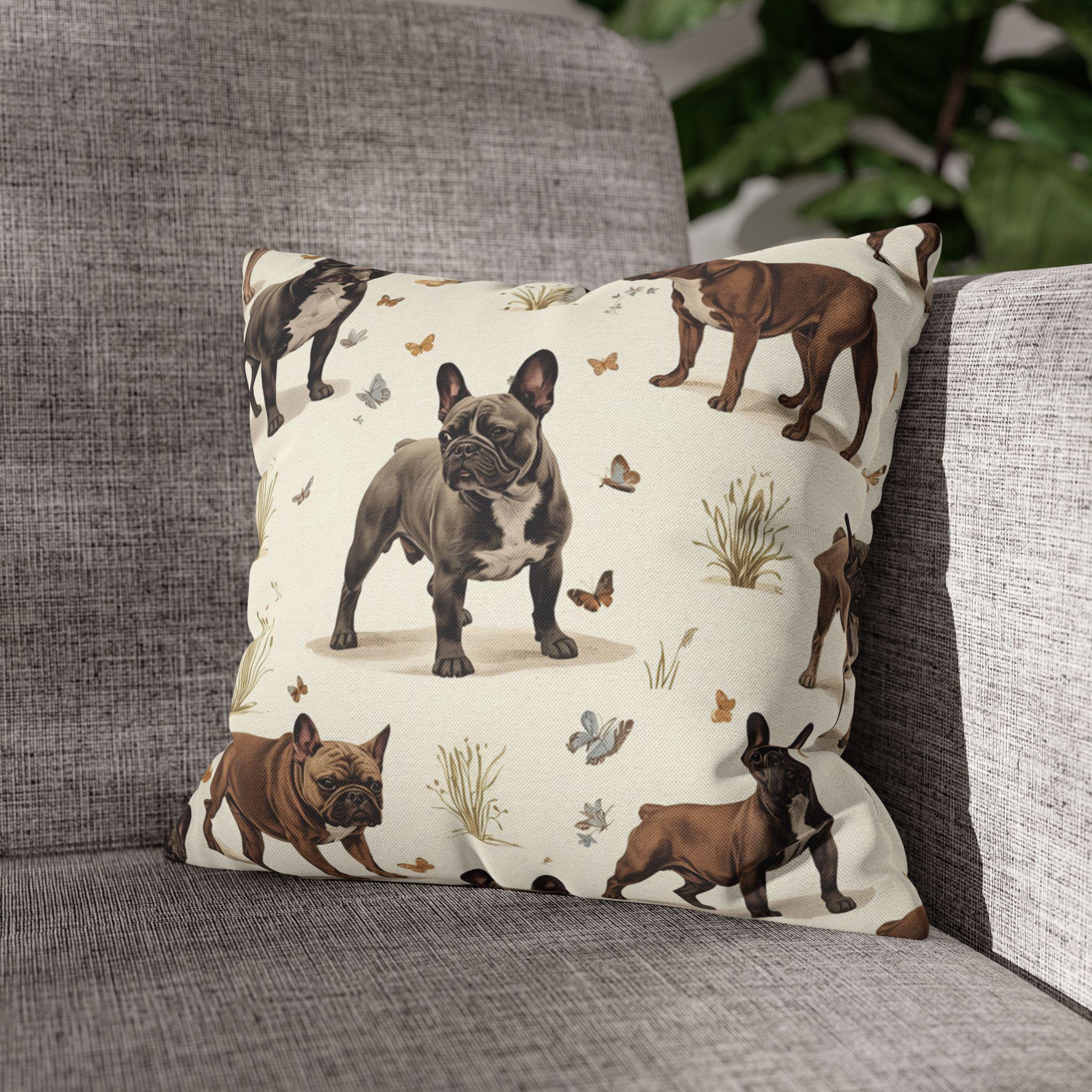 Vintage natural history illustration style pillowcase featuring realistic French Bulldog in side and standing poses with small grass butterflies. This unique pillowcase adds a touch of charm to your home decor, perfect for dog lovers and nature enthusiasts. Ideal for decorating your living room or bedroom, especially during dog-related holidays or animal appreciation days.