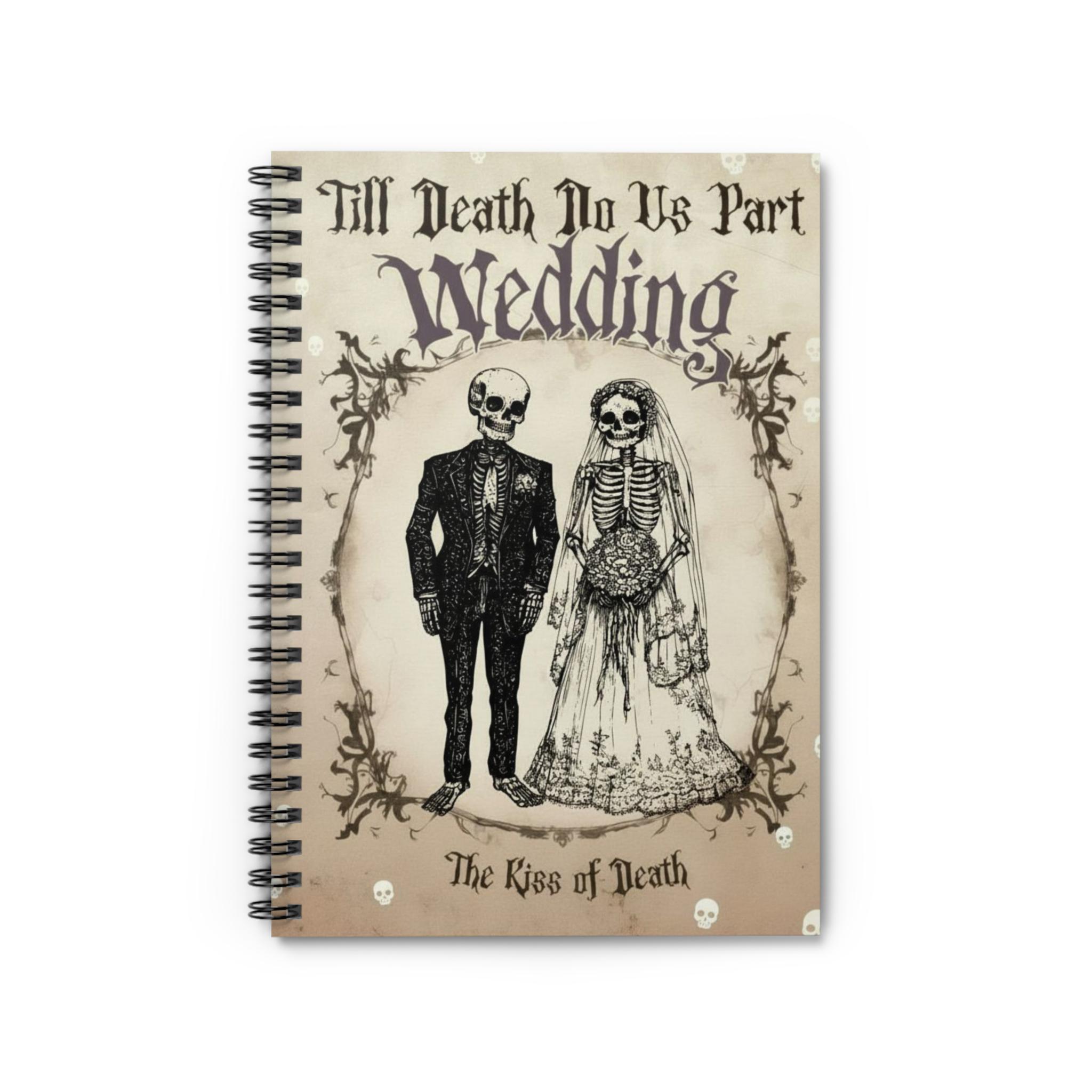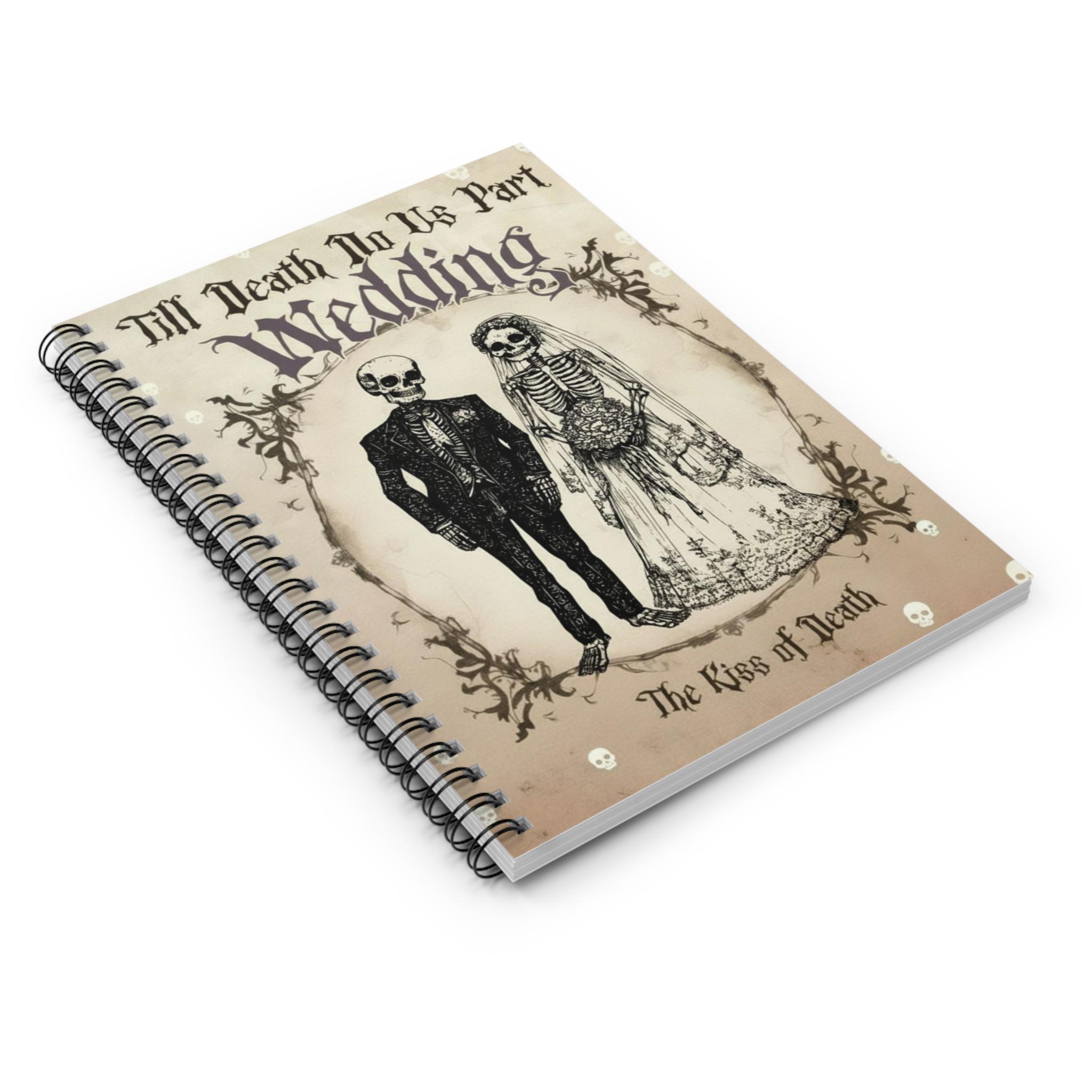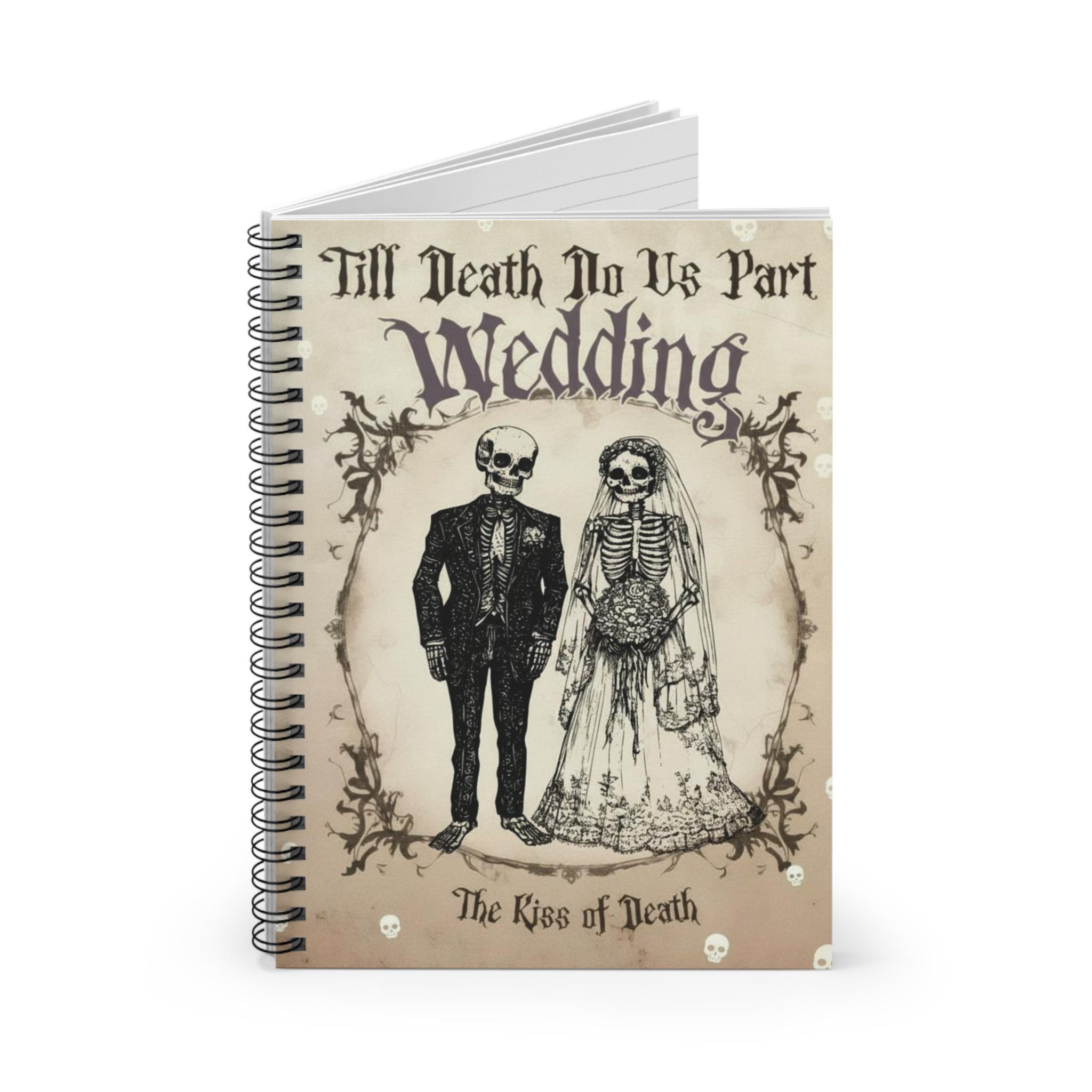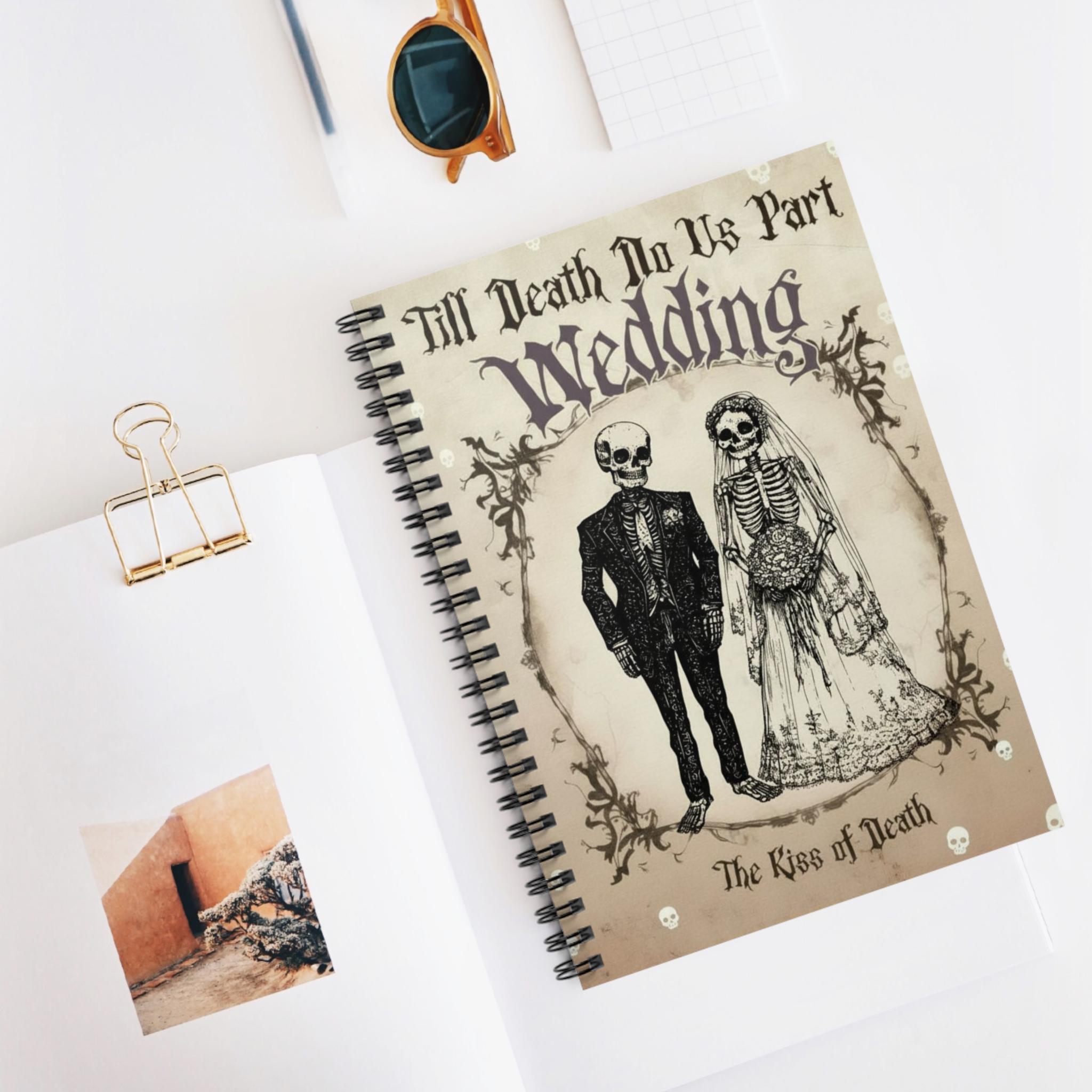 A wedding planner journal with words 'till death do us part', perfect for organizing your special day. This notebook gives off a romantic and sentimental vibe, ideal for couples planning their wedding. Relevant for weddings, engagements, and anniversaries.