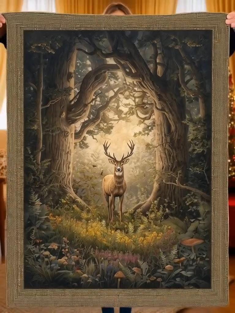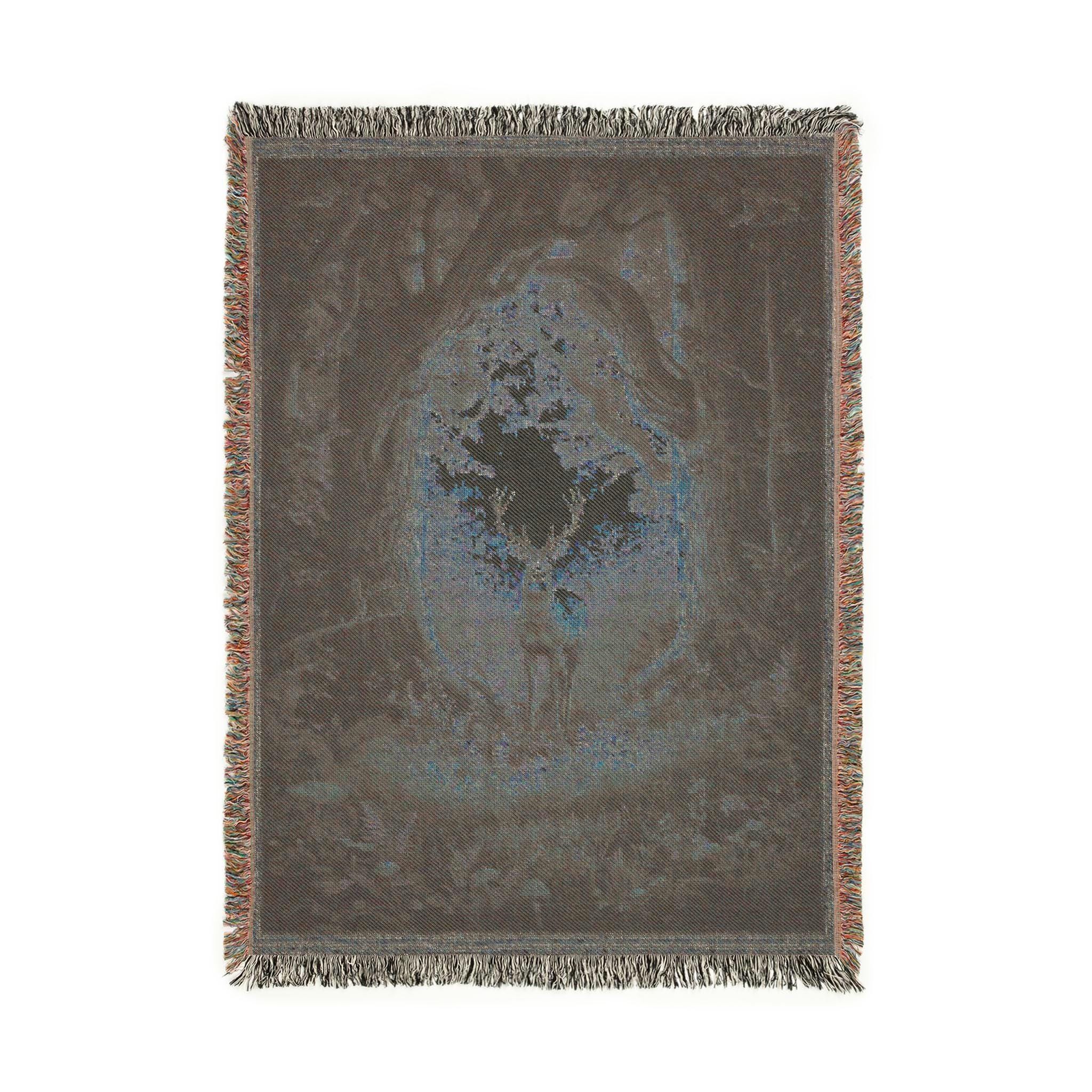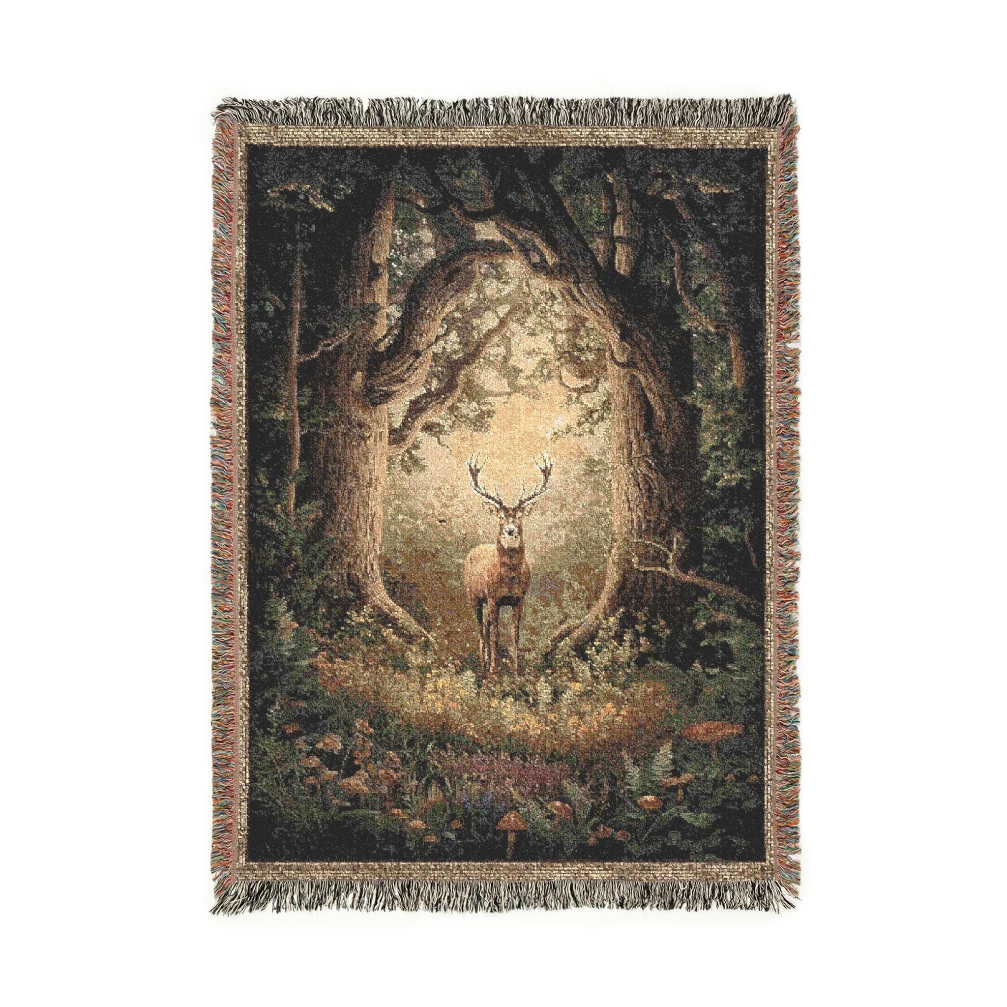 Midnight Forest Deer Woven Blanket - Dark Jacquard Throw with Fringe