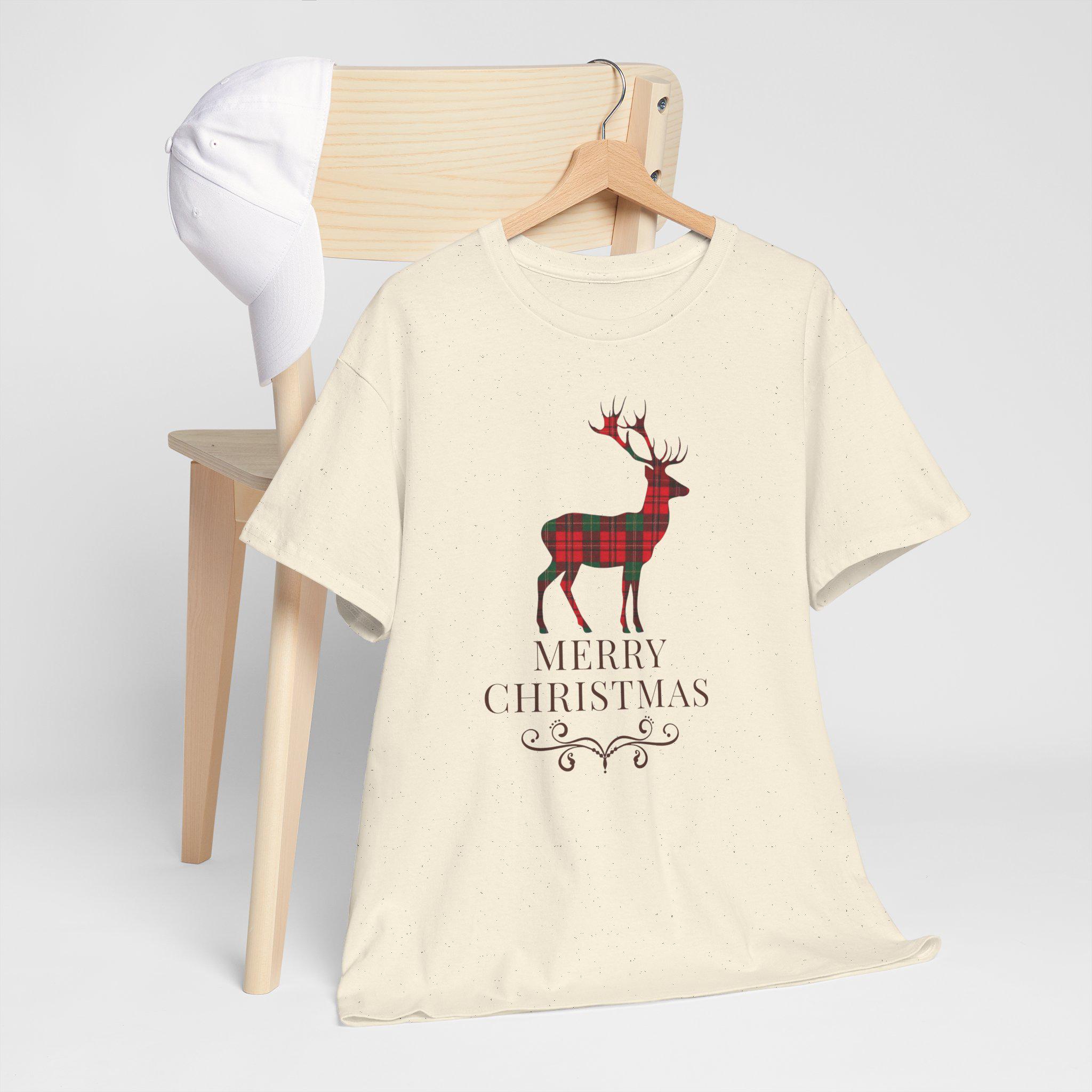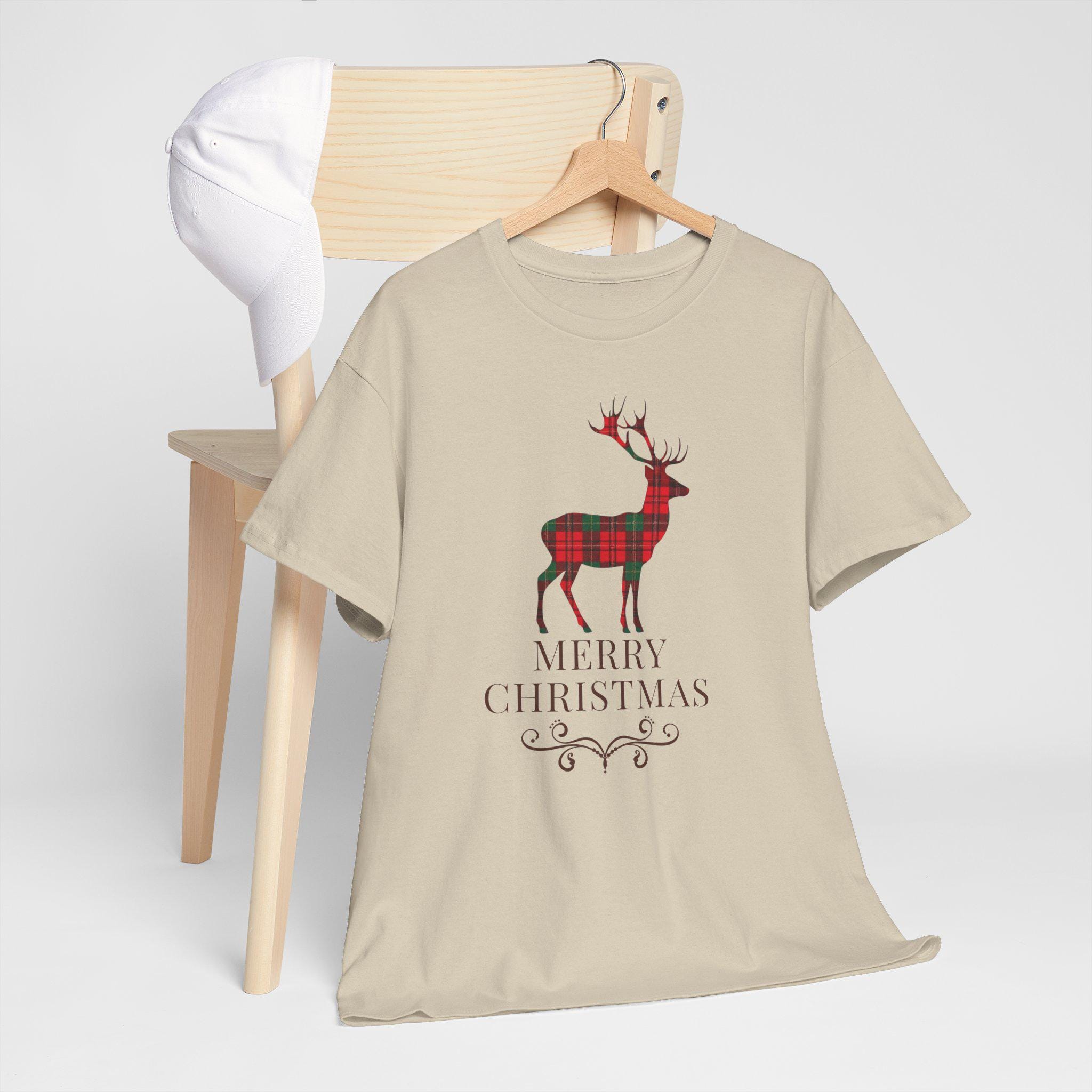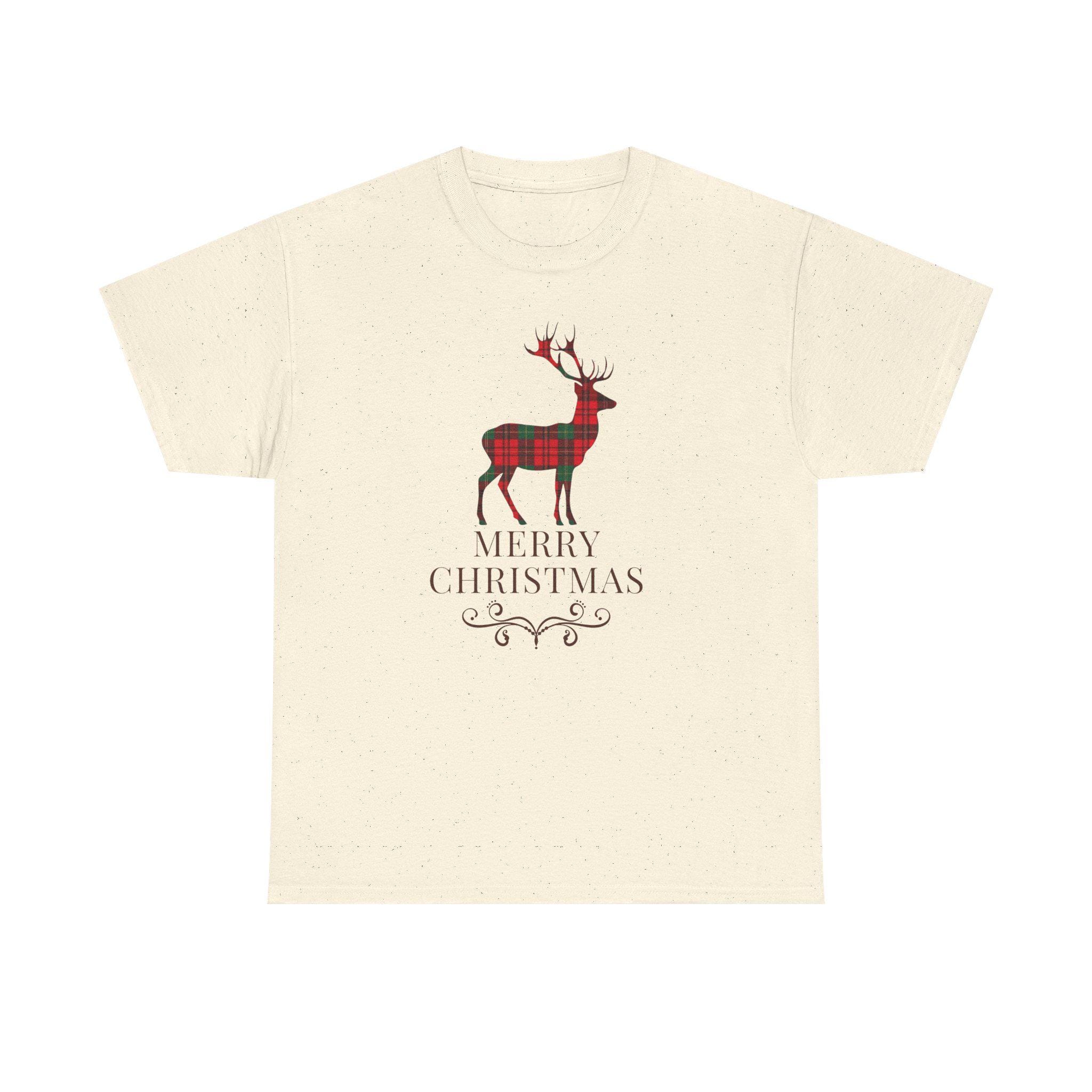 This cozy cotton tee brings quiet holiday charm to everyday wear. A plaid-styled stag stands centered above delicate lettering and a small decorative flourish, evoking slow winter mornings, warm kitchens, and the soft hush of fresh snow outside. Lightweight but sturdy, the shirt wears like a familiar friend — easy to layer under a cardigan or pair with jeans for a low-key seasonal look. It’s designed for someone who favors understated festive details over loud logos, and who wants a comfortable, durable piece that slips naturally into their December routines — from tree-trimming to neighborhood caroling.