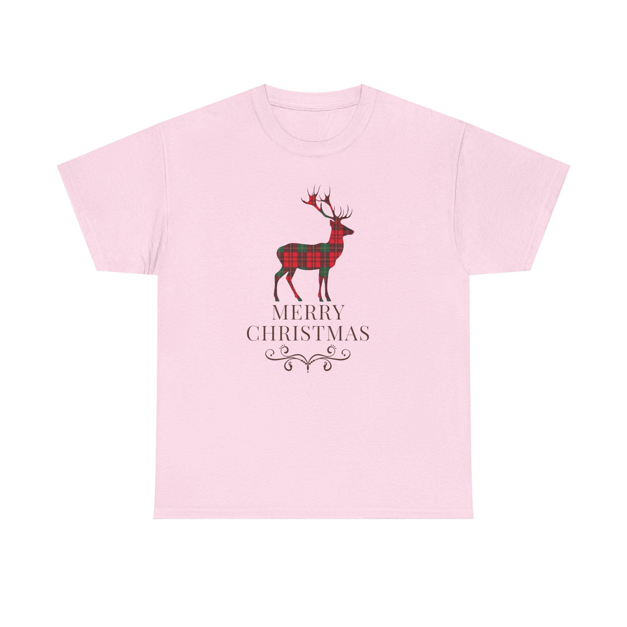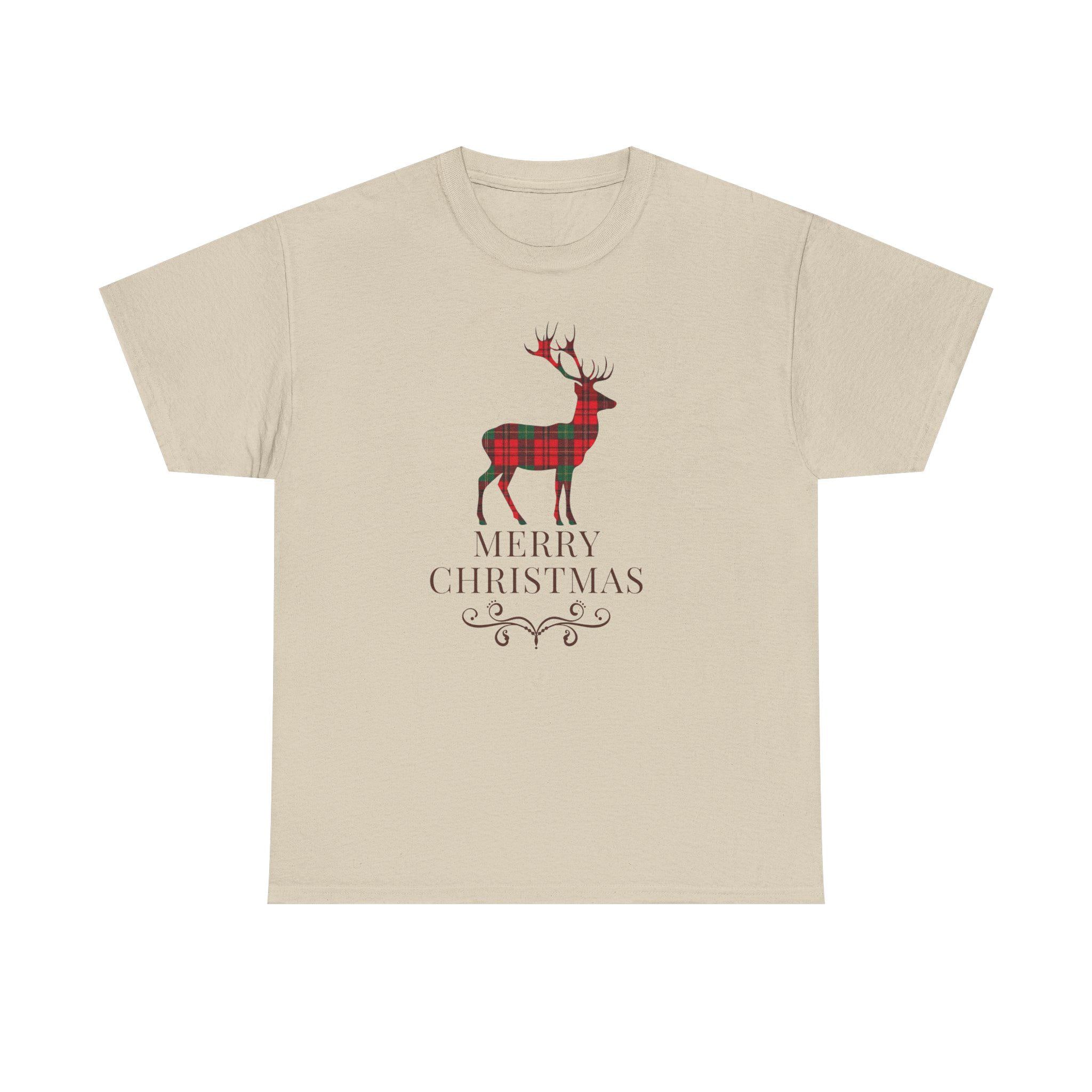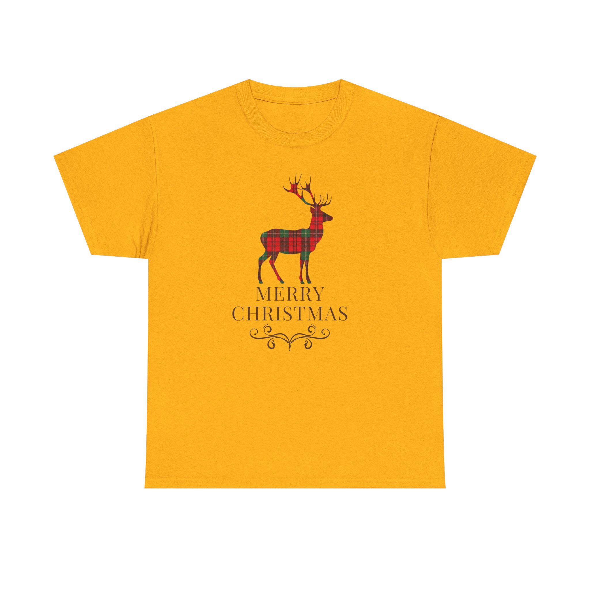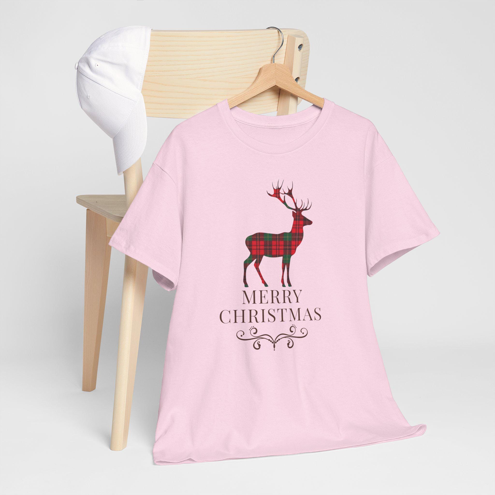 This cozy cotton tee brings quiet holiday charm to everyday wear. A plaid-styled stag stands centered above delicate lettering and a small decorative flourish, evoking slow winter mornings, warm kitchens, and the soft hush of fresh snow outside. Lightweight but sturdy, the shirt wears like a familiar friend — easy to layer under a cardigan or pair with jeans for a low-key seasonal look. It’s designed for someone who favors understated festive details over loud logos, and who wants a comfortable, durable piece that slips naturally into their December routines — from tree-trimming to neighborhood caroling.