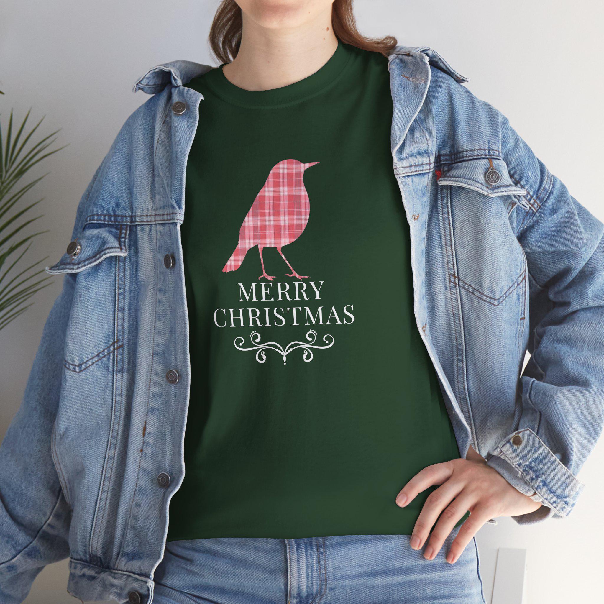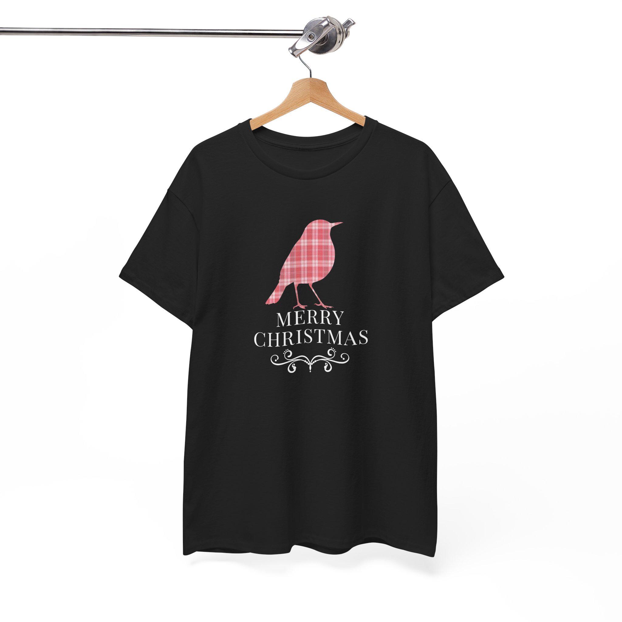 This cozy cotton tee brings quiet holiday charm to everyday wear. A plaid-styled robin stands centered above delicate lettering and a small decorative flourish, evoking slow winter mornings, warm kitchens, and the soft hush of fresh snow outside. Lightweight but sturdy, the shirt wears like a familiar friend — easy to layer under a cardigan or pair with jeans for a low-key seasonal look. It’s designed for someone who favors understated festive details over loud logos, and who wants a comfortable, durable piece that slips naturally into their December routines — from tree-trimming to neighborhood caroling.