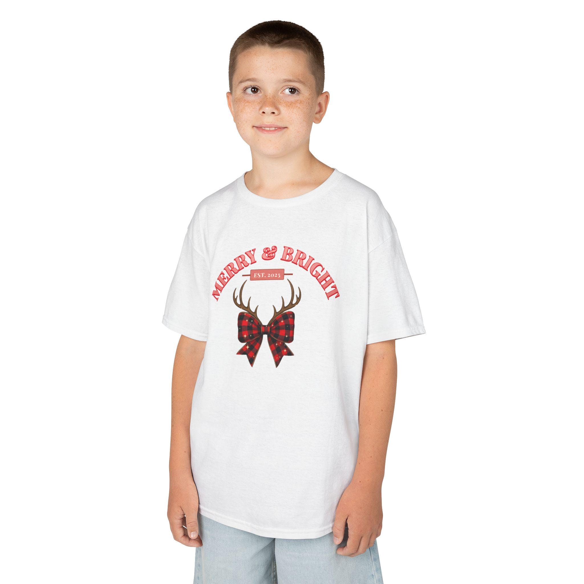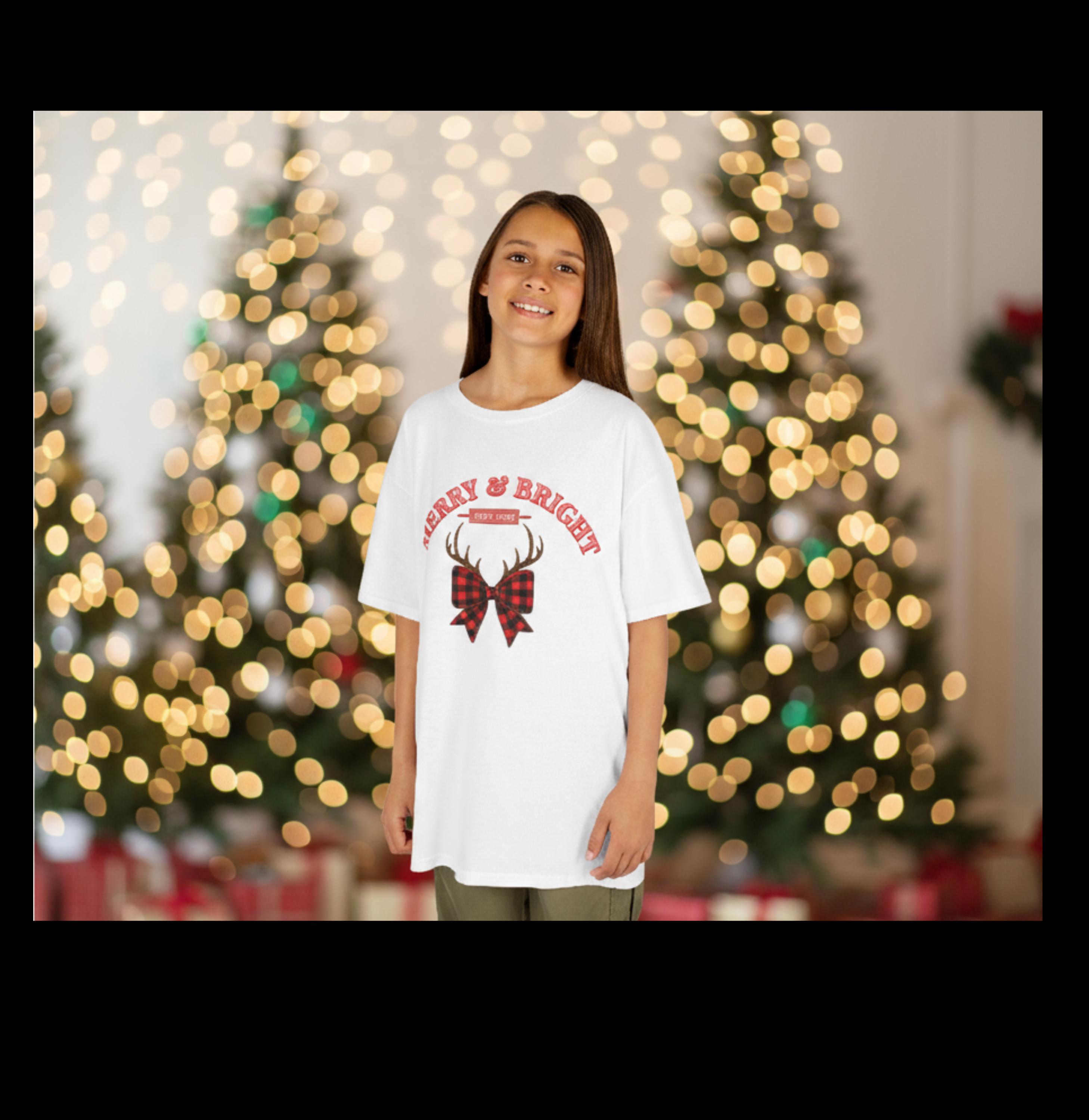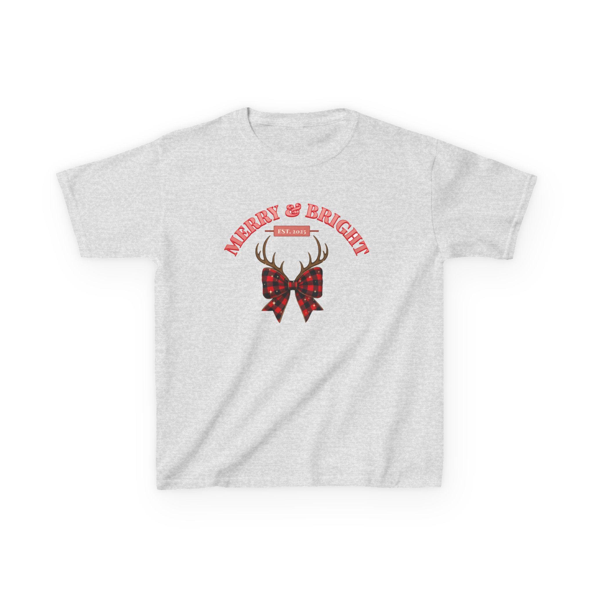 Soft, simple, and quietly festive — this kids tee carries a tiny winter story. A pair of antlers rests above a plaid bow, with the curved greeting “Merry & Bright” above it. The midweight US cotton feels gentle on little skin and holds color well through holiday play and wash cycles. It sits true to a classic crew fit so it layers easily under sweaters or wears alone on cozy mornings by the tree. Subtle holiday style for everyday kids’ adventures.