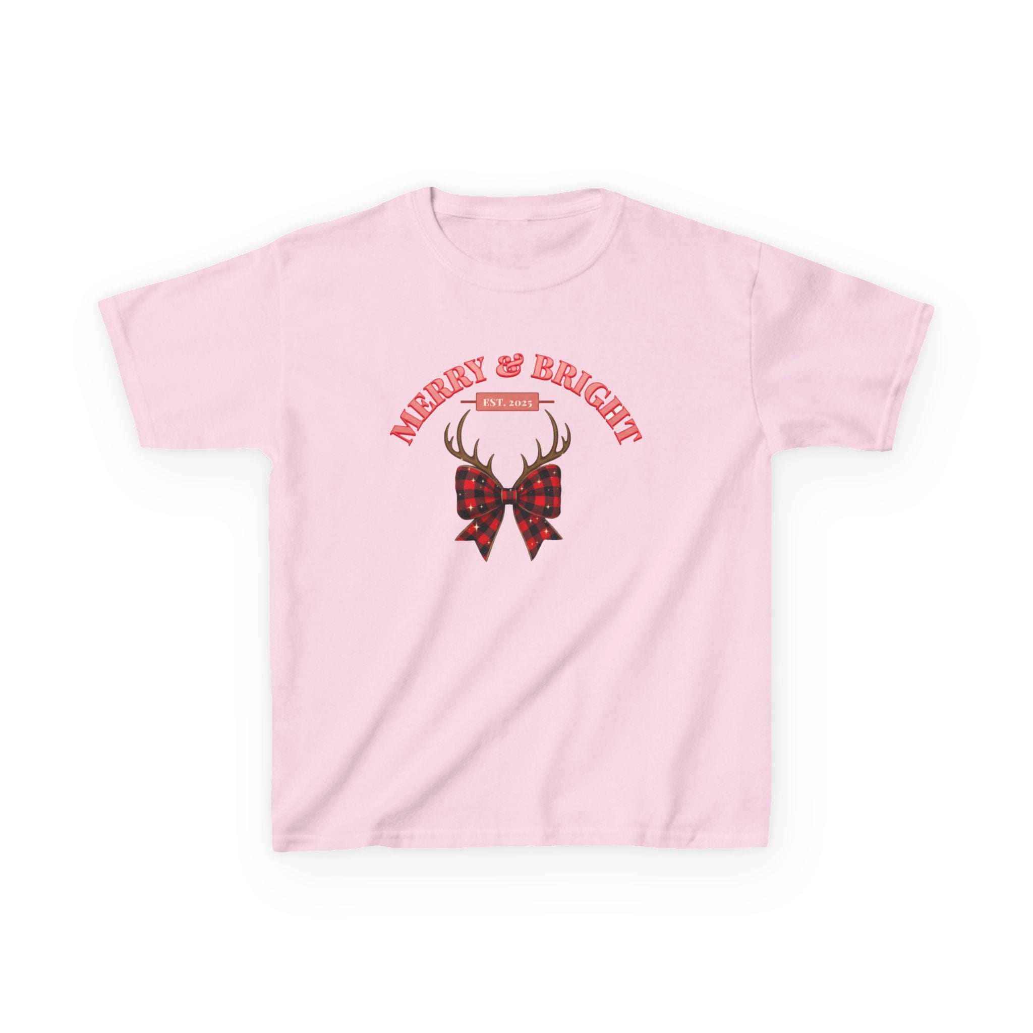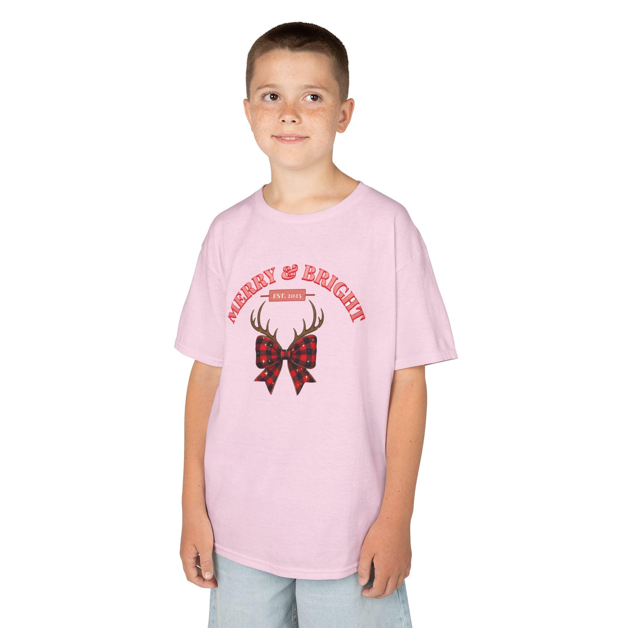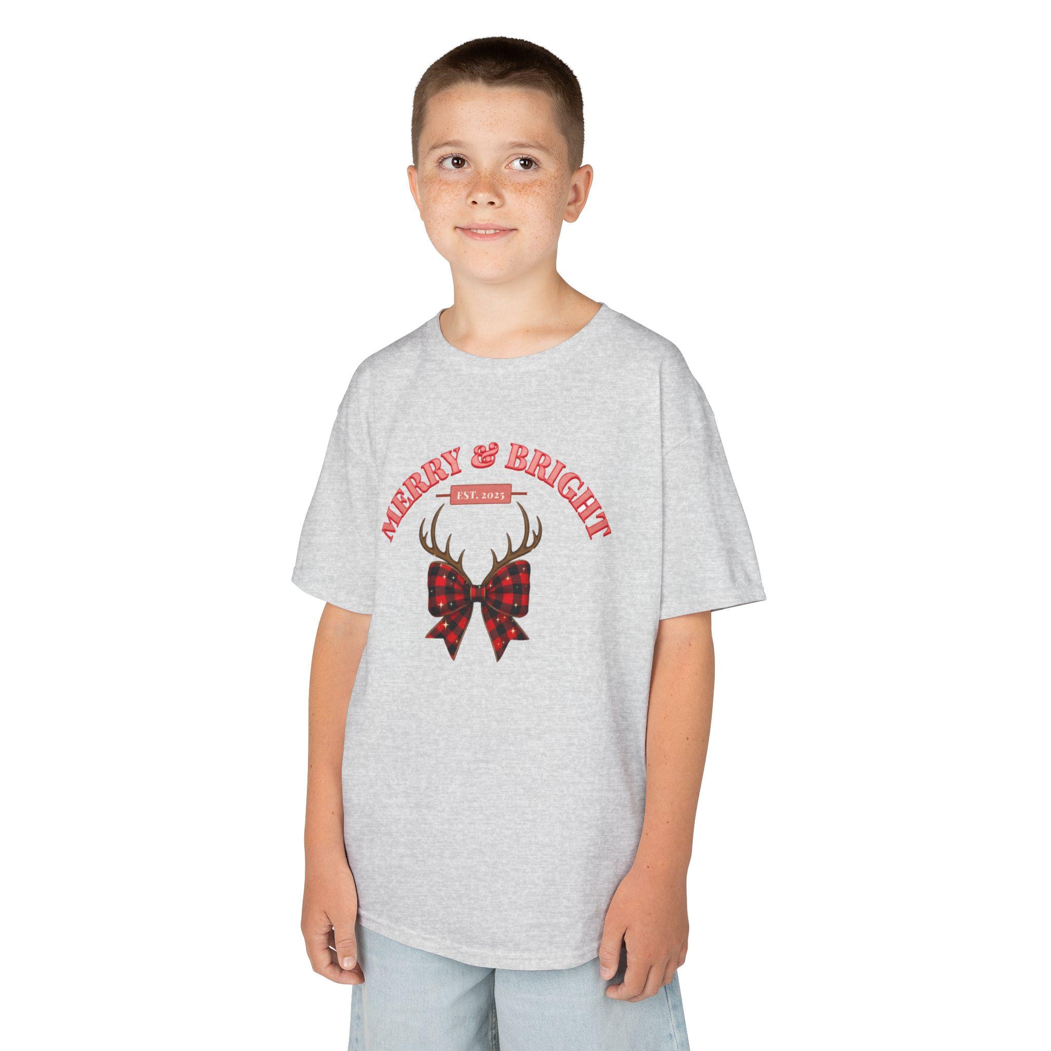 Soft, simple, and quietly festive — this kids tee carries a tiny winter story. A pair of antlers rests above a plaid bow, with the curved greeting “Merry & Bright” above it. The midweight US cotton feels gentle on little skin and holds color well through holiday play and wash cycles. It sits true to a classic crew fit so it layers easily under sweaters or wears alone on cozy mornings by the tree. Subtle holiday style for everyday kids’ adventures.