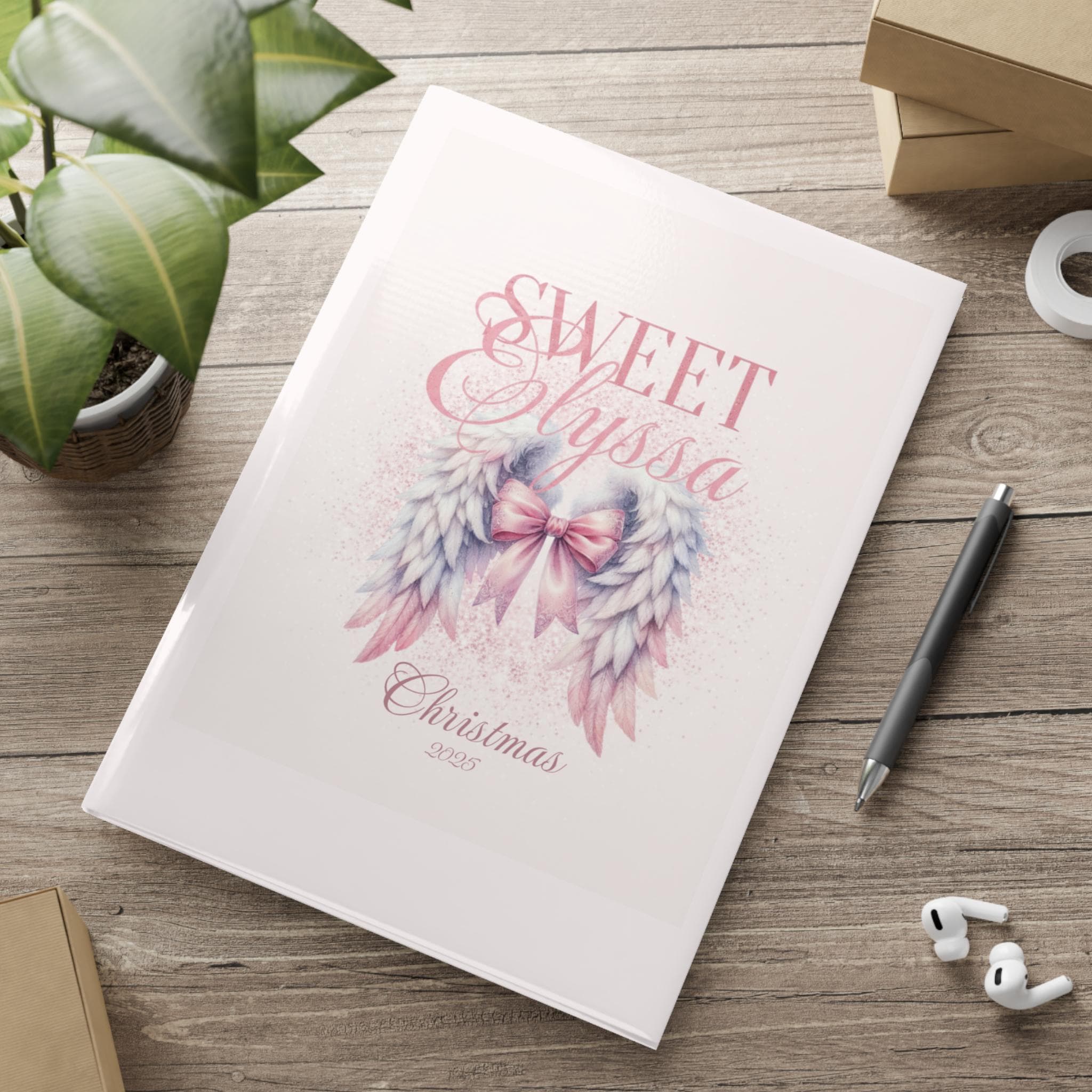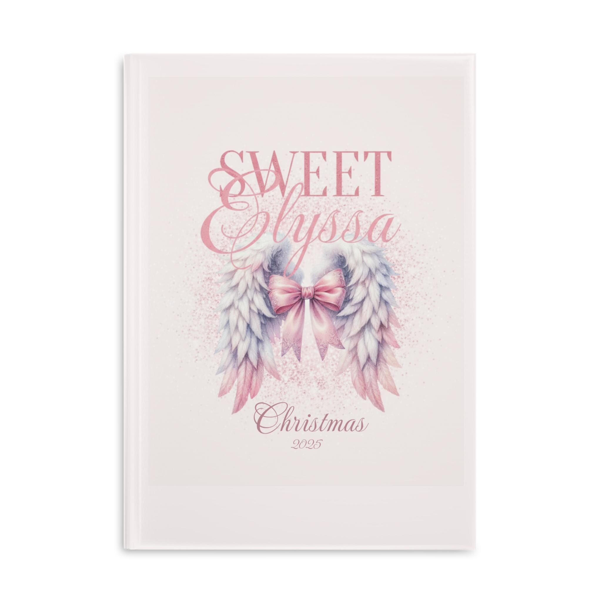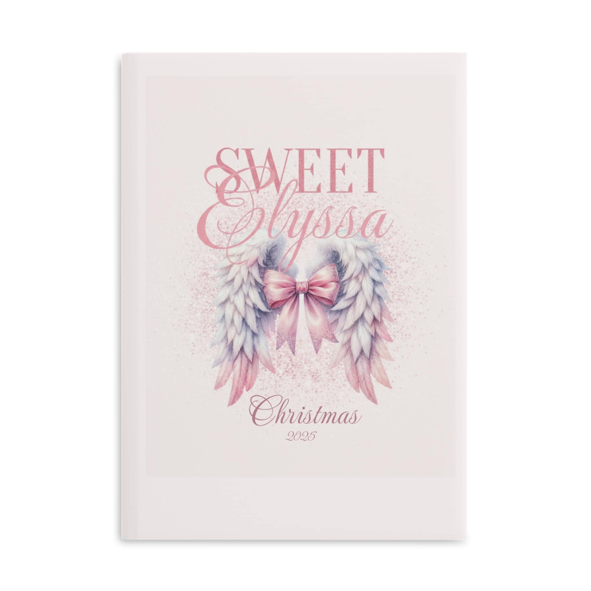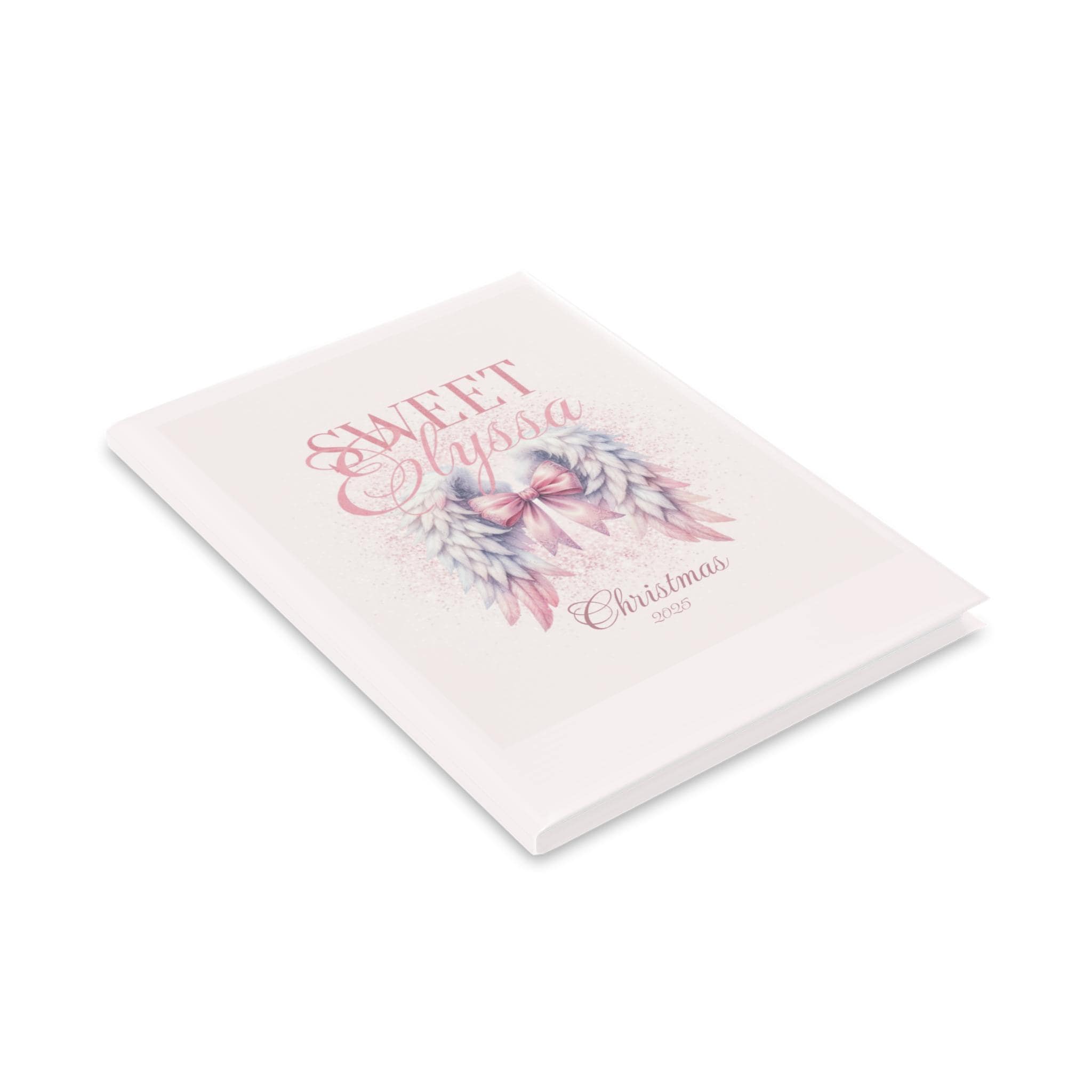 A soft, puffy-covered hardcover journal finished in delicate blush tones and gentle, watercolor-style artwork. The cover shows pastel angel wings tied with a satin bow and a subtle holiday script, making the notebook feel like a quietly sentimental keepsake. Inside, you’ll find 128 pages of 80 gsm paper in your choice of blank, dotted, or ruled layouts—handy for sketches, lists, letters, or seasonal reflections. The casewrap binding and glossy or matte finish give the book a refined, durable feel while the padded cover invites touch and makes it comfortable to hold. Available in A5, B5, and A4 sizes to suit pocket, bag, or desk use.
