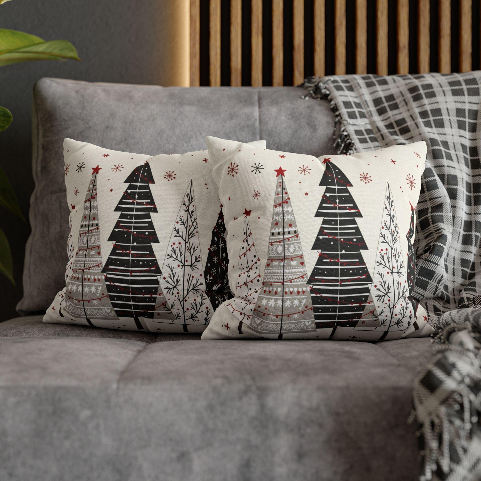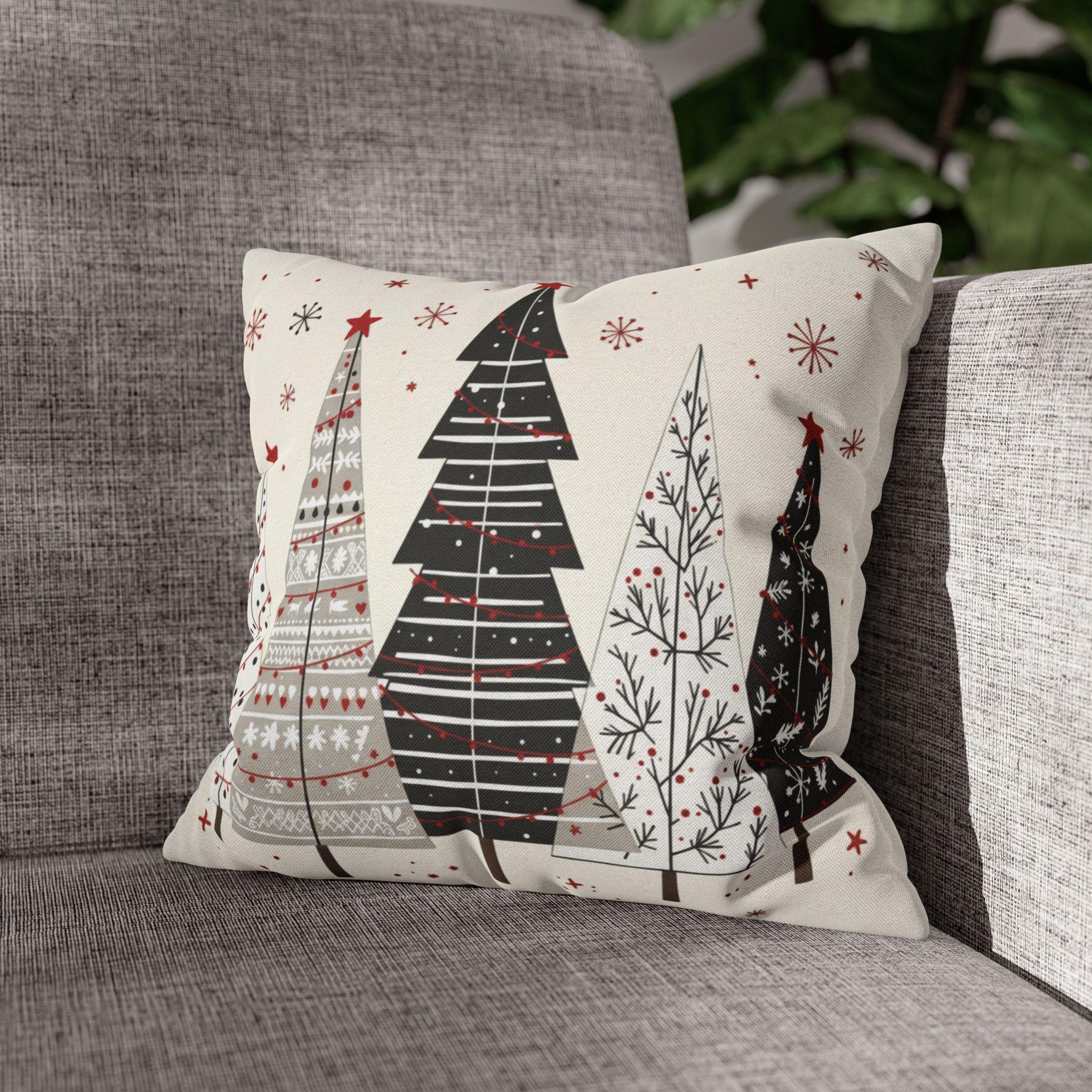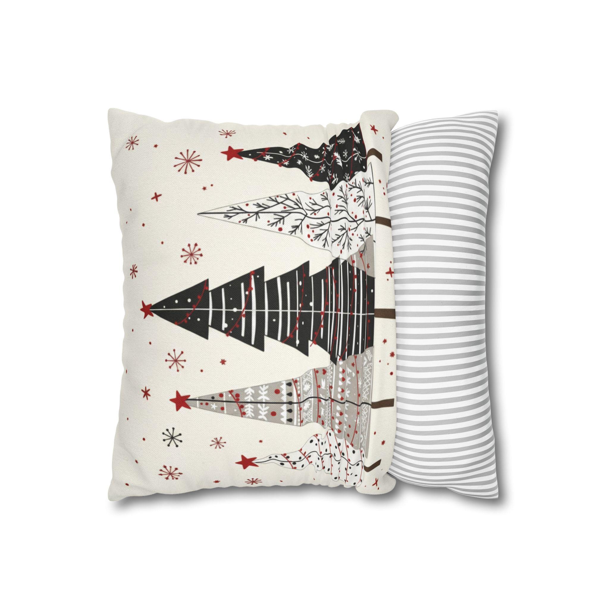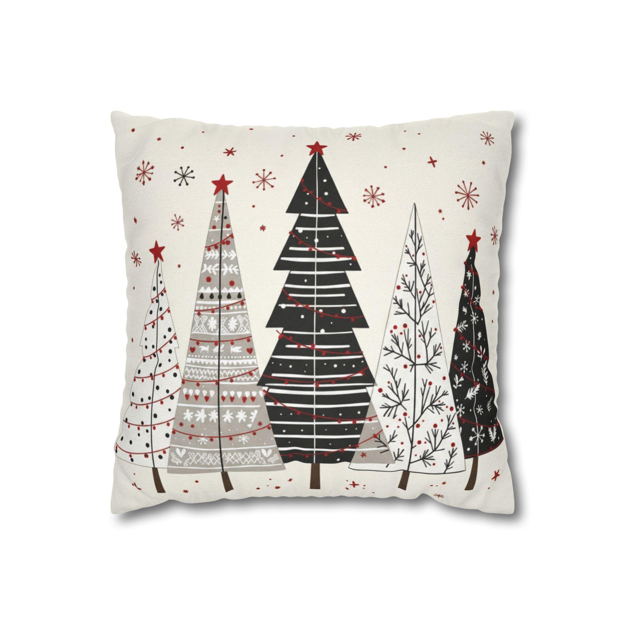 Soft, square pillow cover with a cozy, hand-illustrated forest of stylized Christmas trees on a warm cream background. The double-sided print keeps the design crisp and vibrant, while the spun polyester fabric holds its shape and resists wrinkles so the cover looks tidy without ironing. A concealed beige zipper blends into the edge for a seamless look. Slip it over your own insert to add vintage-holiday charm to a sofa, armchair, or entry bench — it brings quiet, nostalgic winter warmth to any comfy corner.