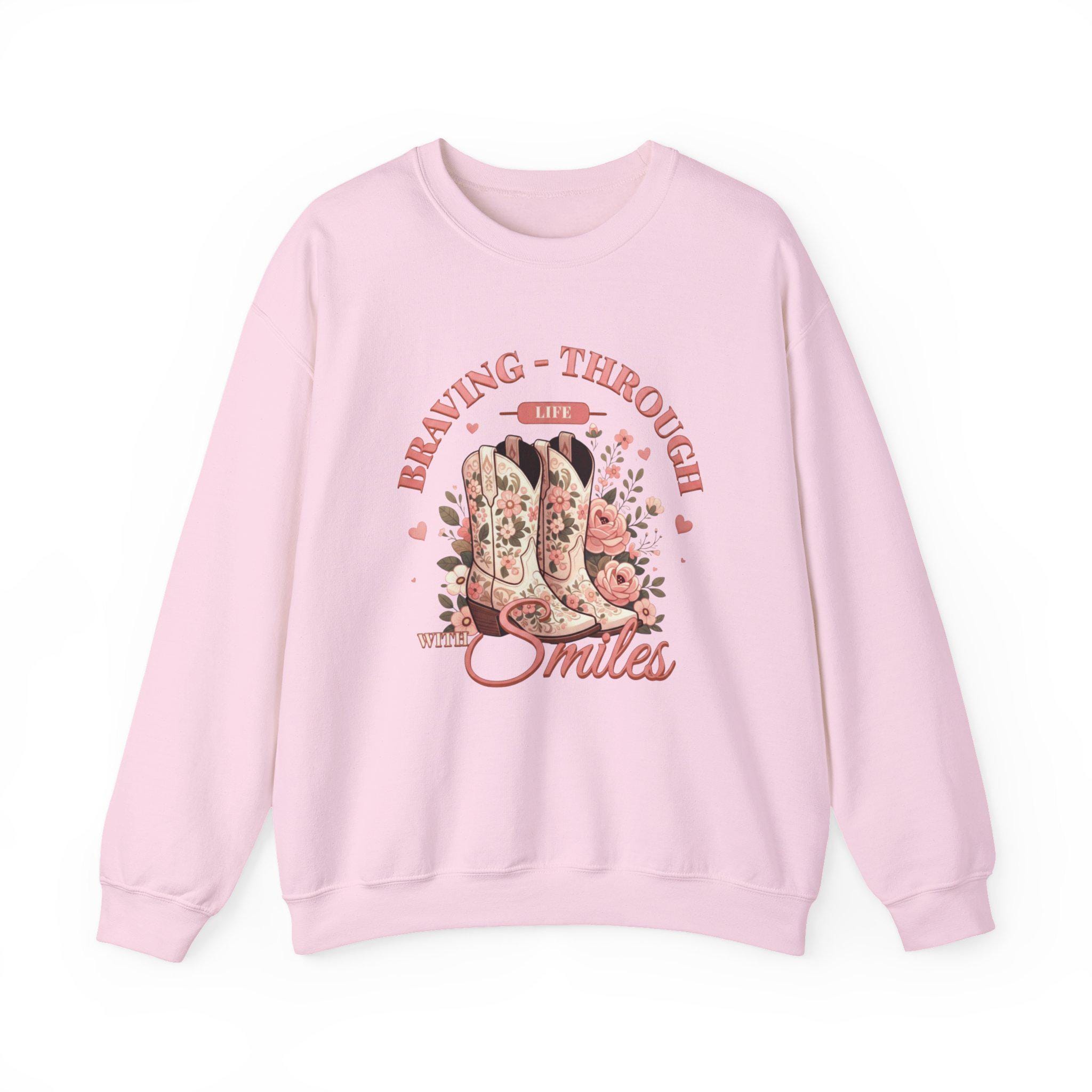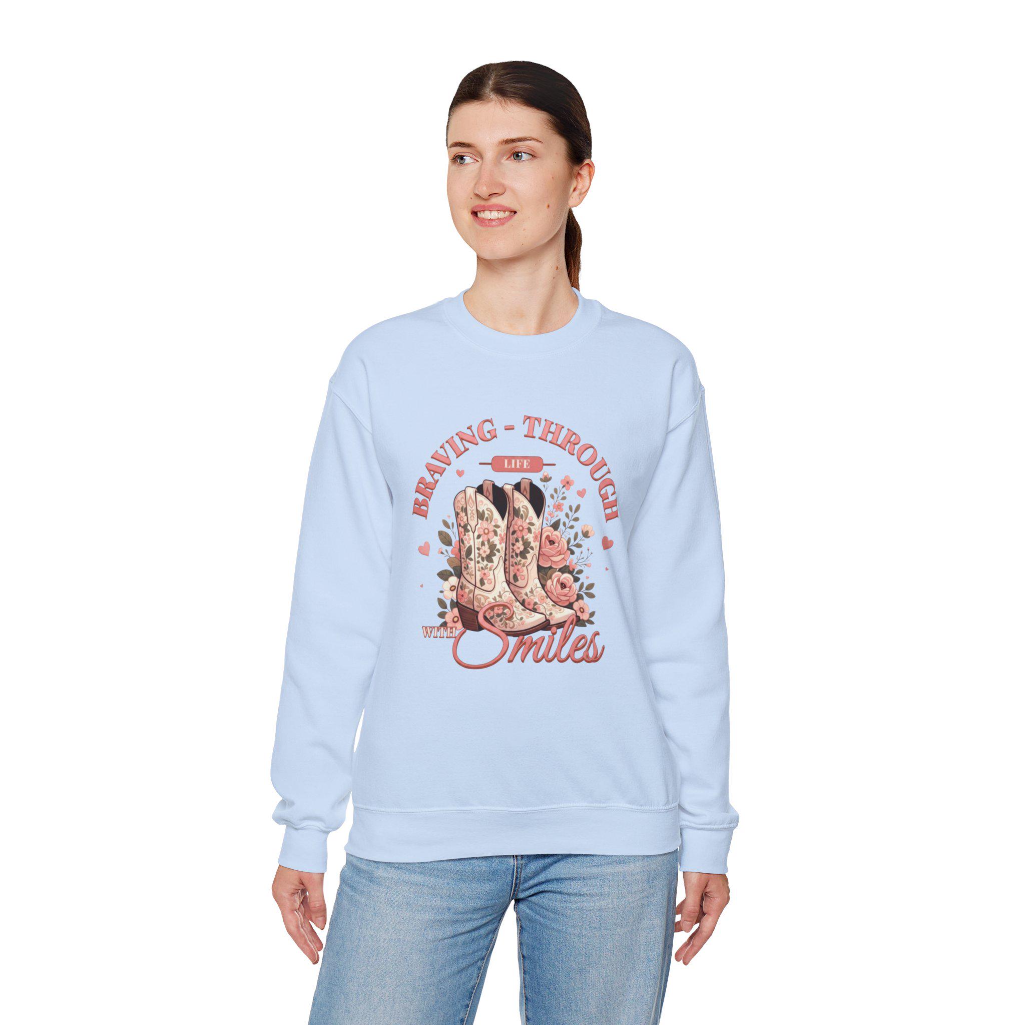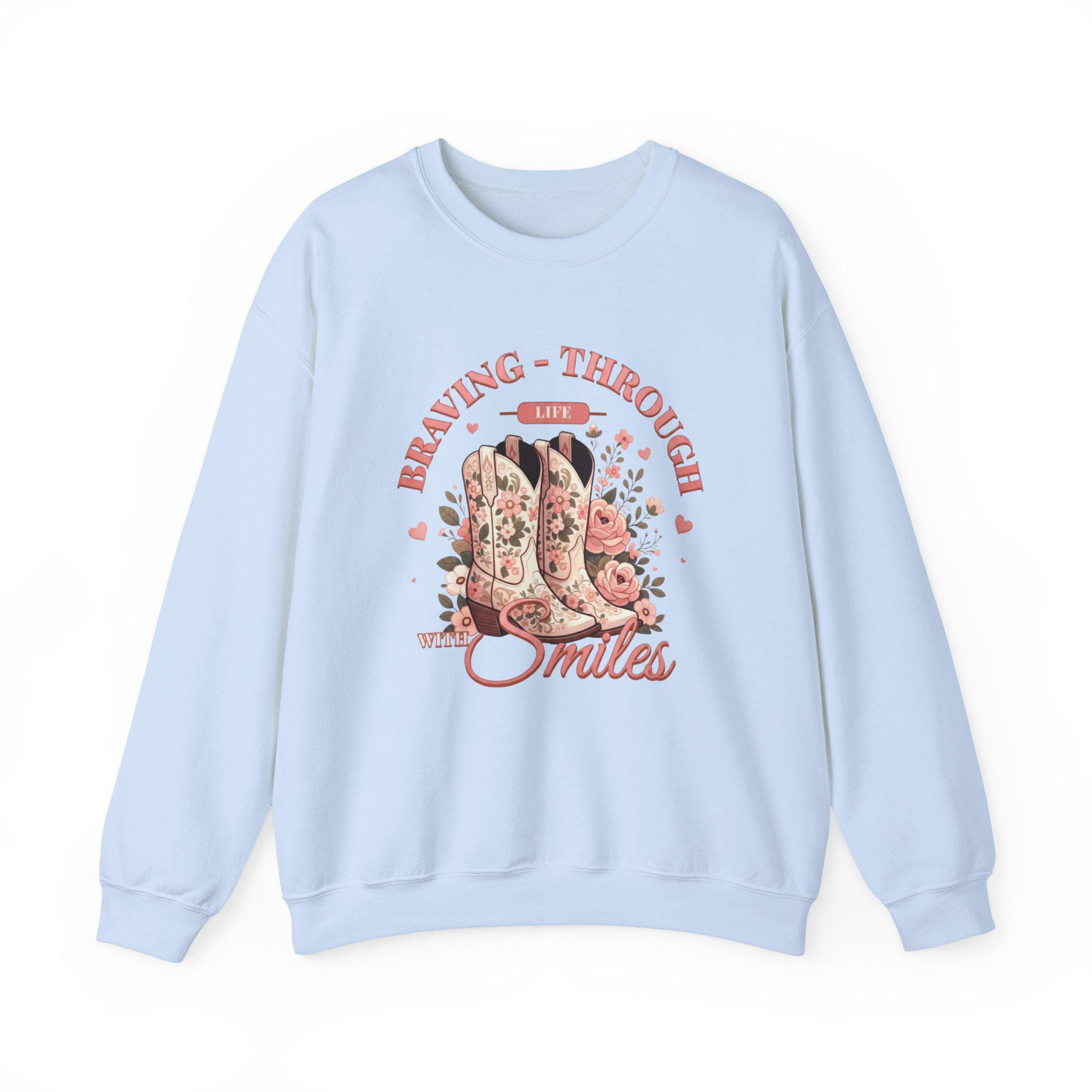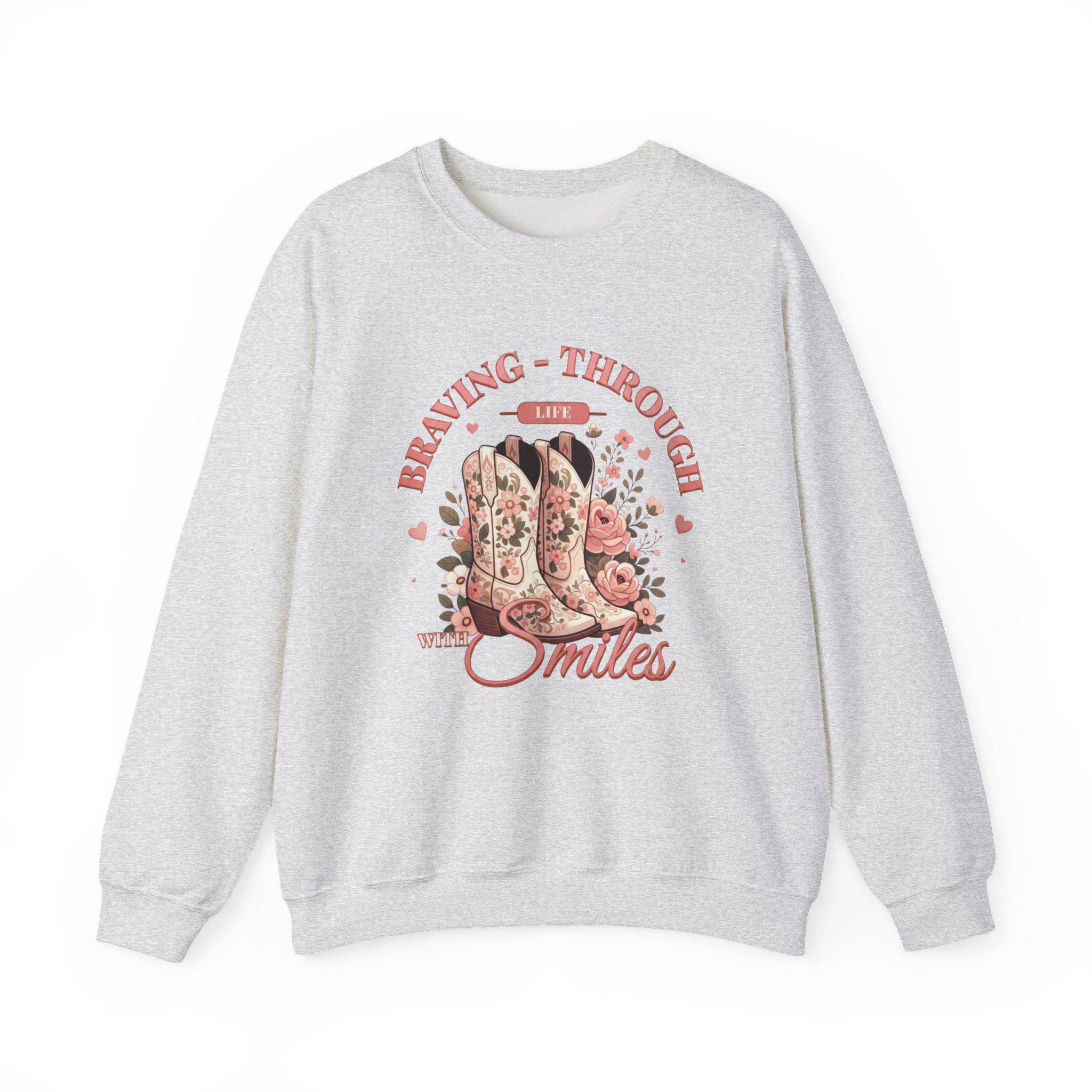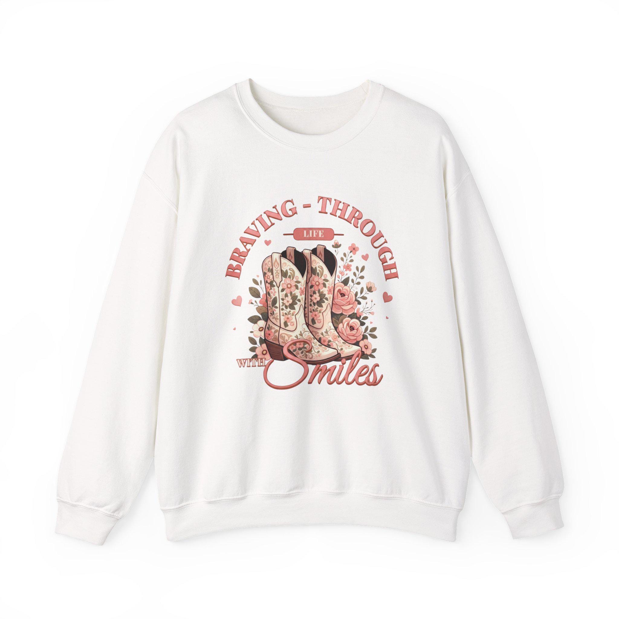Soft, warm, and quietly confident — this crewneck wraps you in calm on slow mornings and long drives alike. A medium-heavy cotton-poly blend gives weight without stiffness, while the classic cut and ribbed neckline keep the silhouette clean and comfortable. Front artwork shows worn-in cowboy boots surrounded by blossoms and the phrase “Braving Through Smiles,” a gentle reminder of steady courage and small victories. Wear it with jeans, over a sundress, or layered for cooler nights; it settles into your life and becomes one of those pieces you reach for when you want comfort with meaning.