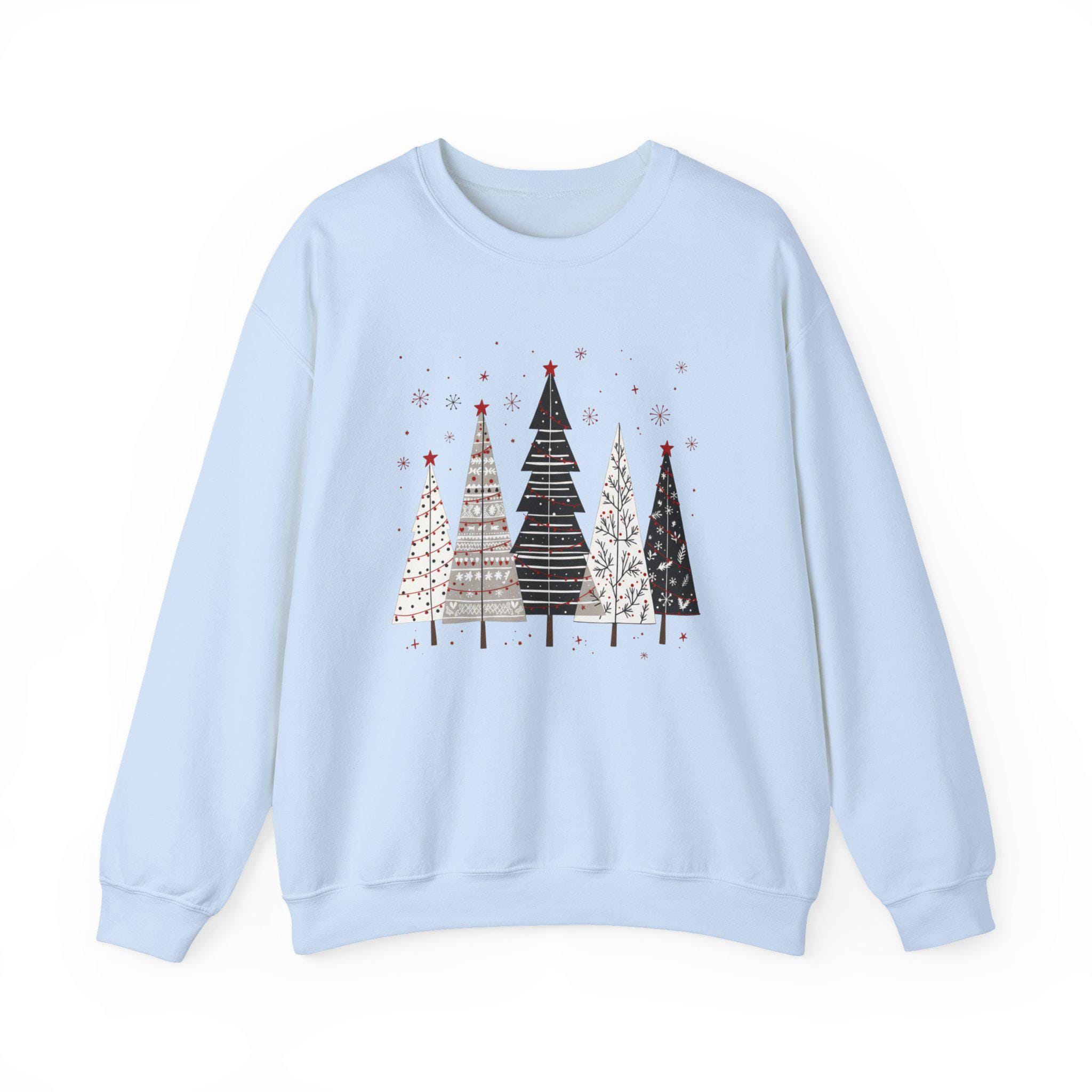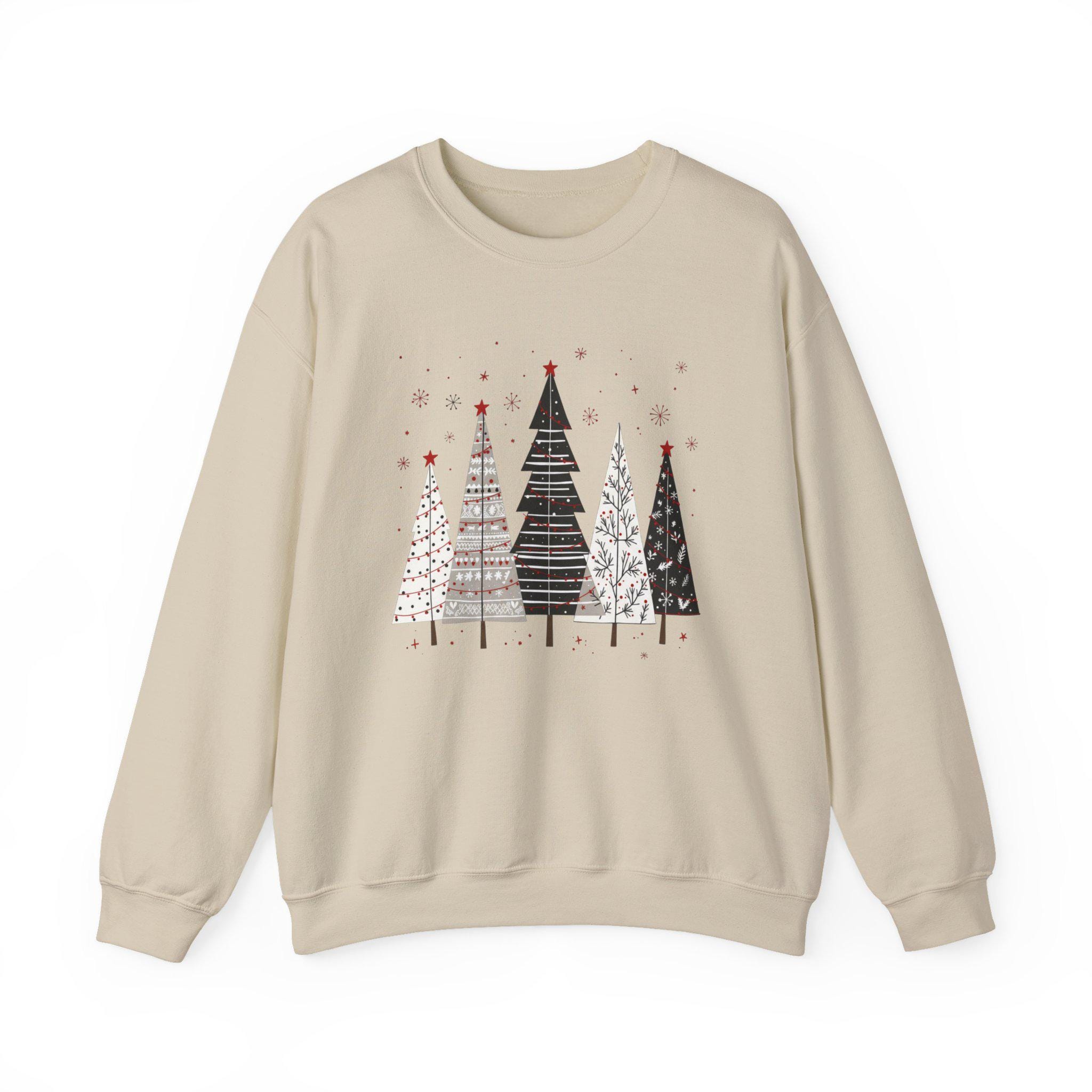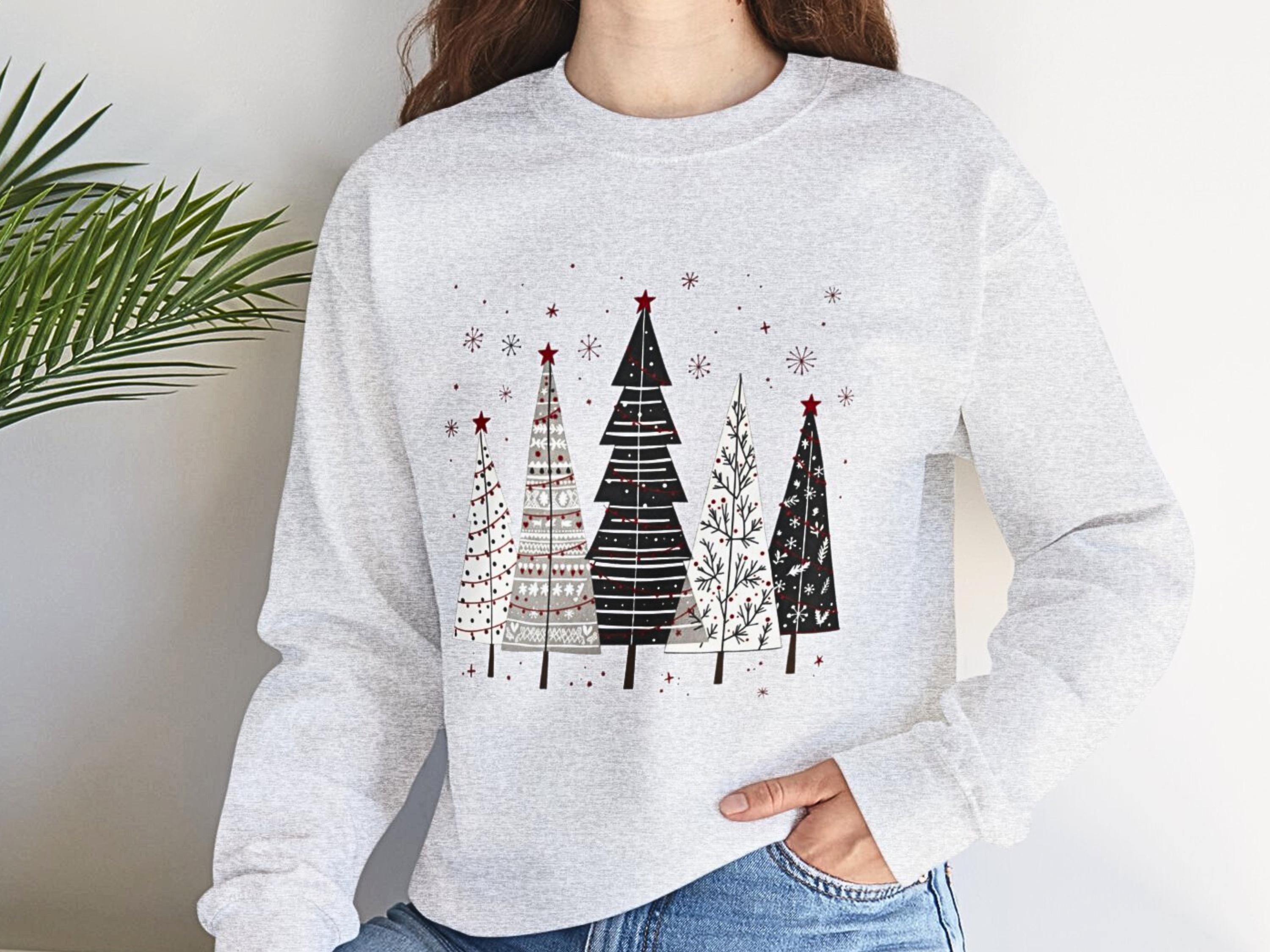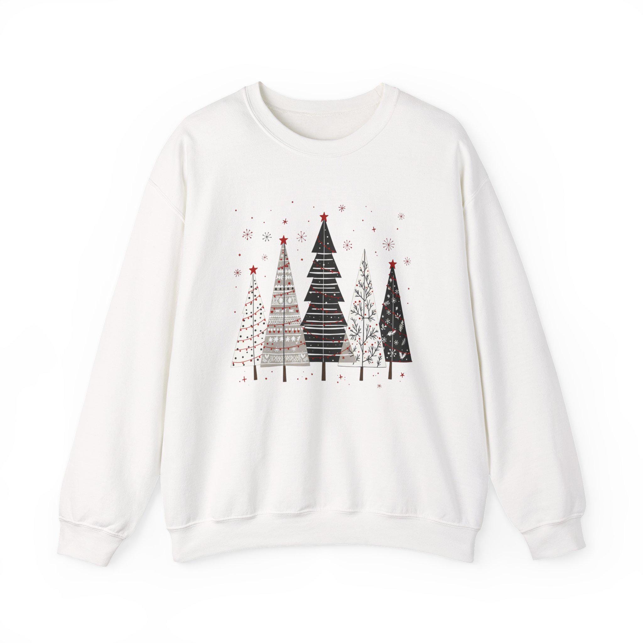 Soft, cozy, and quietly festive — this classic crewneck carries a hand-drawn forest of stylized winter trees across the chest. The muted black, charcoal, and soft rose tones sit gently on a warm white background, making the sweatshirt feel both modern and comforting. Wear it on slow mornings with coffee, layering over a flannel for backyard gatherings, or curled up by twinkling lights. The embroidery-ready design and durable construction mean it will stay part of your rotation year after year, aging into a favorite for chilly evenings and low-key celebrations.