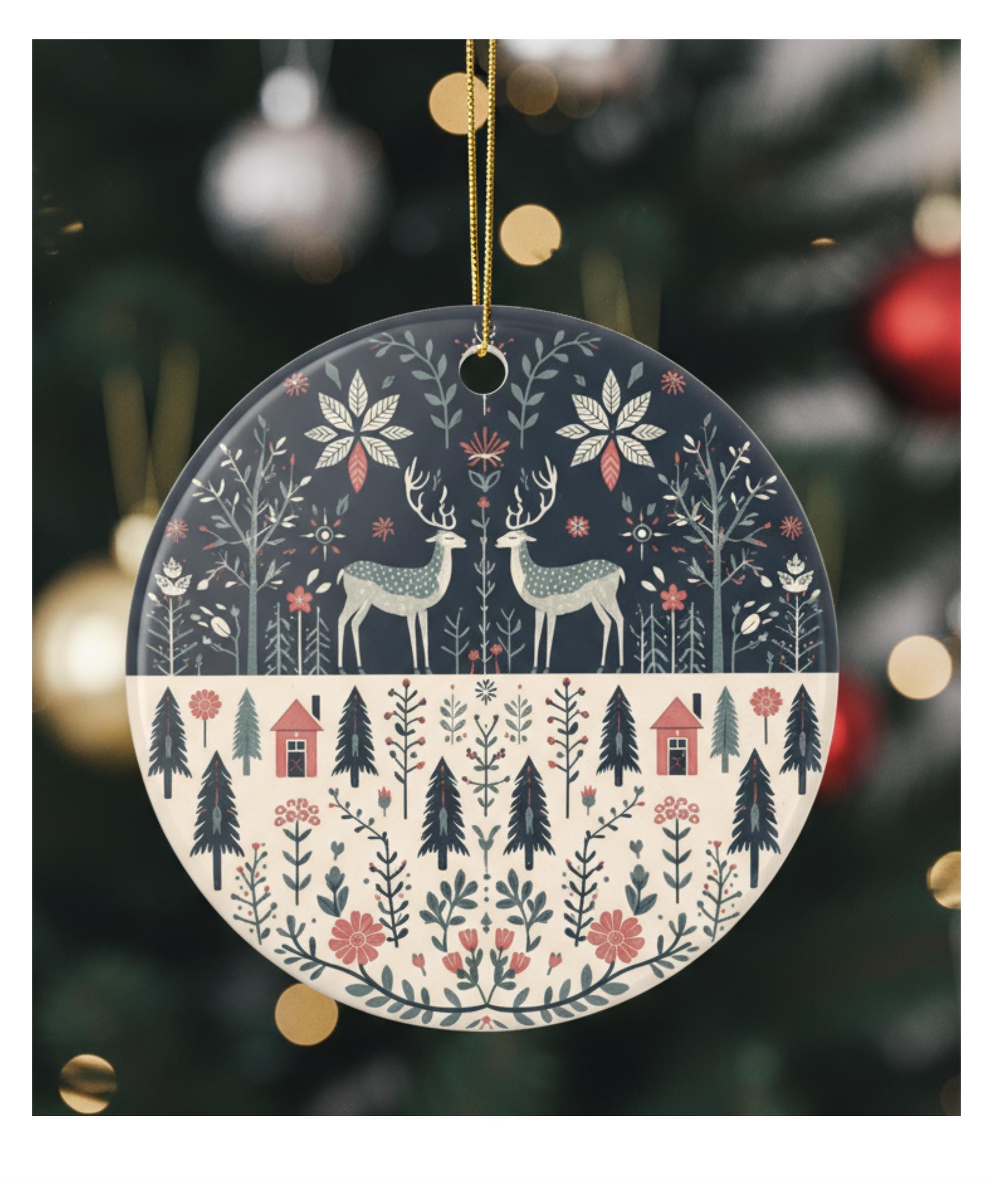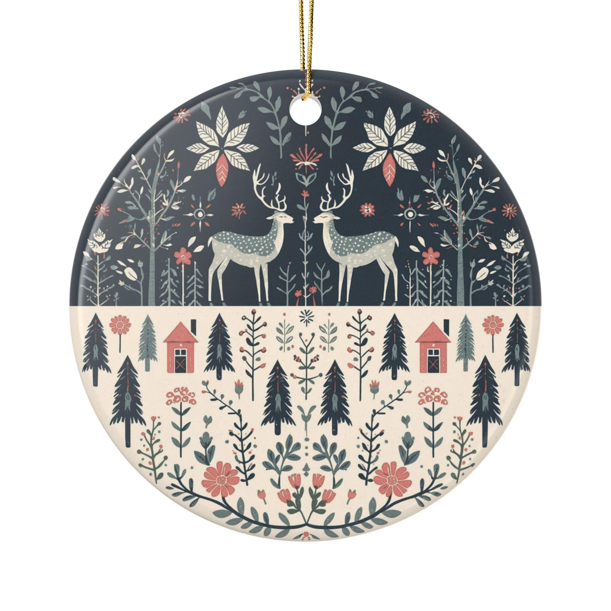 Bring a quiet woodland scene to your holiday tree with this ceramic ornament. The hand-drawn style deer, tiny cottages, and scattered florals create a cozy, nostalgic mood — like a walk through snowy pines at dusk. The muted navy, cream, and rust palette feels warm and calm, slipping easily into rustic, Scandi, or vintage-inspired decor. Lightweight but sturdy, the glossy ceramic surface shows off crisp, vibrant printing so every tiny branch and patterned detail reads beautifully from across the room. Hang it from a mantel, layer it on a branch with textured ribbons, or add it to a collection of memories that tell the story of winters spent by the fire.