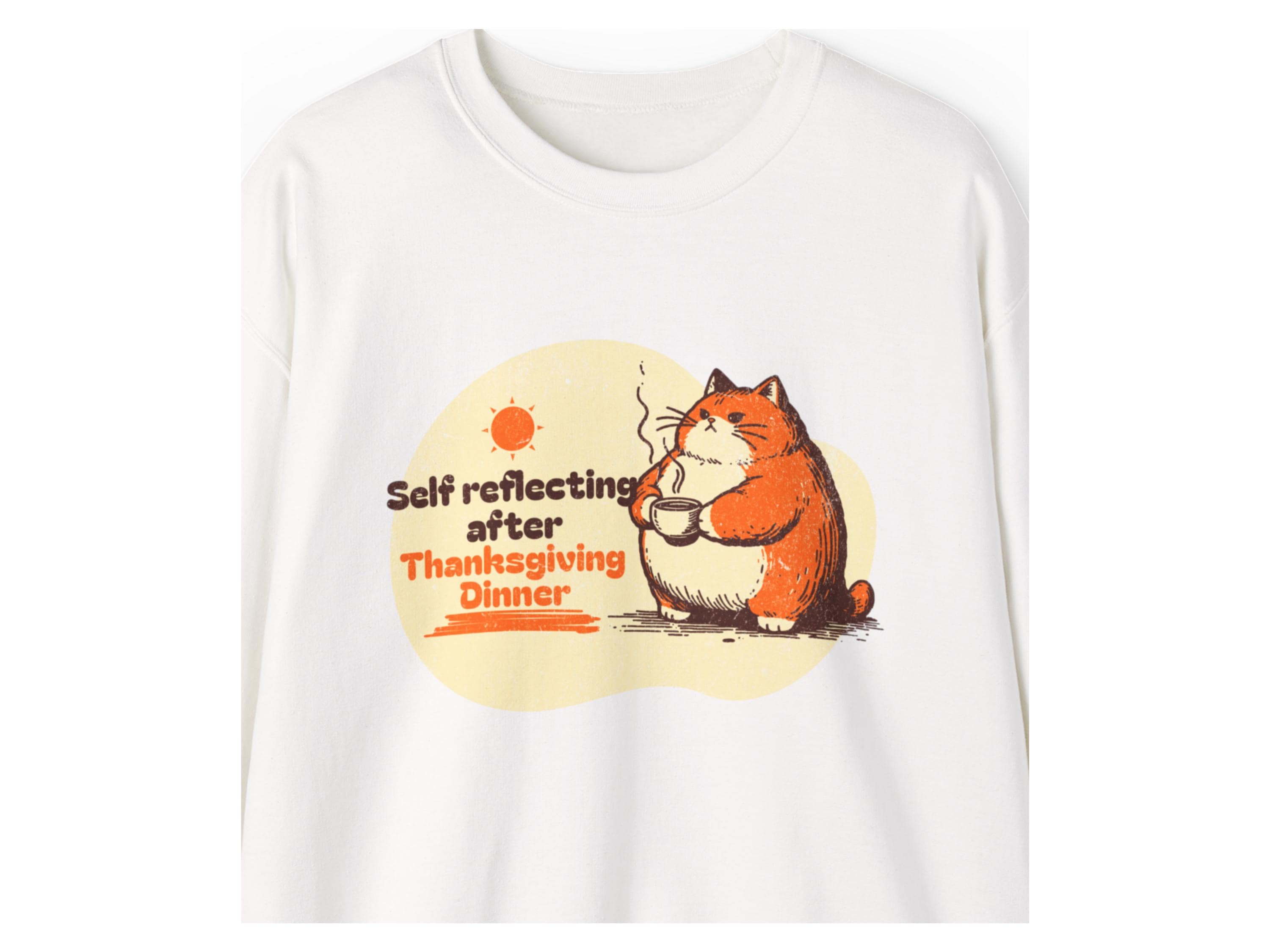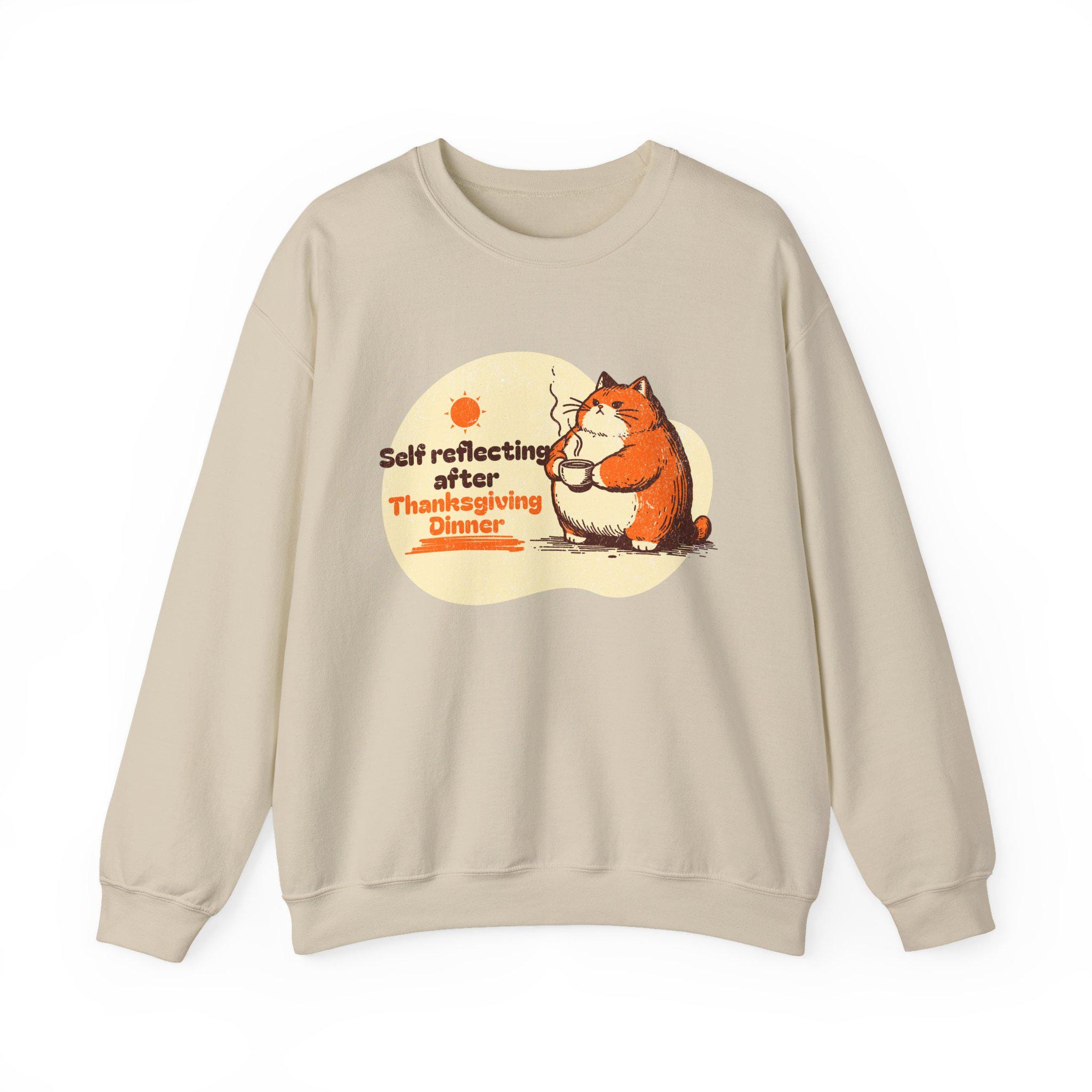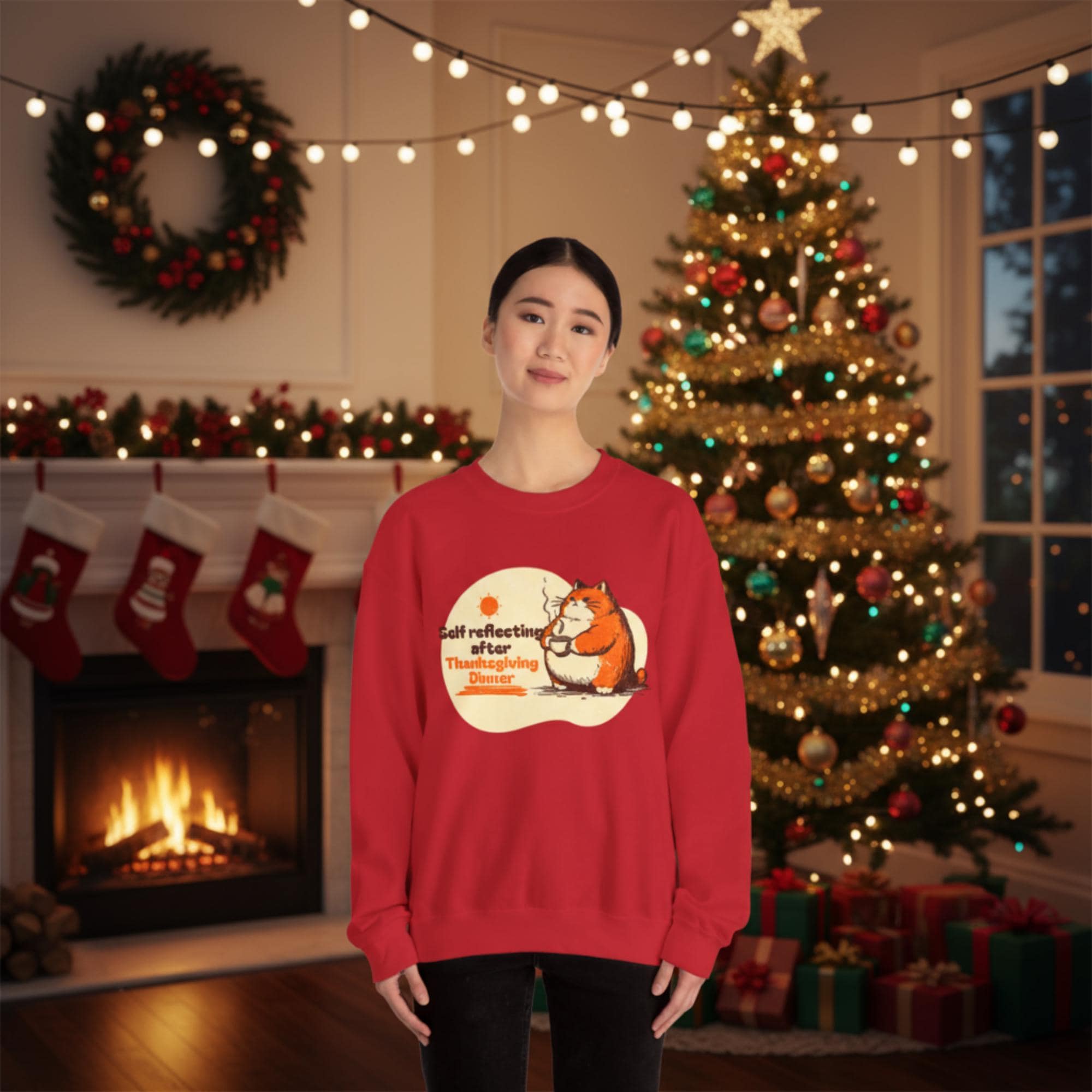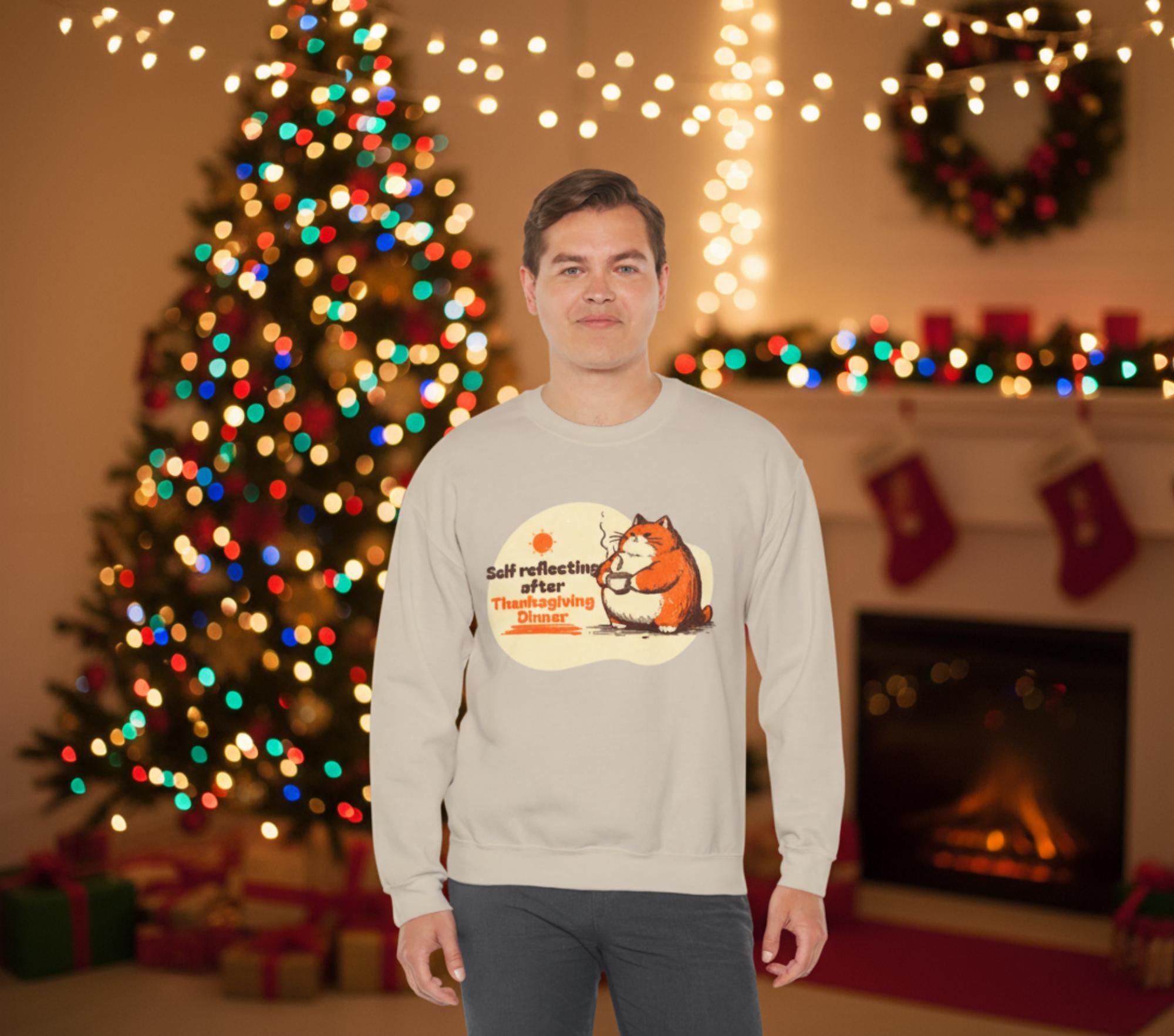 This cozy crewneck brings a touch of soft humor to chilly days. A warm, slightly oversized sweatshirt made from a durable 50/50 cotton‑poly blend, it features a gentle cream canvas and a playful illustrated fox curled up mid‑snack beneath the words “Self reflecting after Thanksgiving dinner.” The image is printed with a clean DTG finish on the front; ribbed collar and double‑needle stitched seams keep the shape wear after wear. It reads like a comfy after‑dinner moment you can wear — relaxed, a little sleepy, and quietly content.