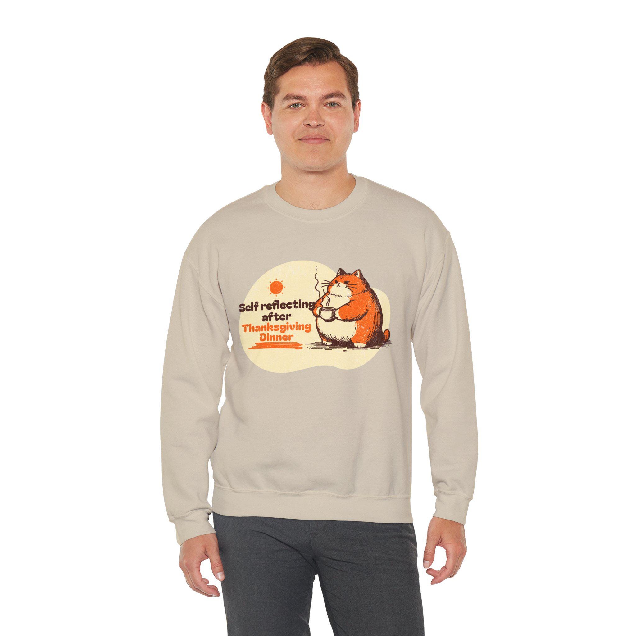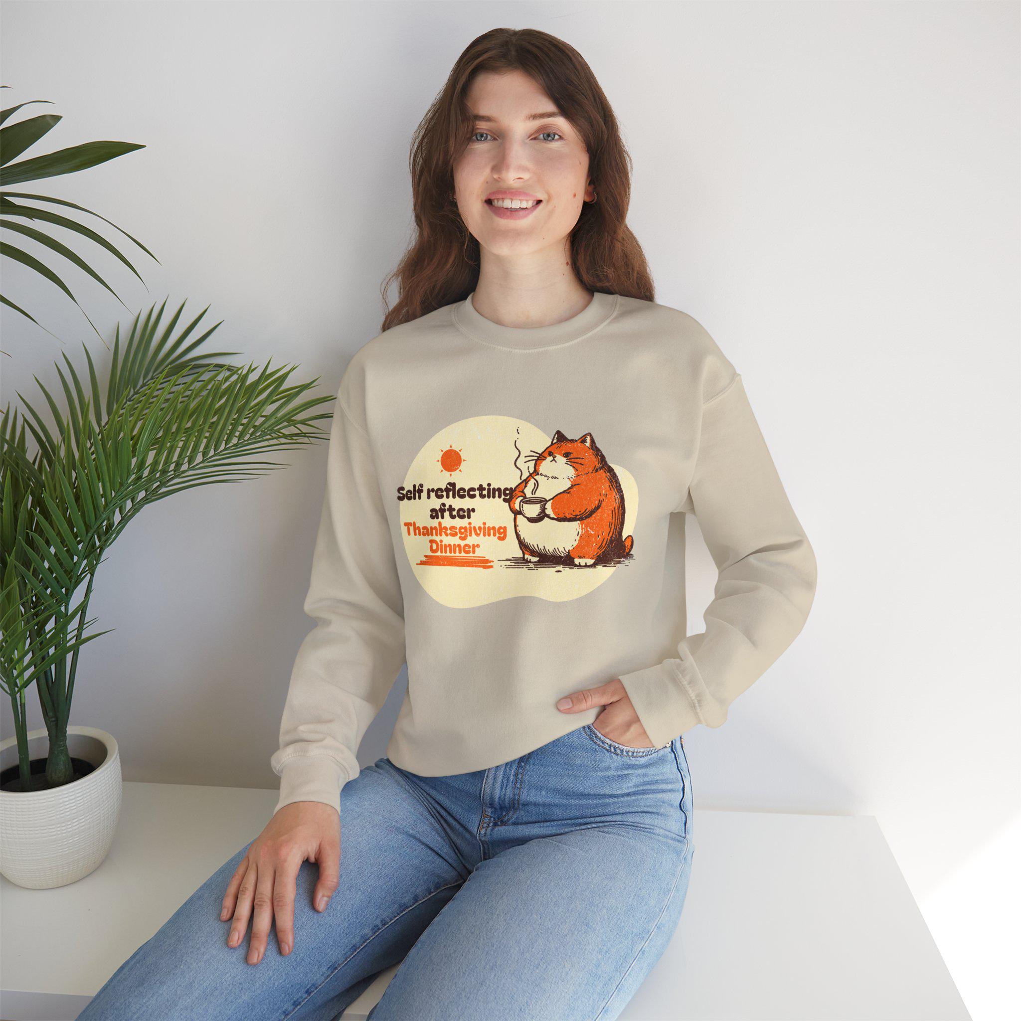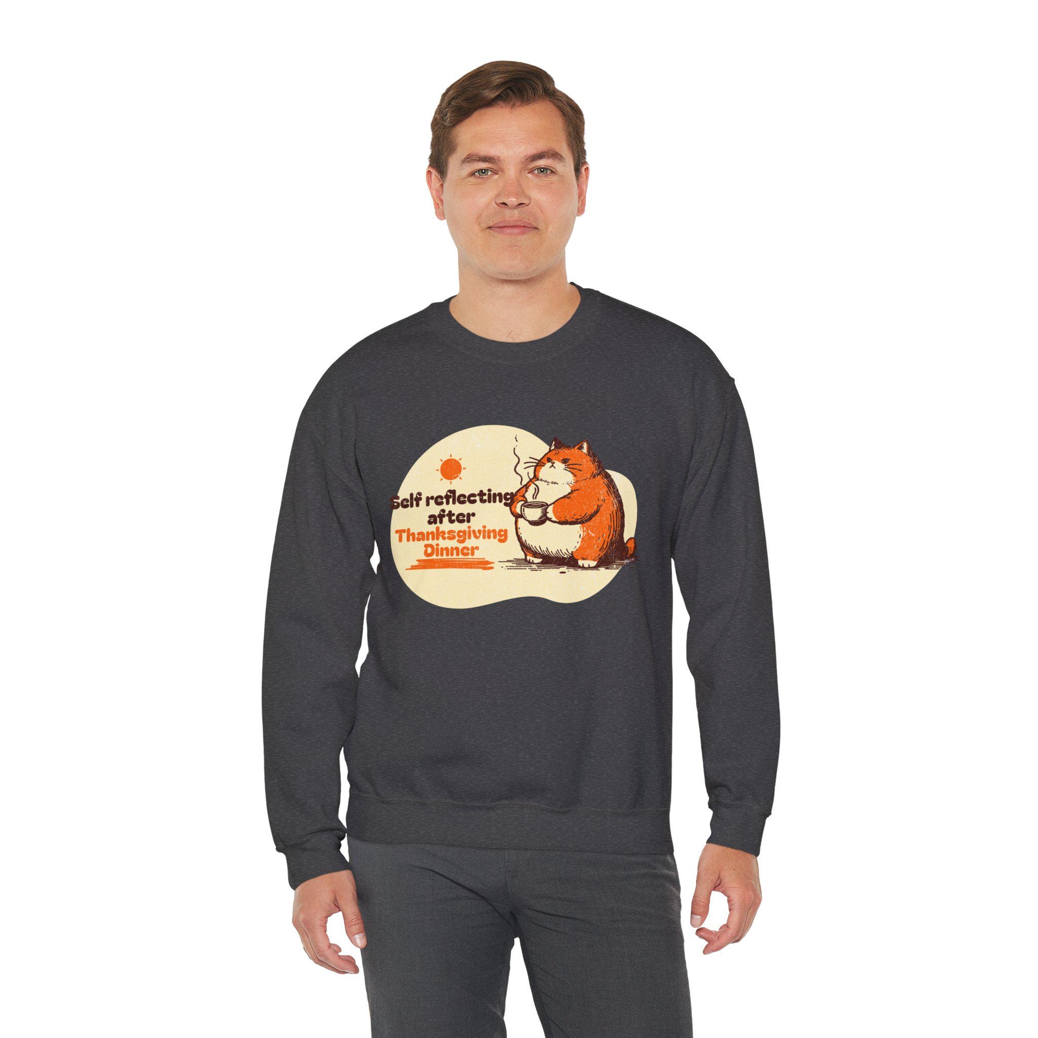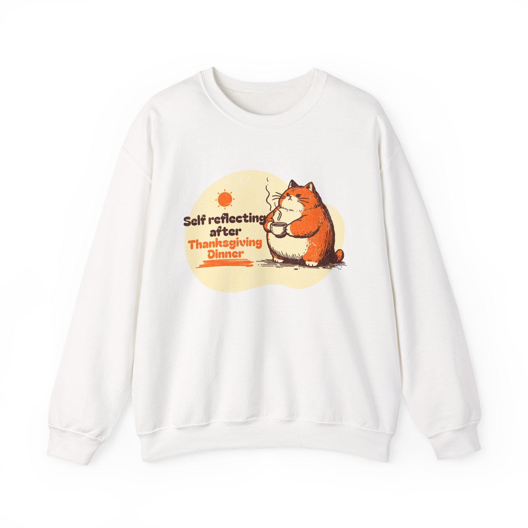 This cozy crewneck brings a touch of soft humor to chilly days. A warm, slightly oversized sweatshirt made from a durable 50/50 cotton‑poly blend, it features a gentle cream canvas and a playful illustrated fox curled up mid‑snack beneath the words “Self reflecting after Thanksgiving dinner.” The image is printed with a clean DTG finish on the front; ribbed collar and double‑needle stitched seams keep the shape wear after wear. It reads like a comfy after‑dinner moment you can wear — relaxed, a little sleepy, and quietly content.