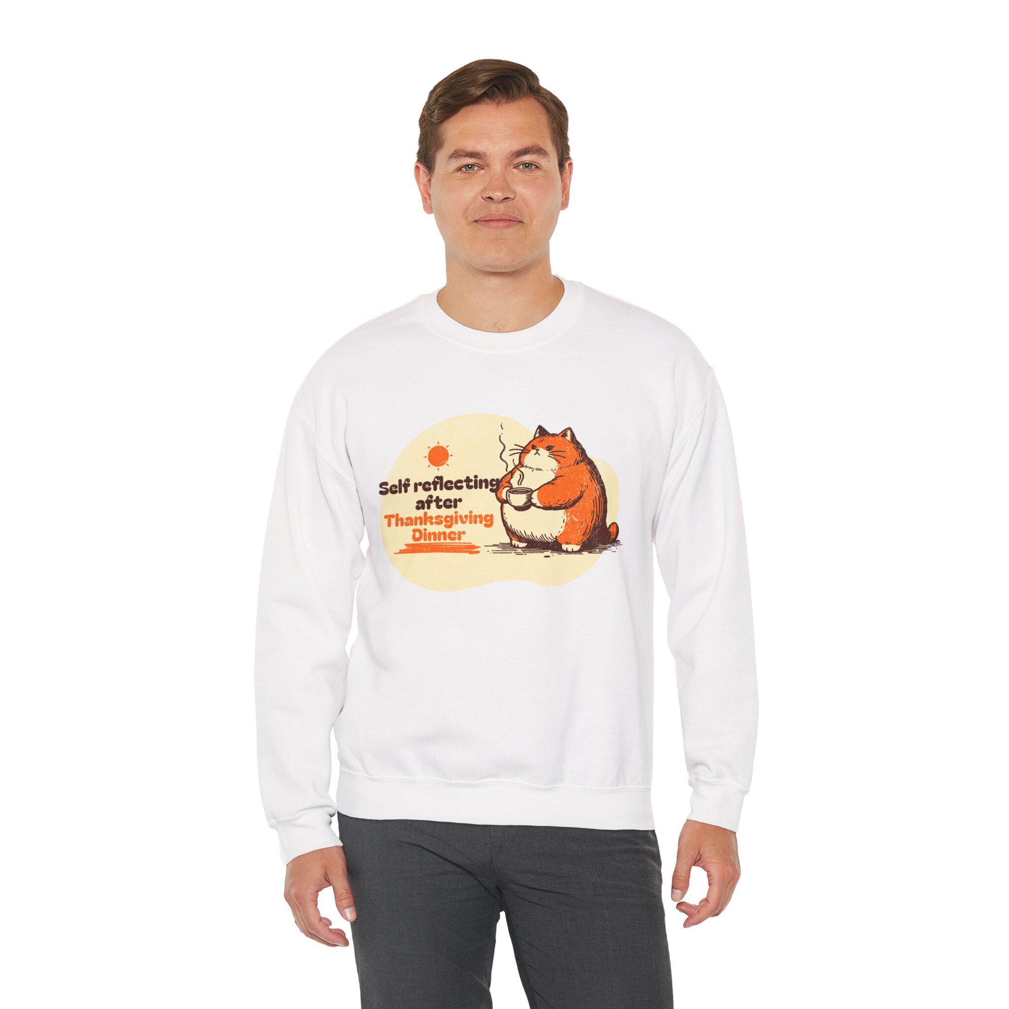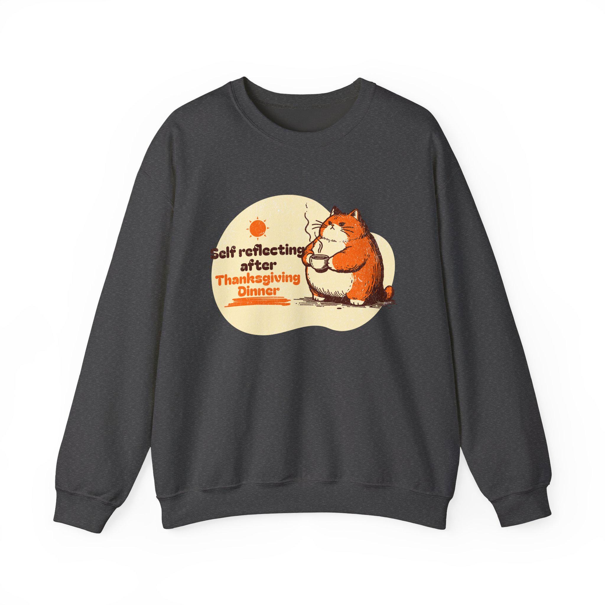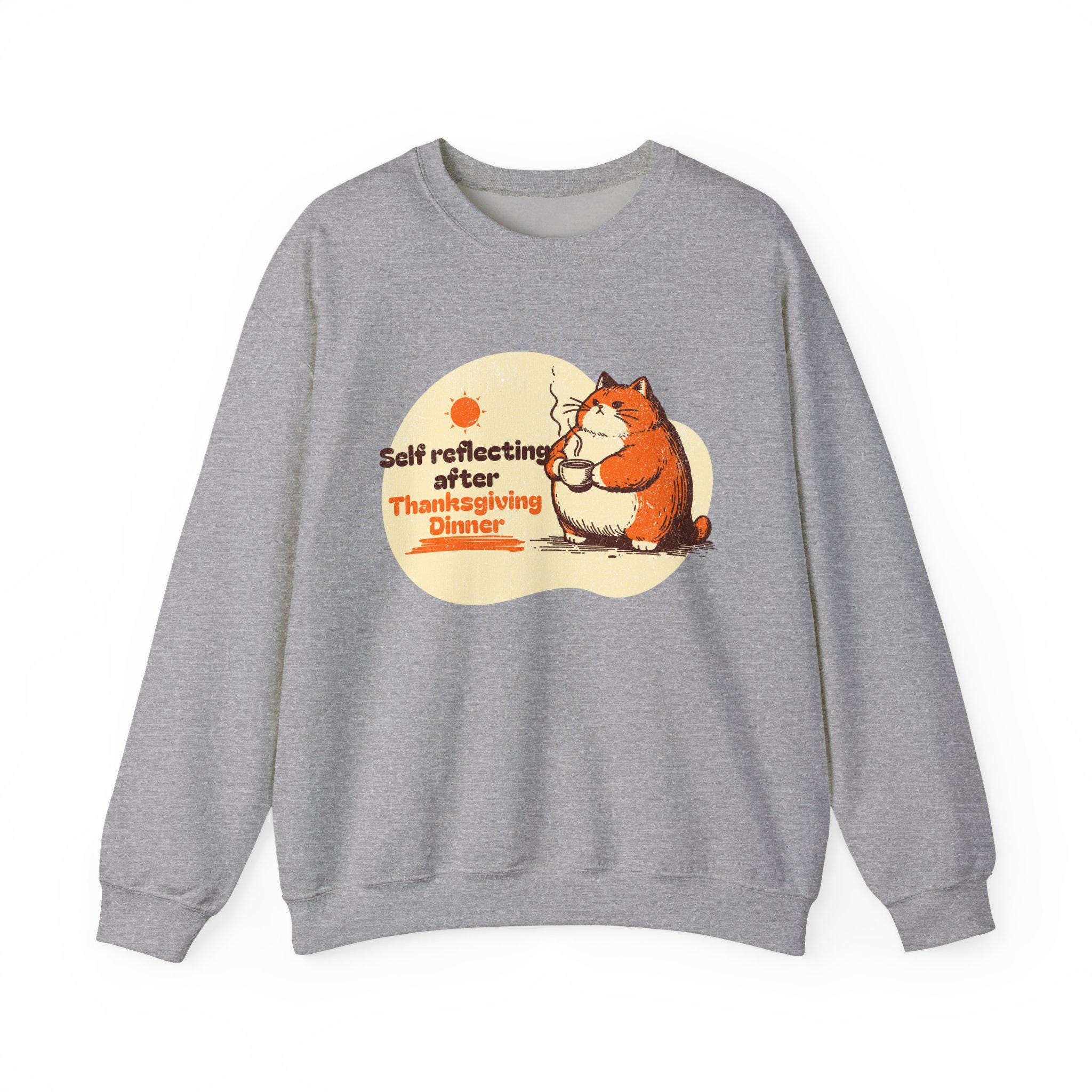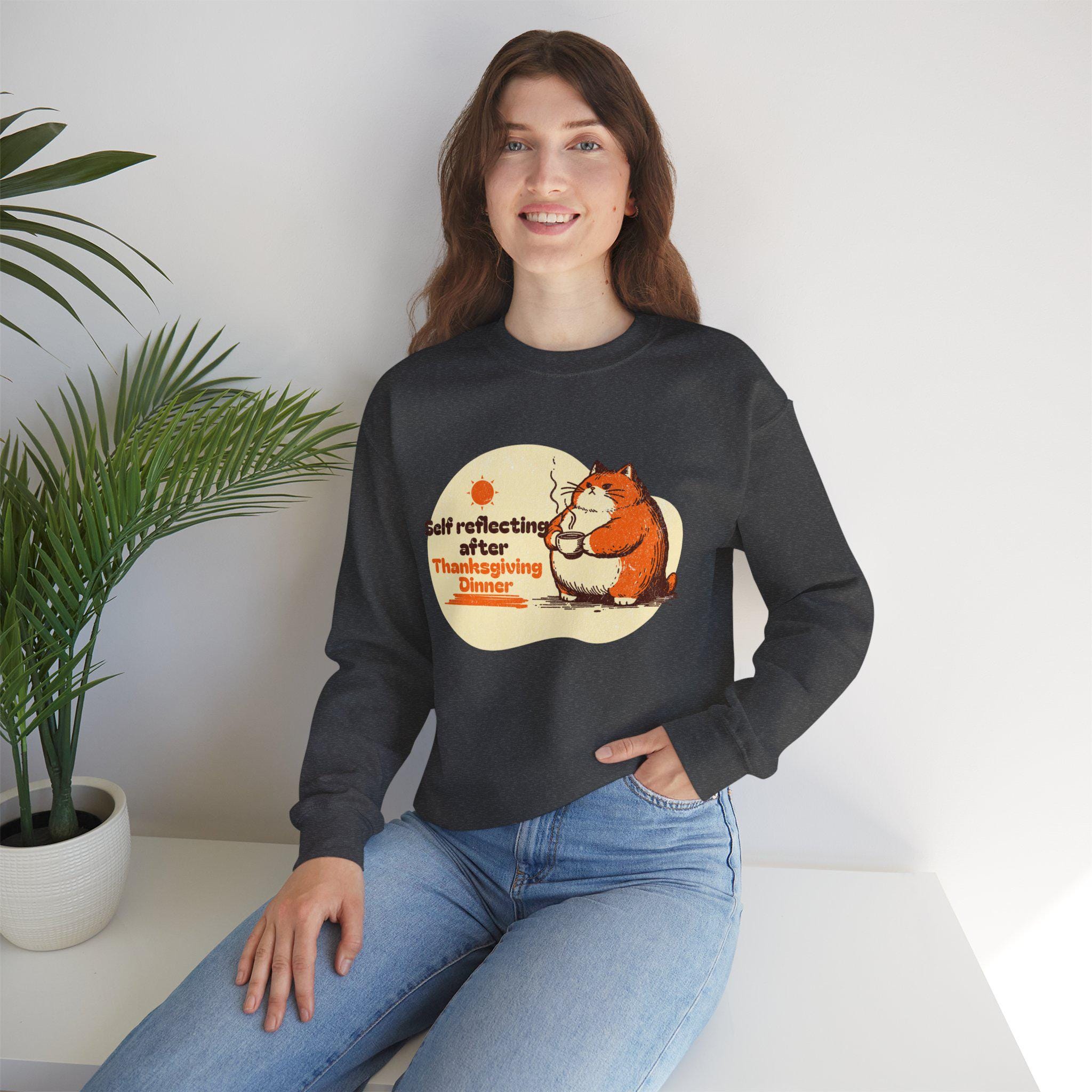 This cozy crewneck brings a touch of soft humor to chilly days. A warm, slightly oversized sweatshirt made from a durable 50/50 cotton‑poly blend, it features a gentle cream canvas and a playful illustrated fox curled up mid‑snack beneath the words “Self reflecting after Thanksgiving dinner.” The image is printed with a clean DTG finish on the front; ribbed collar and double‑needle stitched seams keep the shape wear after wear. It reads like a comfy after‑dinner moment you can wear — relaxed, a little sleepy, and quietly content.
