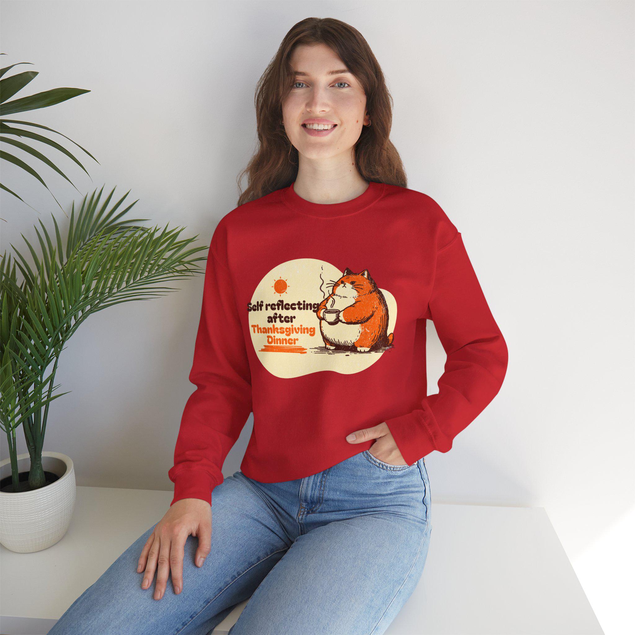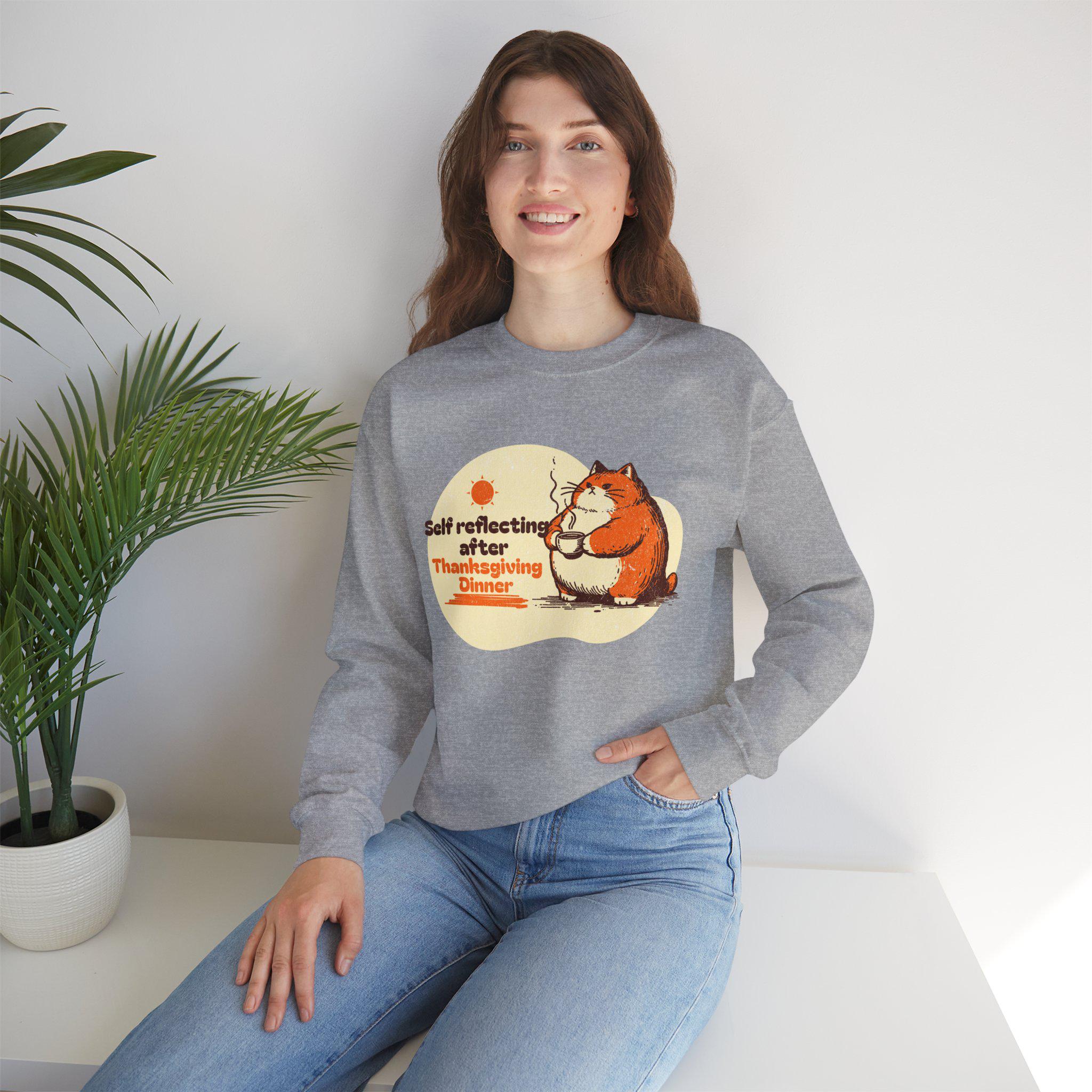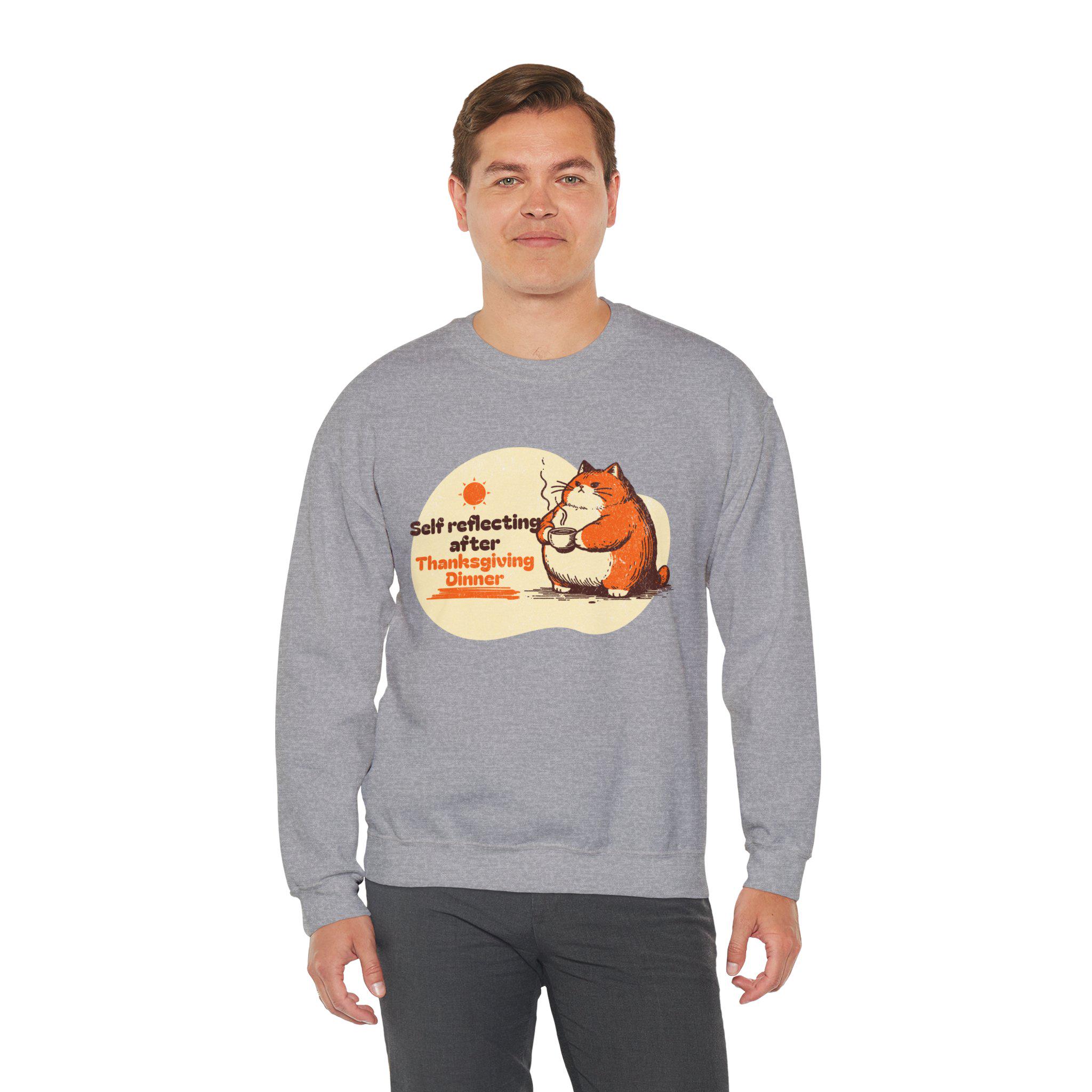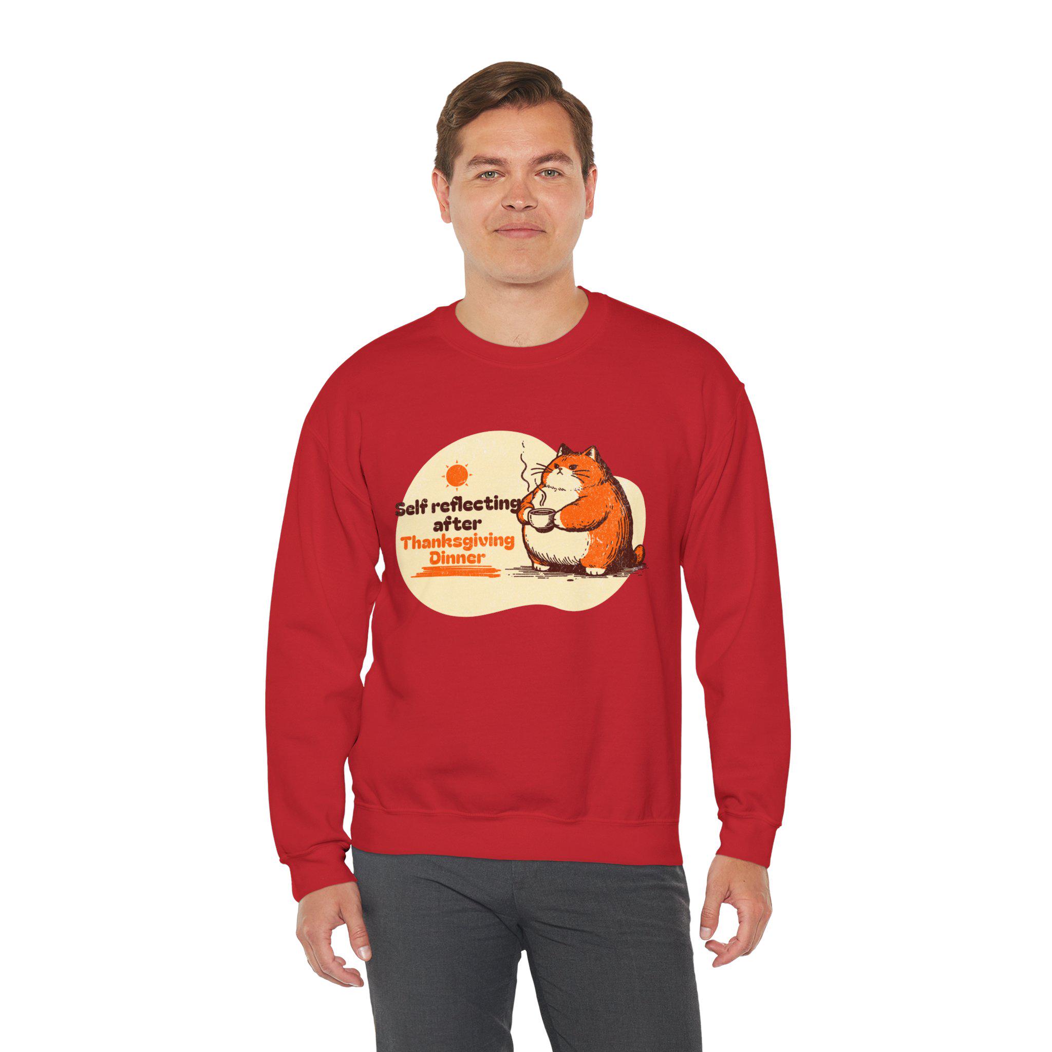 This cozy crewneck brings a touch of soft humor to chilly days. A warm, slightly oversized sweatshirt made from a durable 50/50 cotton‑poly blend, it features a gentle cream canvas and a playful illustrated fox curled up mid‑snack beneath the words “Self reflecting after Thanksgiving dinner.” The image is printed with a clean DTG finish on the front; ribbed collar and double‑needle stitched seams keep the shape wear after wear. It reads like a comfy after‑dinner moment you can wear — relaxed, a little sleepy, and quietly content.