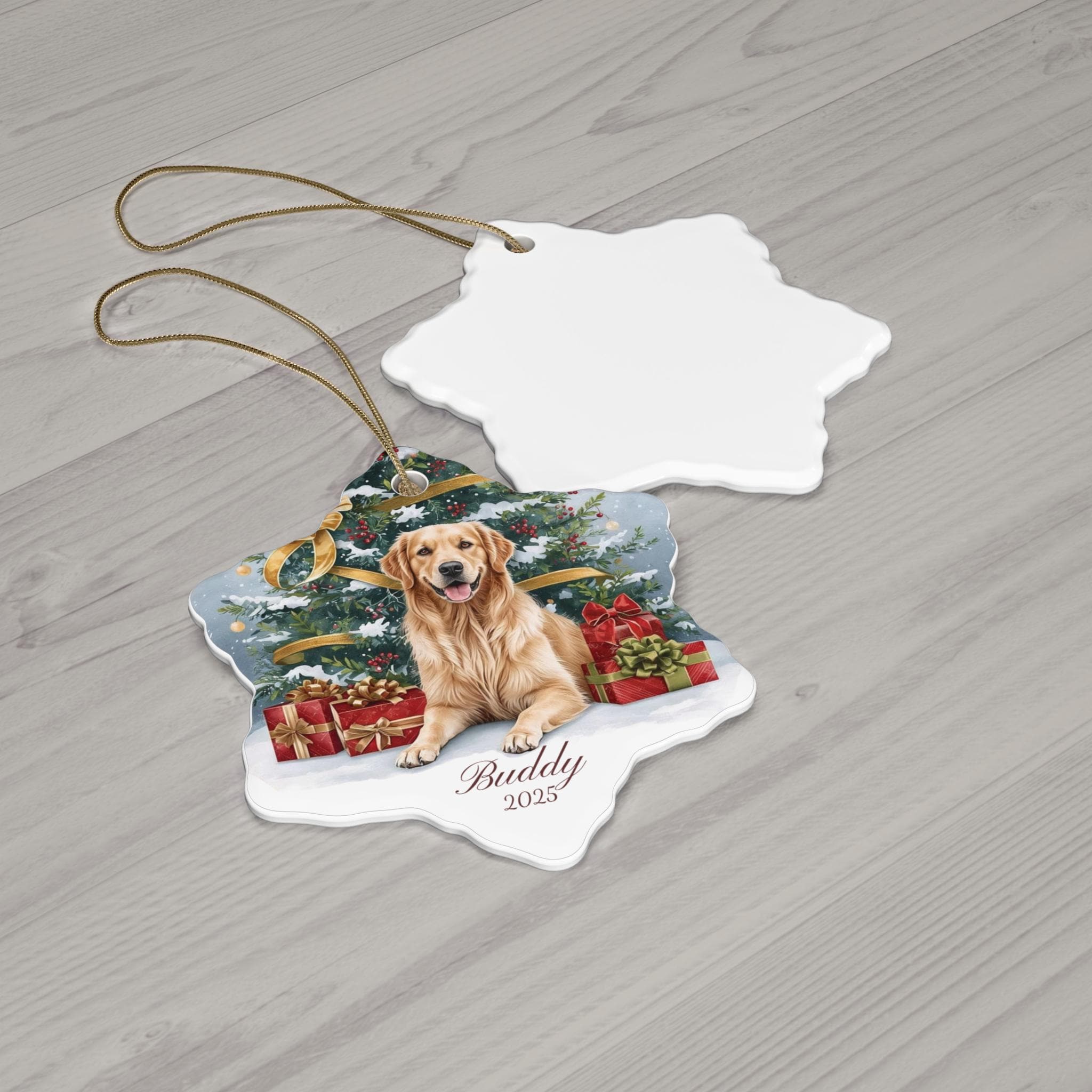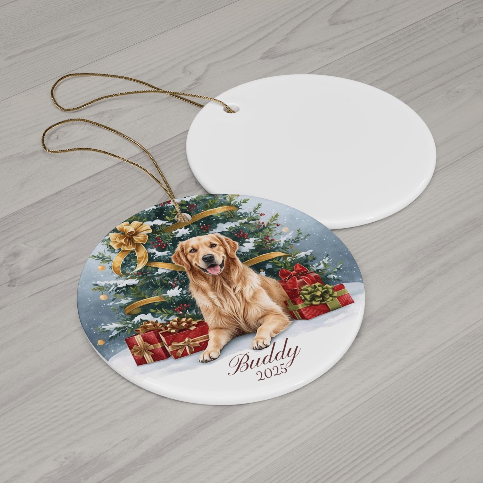 A glossy ceramic ornament that brings holiday warmth to mantels, trees, or memory corners. The full-color print shows a joyful golden retriever in front of a decorated Christmas tree and neatly wrapped gifts, with a personalized name and year beneath. Each piece is one solid ceramic disc, 3mm thick, with a small drilled hole and a gold-toned hanging string for easy display. The vivid colors and glossy finish make the image pop, while the sturdy single-piece construction ensures it lasts through seasons and moving moments.