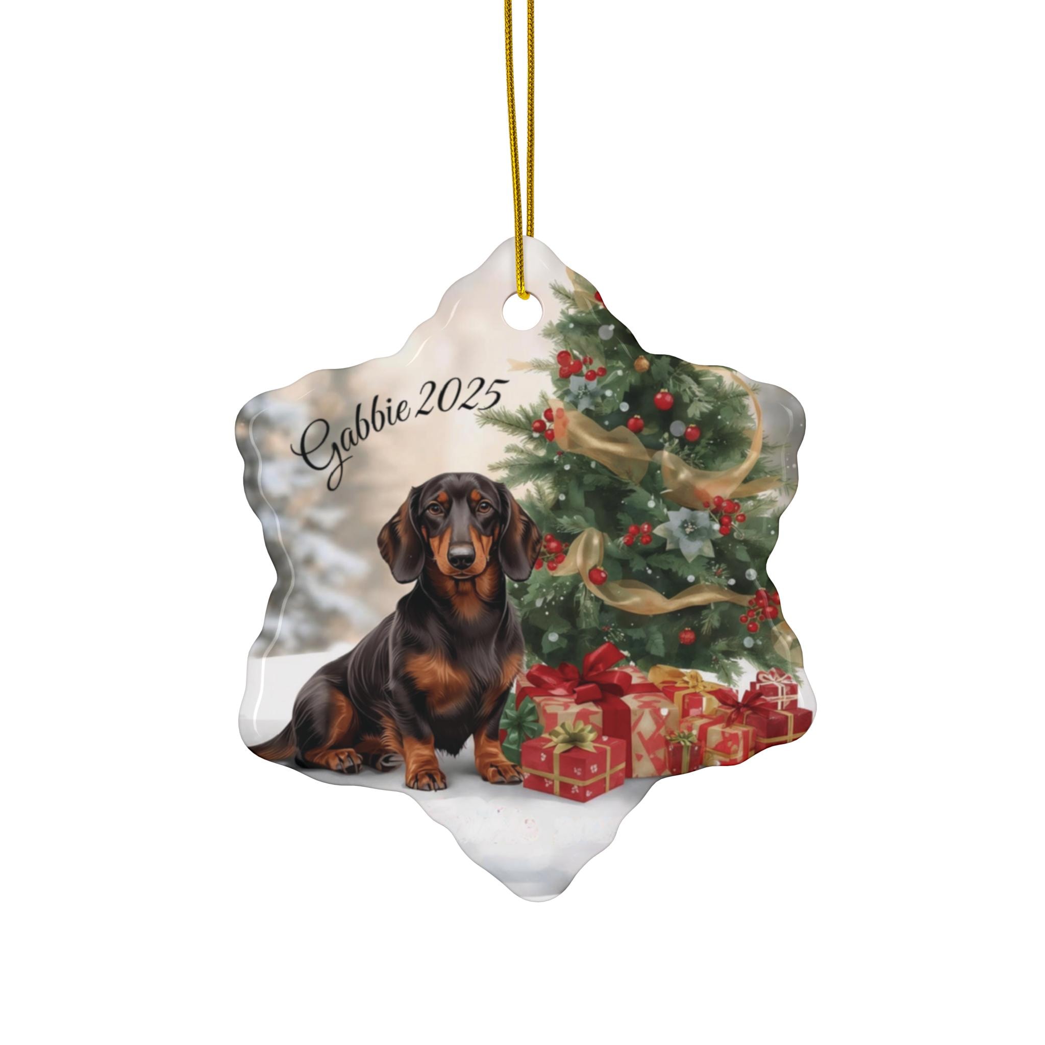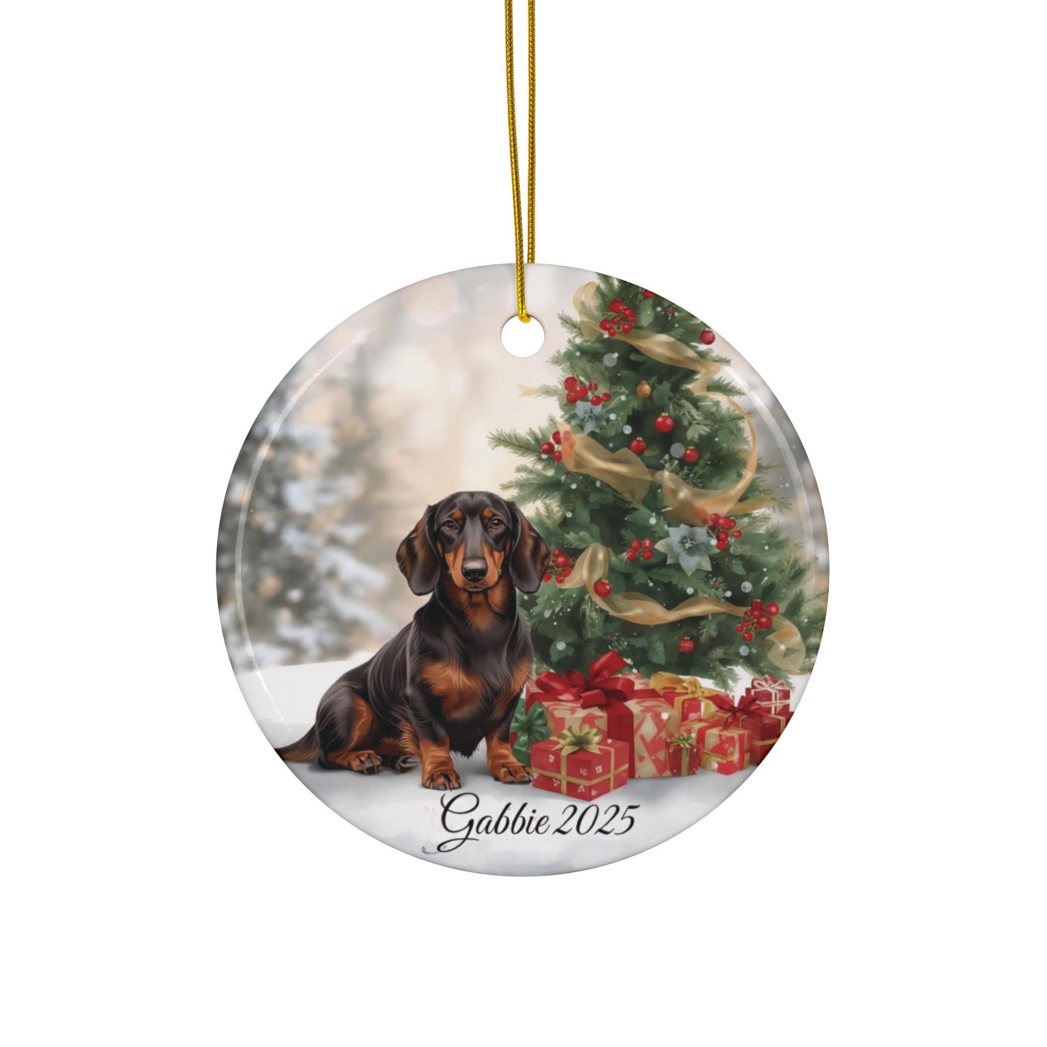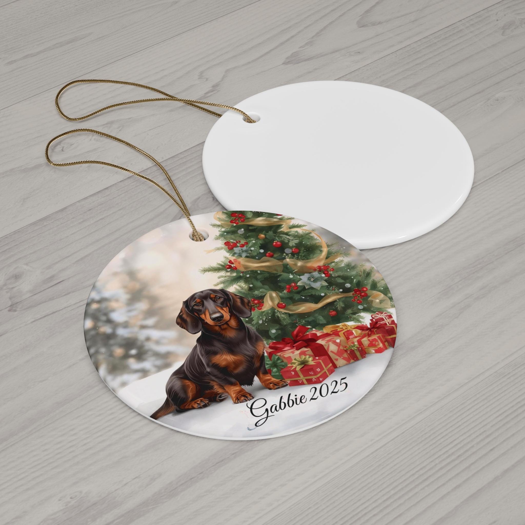 A glossy ceramic ornament that brings holiday warmth to mantels, trees, or memory corners. The full-color print shows a joyful dachshund in front of a decorated Christmas tree and neatly wrapped gifts, with a personalized name and year beneath. Each piece is one solid ceramic disc, 3mm thick, with a small drilled hole and a gold-toned hanging string for easy display. The vivid colors and glossy finish make the image pop, while the sturdy single-piece construction ensures it lasts through seasons and moving moments.