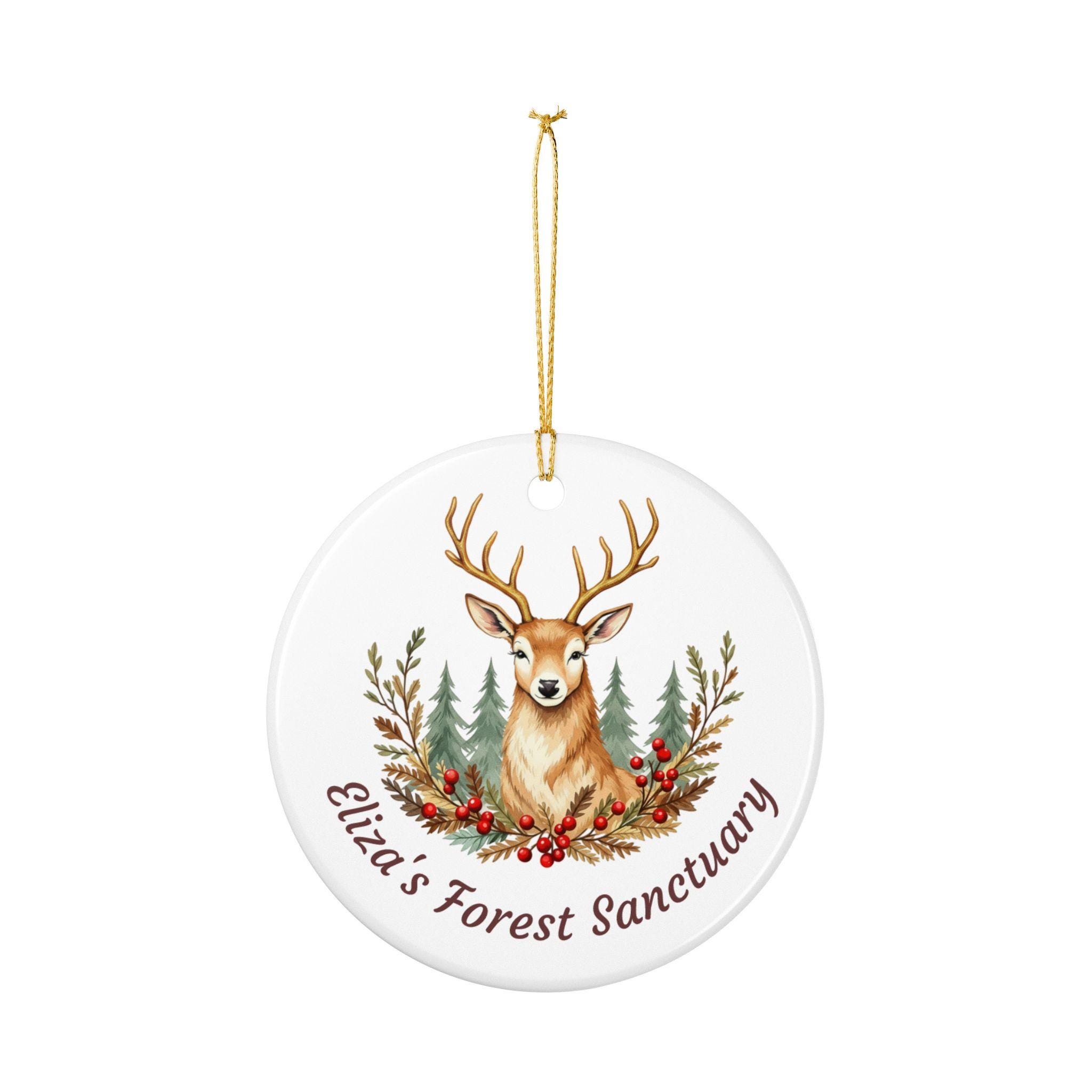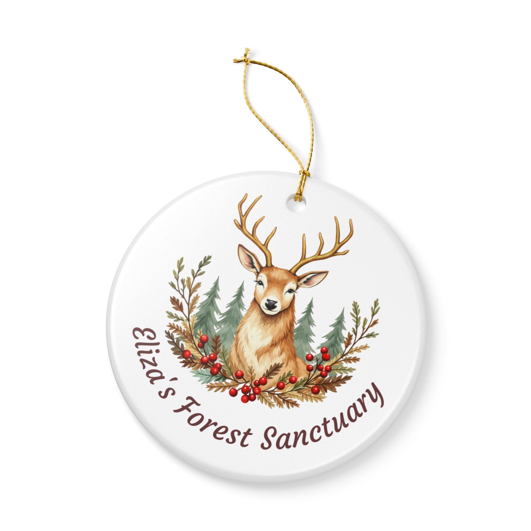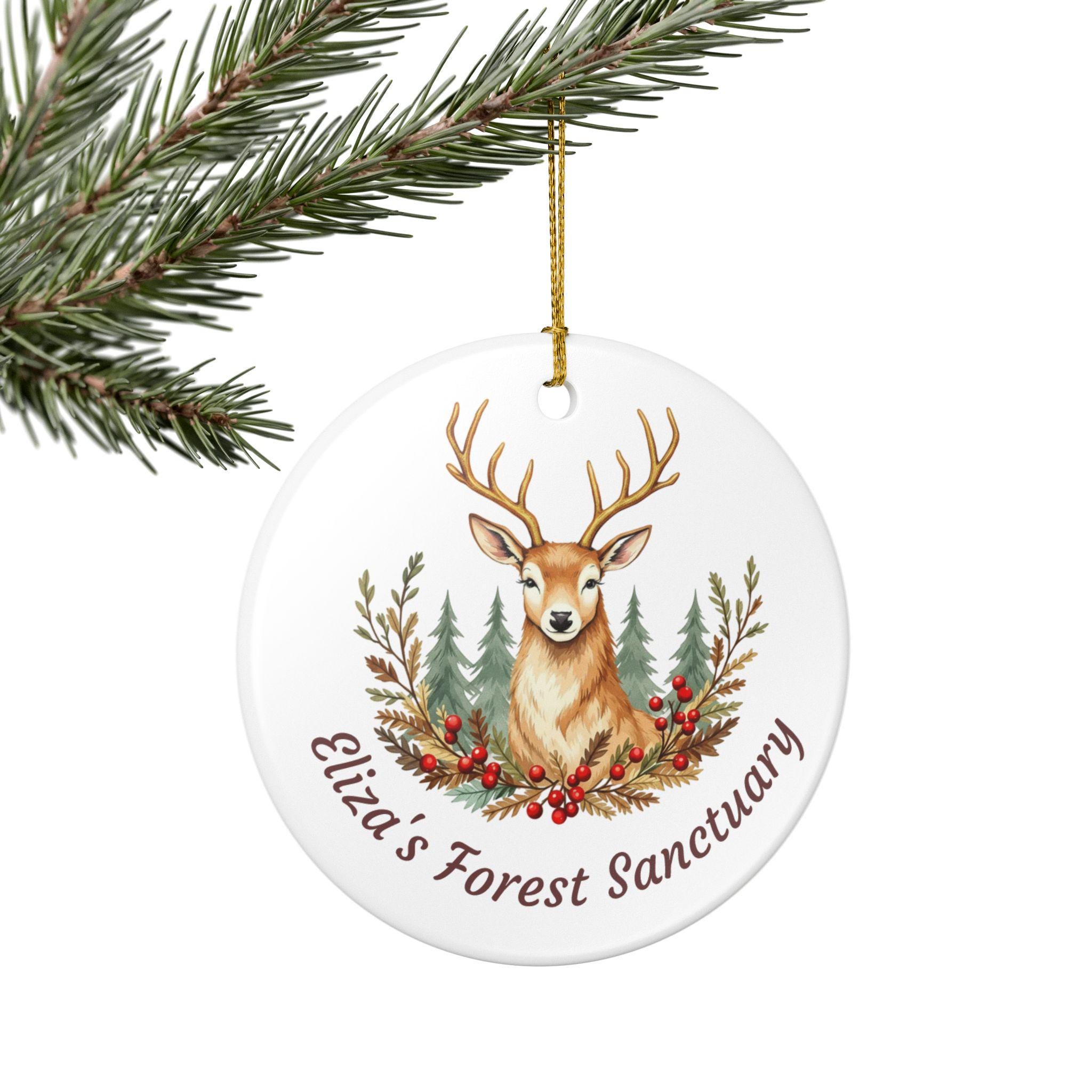 Product features - 100% white ceramic construction for lasting durability - Glossy ceramic surface with a matte-finish UV print on one side - Gold hanging string included for immediate display - Single-sided, high-resolution woodland stag design - Each pack contains one ornament; hole placement may vary slightly