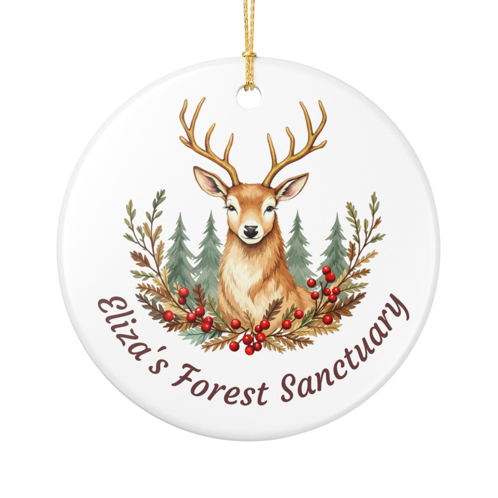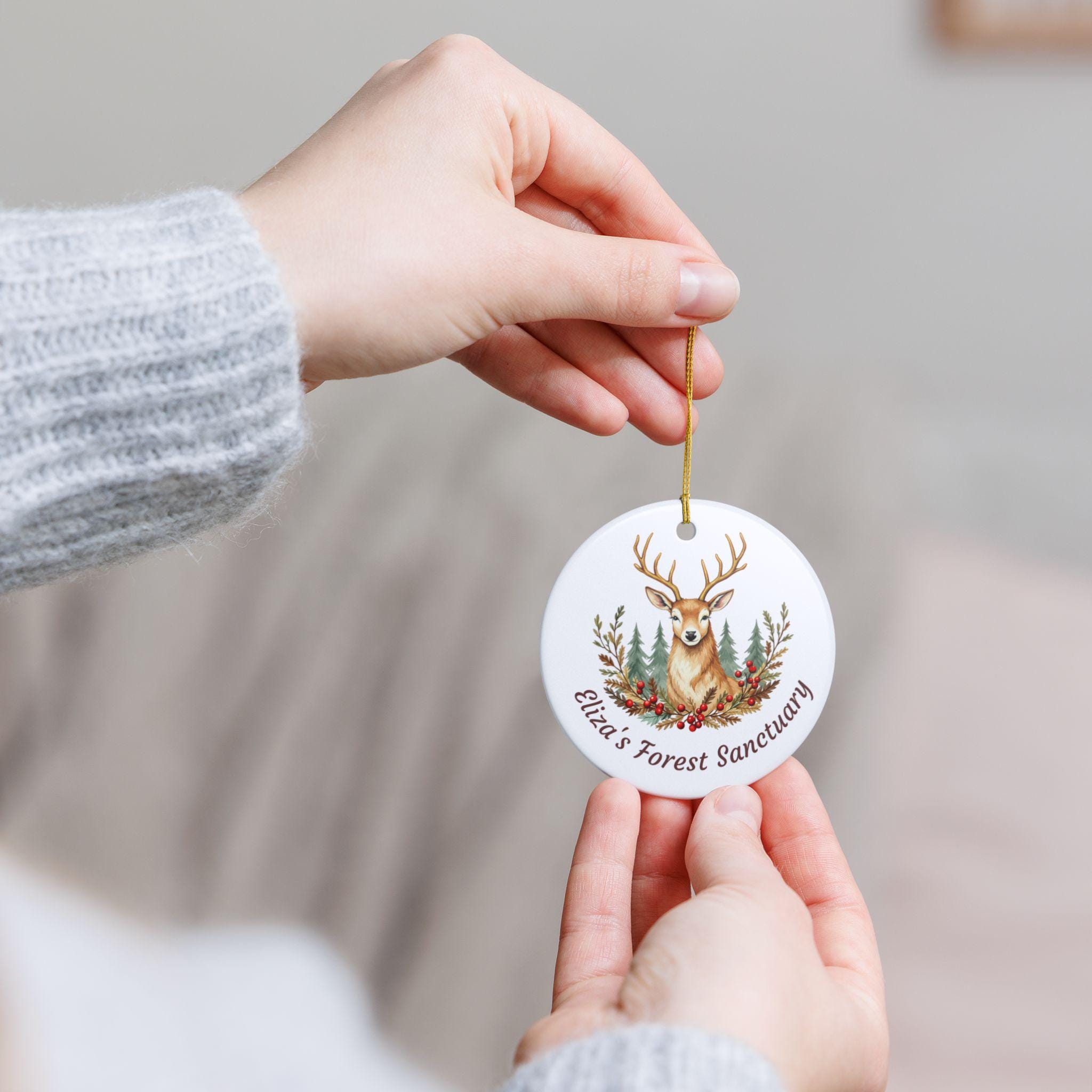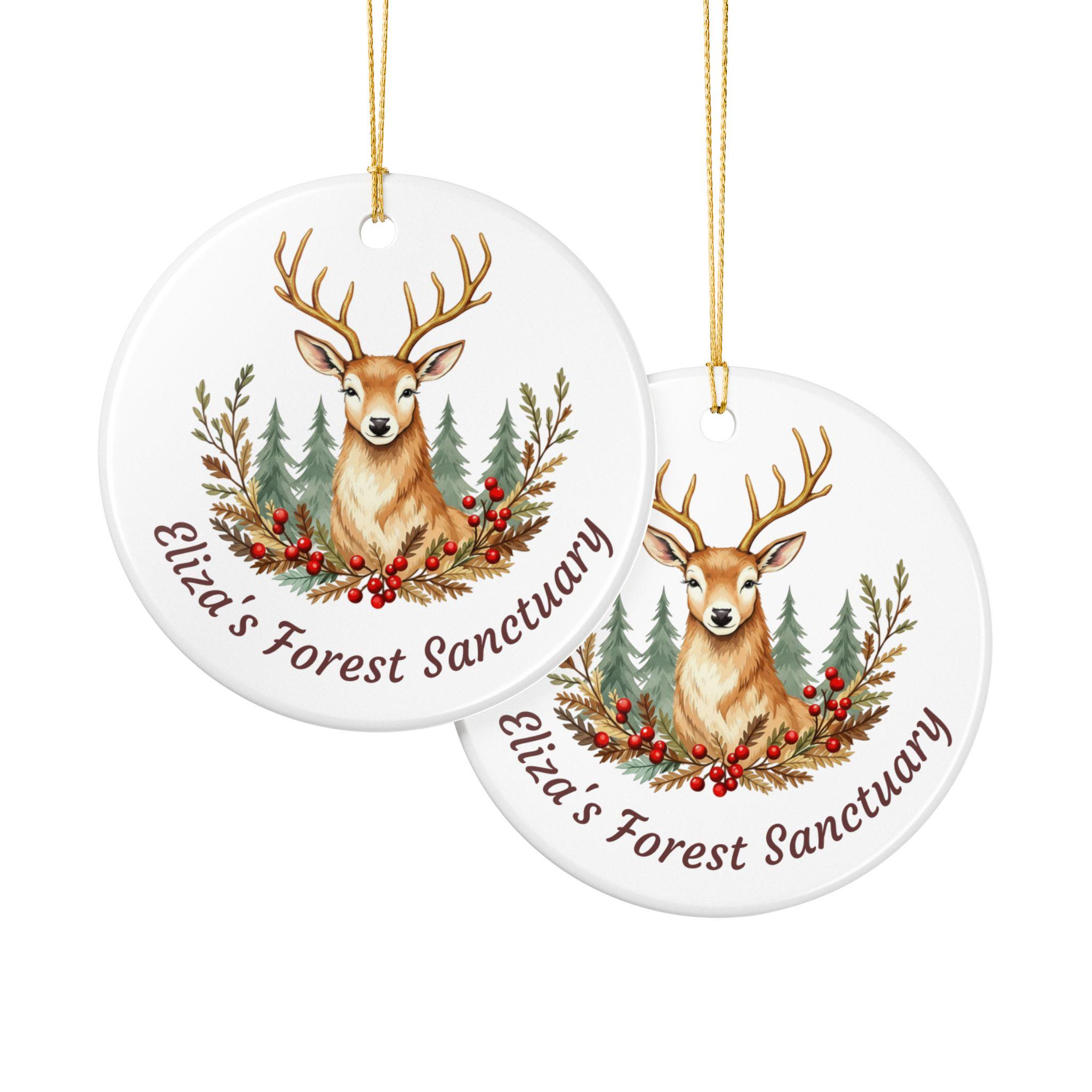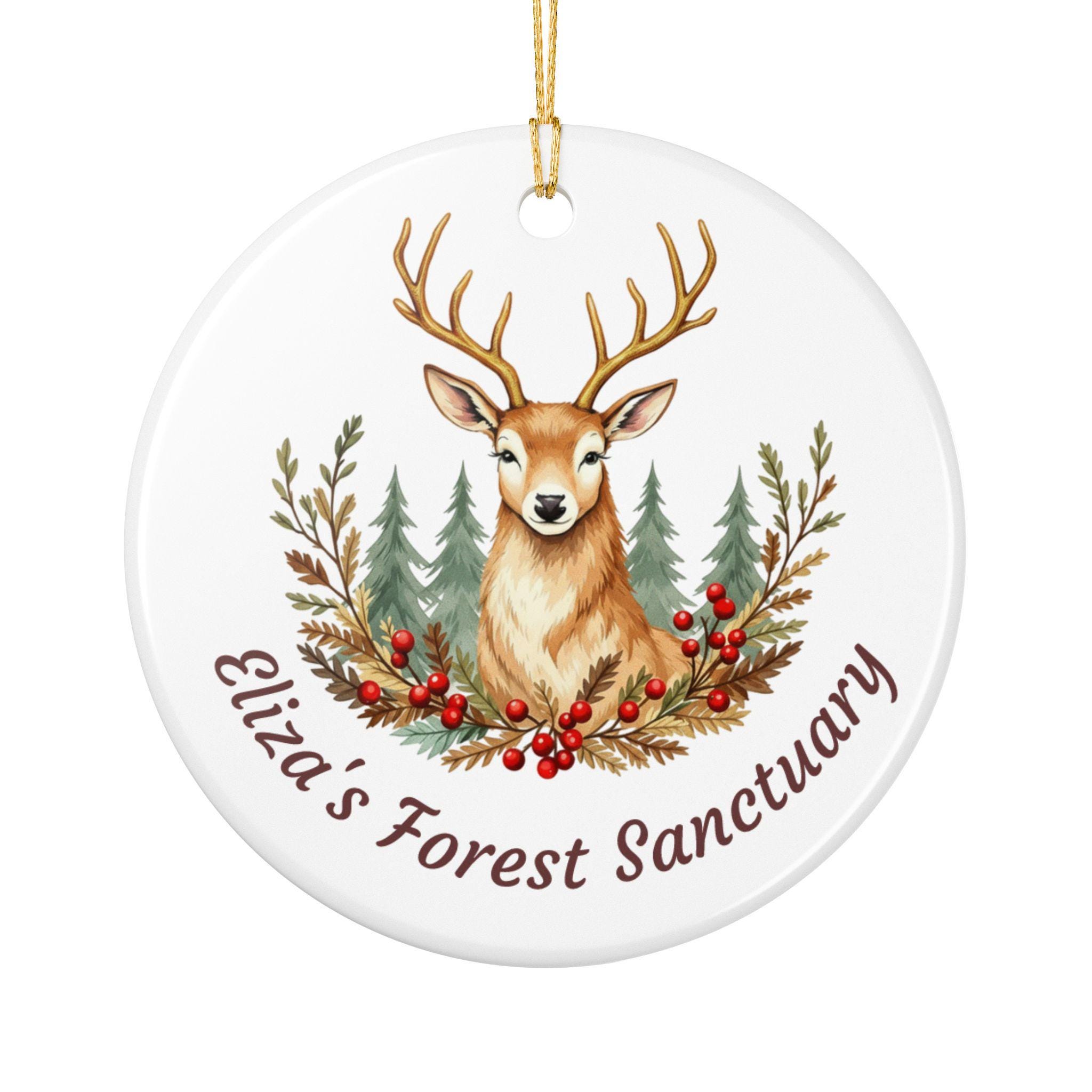 Product features - 100% white ceramic construction for lasting durability - Glossy ceramic surface with a matte-finish UV print on one side - Gold hanging string included for immediate display - Single-sided, high-resolution woodland stag design - Each pack contains one ornament; hole placement may vary slightly
