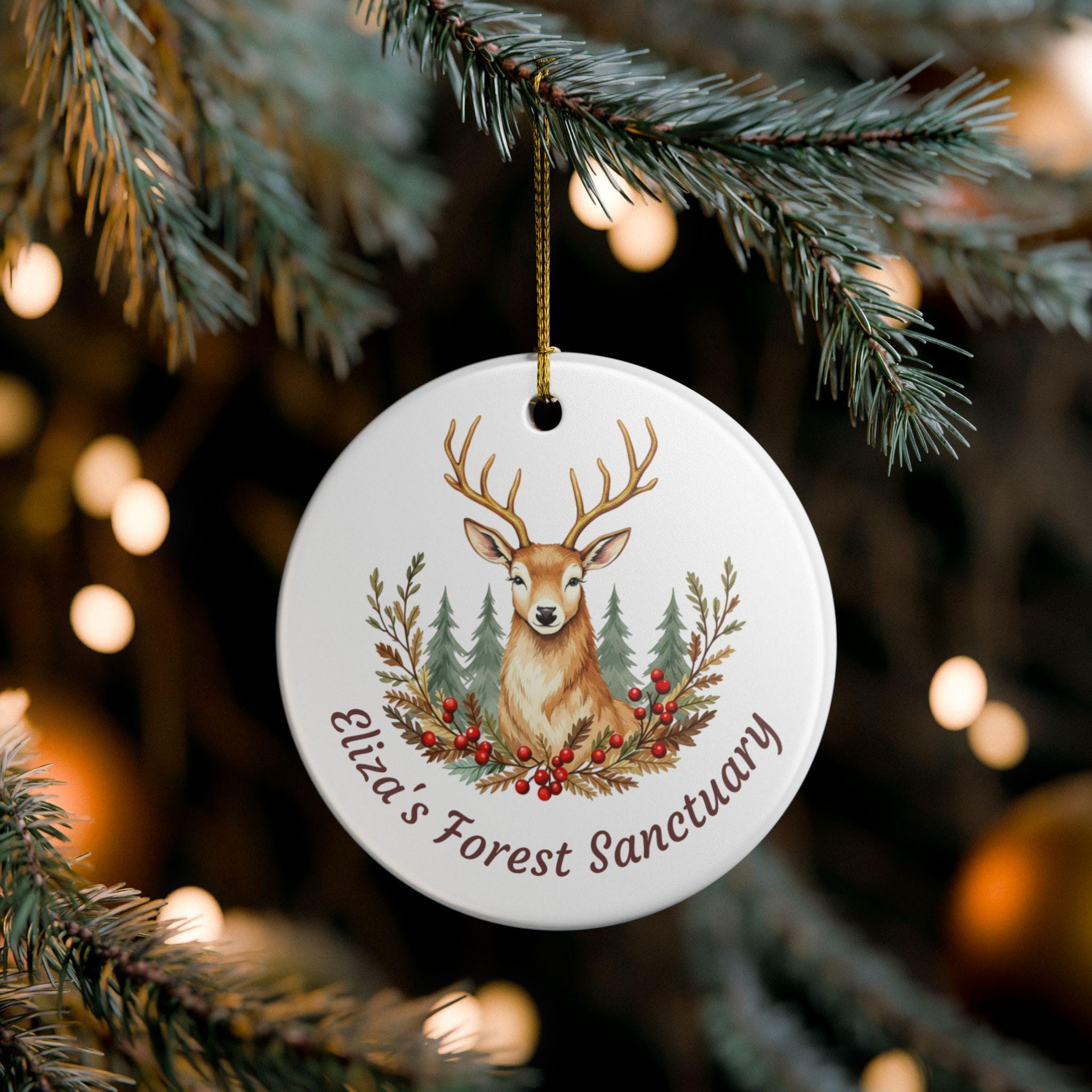 A hand-painted feeling ceramic ornament that brings a quiet woodsy moment into your home. The warm, attentive stag peers from a wreath of pine, berries and evergreens, set against a clean white background. Hang it from the included gold string on a tree, a window, or a special hook to add a gentle, nature‑first accent — like a calm walk through a winter lodge brought indoors. Personal and serene, it reads as a small sanctuary on display and complements cabins, country cottages, or any home that leans toward rustic, botanical decor.