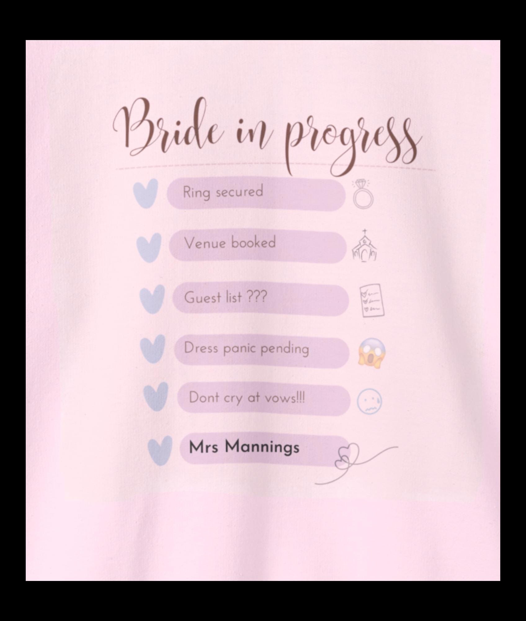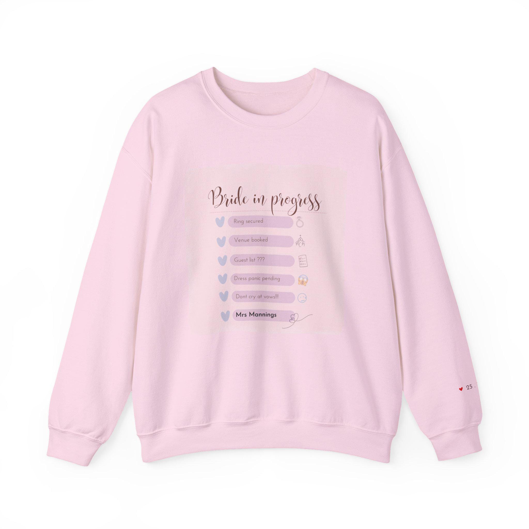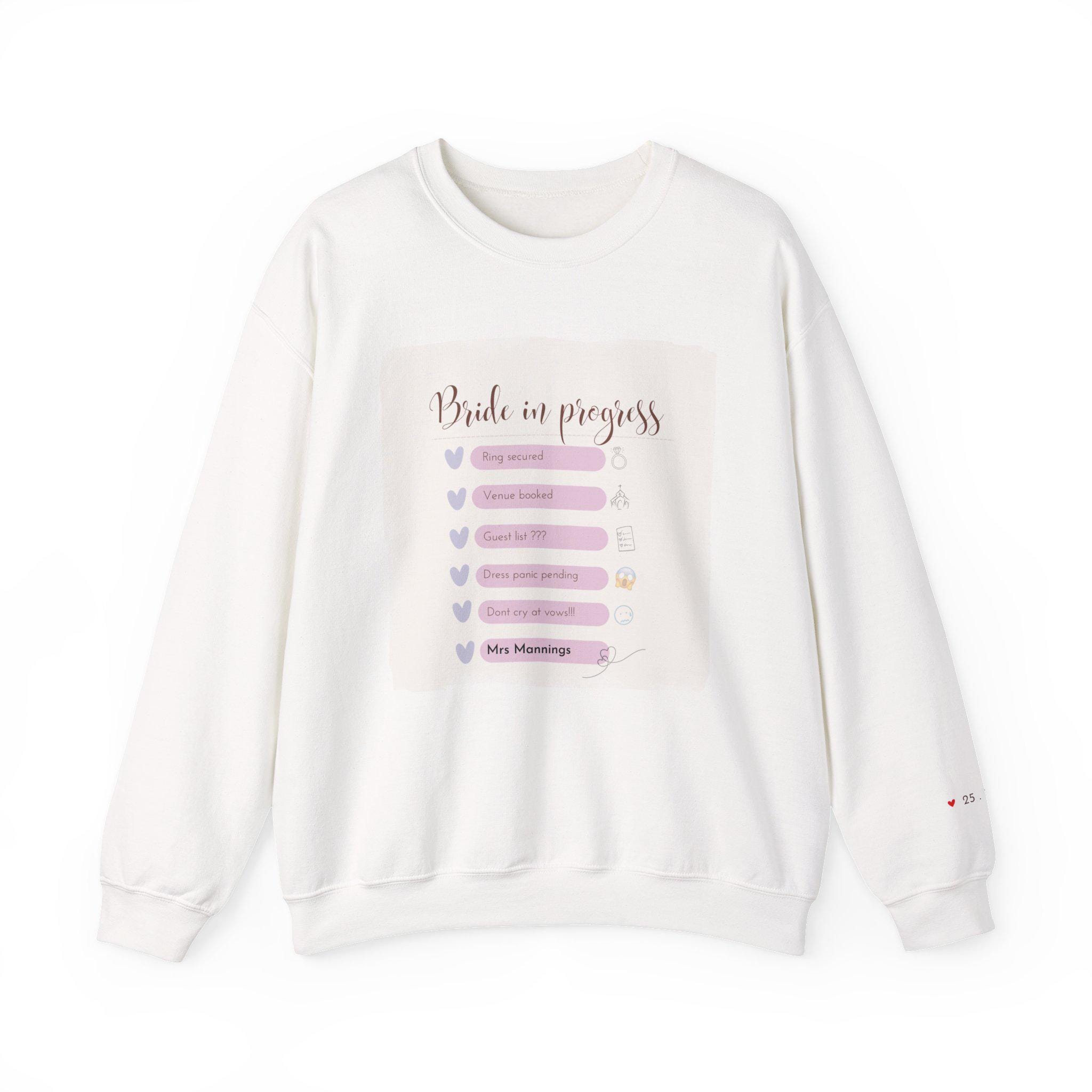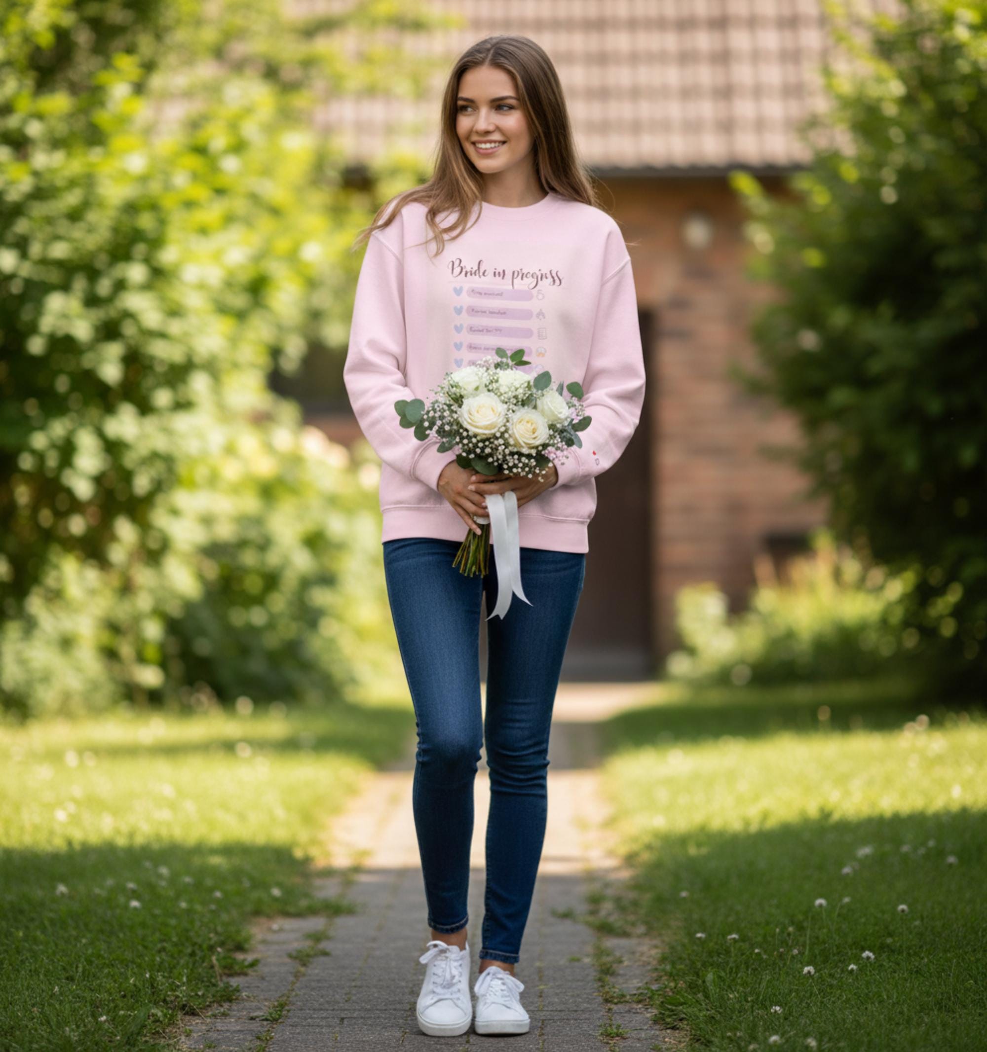 This cozy crewneck captures the joyful buzz of wedding planning with a soft, lived-in feel. The front features a delicate checklist-style design in muted lavender and blush tones reading “Bride in progress,” with tiny icons marking milestones — a playful, personal touch that settles into the everyday. Wear it during late-night planning sessions, bridal showers, or while running errands between appointments. The sweatshirt’s roomy, classic cut and pillowy fabric feel like a warm hug after a long day of decisions and celebrations. Subtle printing on the wrist and a clean back keep the look relaxed and wearable beyond wedding week, so it becomes part of the bride tribe’s regular rotation. It’s comfy during cake tastings, reassuring during dress fittings, and lighthearted at bachelorette brunches.