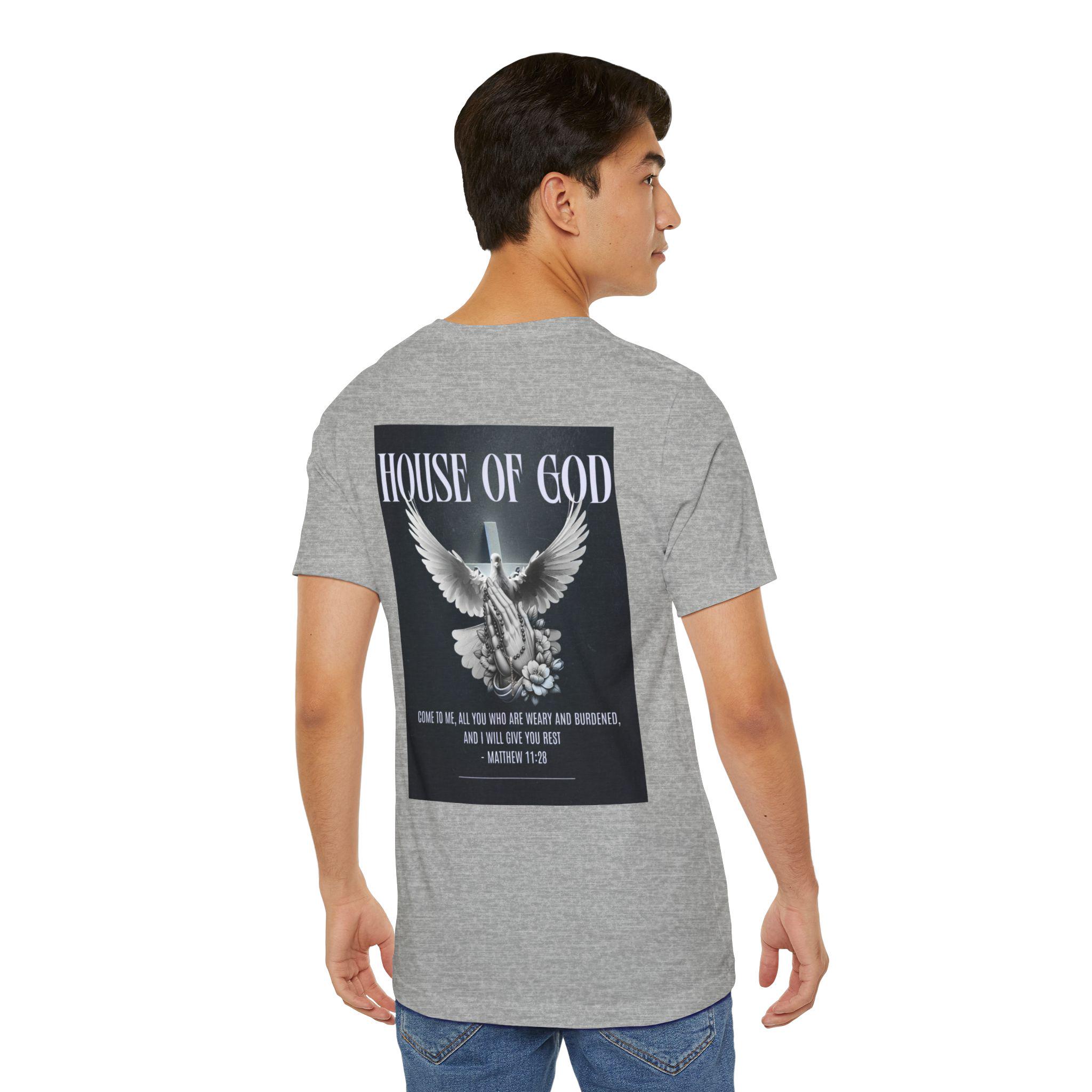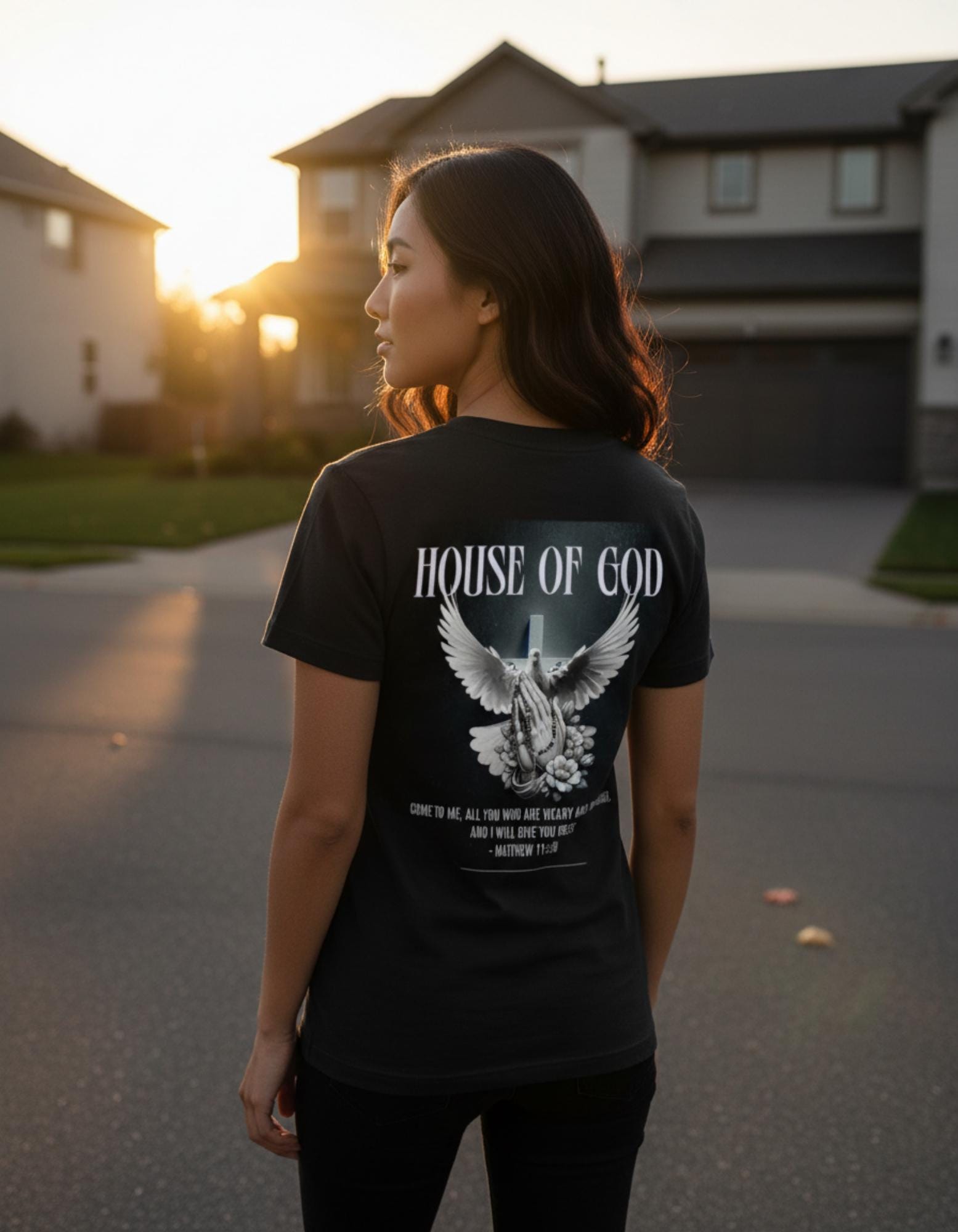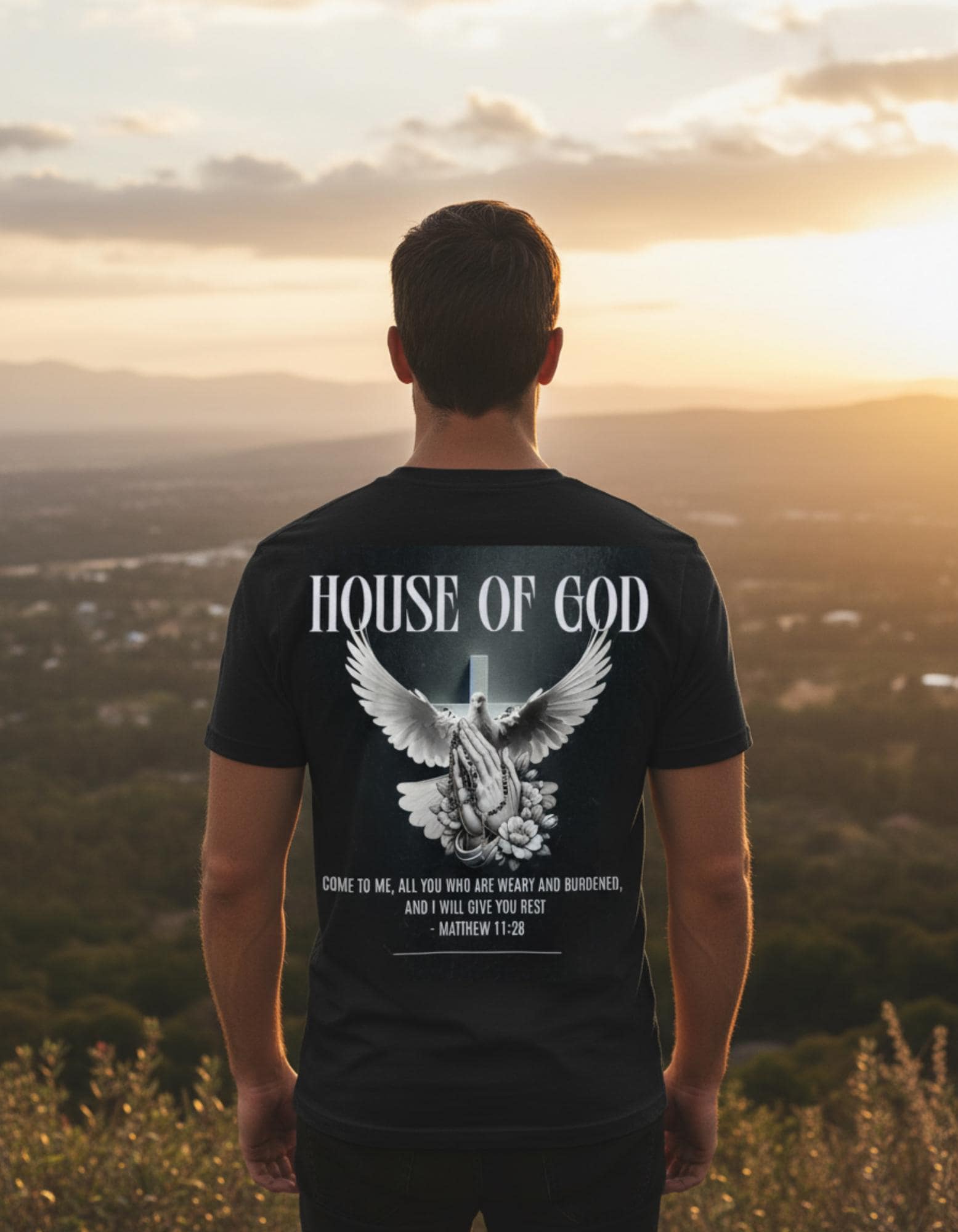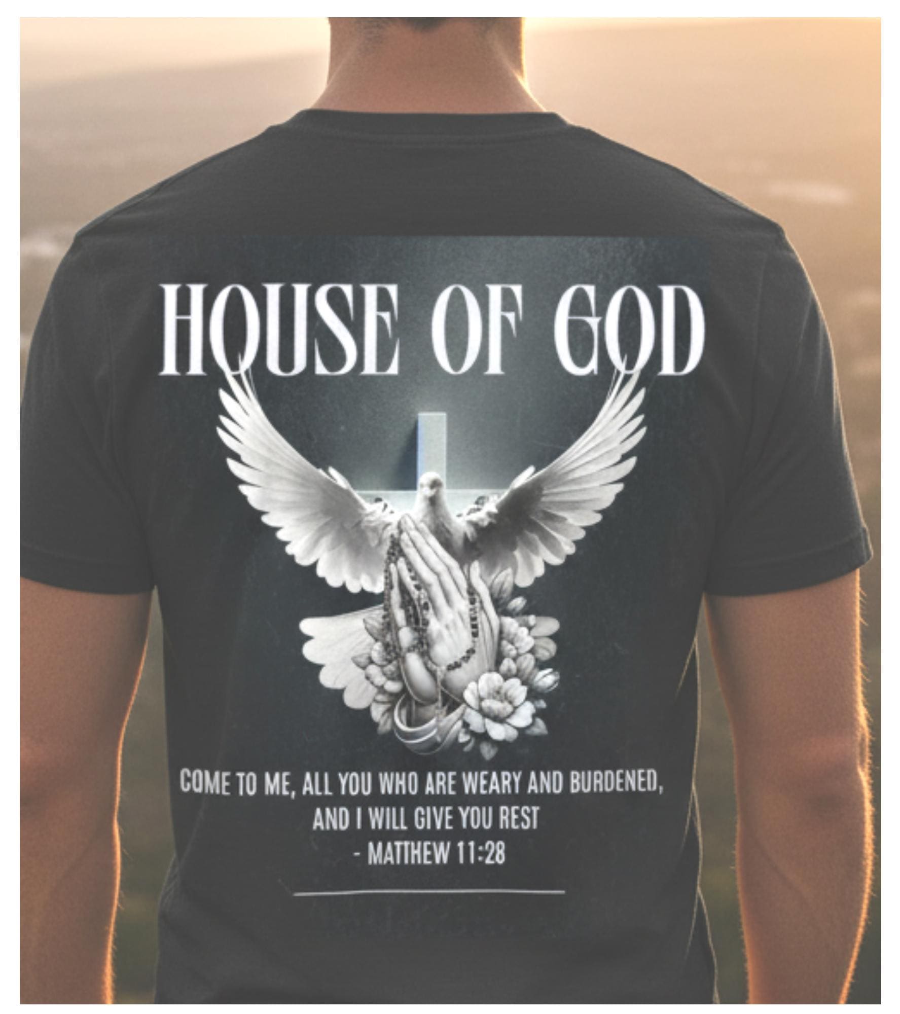 This lightweight, breathable tee carries a quiet, reverent energy — a soft canvas for a bold back print that reads “HOUSE OF GOD” above a praying hands and dove motif. The front bears a small chest emblem, giving a subtle nod to faith while the large back graphic invites reflection. Wear it to worship services, community gatherings, or when you want a calm reminder of faith woven into your everyday look. The relaxed retail fit and crew neckline make it easy to layer under jackets or wear solo with jeans or joggers. It feels like a familiar hymn turned into clothing: gentle, steady, and unpretentious.
