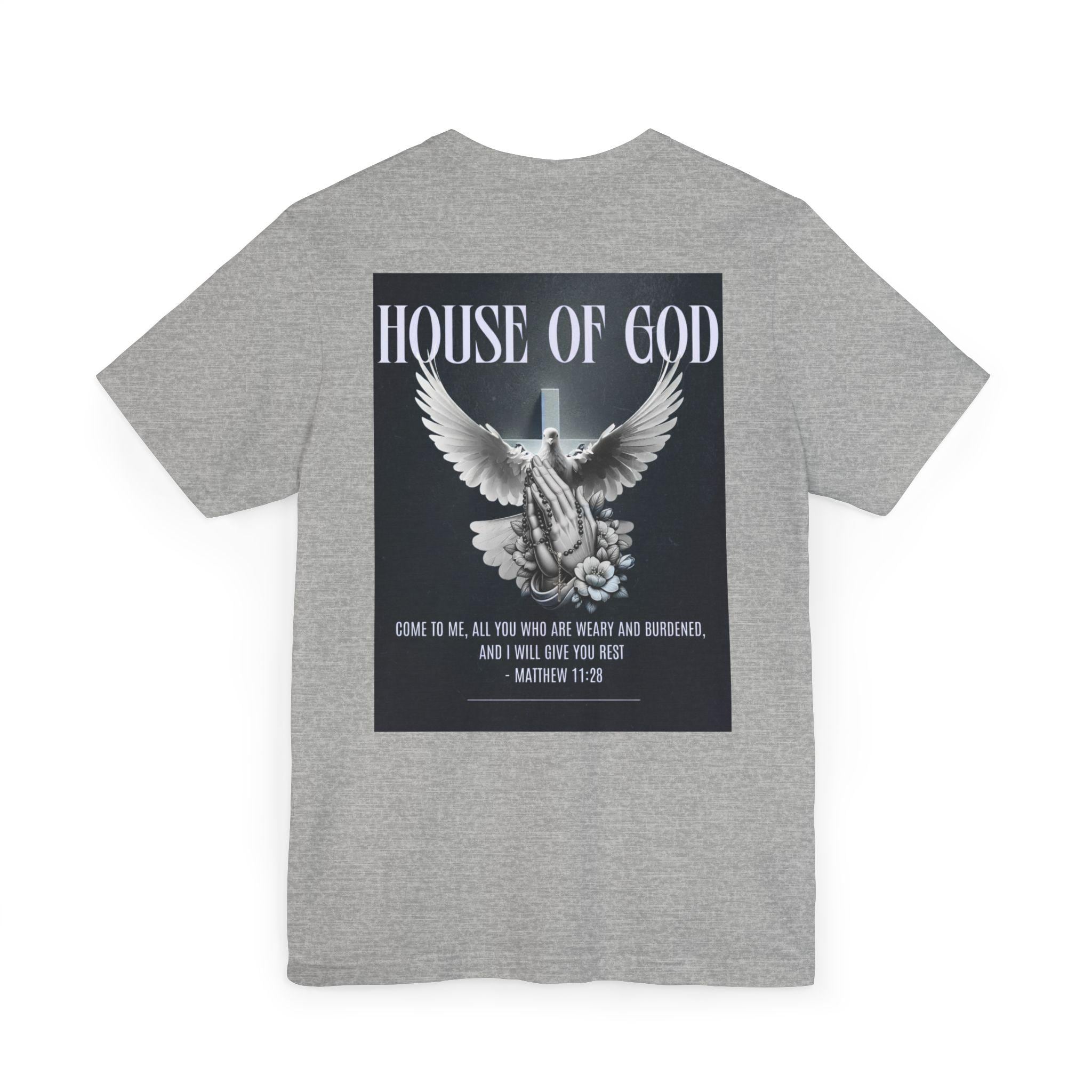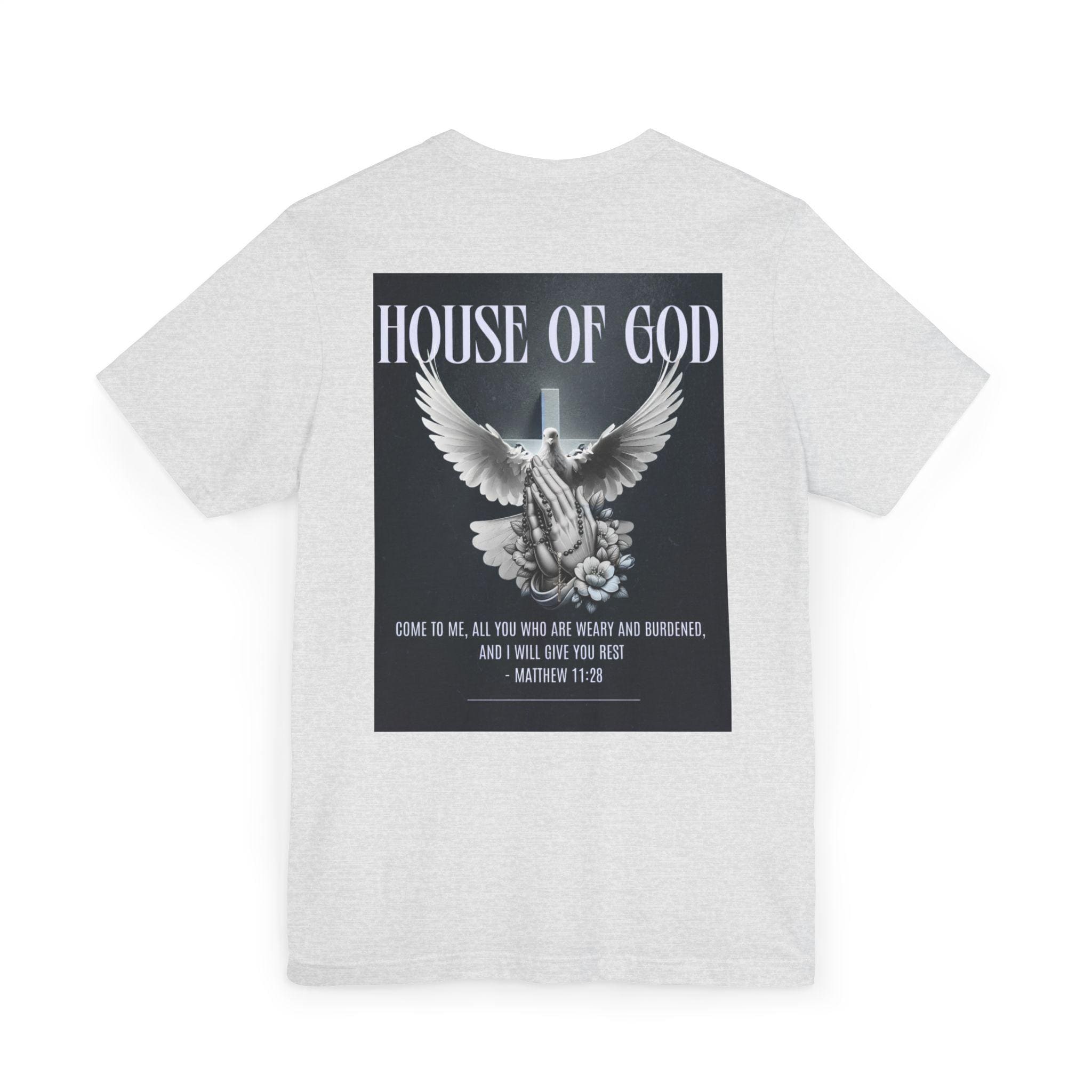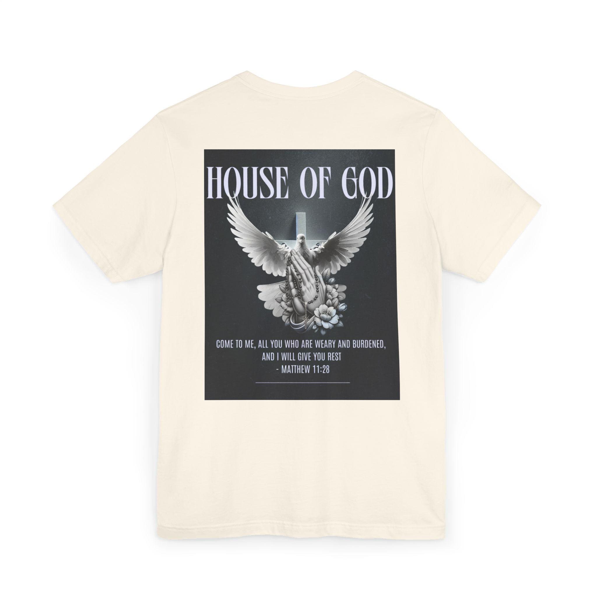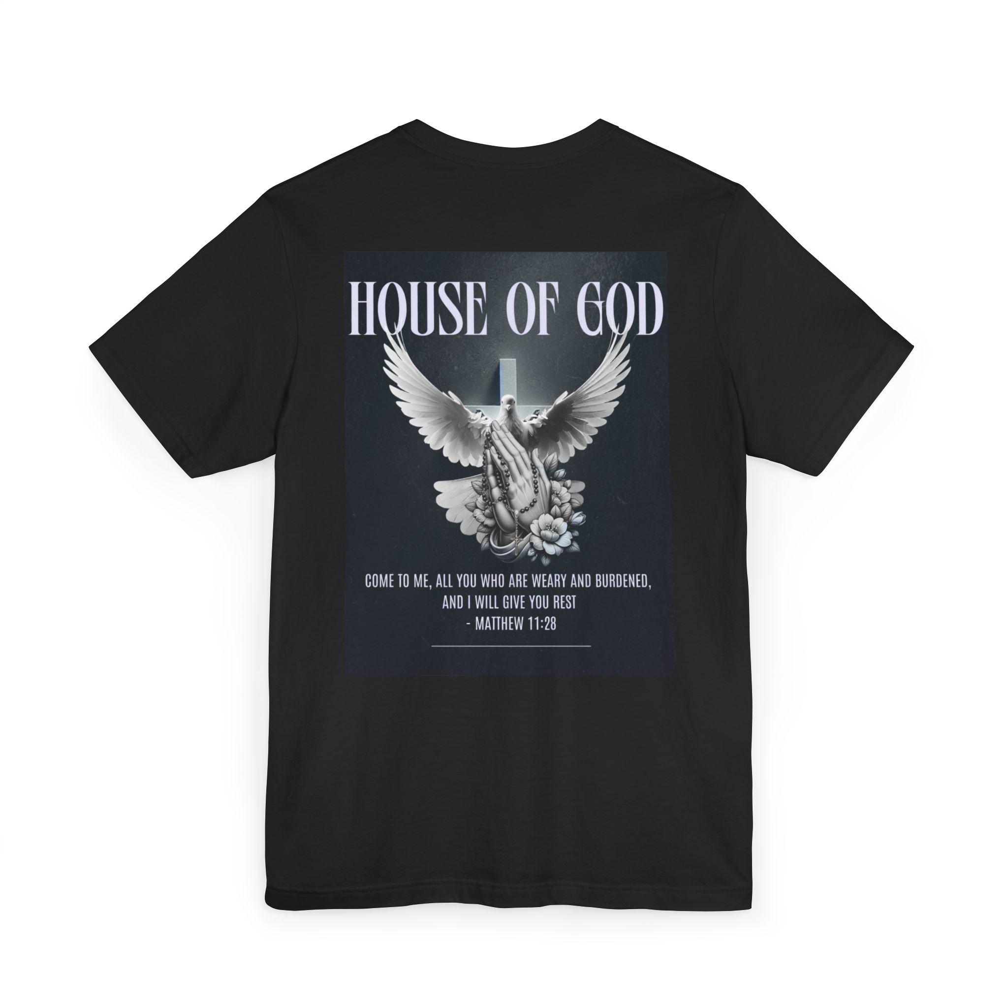 This lightweight, breathable tee carries a quiet, reverent energy — a soft canvas for a bold back print that reads “HOUSE OF GOD” above a praying hands and dove motif. The front bears a small chest emblem, giving a subtle nod to faith while the large back graphic invites reflection. Wear it to worship services, community gatherings, or when you want a calm reminder of faith woven into your everyday look. The relaxed retail fit and crew neckline make it easy to layer under jackets or wear solo with jeans or joggers. It feels like a familiar hymn turned into clothing: gentle, steady, and unpretentious.