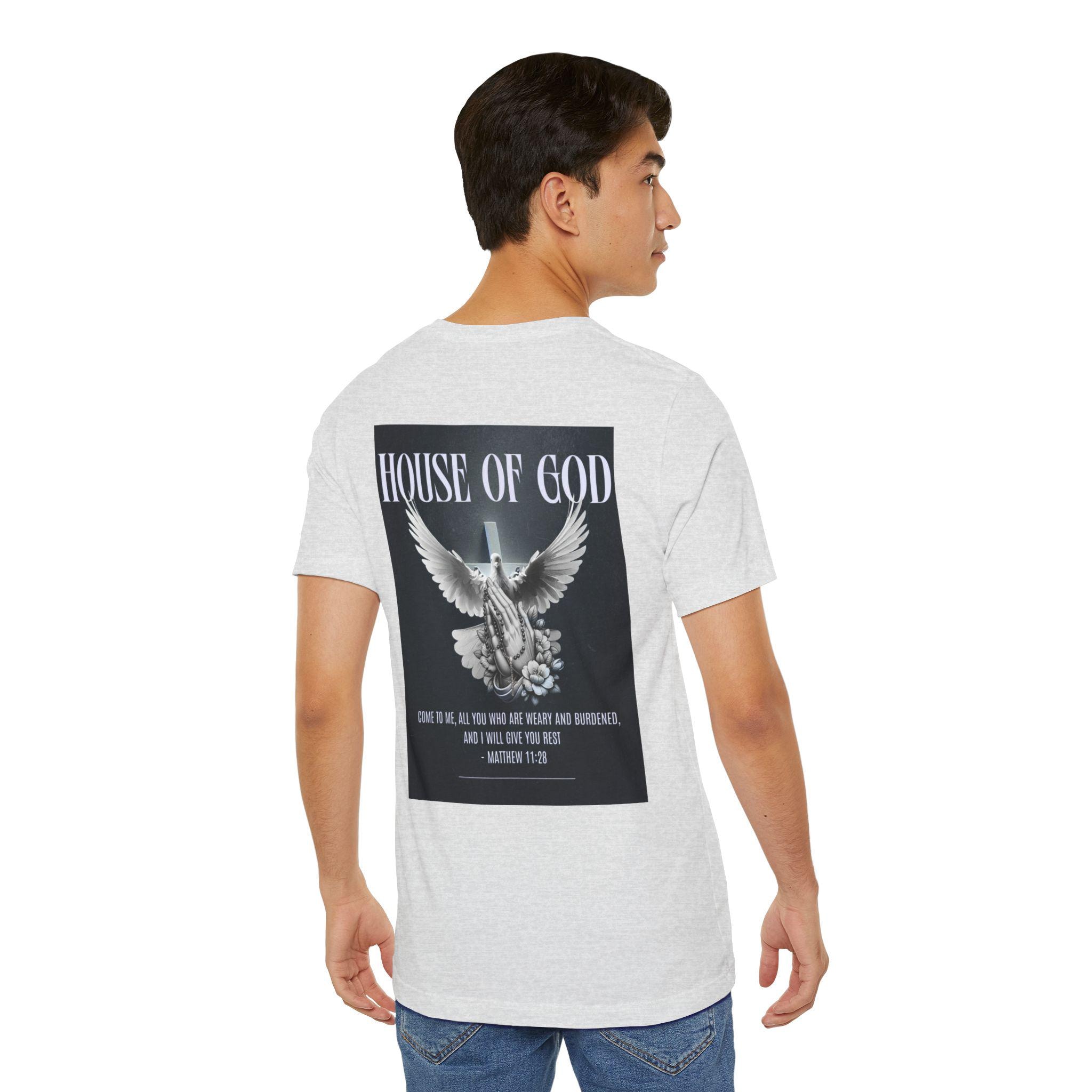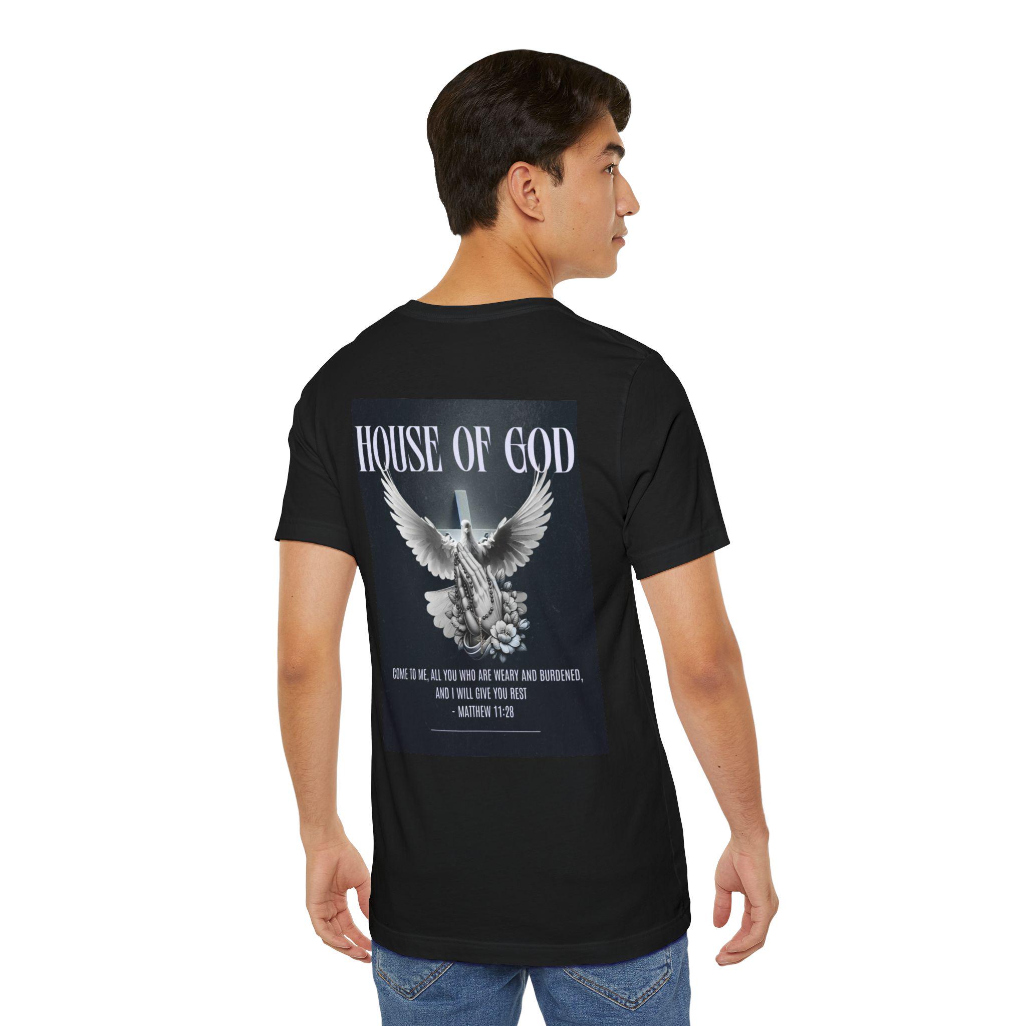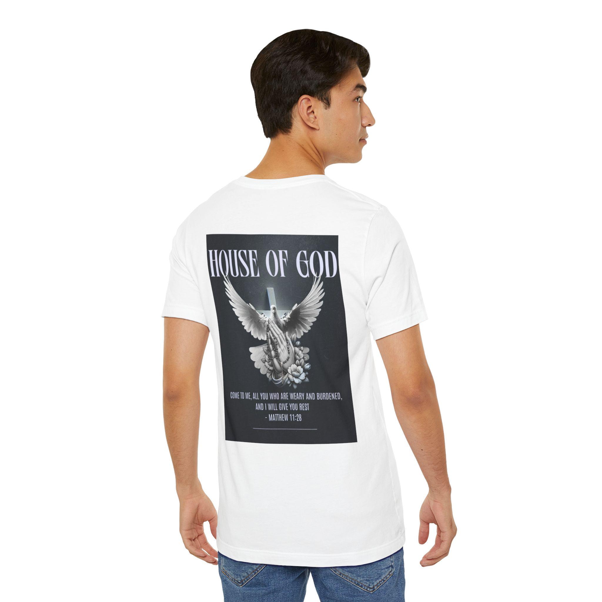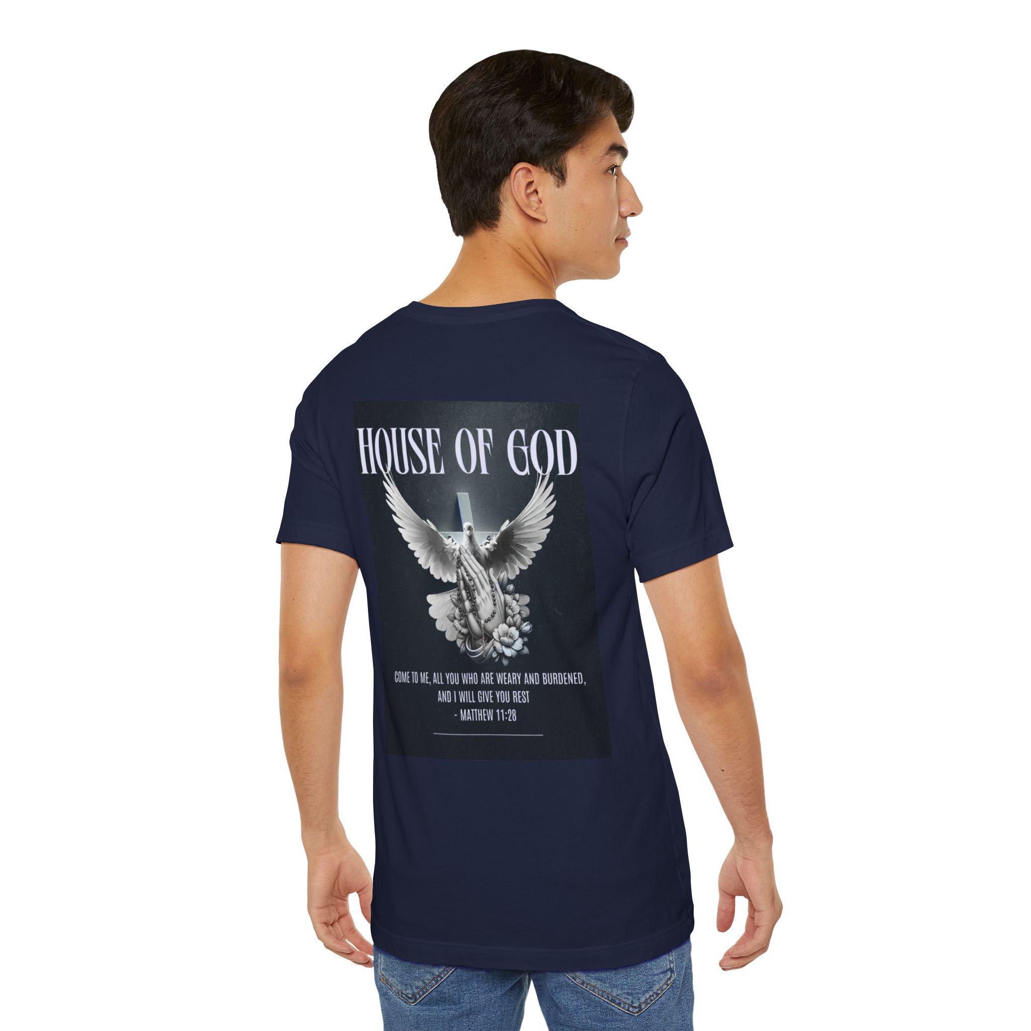 This lightweight, breathable tee carries a quiet, reverent energy — a soft canvas for a bold back print that reads “HOUSE OF GOD” above a praying hands and dove motif. The front bears a small chest emblem, giving a subtle nod to faith while the large back graphic invites reflection. Wear it to worship services, community gatherings, or when you want a calm reminder of faith woven into your everyday look. The relaxed retail fit and crew neckline make it easy to layer under jackets or wear solo with jeans or joggers. It feels like a familiar hymn turned into clothing: gentle, steady, and unpretentious.