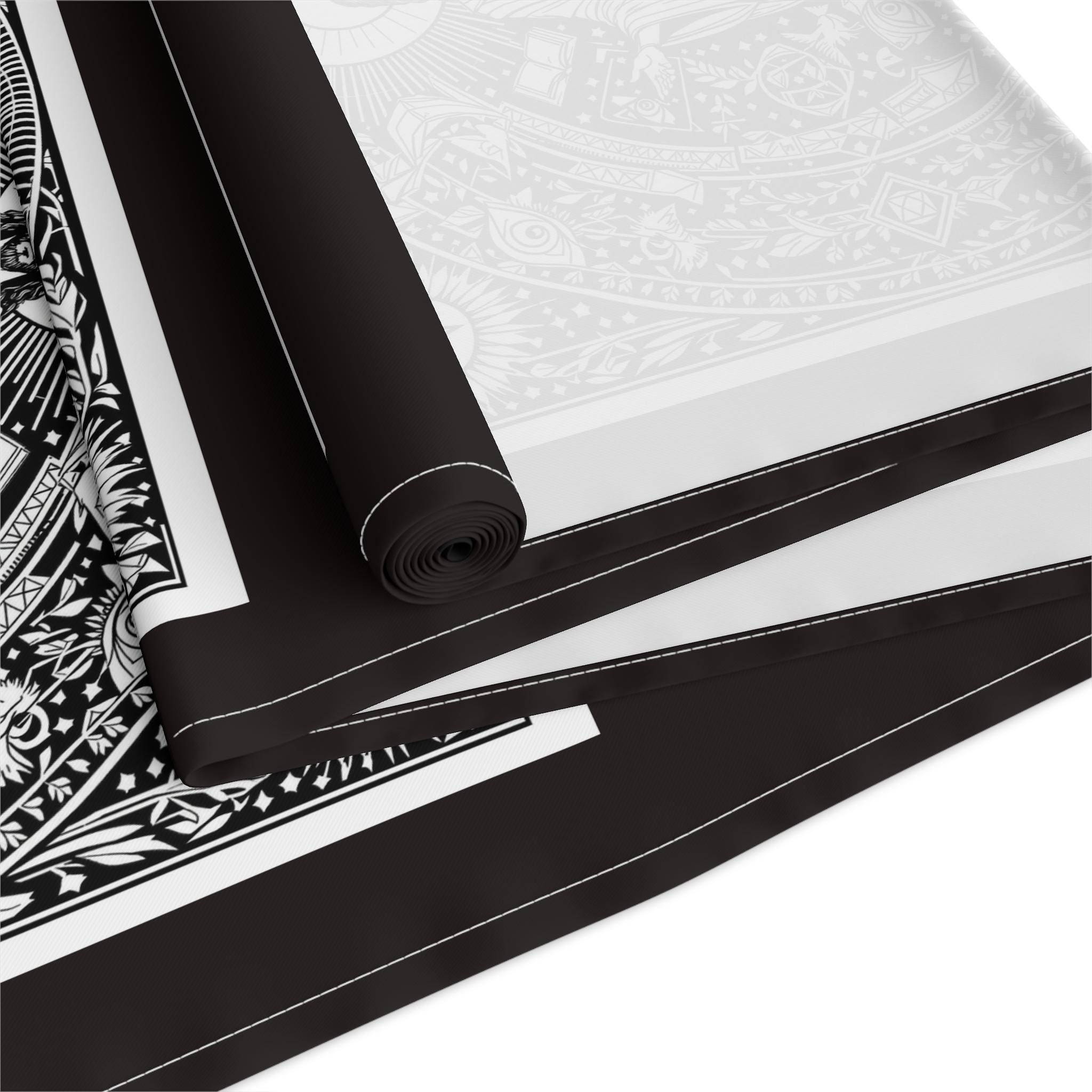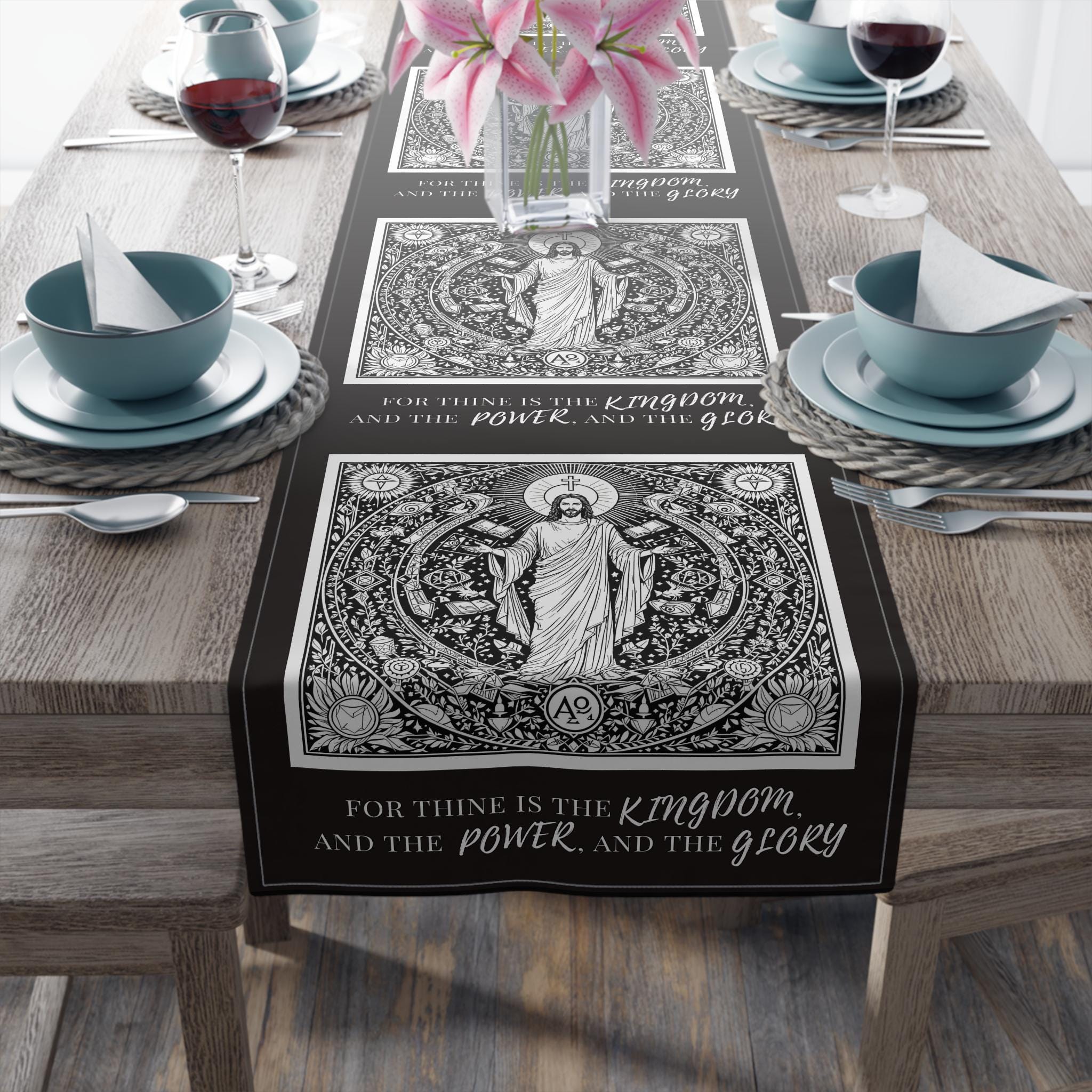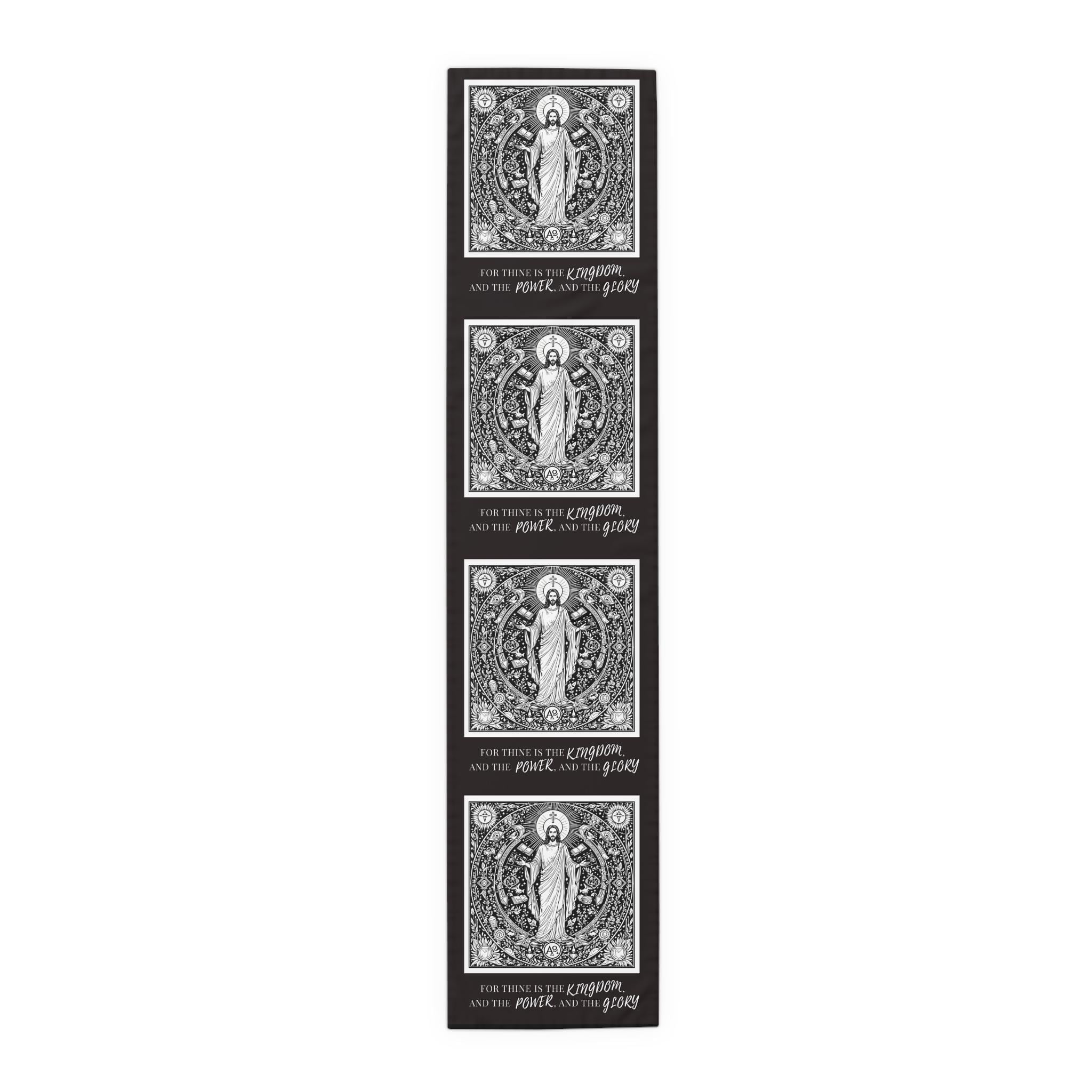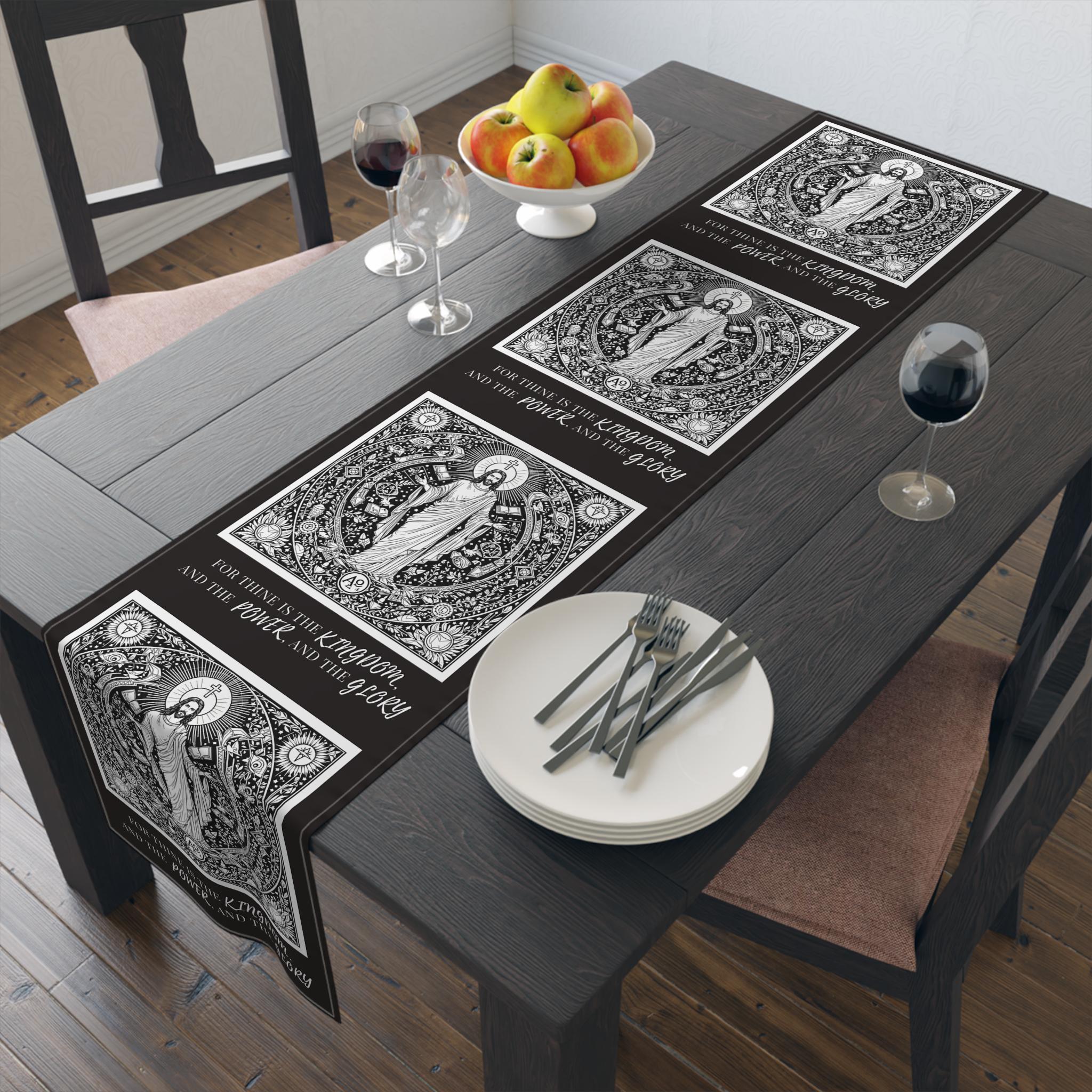 A long, artful table runner that brings quiet reverence and vintage charm to a dining table or altar. Rendered in detailed black-and-white panels, the design shows a timeless, illustrated figure framed by ornate, floral patterns and hand-lettered text. The runner’s narrow profile and repeated motif create a rhythmic centerpiece that guides the eye along a table set for ritual, family meals, or contemplative moments. Choose a crisp polyester option for vibrant, high-contrast prints that stay true over time, or a cotton twill version for a softer, more muted look with a traditional textile feel. Hemmed edges keep the piece neat and durable, and two length options make it easy to scale from a cozy sideboard to a long farmhouse table.