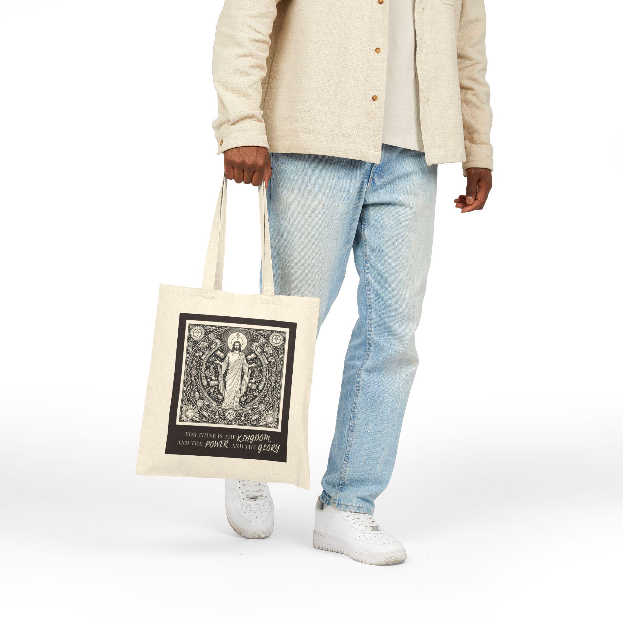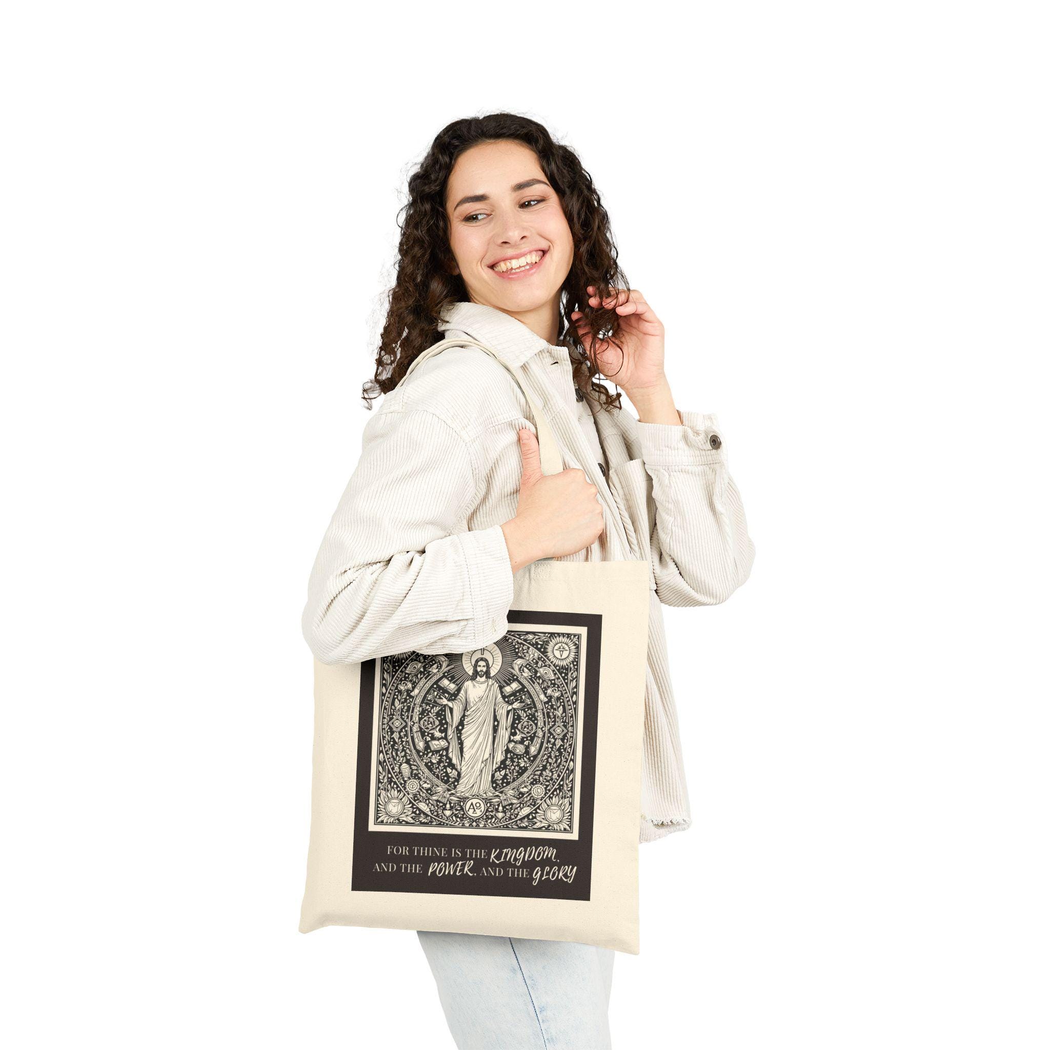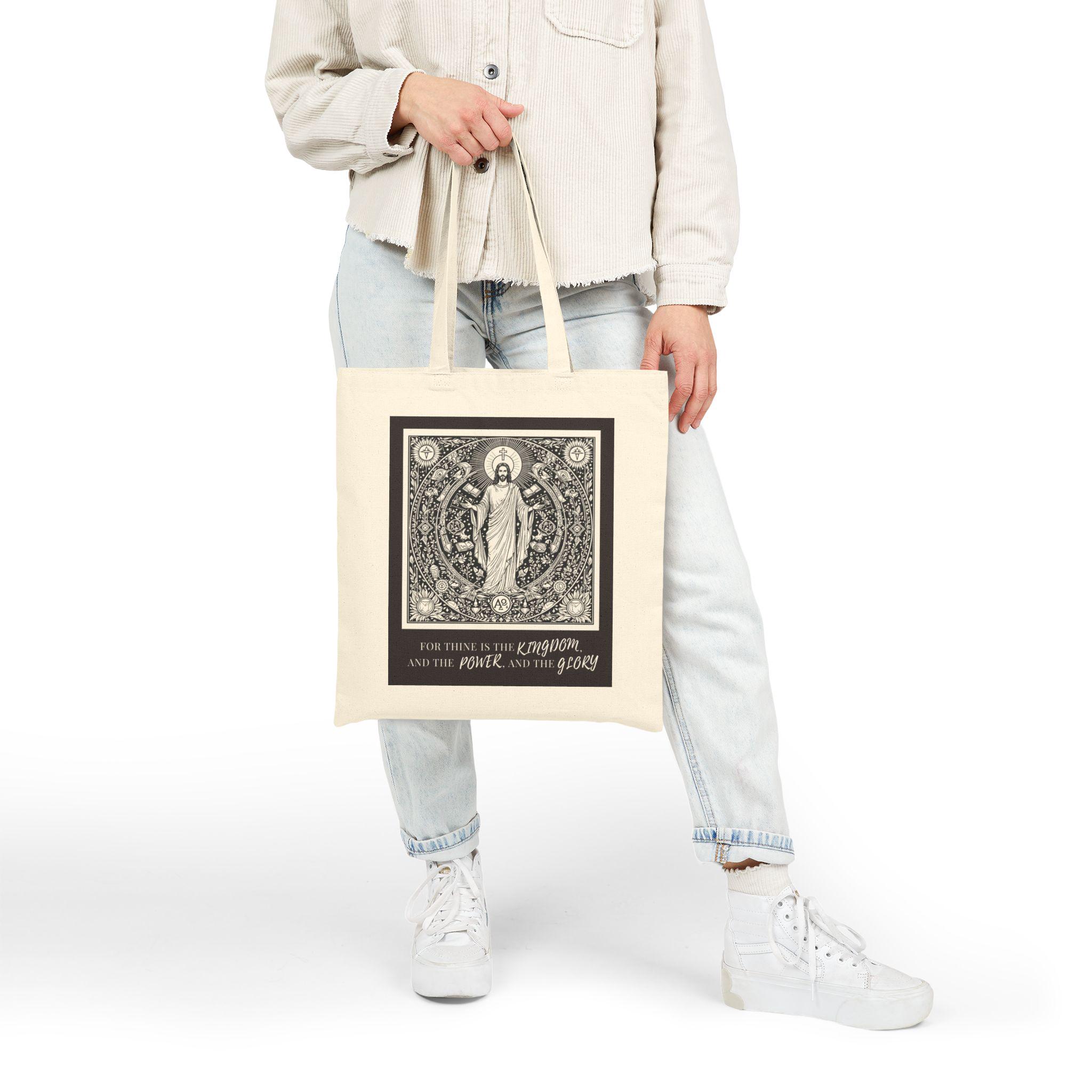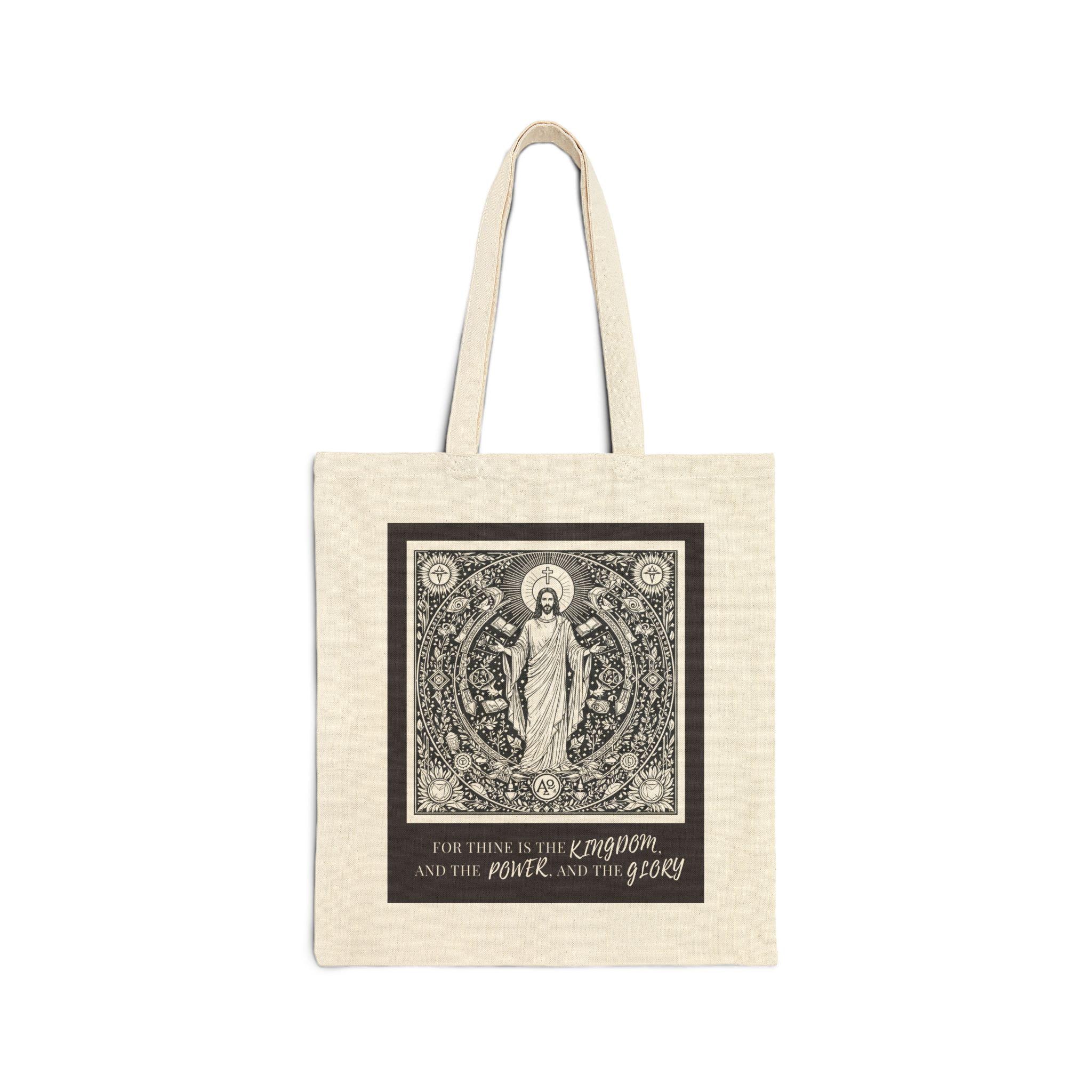 Lightweight yet sturdy, this cotton canvas tote (for thine is the kingdom, and the power, and the glory) brings a quietly reverent aesthetic to everyday carrying. The artful vintage-inspired print rests in a dark frame on natural canvas, giving the bag an old-world, contemplative presence. It fits into slow mornings and mindfulness routines — a place for a paperback, a journal, or market finds. The reinforced handles and flat profile keep the silhouette simple and reliable while the heavy-weight canvas stands up to repeated use. Wear it to a weekend service, a candlelit vigils, or while wandering antique shops; it complements calm, intentional days and those who collect objects that feel thoughtful and lived-in.