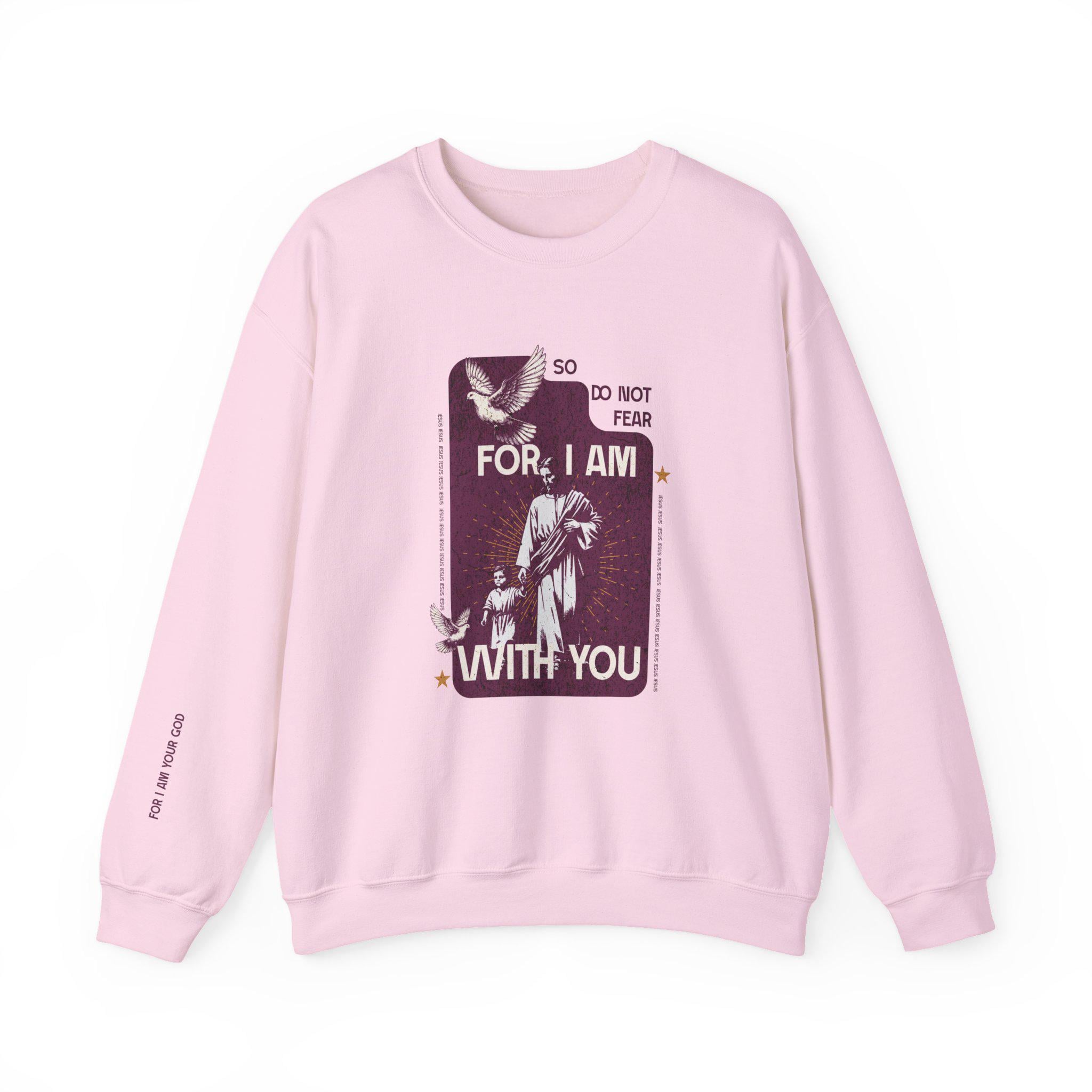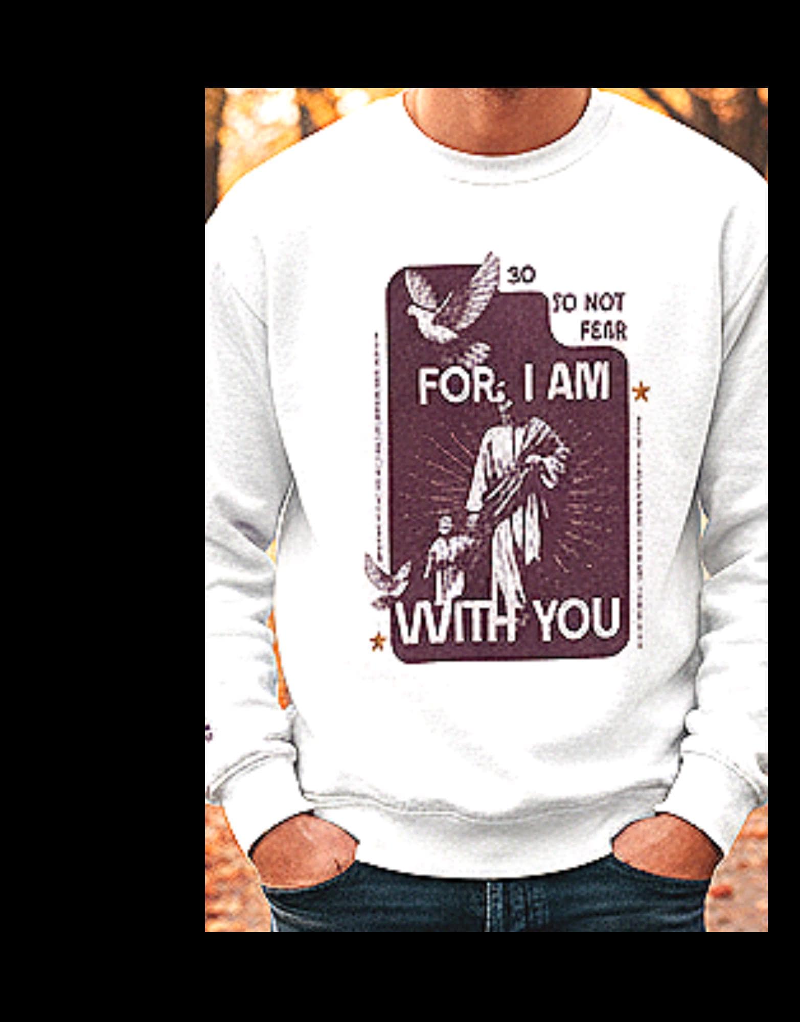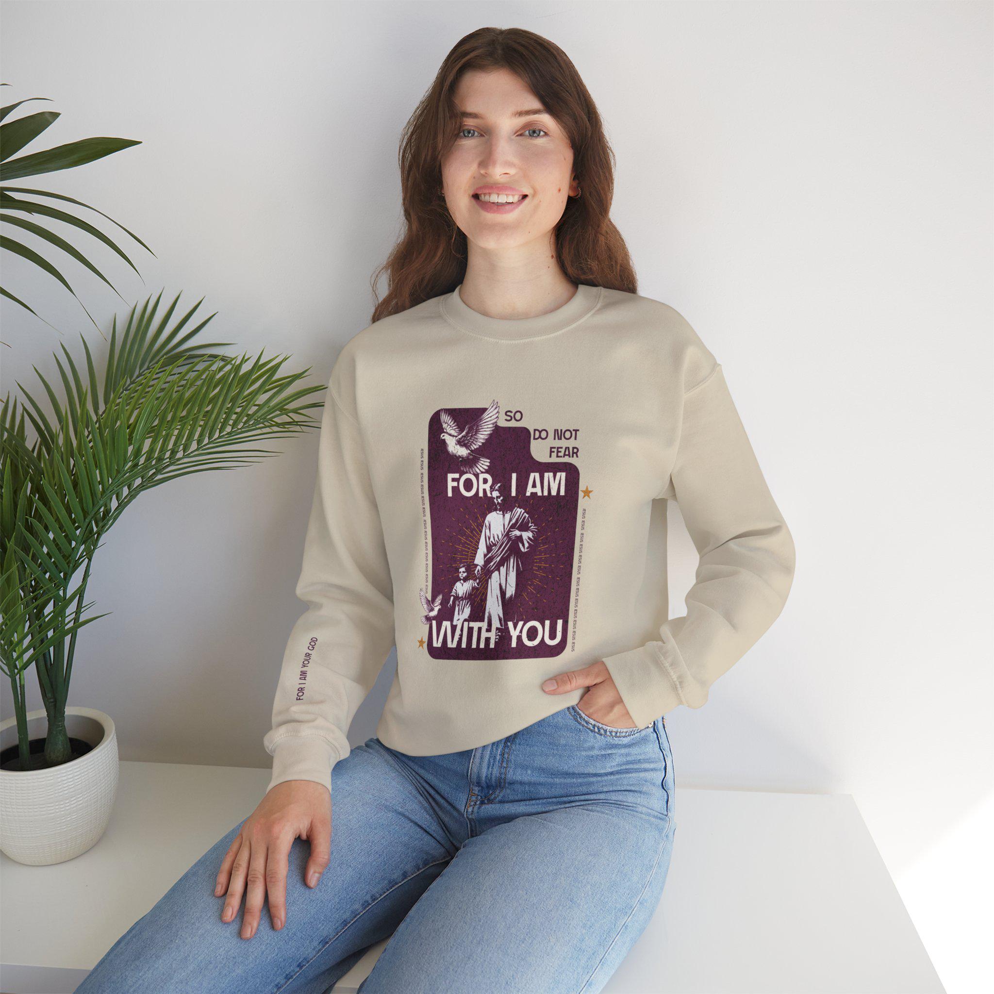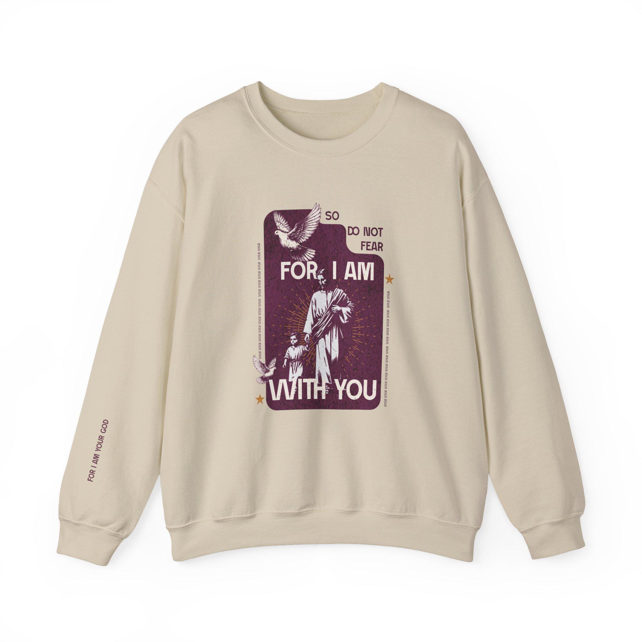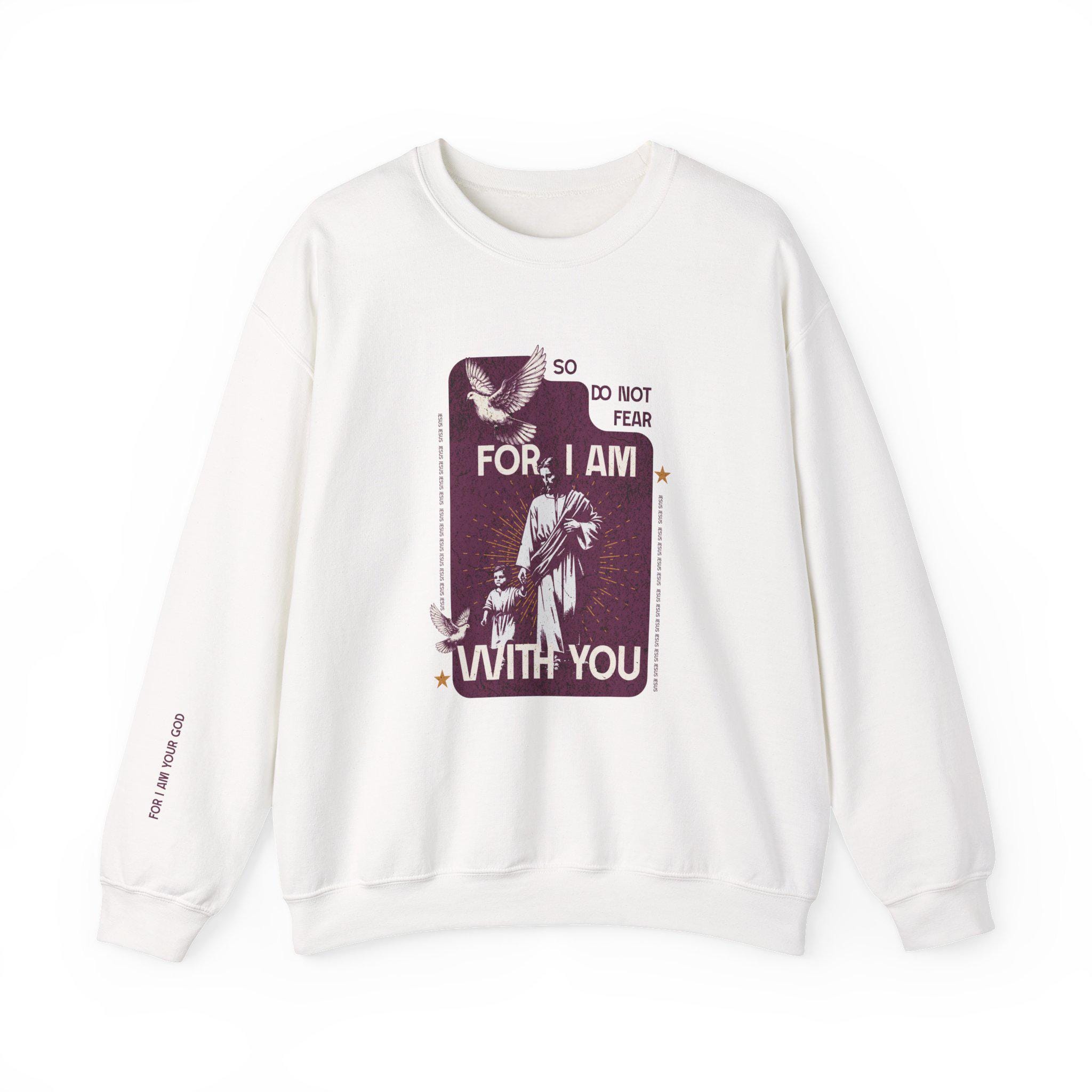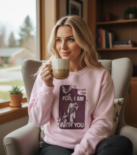 This soft, midweight crewneck brings a quiet, comforting presence to your everyday wardrobe. The front artwork — a vintage-style devotional panel with the words "So, Do Not Fear - For, I am with you" and a small dove motif — reads like a worn prayer card turned into wearable reassurance. Words "Do Not Be Dismayed" on the left sleeve and "For I Am Your God" on the right sleeve. The clean white background and relaxed cut let the graphic sit front-and-center without shouting, while subtle wrist text keeps the message intimate. Slip it on for slow mornings, community gatherings, or evenings by the fire; it layers easily under coats and over button-ups. Made to last, it feels lived-in from the first wear and keeps its shape through repeated washing, becoming a familiar, steady piece in your rotation.