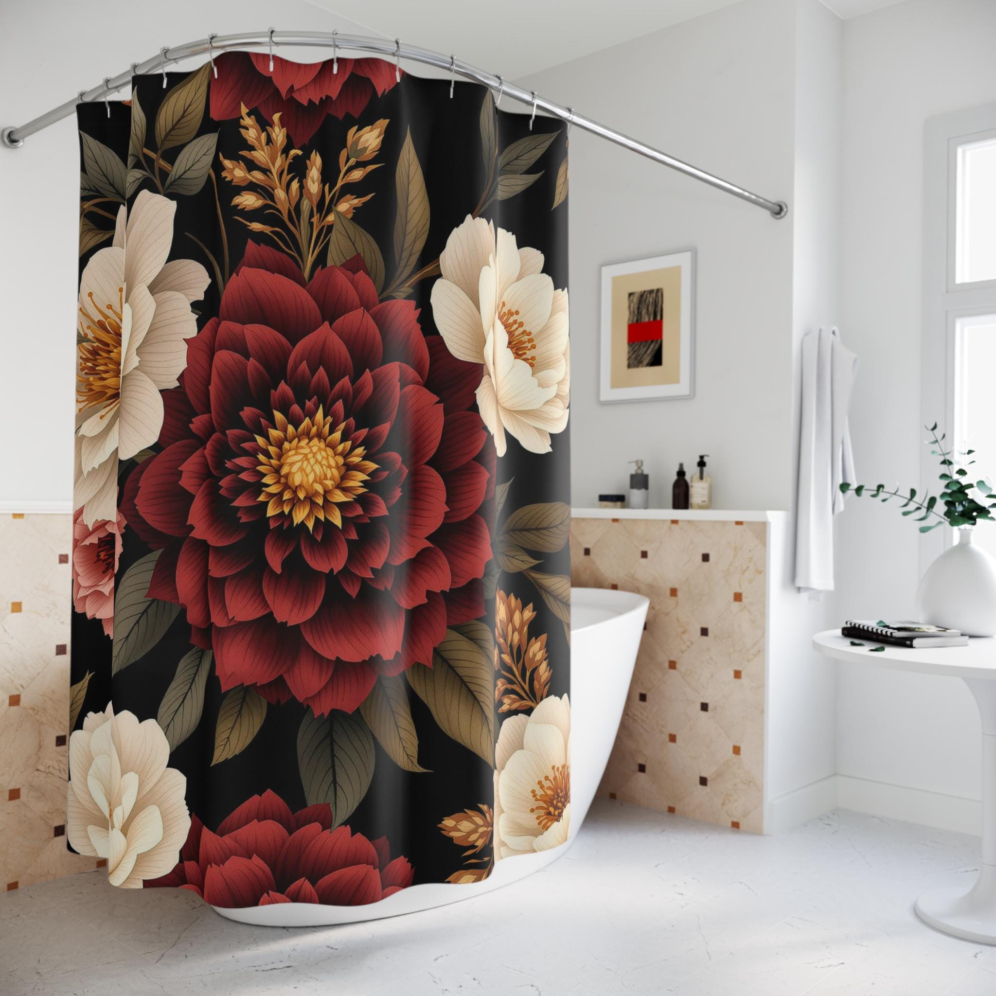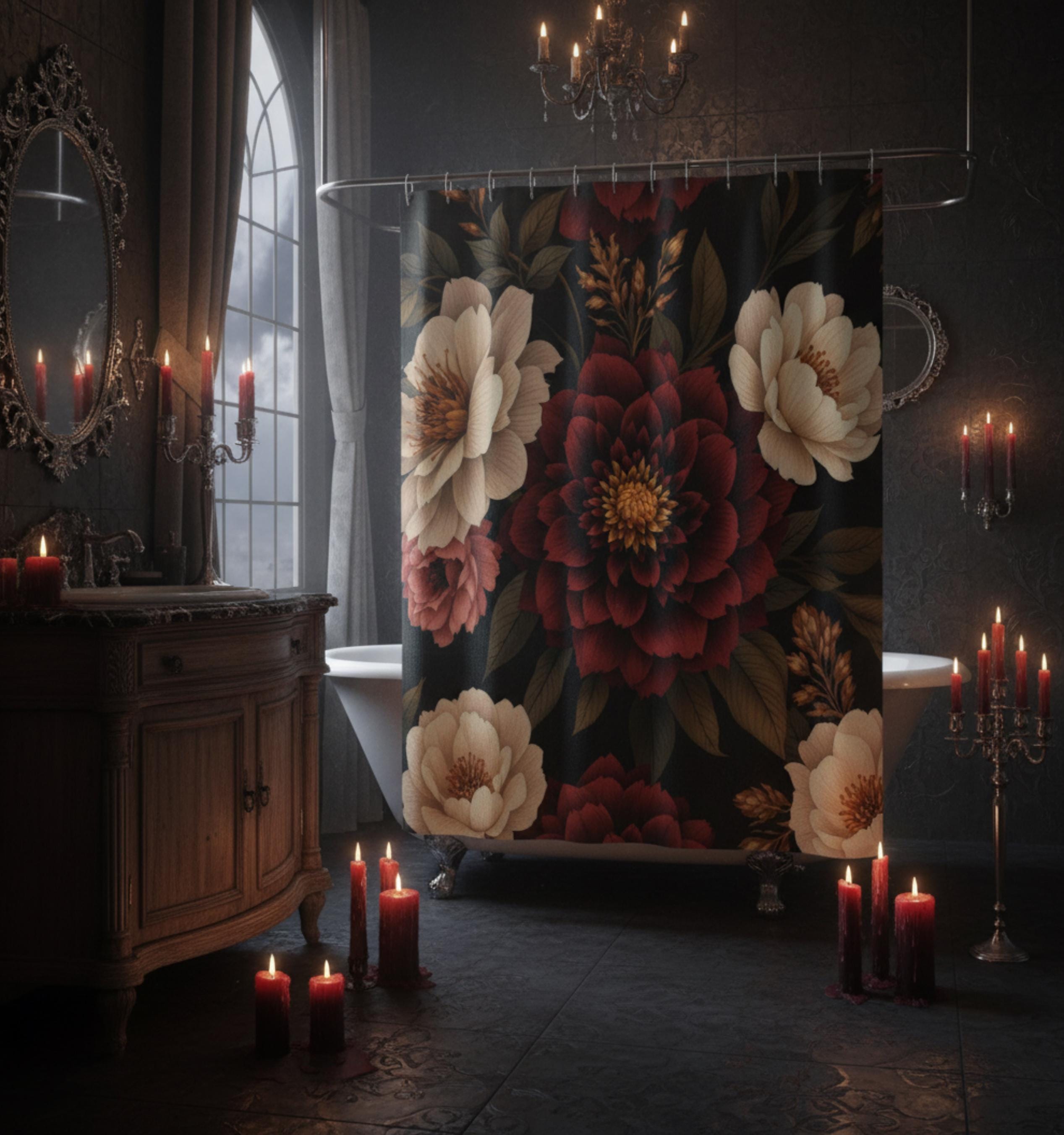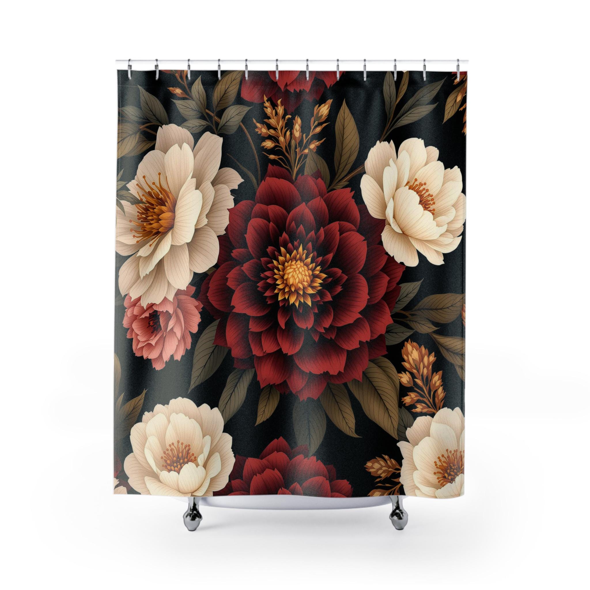 Turn your bathroom into a warm, moody escape with this floral shower curtain. Deep burgundy blooms and creamy peonies float against a rich, inky background, bringing a quiet, vintage sensuality to the space. The heavyweight polyester holds the print with crisp detail and dries fast after each splash. Hang it up and feel the room shift — evenings become slower, mornings feel more intentional. It suits someone who loves layered textures, curated dark palettes, and little moments of calm in their home ritual.