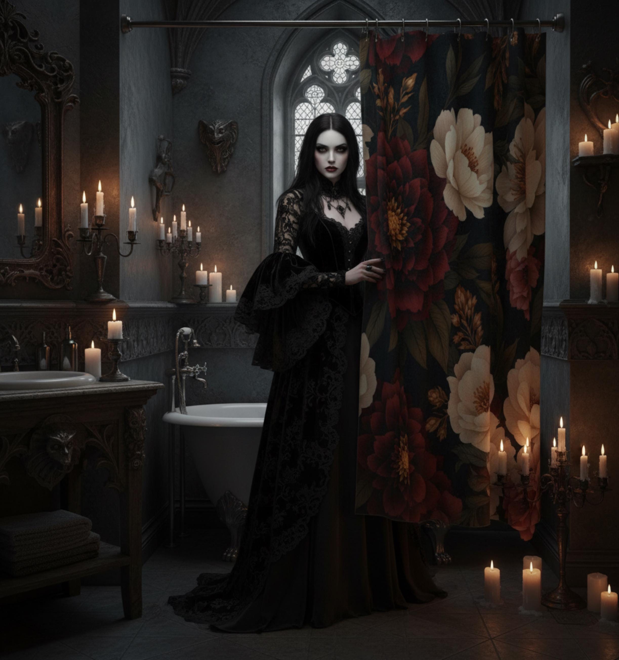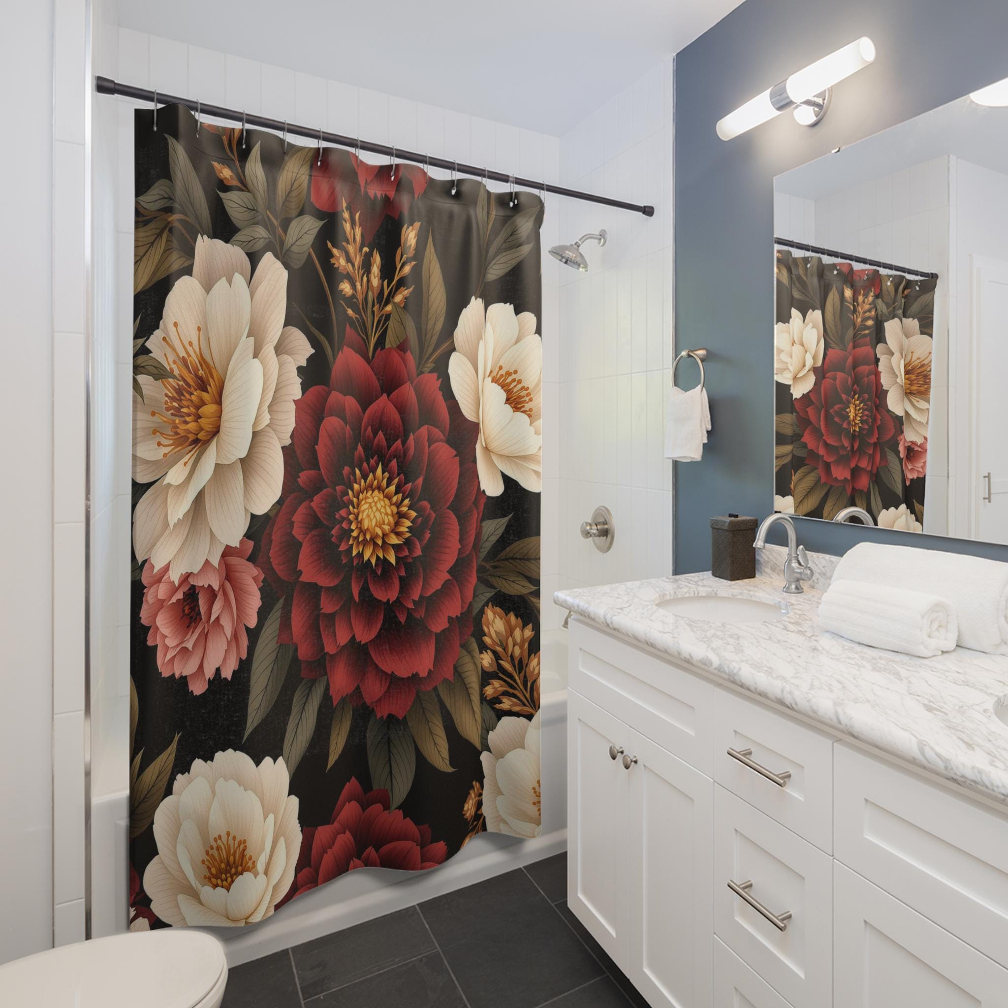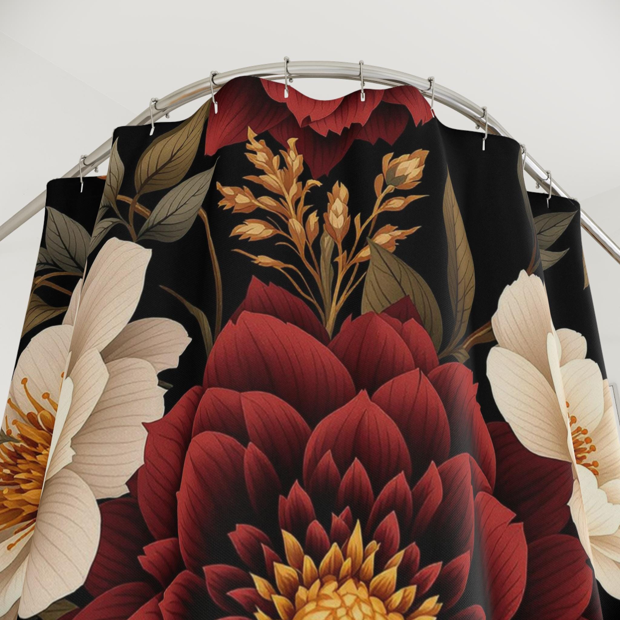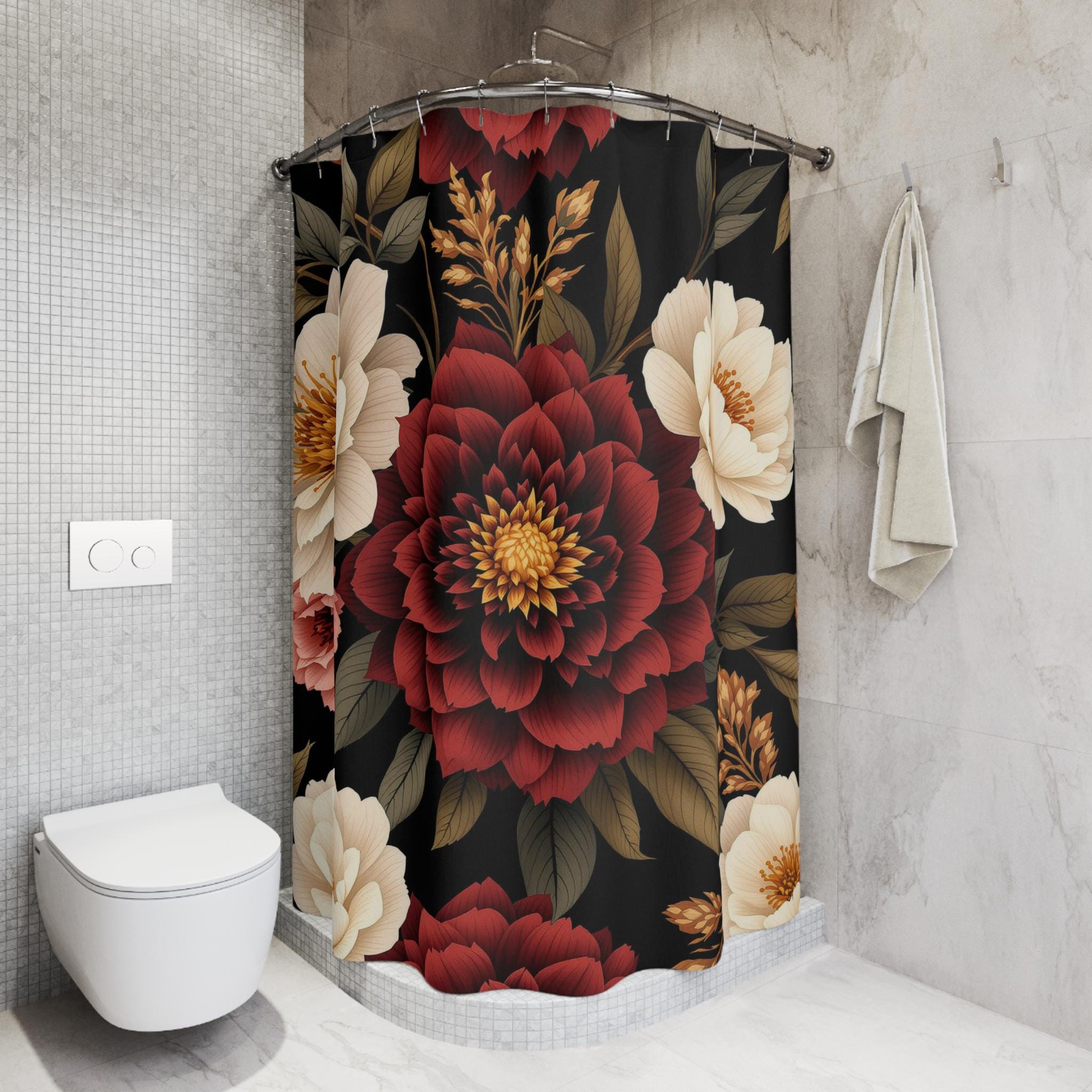 Turn your bathroom into a warm, moody escape with this floral shower curtain. Deep burgundy blooms and creamy peonies float against a rich, inky background, bringing a quiet, vintage sensuality to the space. The heavyweight polyester holds the print with crisp detail and dries fast after each splash. Hang it up and feel the room shift — evenings become slower, mornings feel more intentional. It suits someone who loves layered textures, curated dark palettes, and little moments of calm in their home ritual.