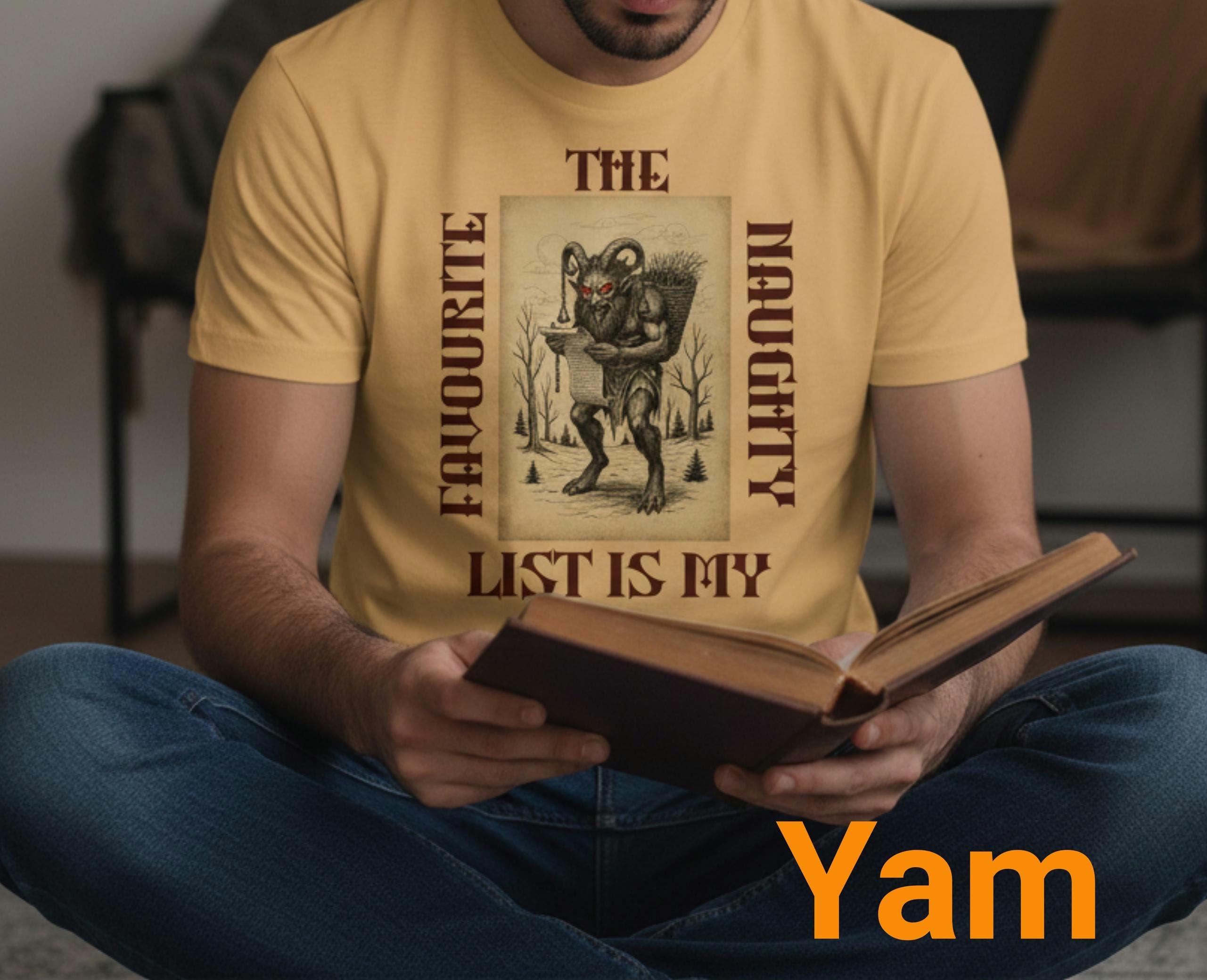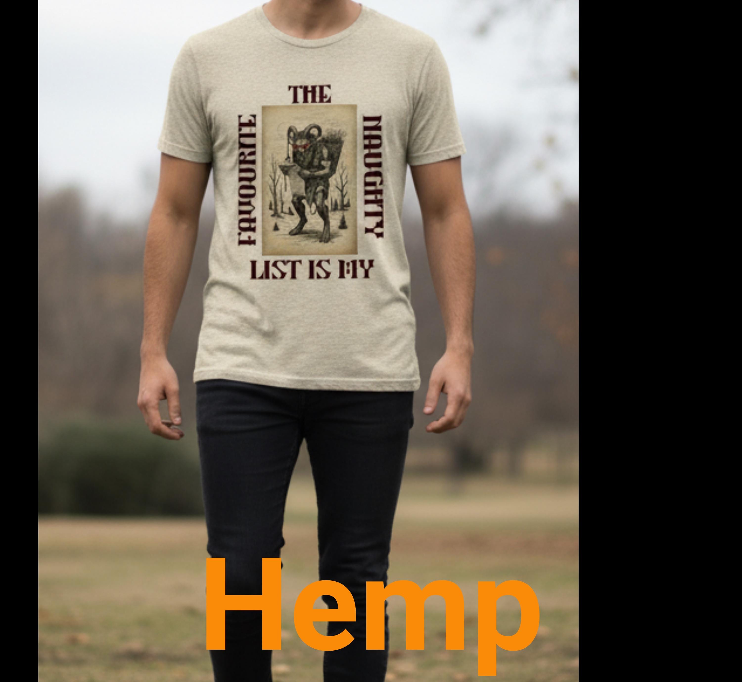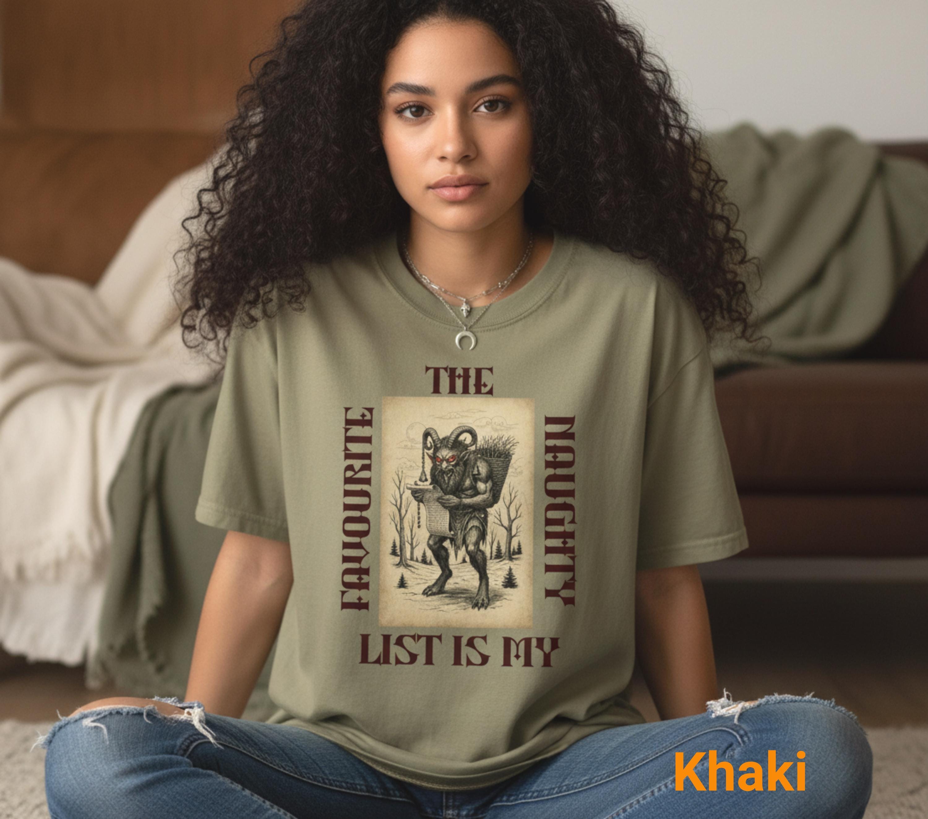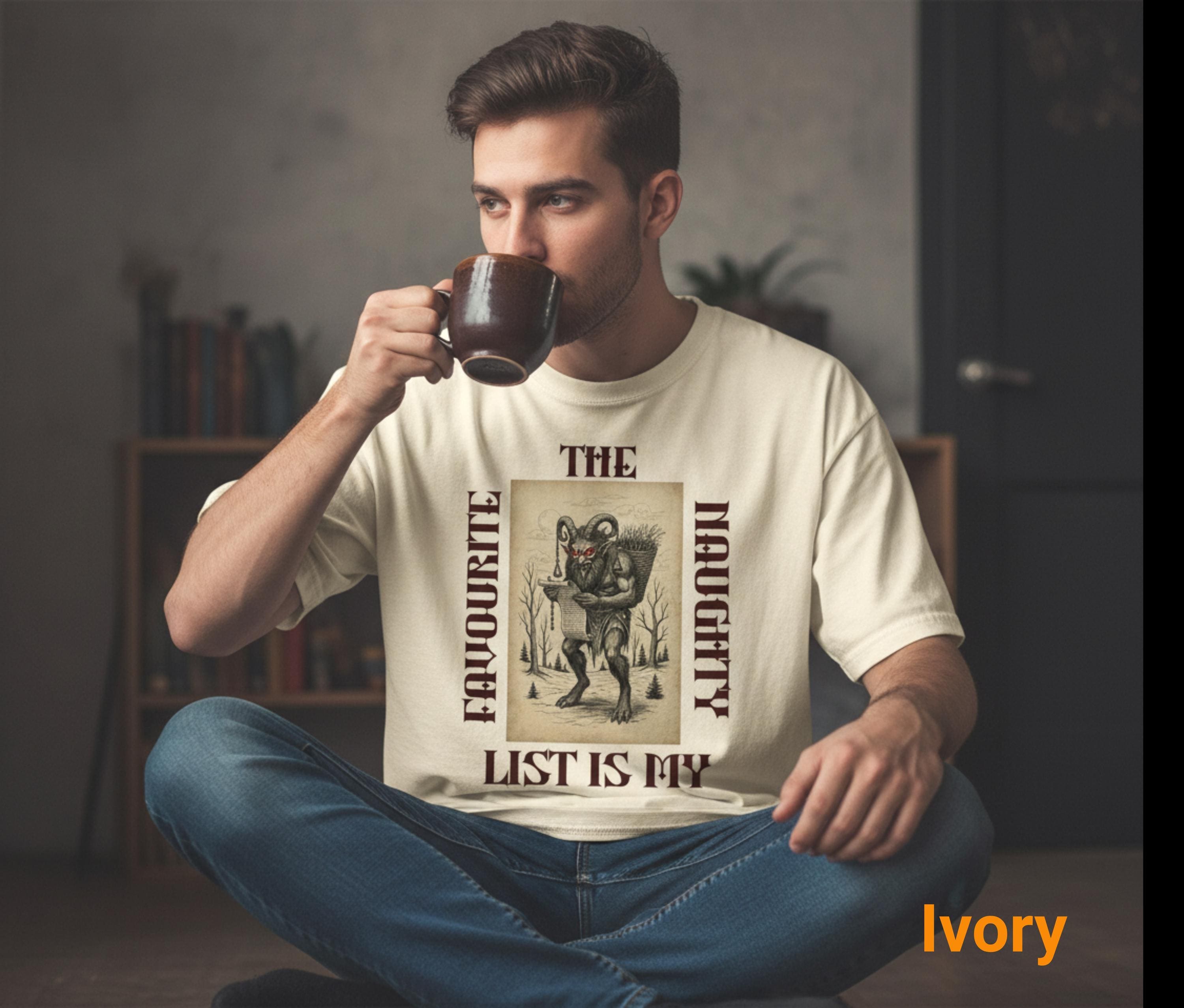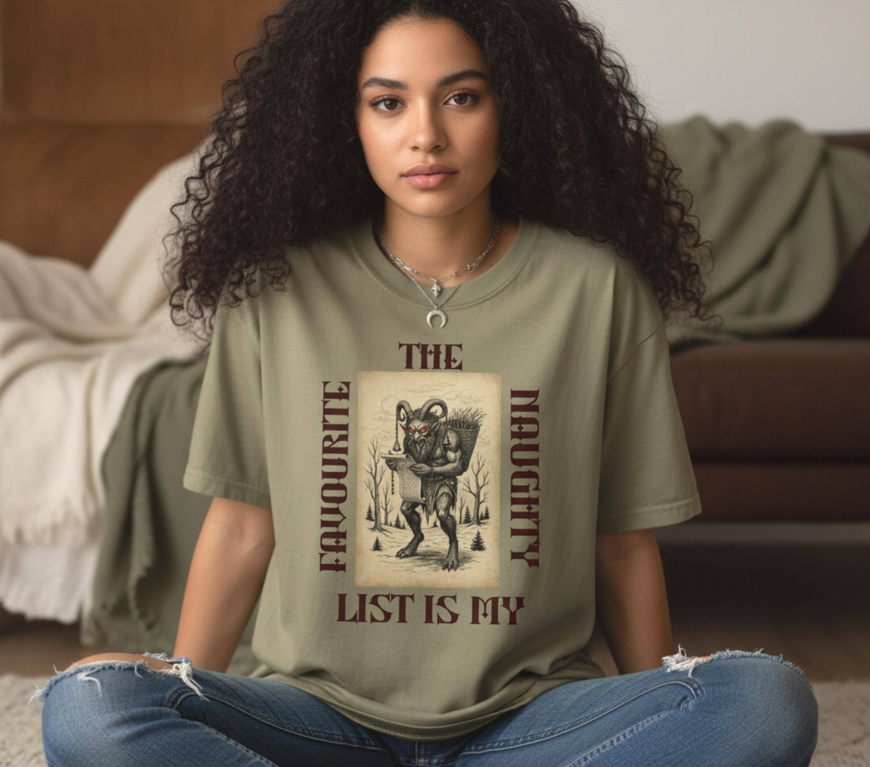 A soft, garment-dyed tee offering a low-key way to wear a darker holiday vibe. The front features a detailed Krampus illustration framed by winter foliage and the words “The Naughty List is My Favourite,” printed in a muted, vintage-black ink that complements the washed, natural tee color. The fabric feels broken-in from day one — a relaxed drape that sits naturally at the shoulders and moves easily during long nights by the fire or wandering winter markets. Wear it layered under a flannel, with a leather jacket, or on its own when you want seasonal style with a little edge.