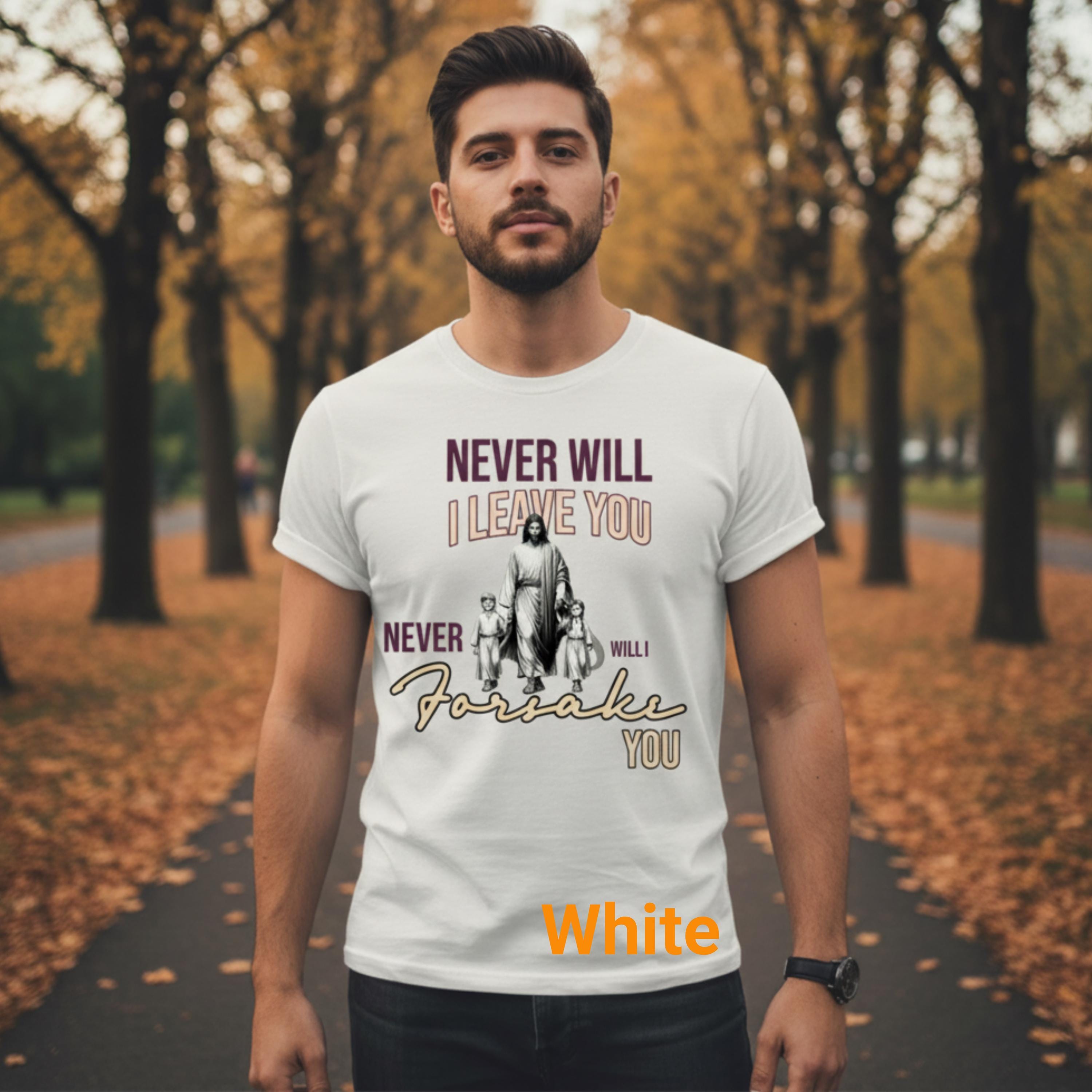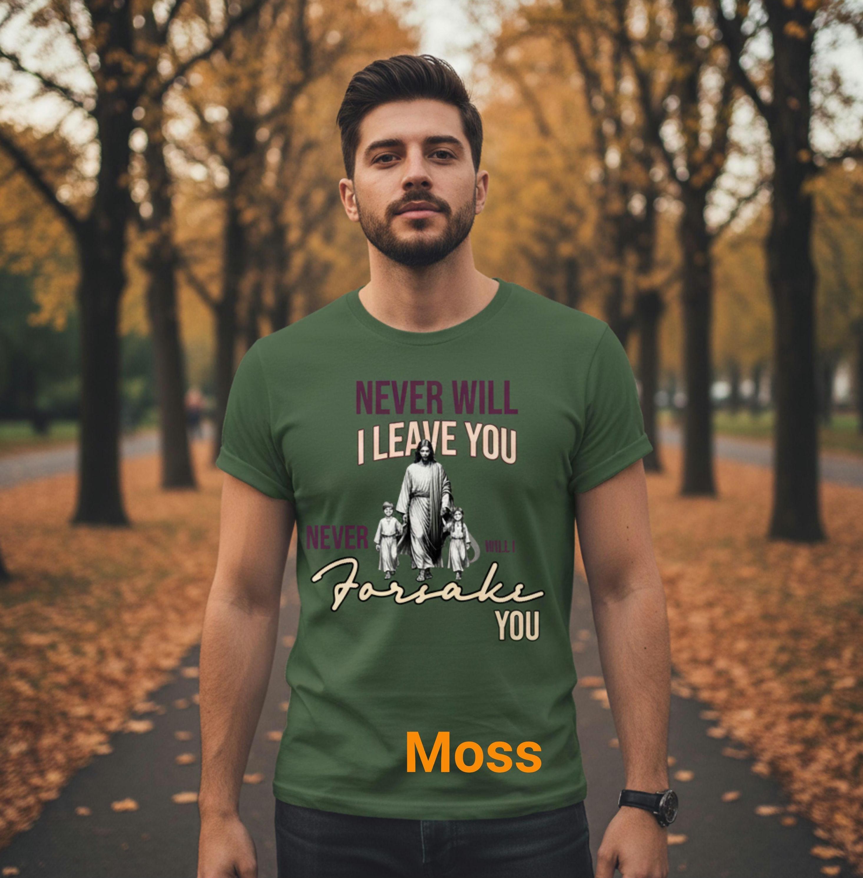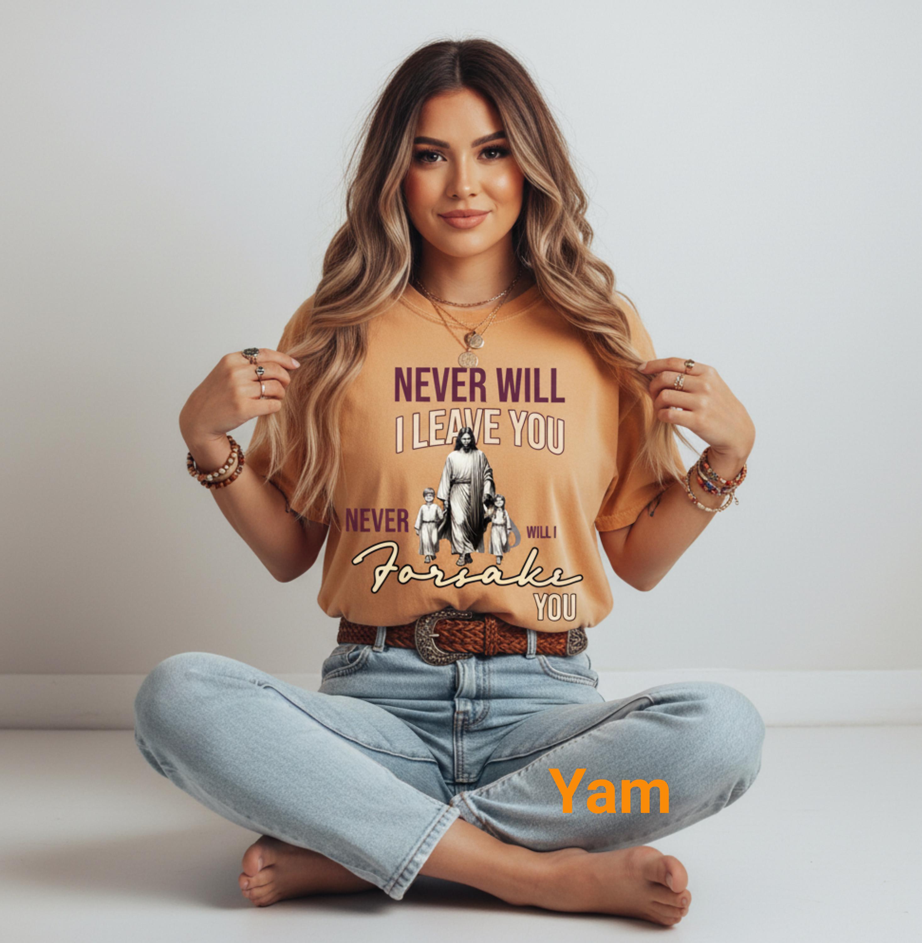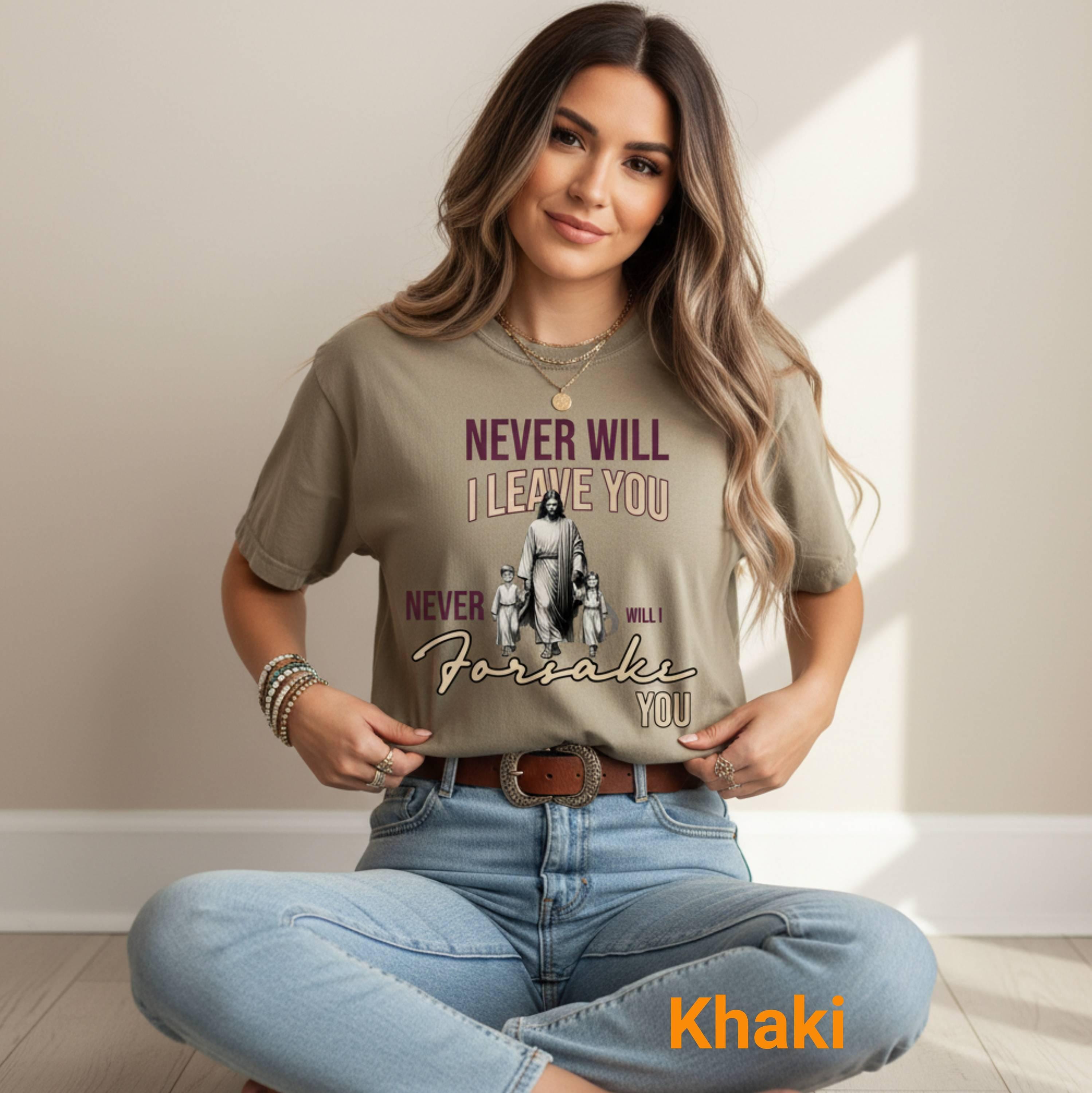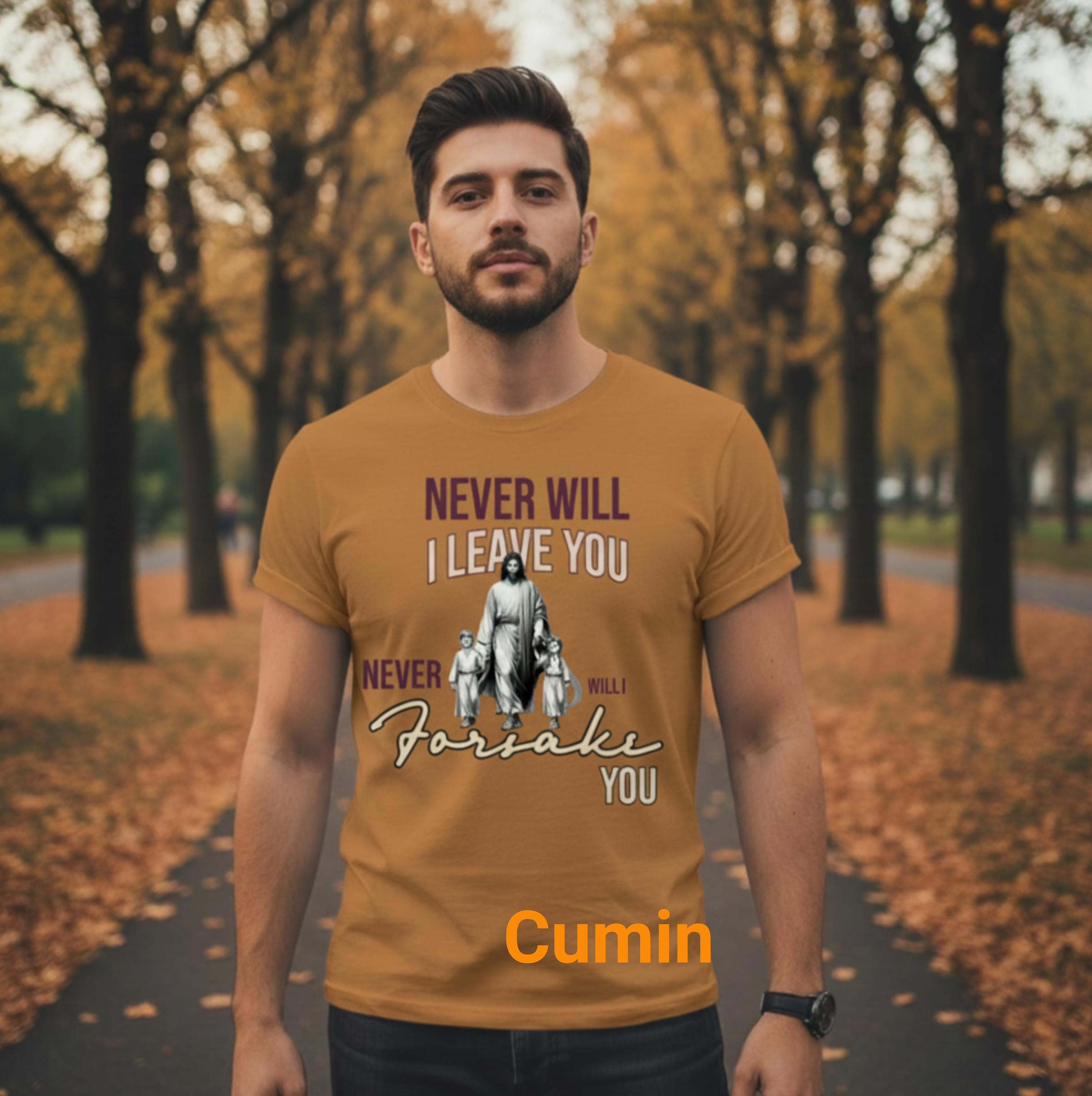 A soft, garment-dyed tee that speaks gently and honestly. This relaxed-fit shirt carries a quiet, vintage-inspired design: a monochrome figure paired with layered type that reads like a promise — “Never will I leave you, never will I forsake you.” The medium-weight 100% ring-spun cotton drapes softly after the dyeing process, giving each shirt a lived-in hand and subtle color depth. Wear it alone or layered under a jacket; it settles into everyday life and becomes a discreet reminder of steady presence and quiet faith.