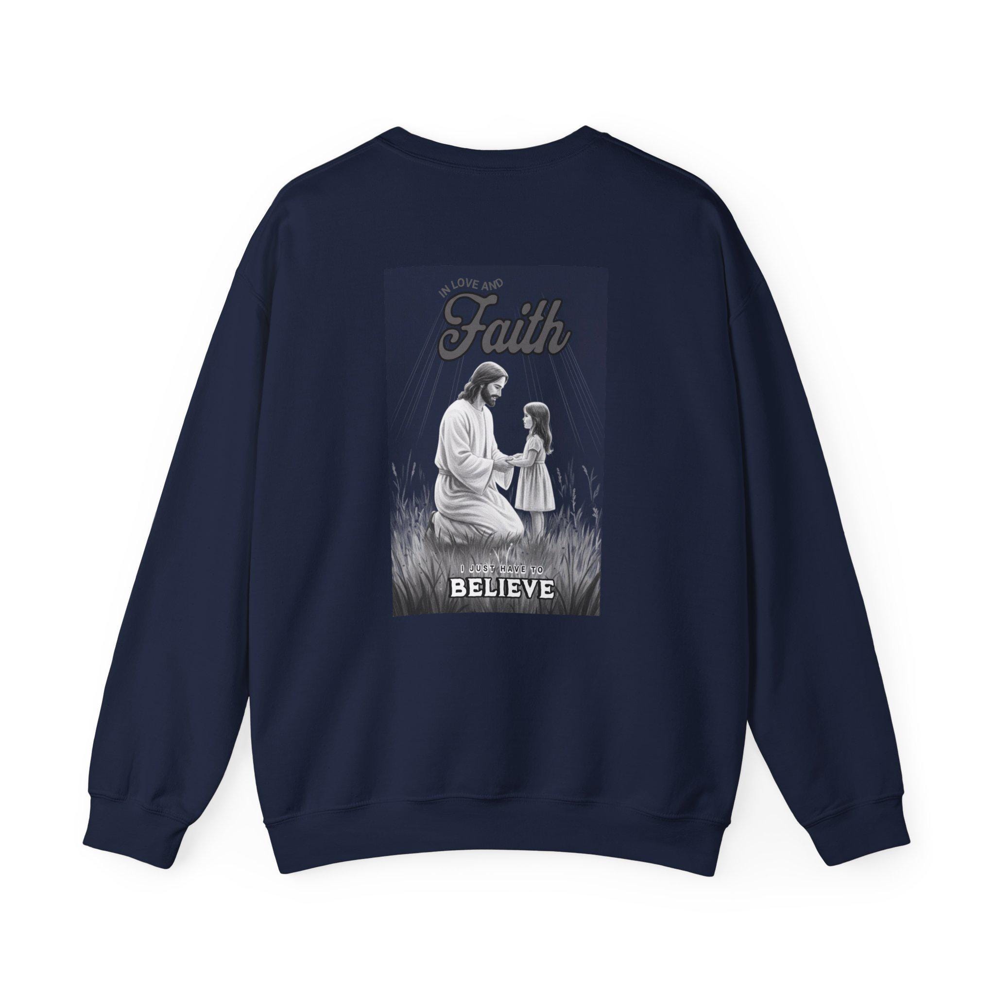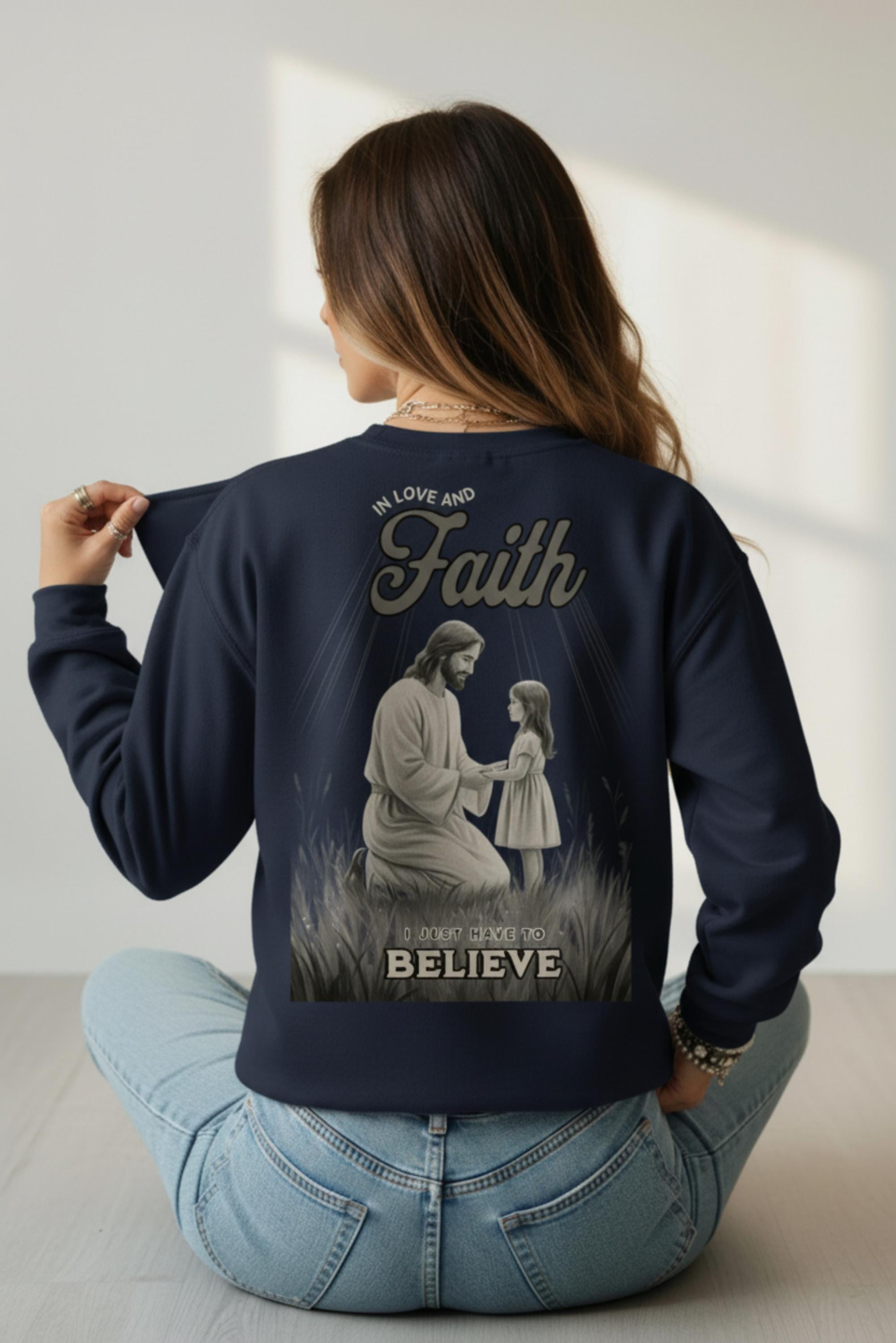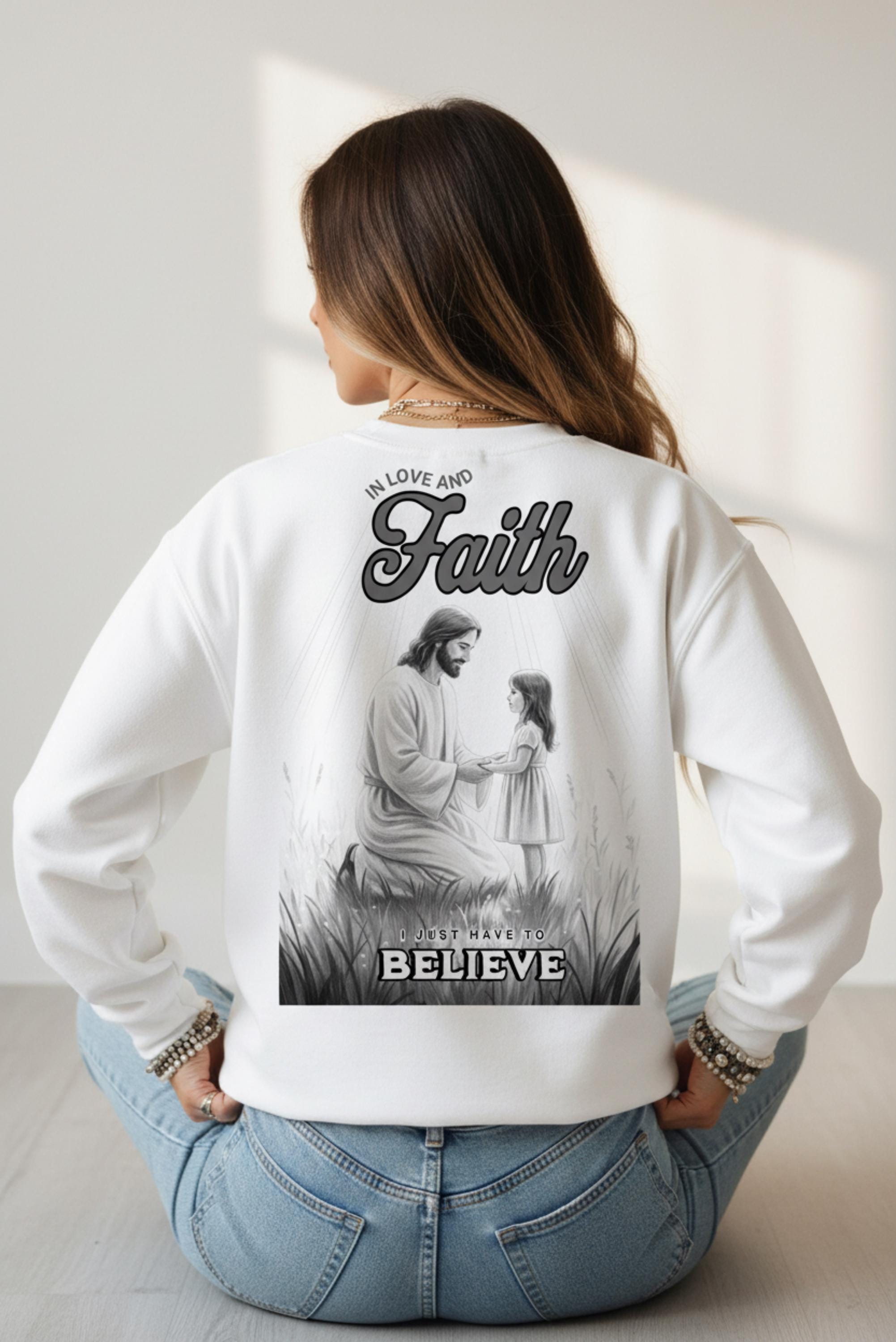 Soft, roomy, and quietly expressive — this crewneck carries a gentle message of faith in a subtle, wearable way. Lightweight yet substantial, the sweatshirt’s classic cut and soft cotton-poly blend make it an easy go-to for mornings at church, volunteer days, or slow walks while reflecting. A small embroidered emblem on the front chest keeps the look understated, while the printed scene on the back tells the story: a calm, comforting moment between a child and Jesus, topped with the word “In Love and Faith I Just Have to Believe.” It slips into everyday life without shouting, offering warmth and a thoughtful reminder to pause, breathe, and believe.