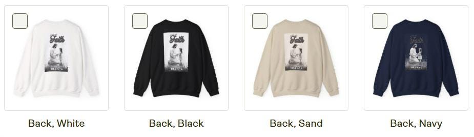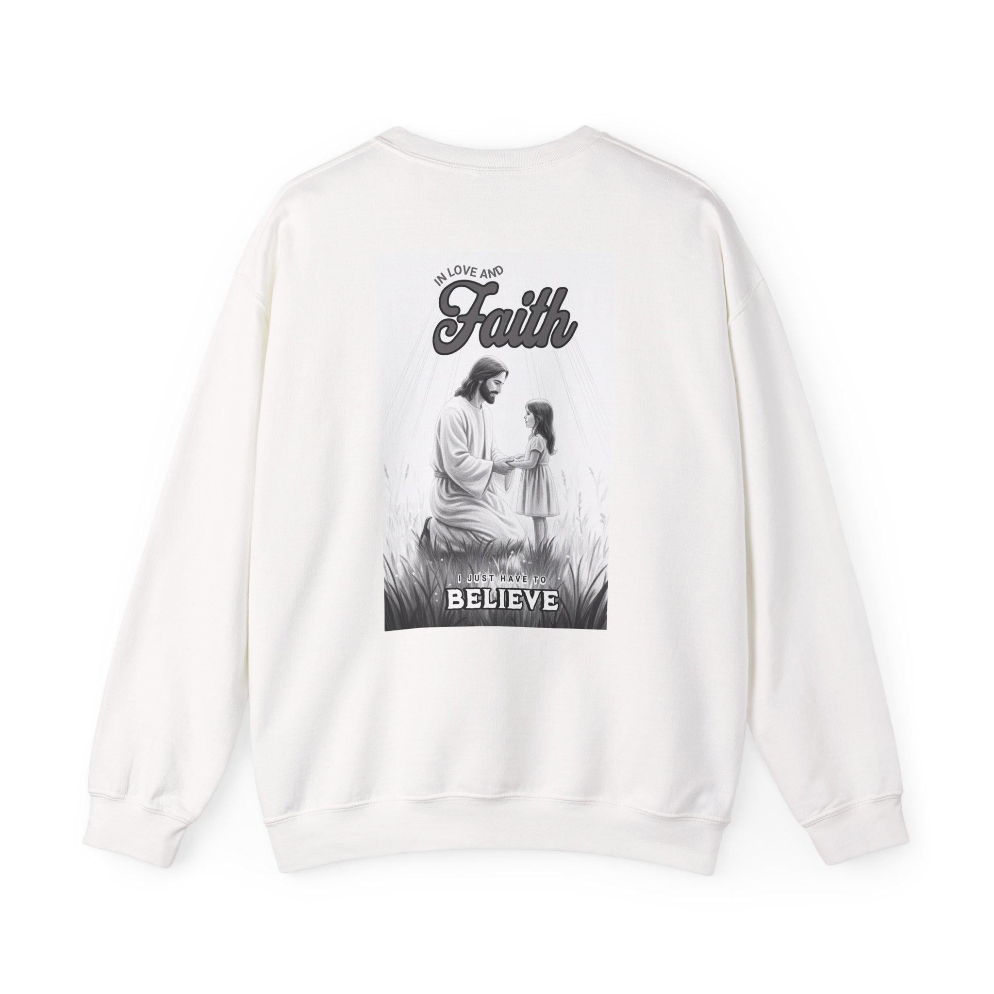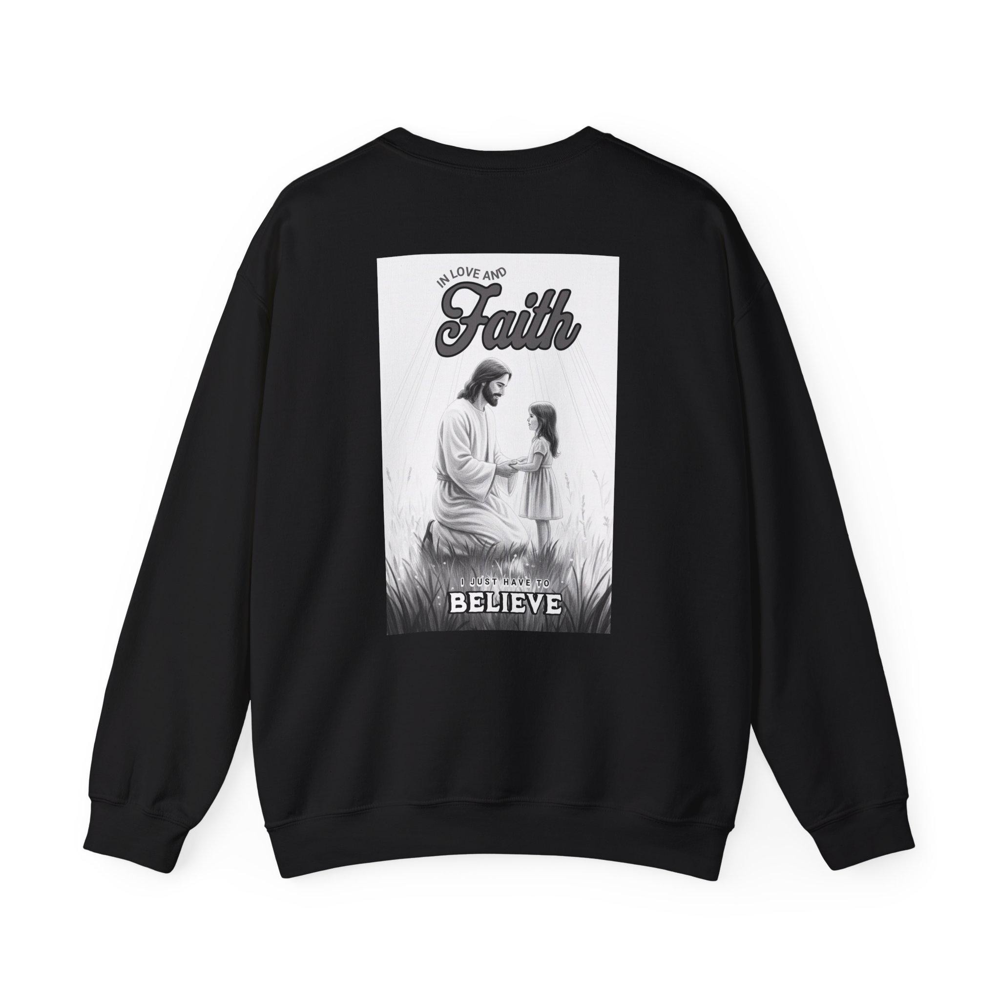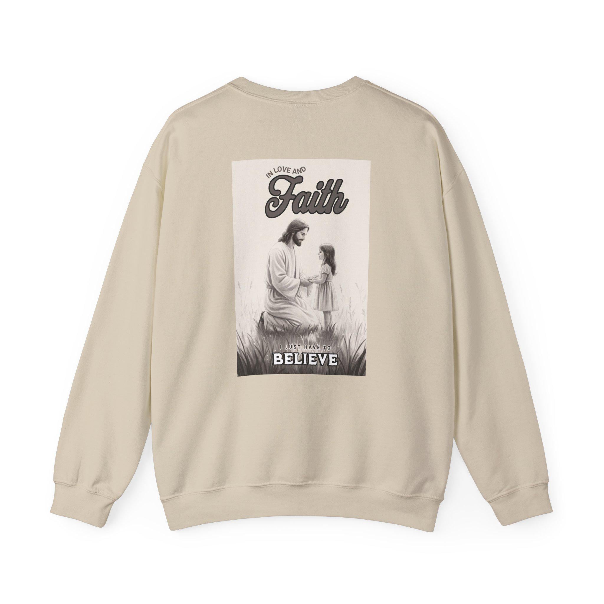 Soft, roomy, and quietly expressive — this crewneck carries a gentle message of faith in a subtle, wearable way. Lightweight yet substantial, the sweatshirt’s classic cut and soft cotton-poly blend make it an easy go-to for mornings at church, volunteer days, or slow walks while reflecting. A small embroidered emblem on the front chest keeps the look understated, while the printed scene on the back tells the story: a calm, comforting moment between a child and Jesus, topped with the word “In Love and Faith I Just Have to Believe.” It slips into everyday life without shouting, offering warmth and a thoughtful reminder to pause, breathe, and believe.