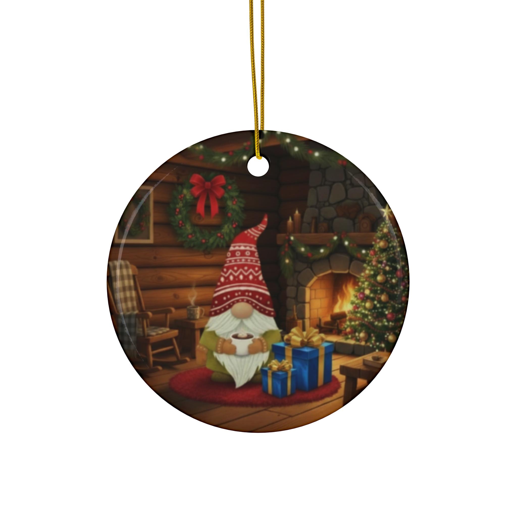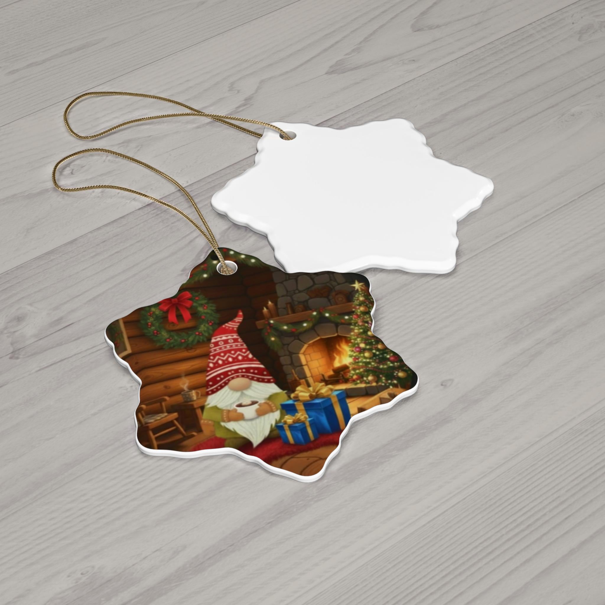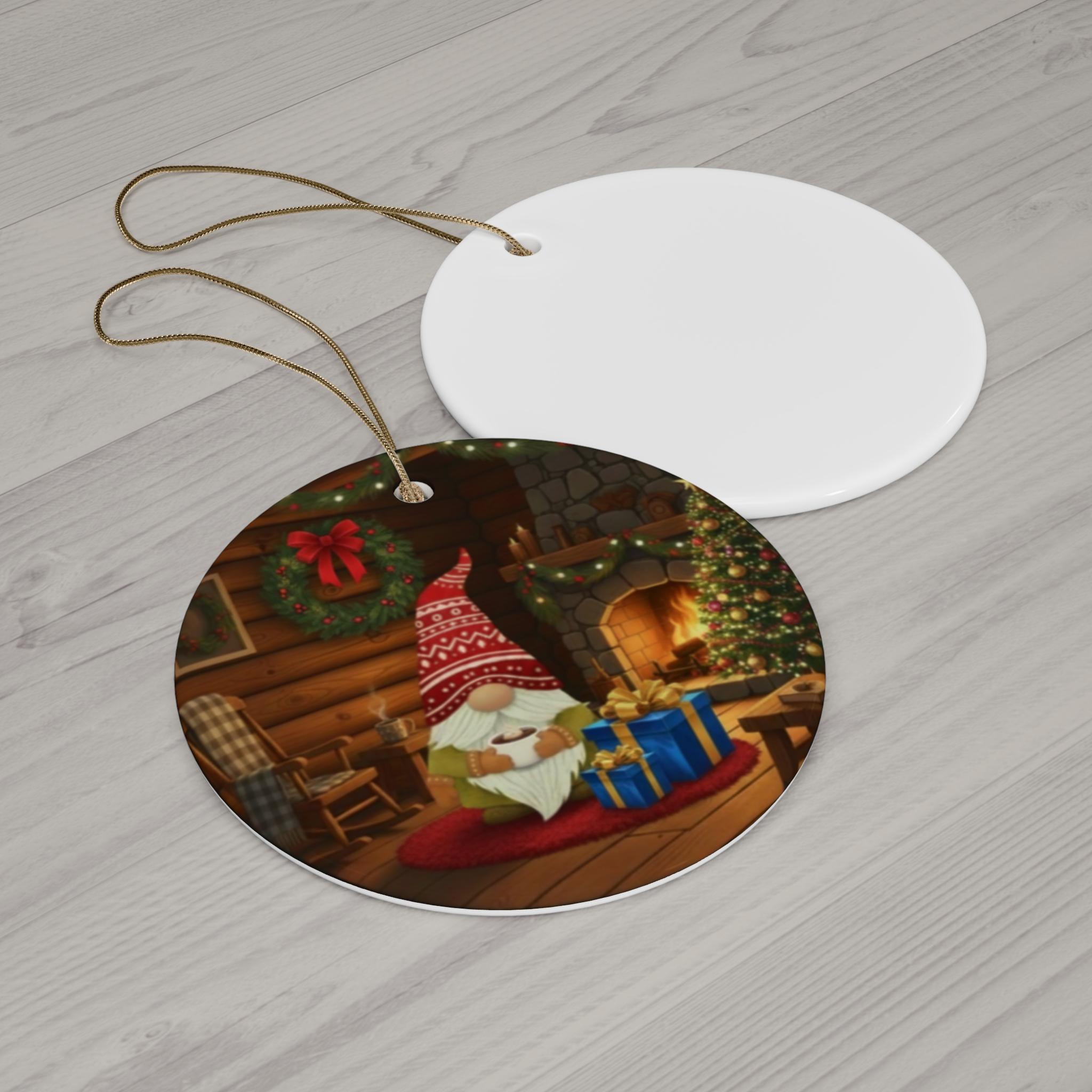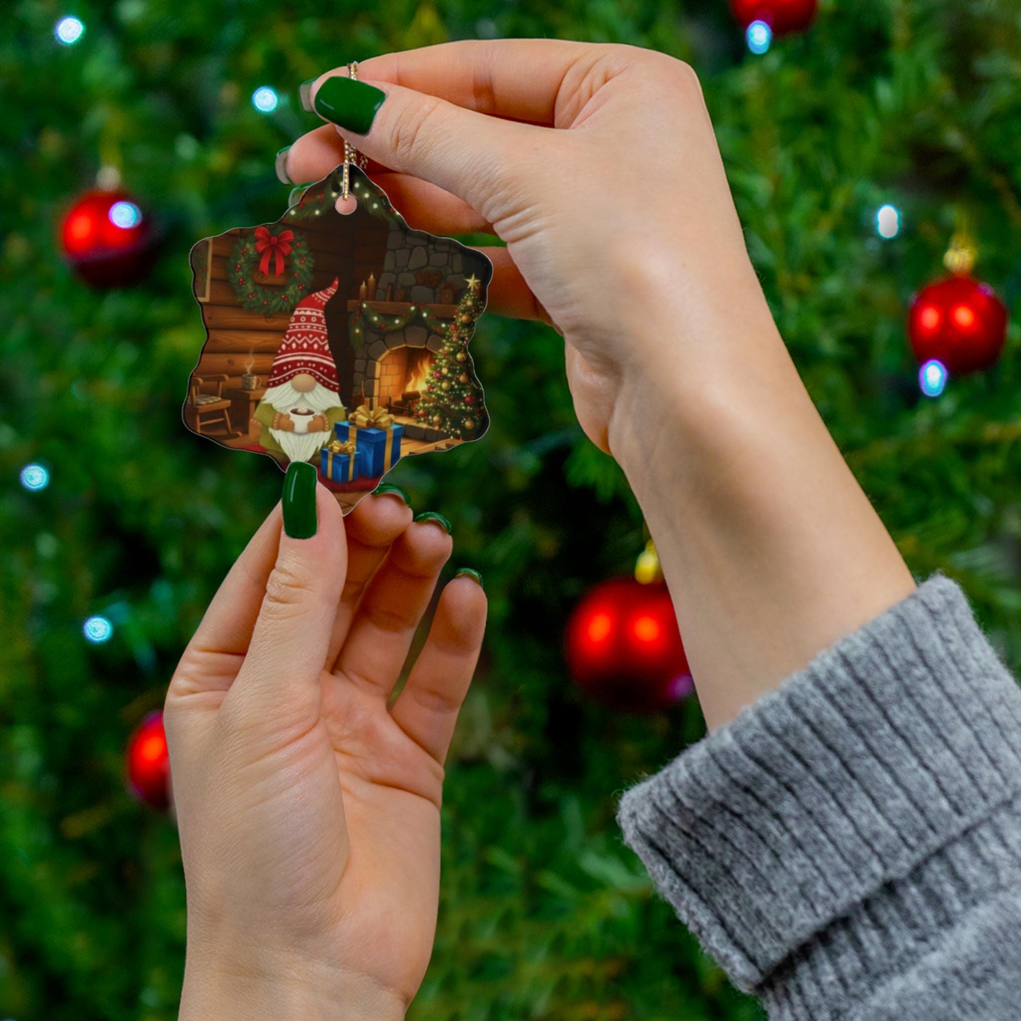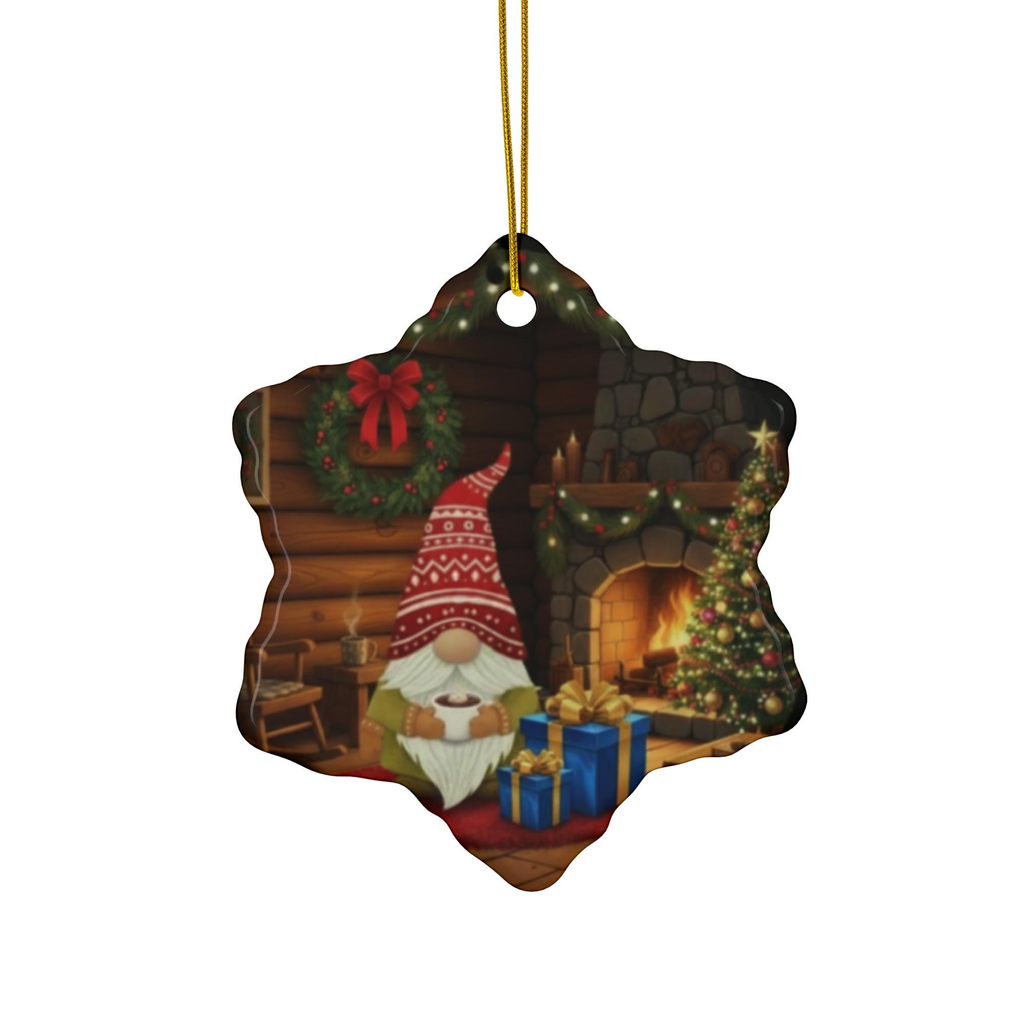 A glossy ceramic ornament that brings a quiet, enchanted winter scene into your home. The single-sided print shows a cute gnome standing on a snowy hill beneath a starlit sky, rendered in rich blacks, golds, and soft neutrals. The ornament’s smooth, high-gloss surface makes the colors pop, while the slim ceramic body keeps it lightweight on branches. A small, pre-drilled hole and included gold-toned string make hanging simple — from an evergreen, a wall hook, or a seasonal display. Each piece is sold individually and designed to hold its vibrant detail year after year without glued seams or layered parts to fail. This ornament fits someone who loves woodland motifs, hand-drawn folk art styling, and a touch of subtle sparkle on colder evenings.