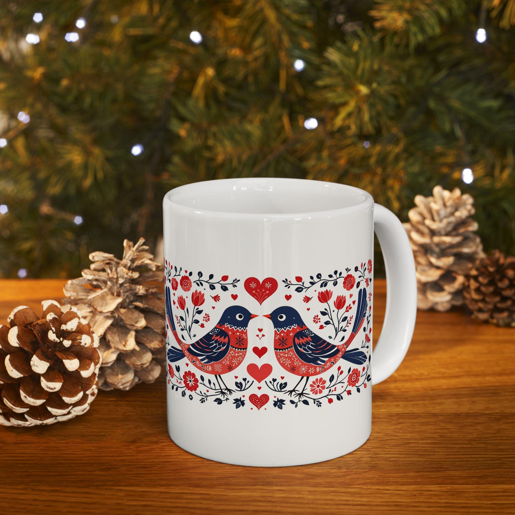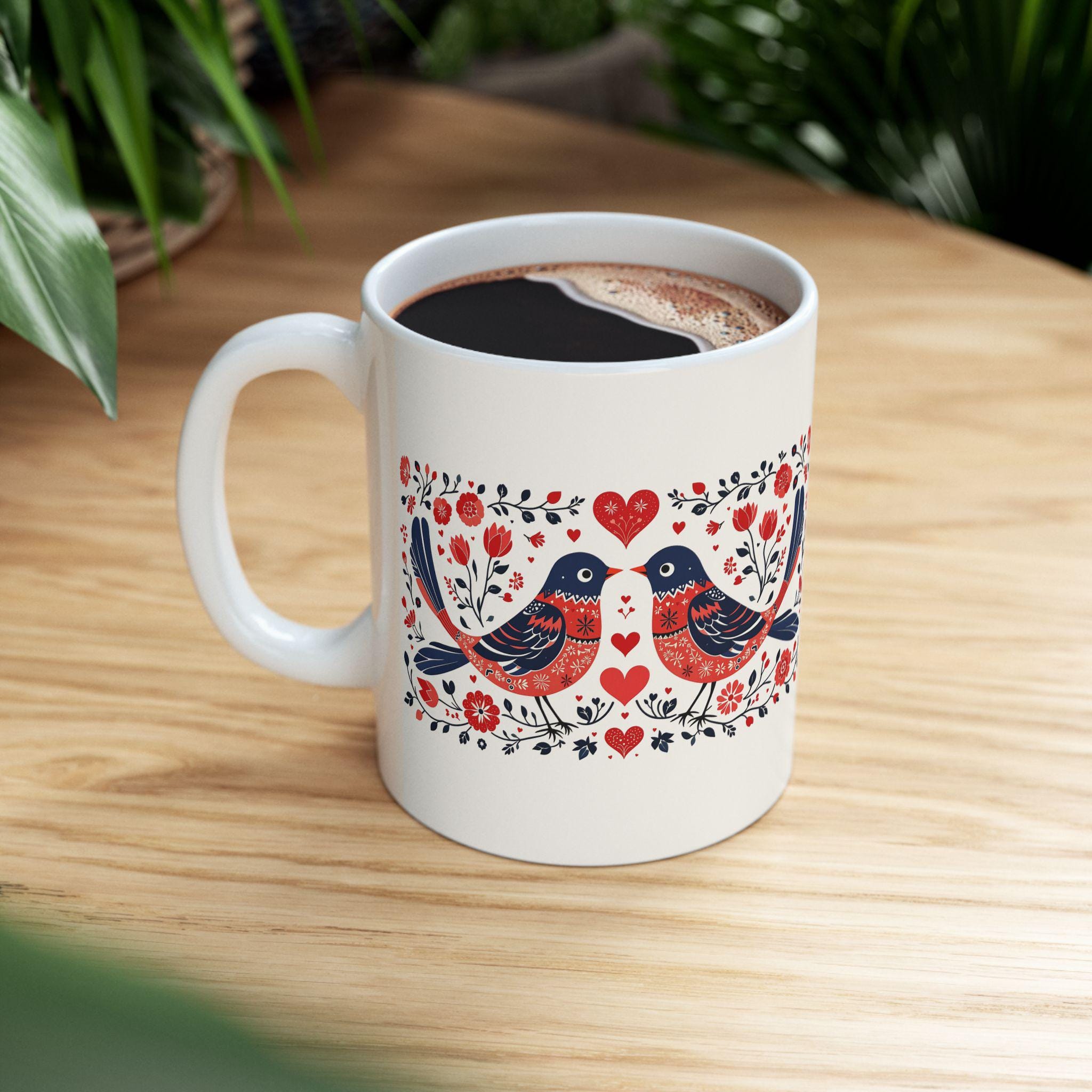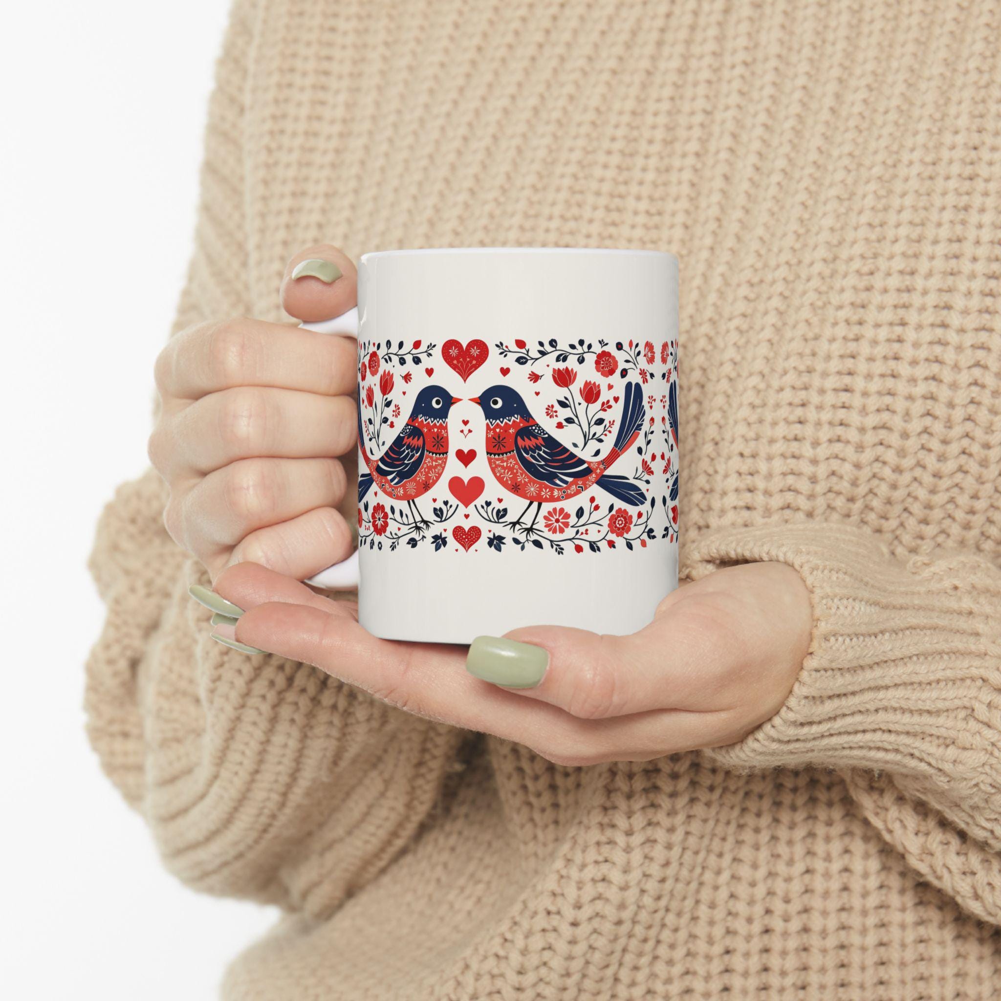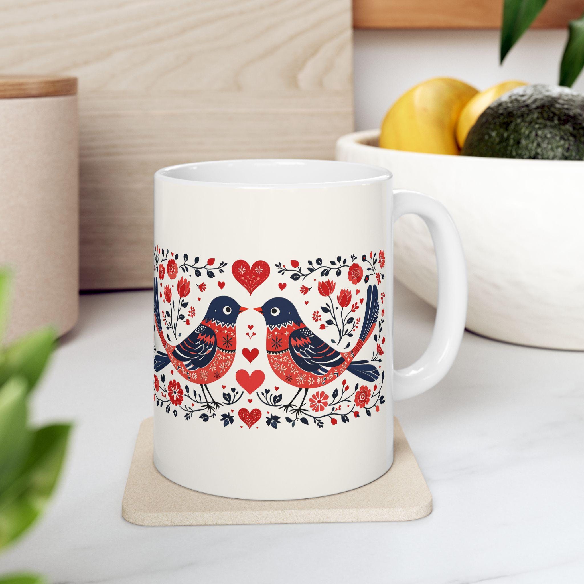Nordic Folk Art Mug Hygge Gifts Scandinavian Christmas Mug Folk Art Lovebirds Norwegian Folk Art