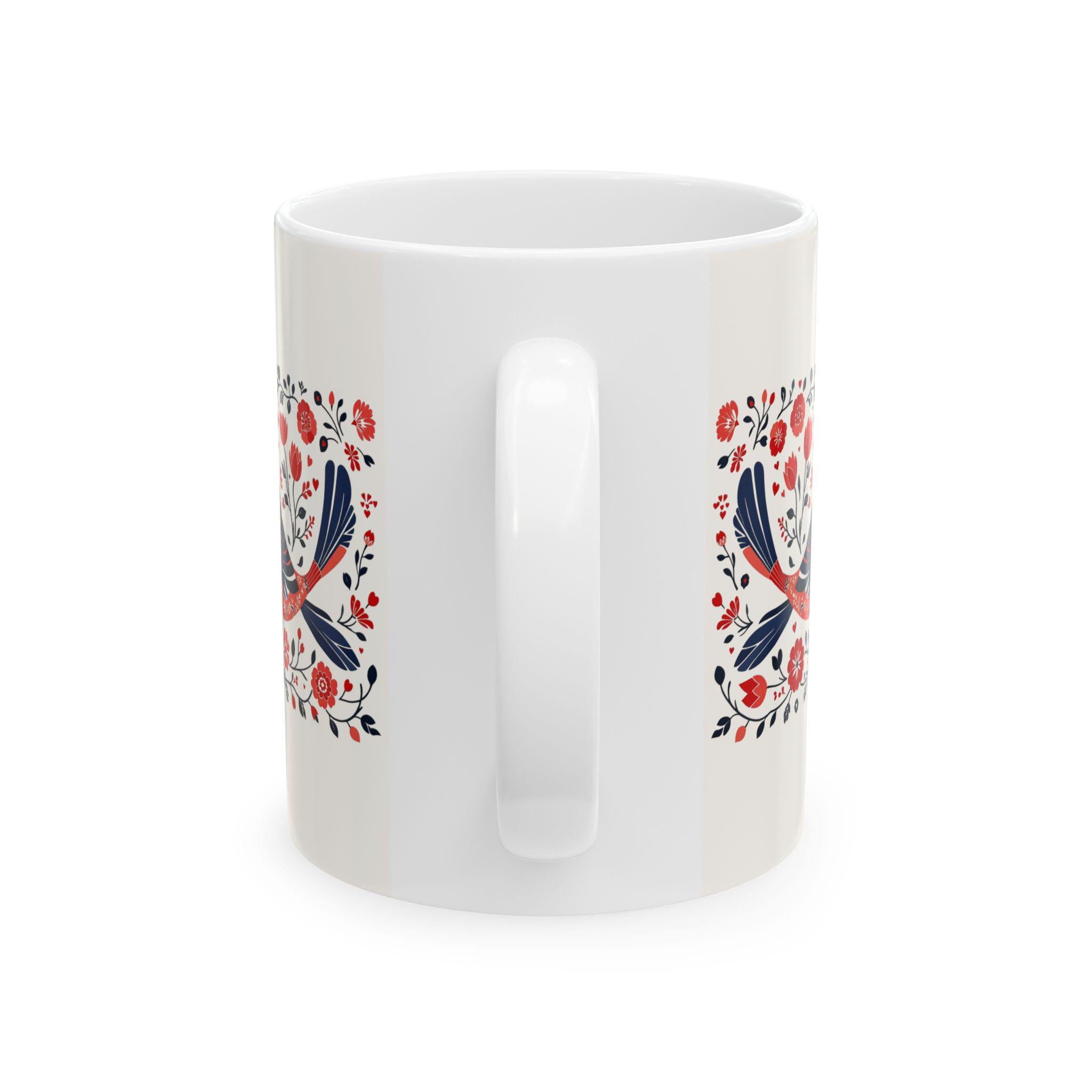 A band of folk-inspired birds and hand-drawn florals wraps around the mug in deep navy and coral tones, bringing an artisanal, homespun charm to your coffee or tea ritual.