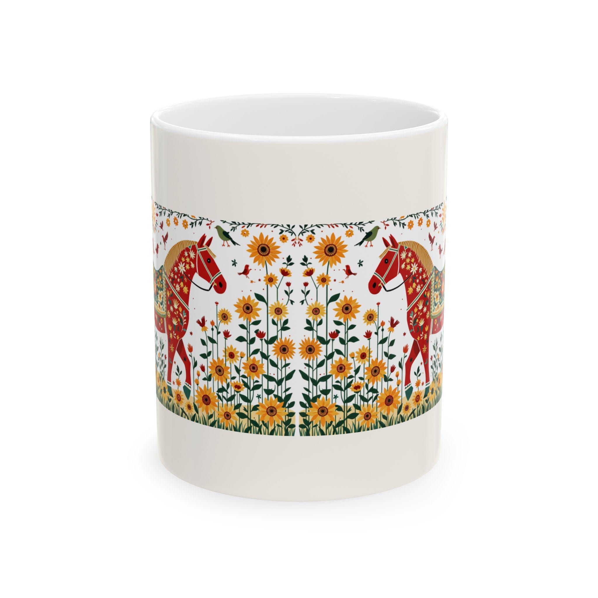 A bold Red Dala horse in folk art floral saddle, standing in symmetrical wheat field with sunflowers, bringing an artisanal, homespun charm to your coffee or tea ritual.