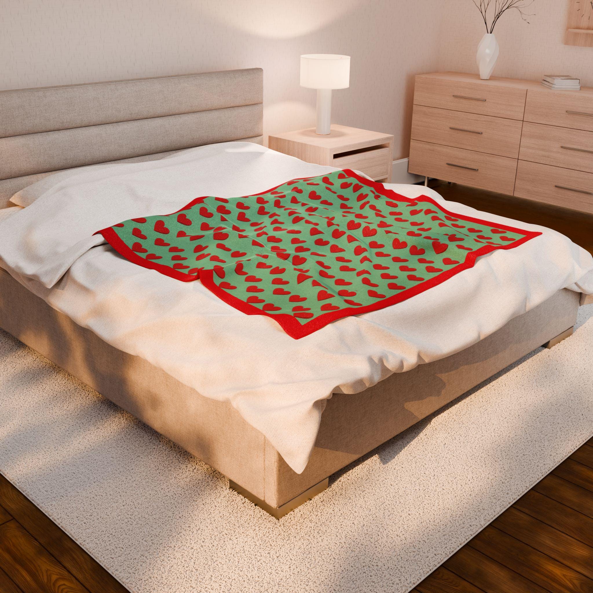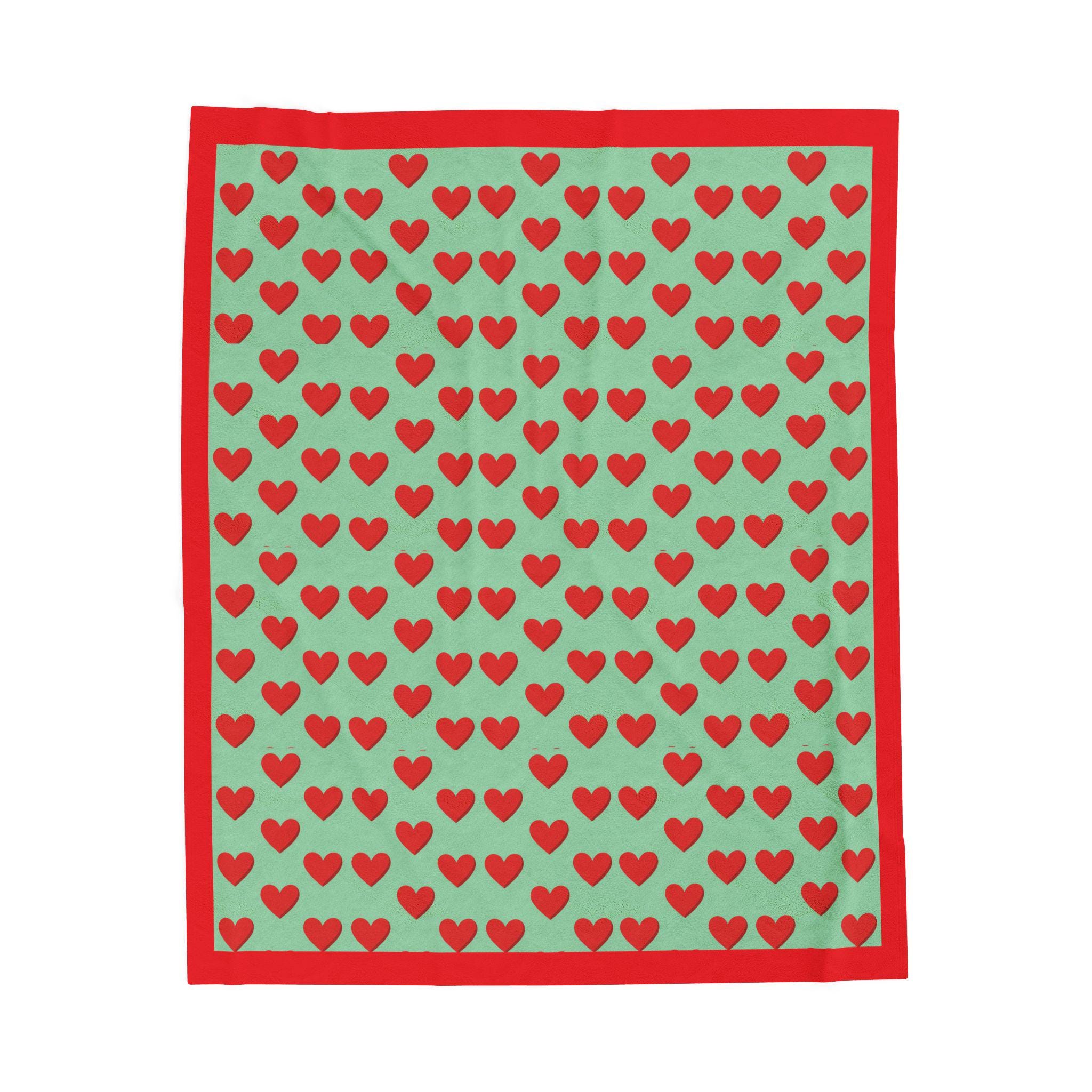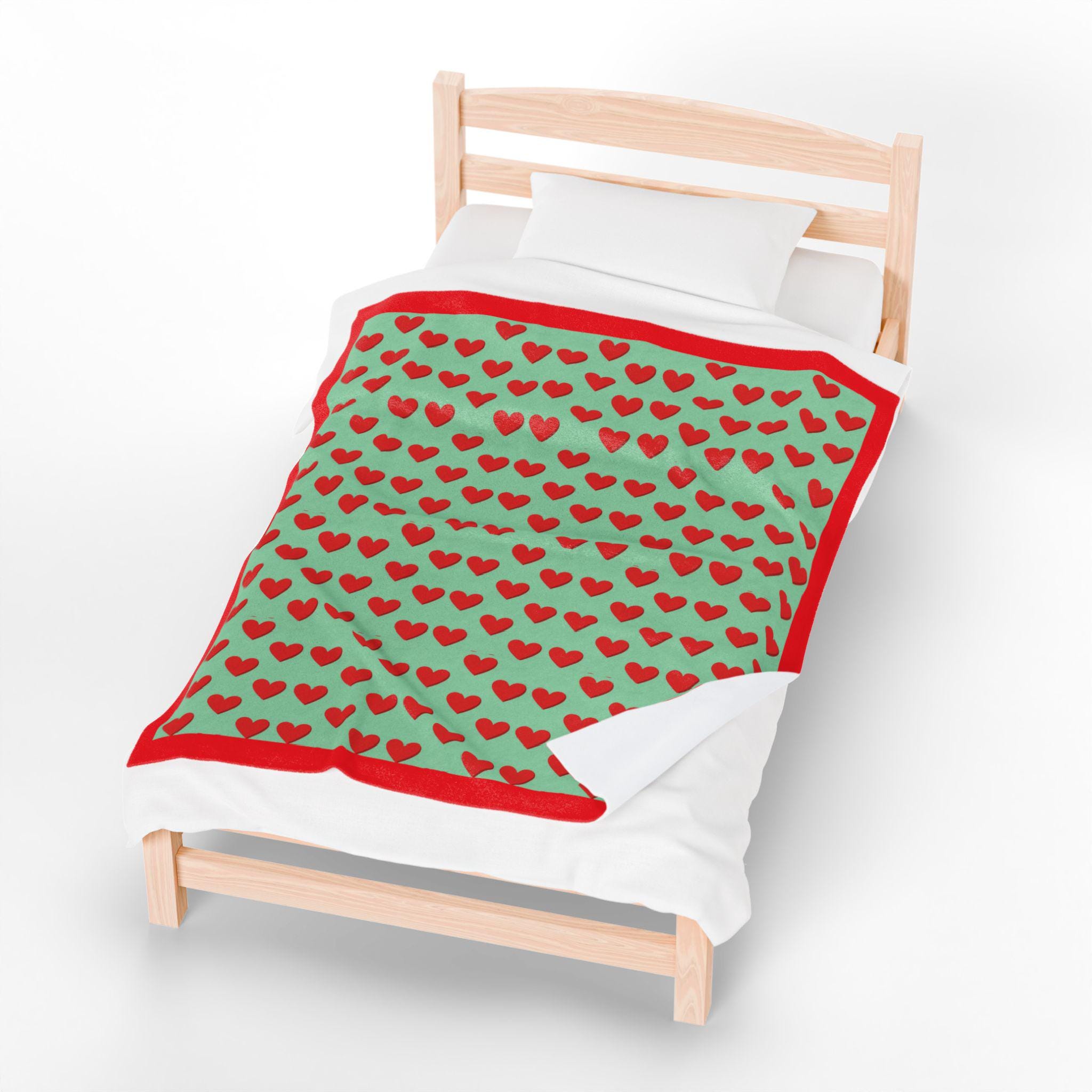 The red heart motif on a mint background, framed by a solid red border, creates a playful yet low-key look that suits bedside reading, movie nights, and slow winter mornings.