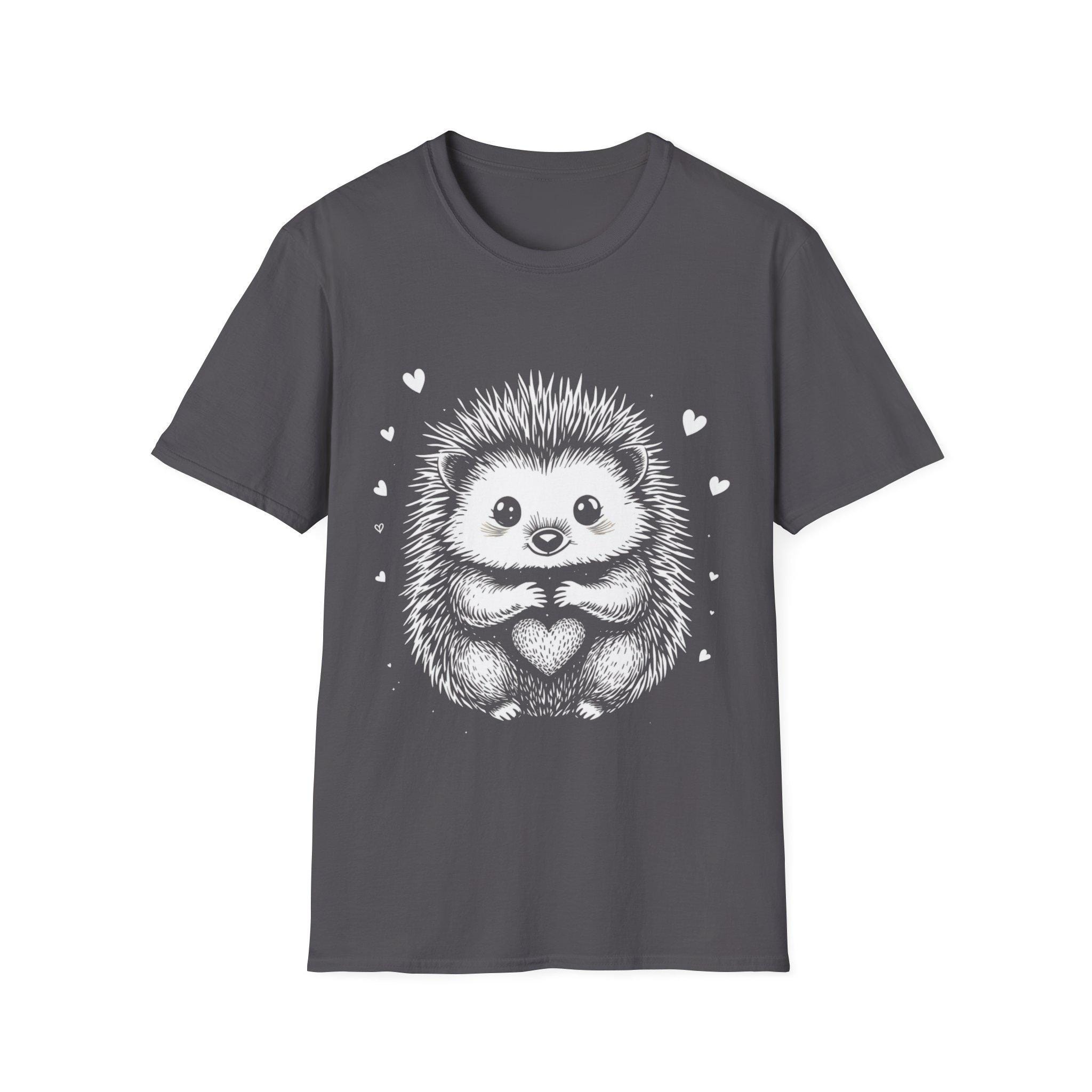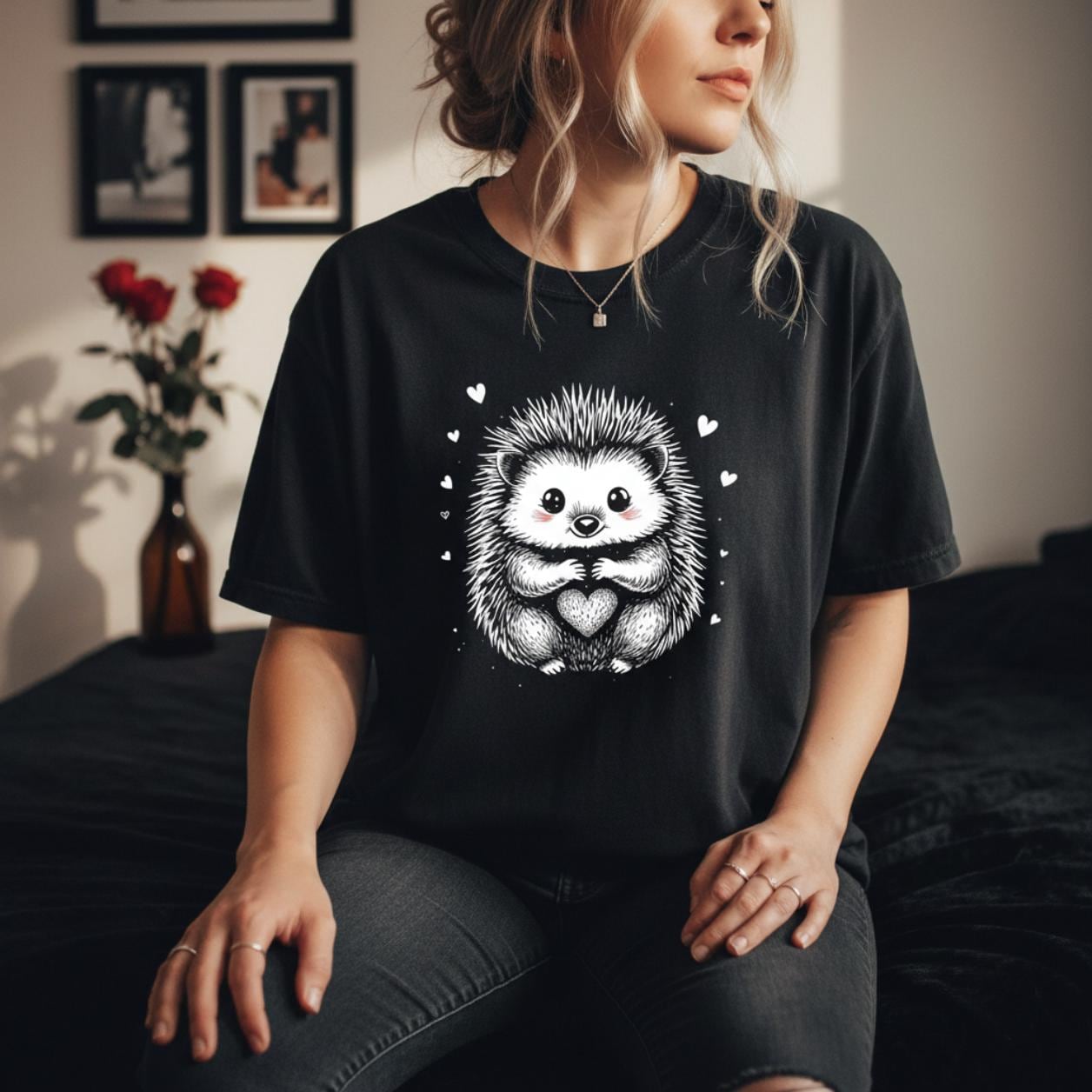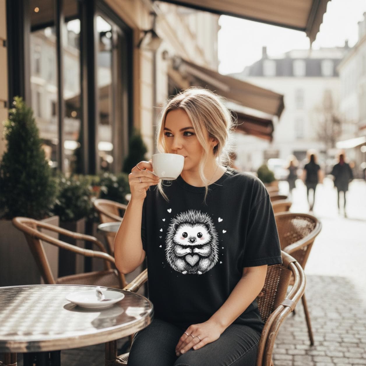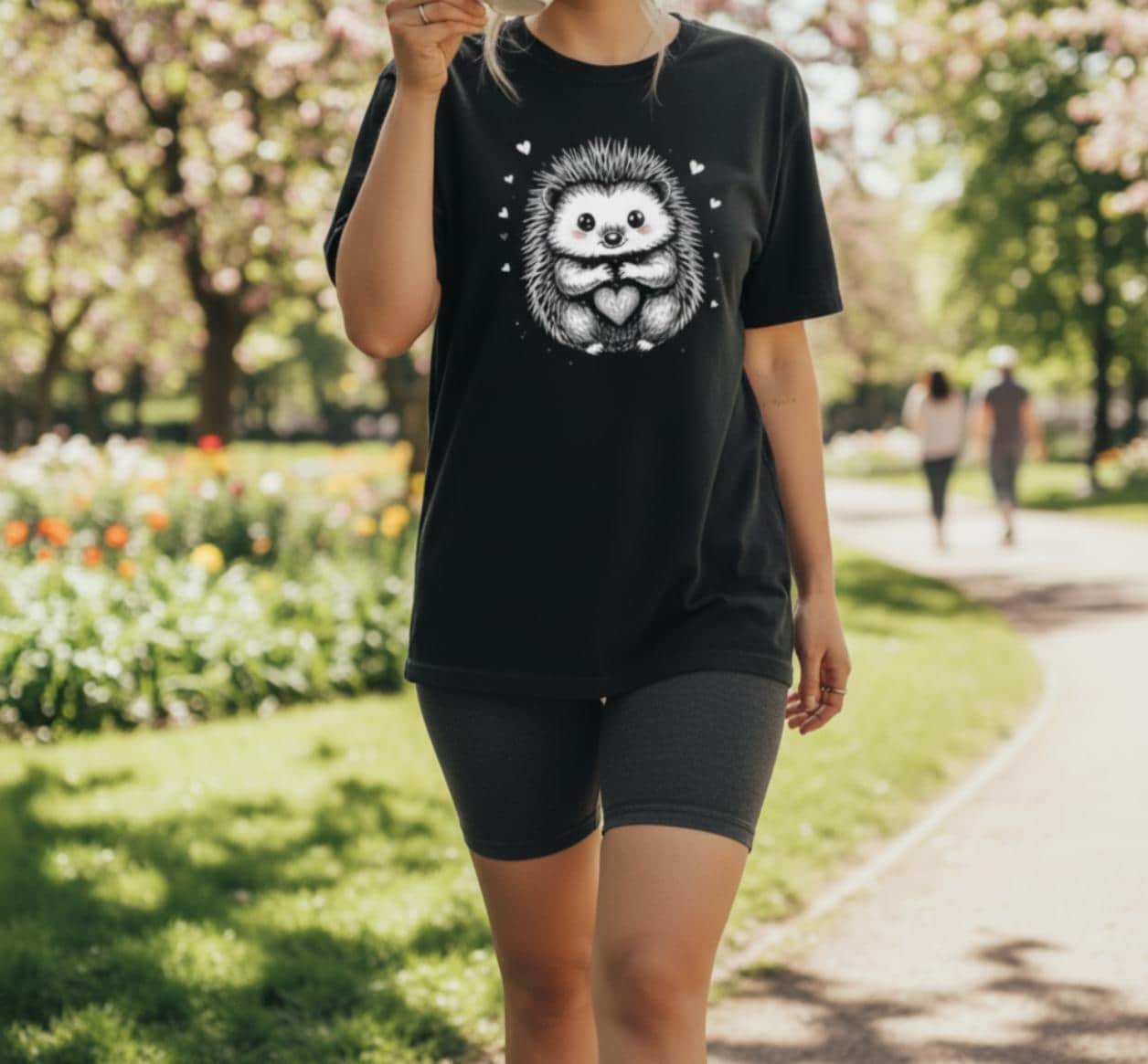 Soft, simple, and quietly sweet — this lightweight tee carries a hand-drawn hedgehog clutching a heart, surrounded by tiny floating hearts.