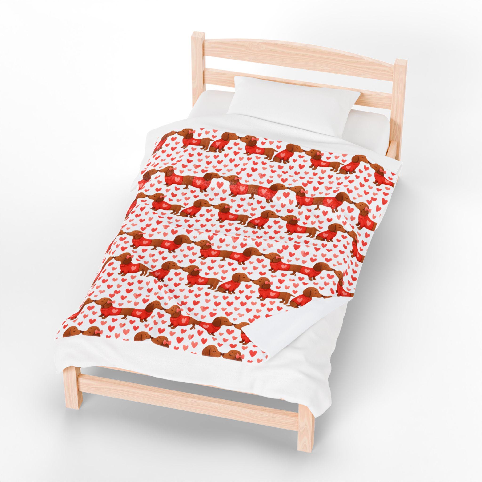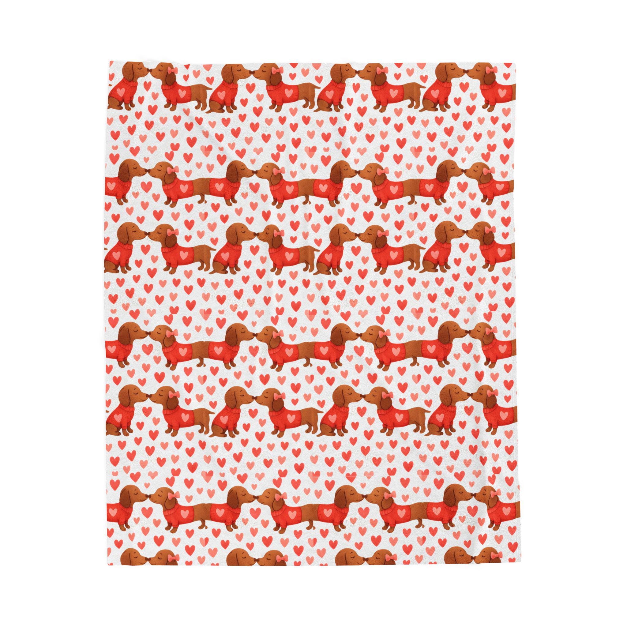 This velveteen plush blanket carries a playful dachshund-and-hearts pattern across a soft, slightly lustrous surface — small, joyful rows of long-bodied pups and scattered hearts that read like a cozy, affectionate repeat.