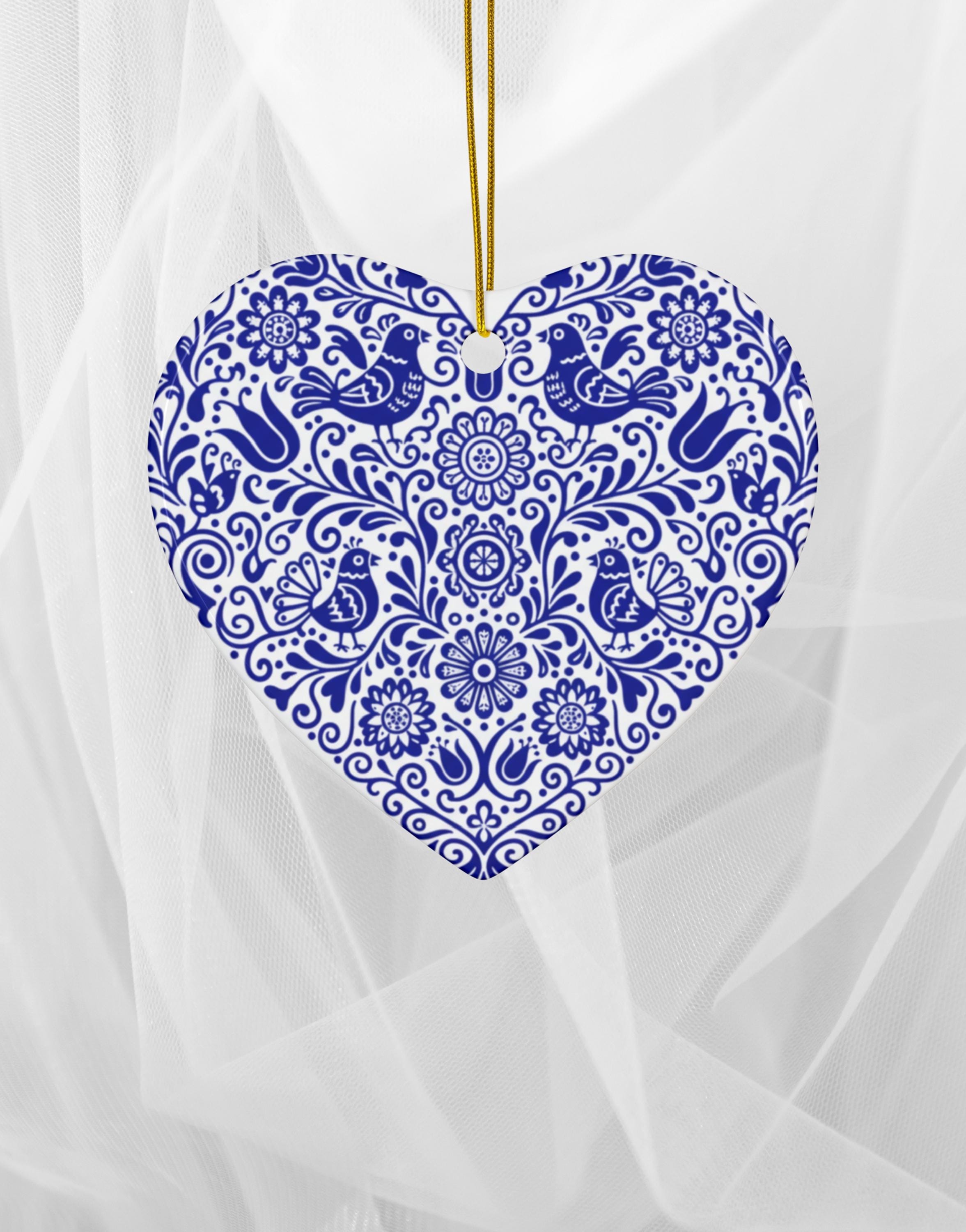 Hand-painted blue floral swirls curl across glossy white ceramic, captured in a single-sided ornament that feels like a quiet keepsake. Lightweight yet sturdy, this 3mm ceramic heart hangs from a gold-toned string and catches light on the tree or in a sunny window. It brings a calm, vintage-inspired charm to seasonal décor and small celebrations—an intimate accent that slips easily into mantel displays, heirloom boxes, or a holiday card bundle.