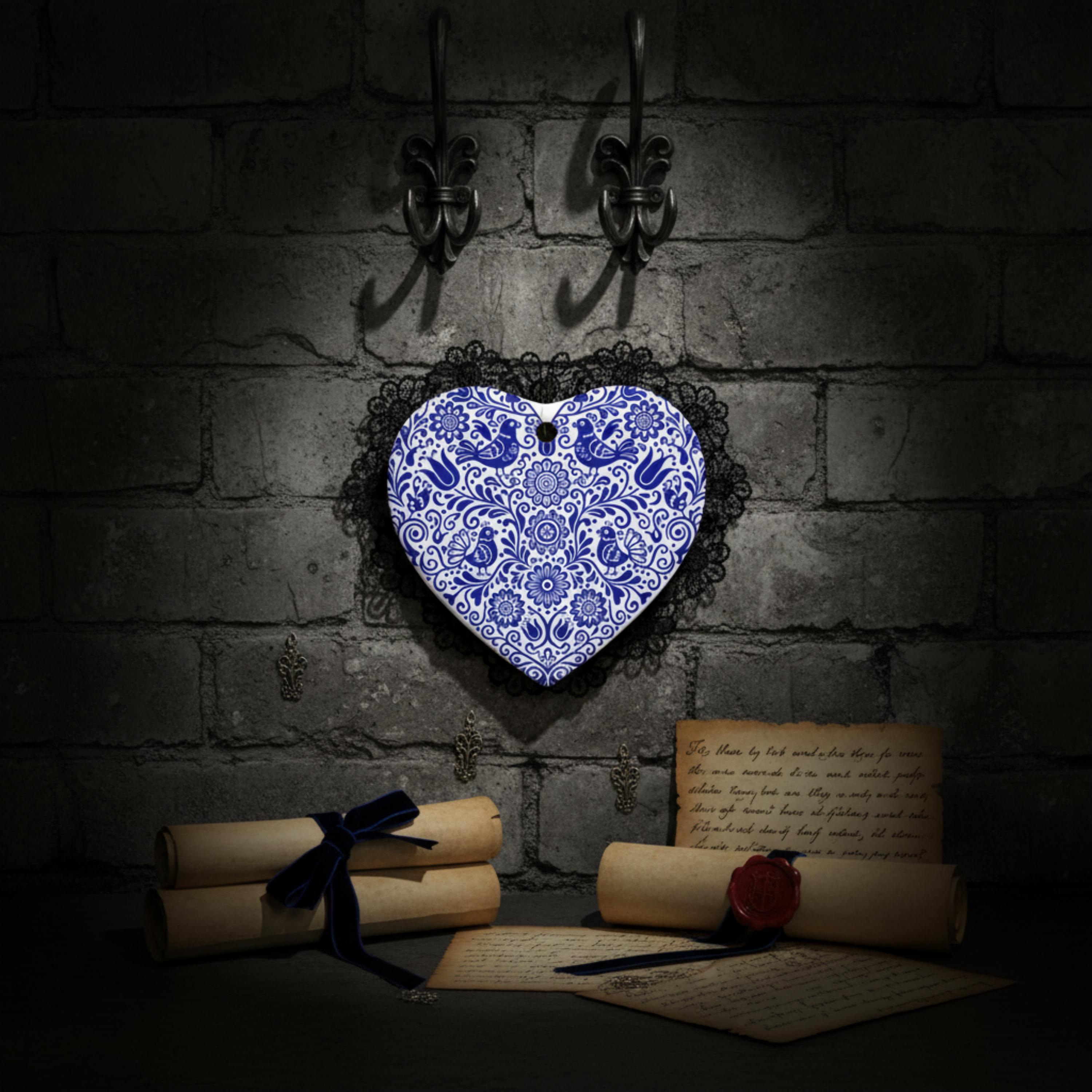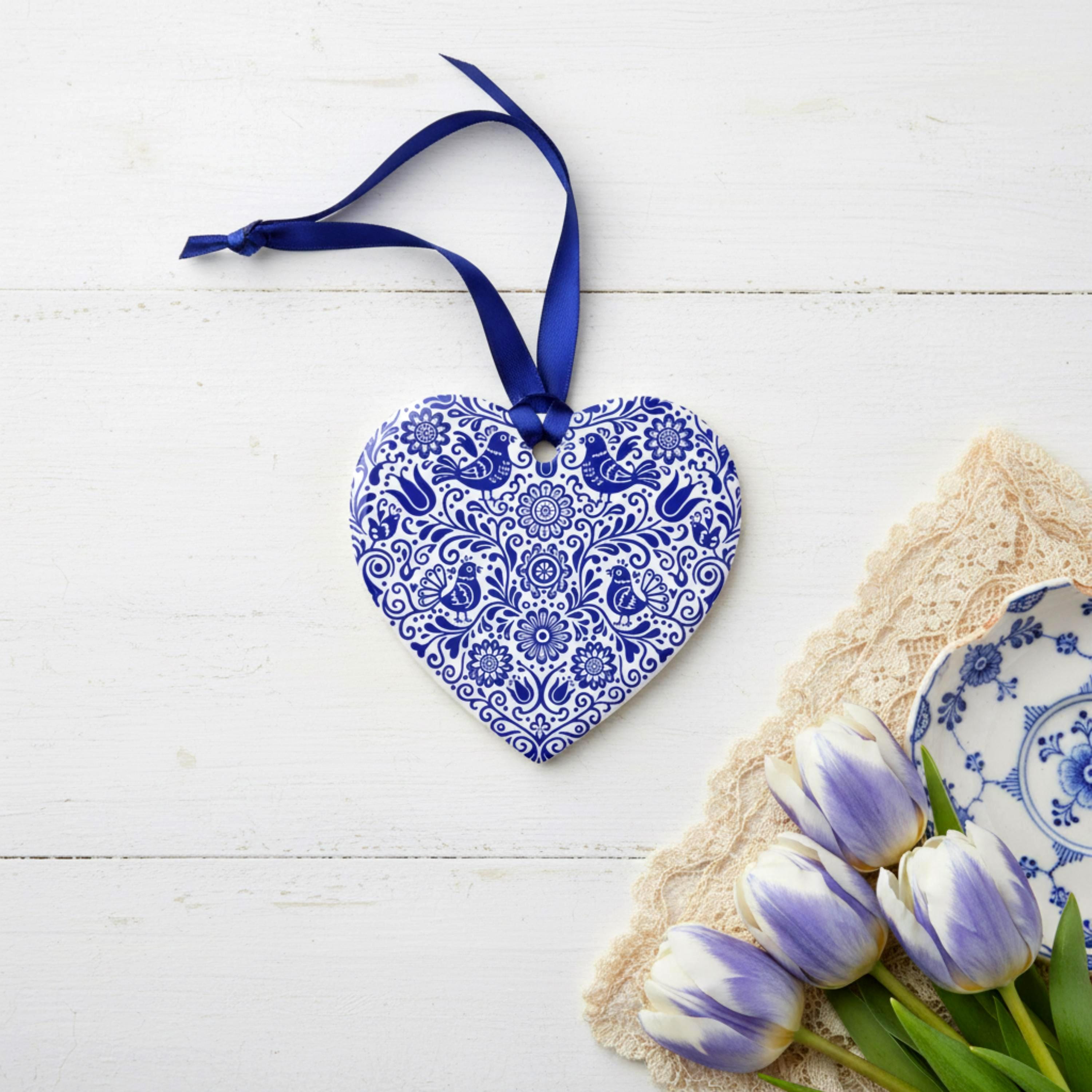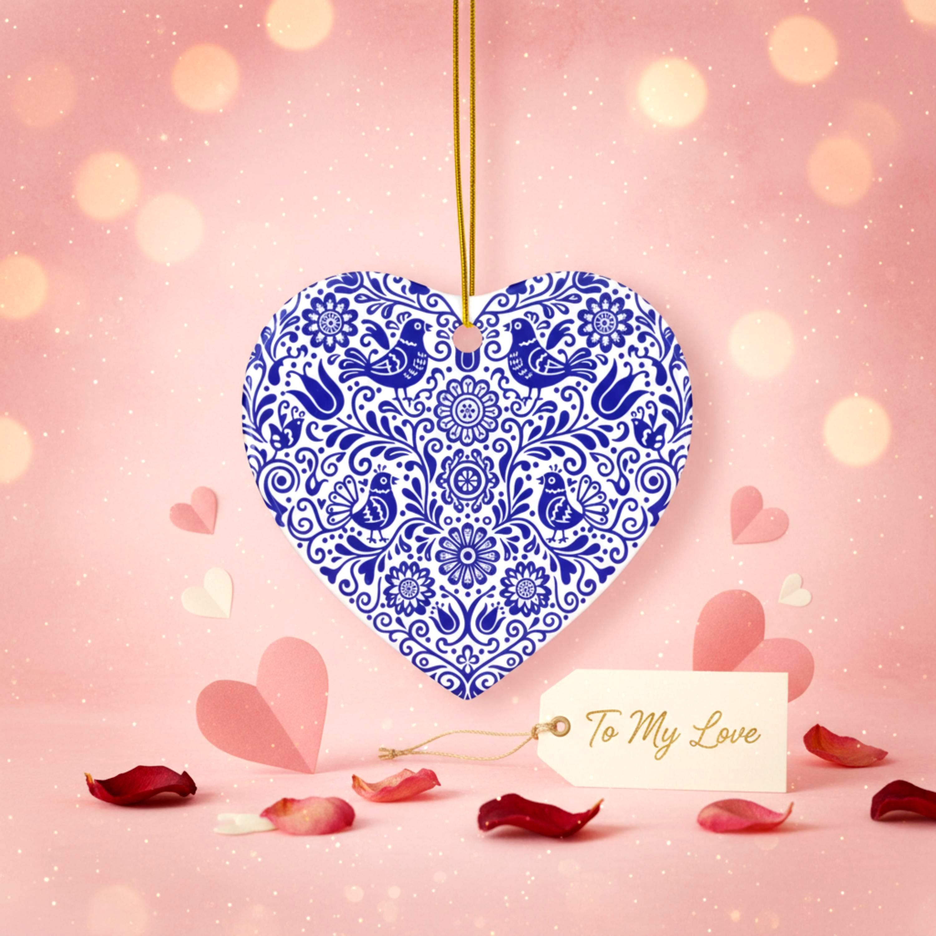 Hand-painted blue floral swirls curl across glossy white ceramic, captured in a single-sided ornament that feels like a quiet keepsake. Lightweight yet sturdy, this 3mm ceramic heart hangs from a gold-toned string and catches light on the tree or in a sunny window. It brings a calm, vintage-inspired charm to seasonal décor and small celebrations—an intimate accent that slips easily into mantel displays, heirloom boxes, or a holiday card bundle.