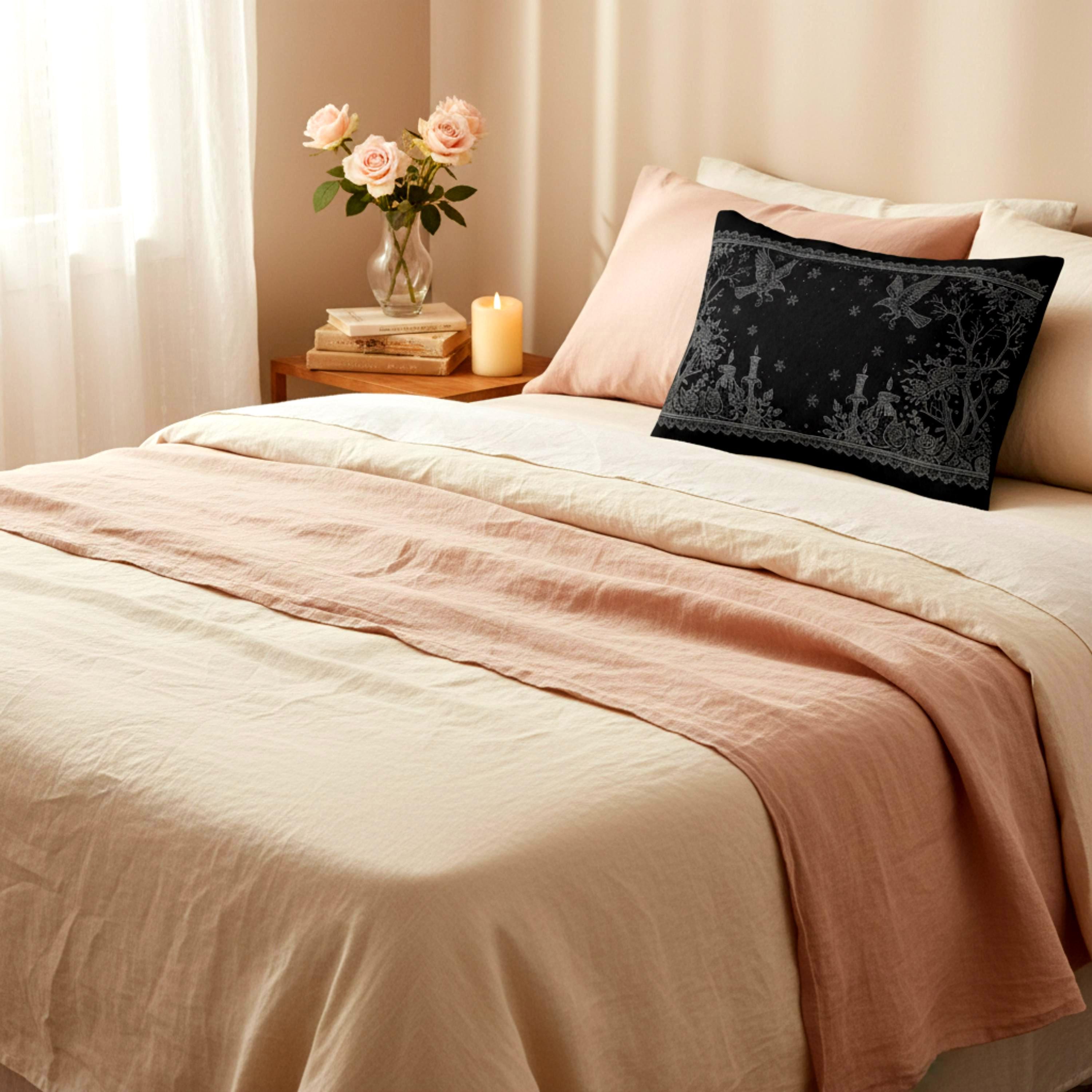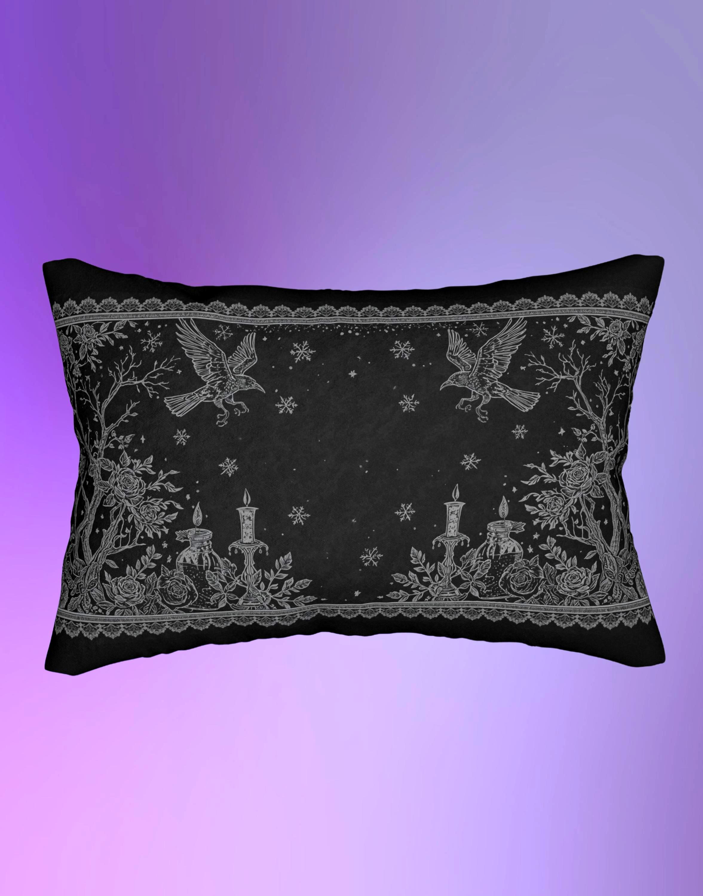 Soft grey illustrations — owls in flight, candlelit altars, and delicate lace borders — are printed on both sides against a deep, chalky black that feels like a midnight sketch. It sits low and long across a sofa or bed, adding subtle drama without shouting.