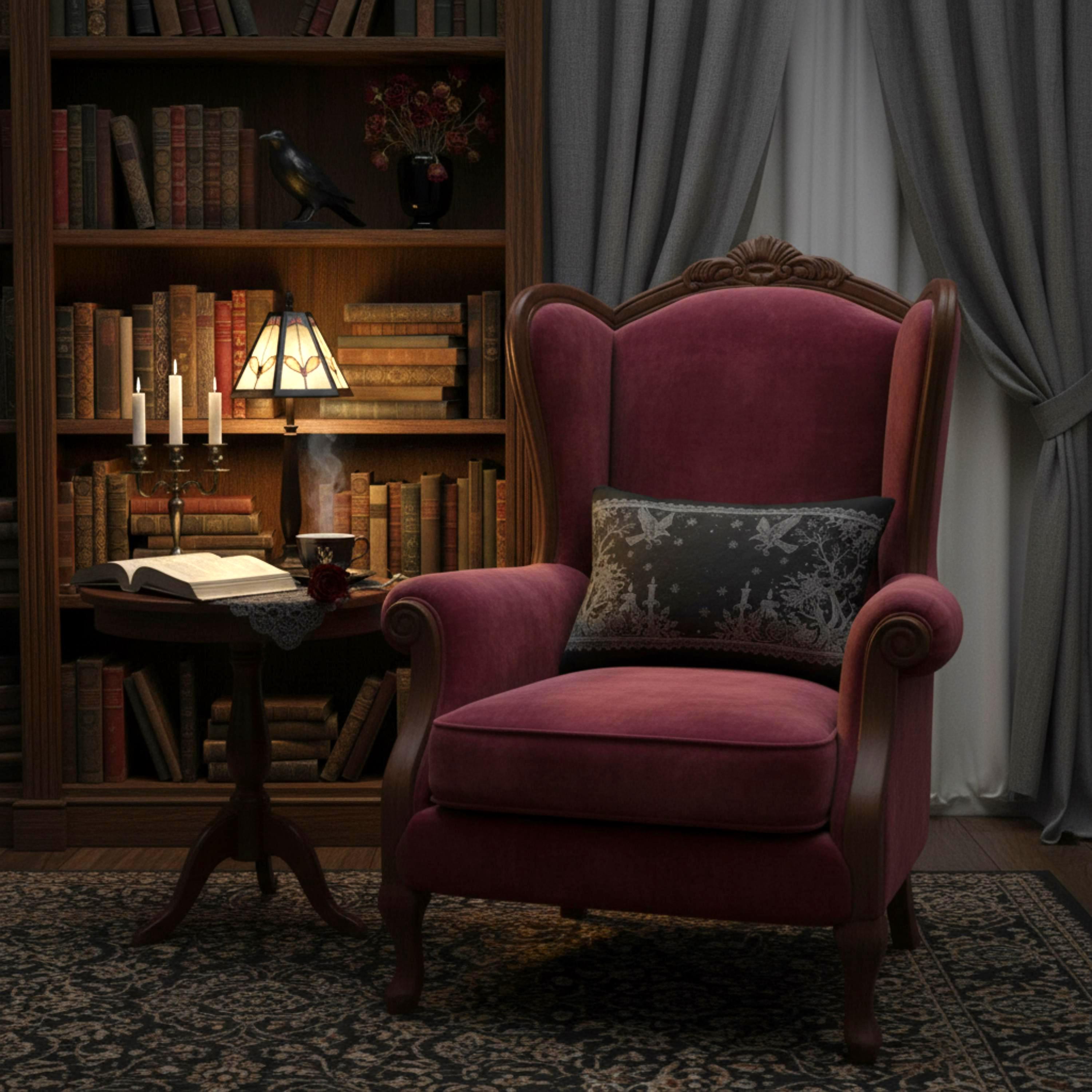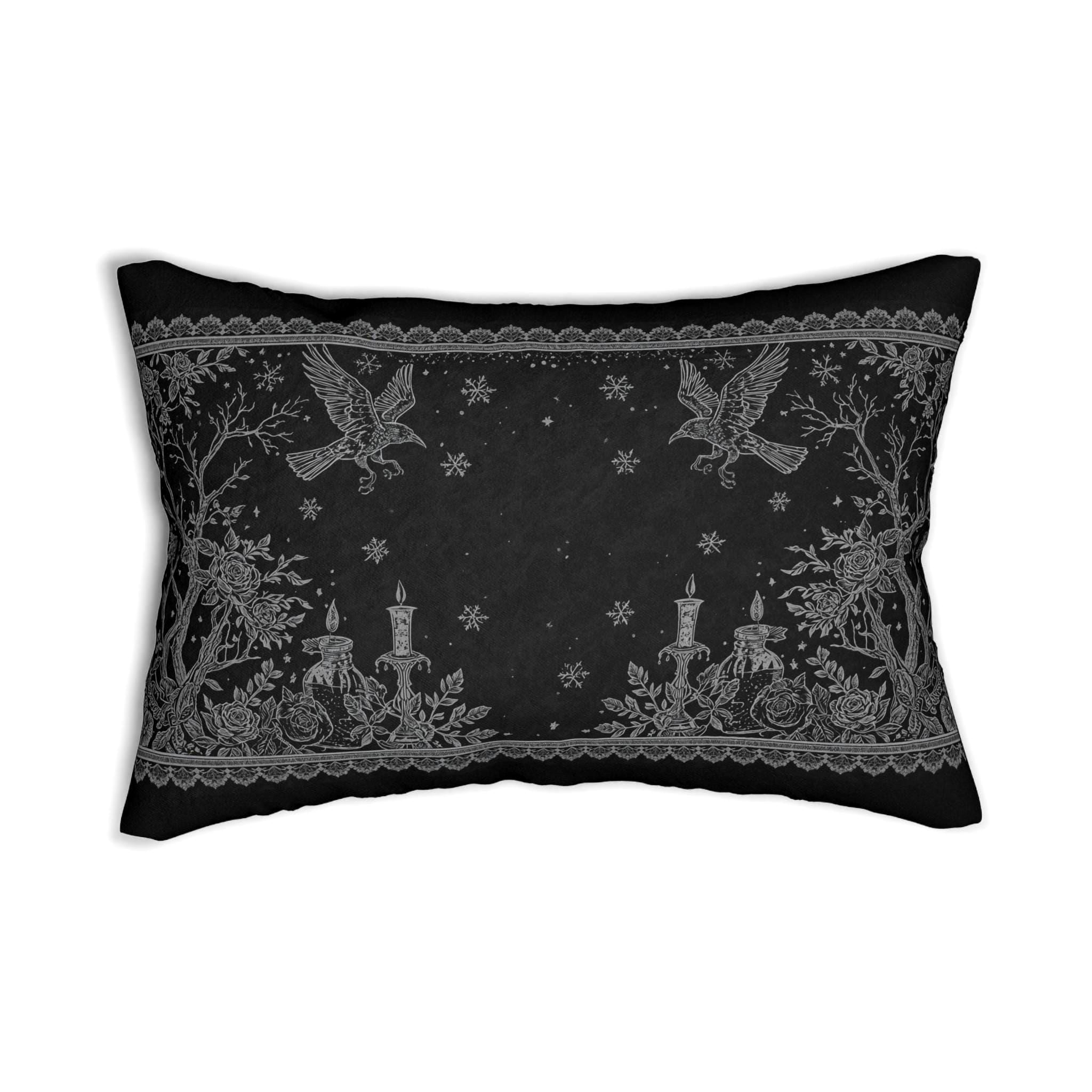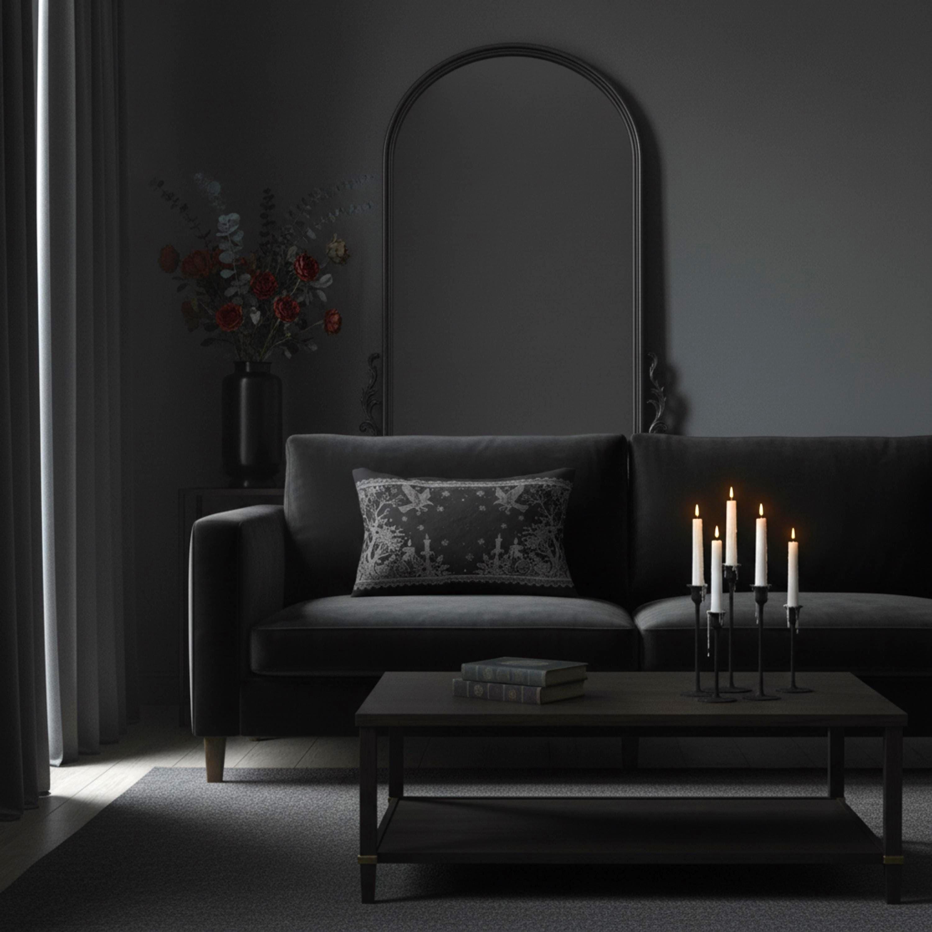 A charcoal lumbar pillow that brings a quietly gothic, vintage charm to a cozy nook.