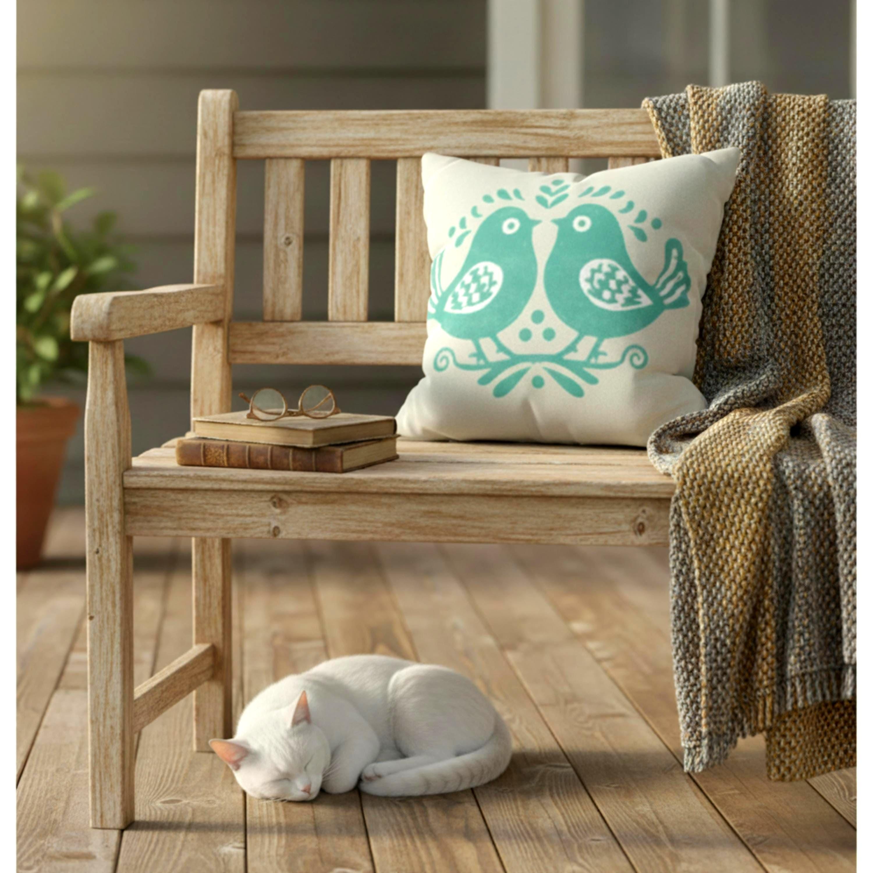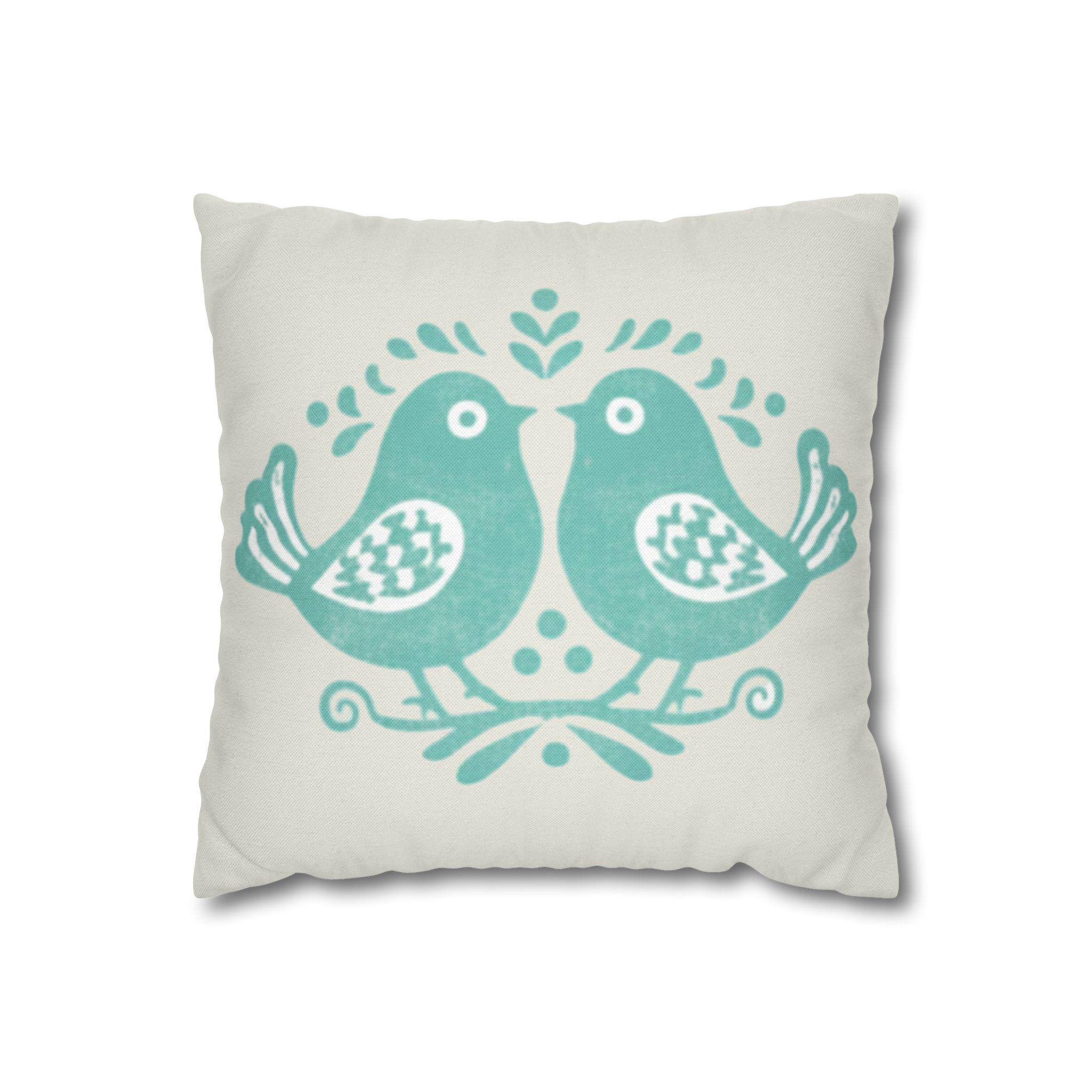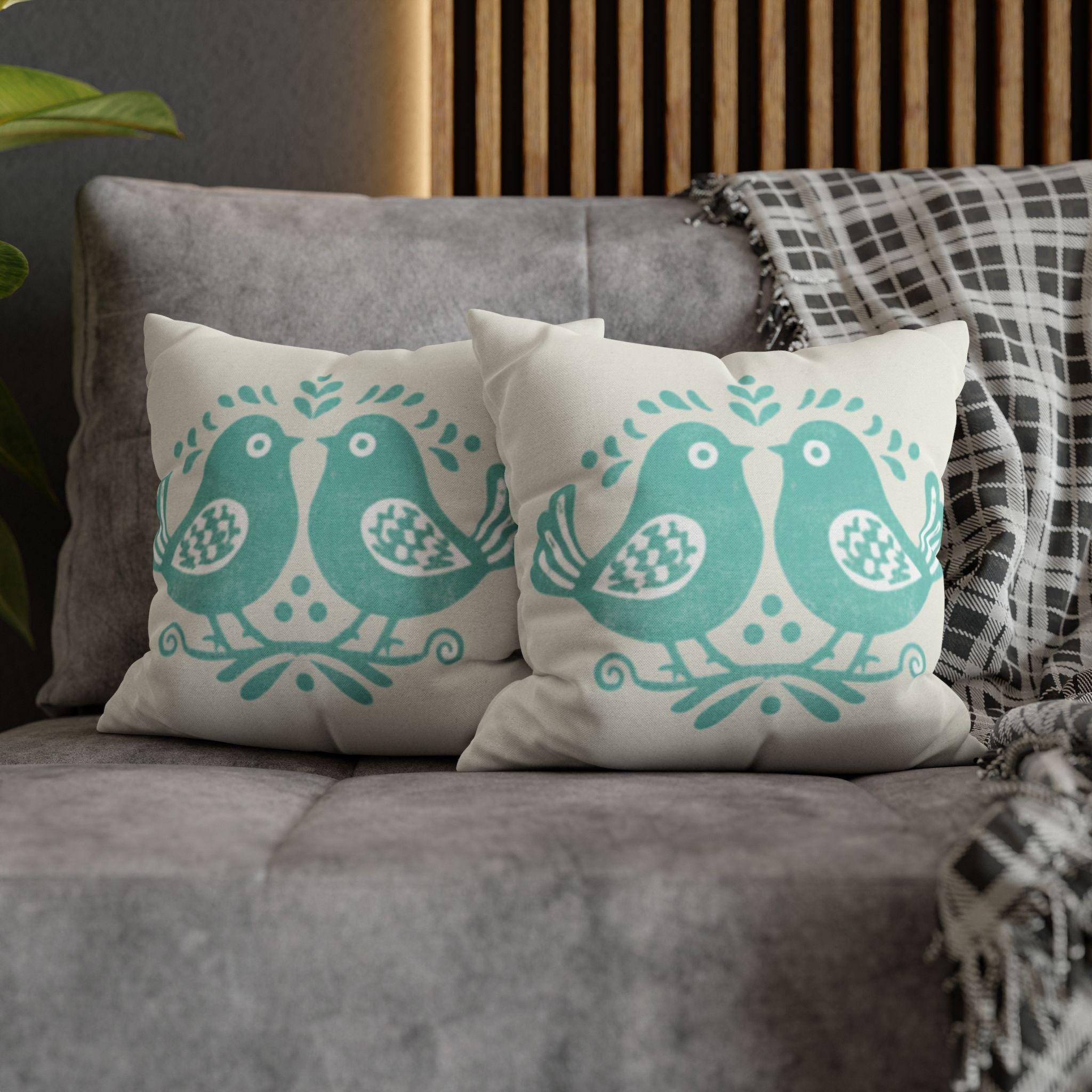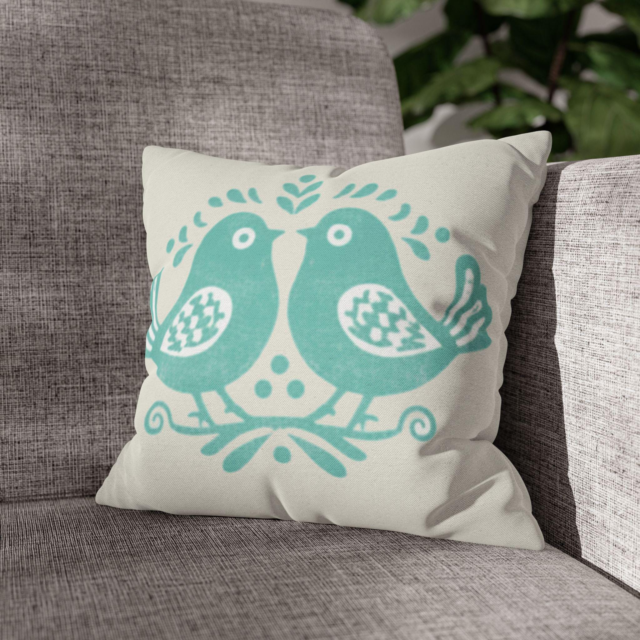 Bring a touch of folk charm and cozy warmth into your home with this beautiful teal lovebirds cushion cover.
