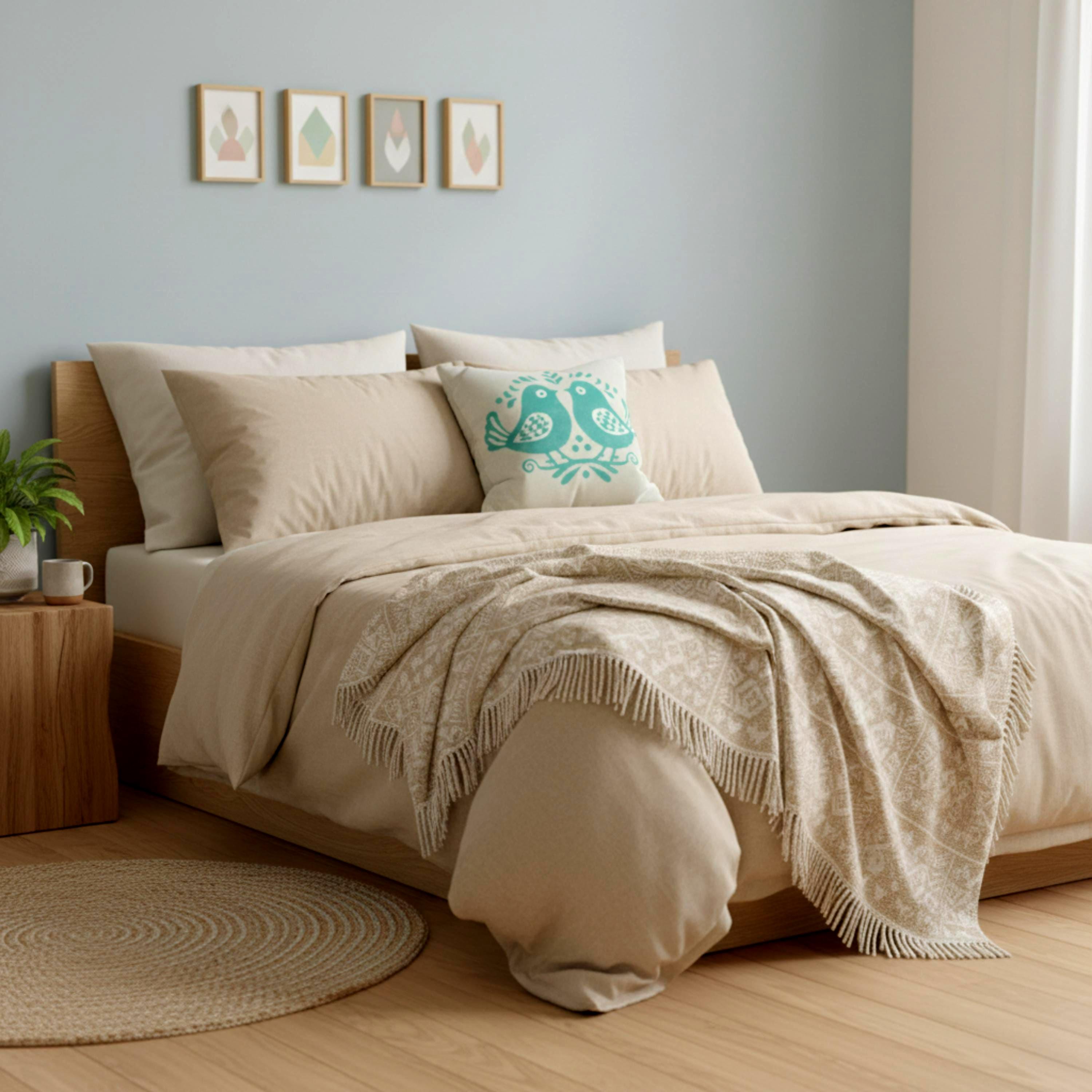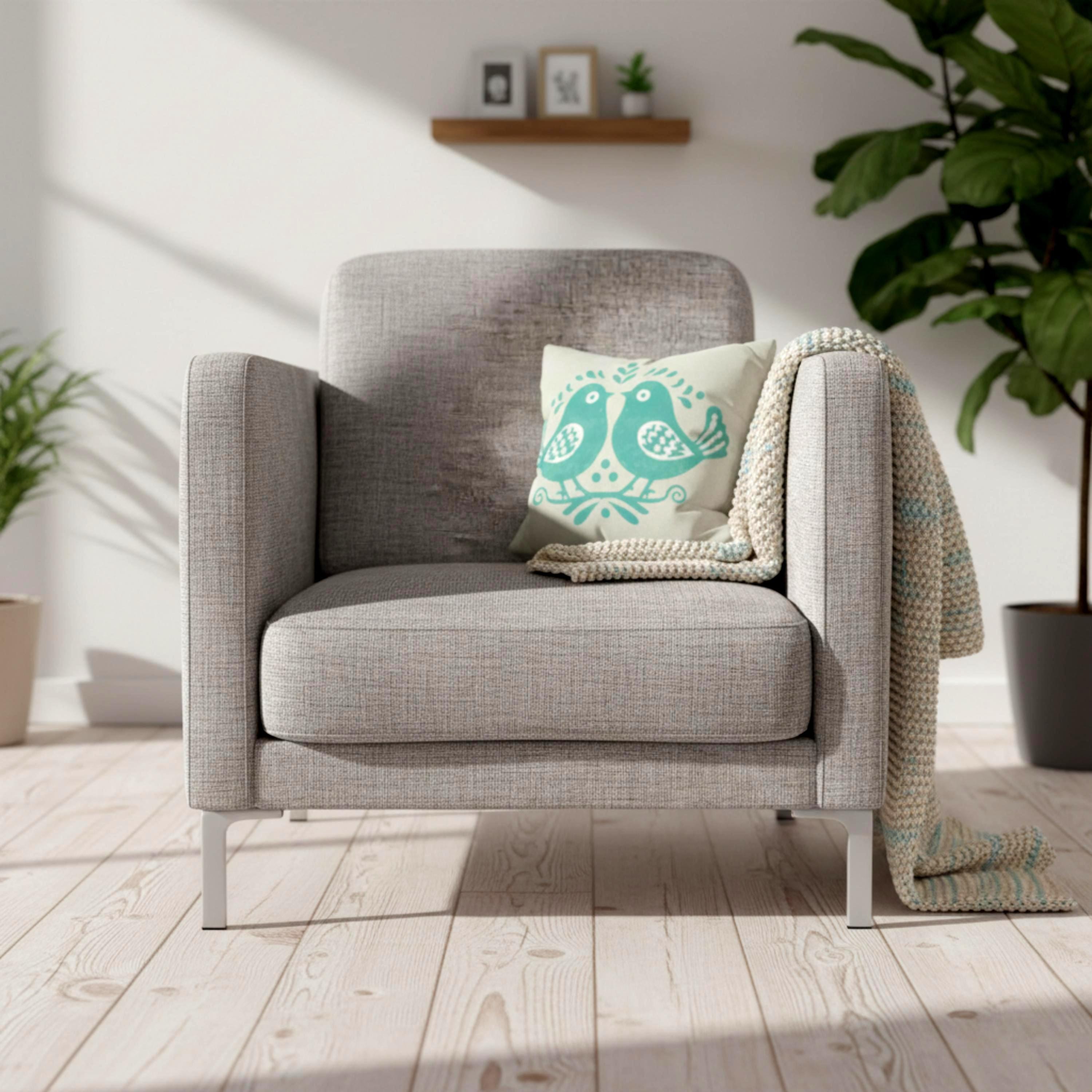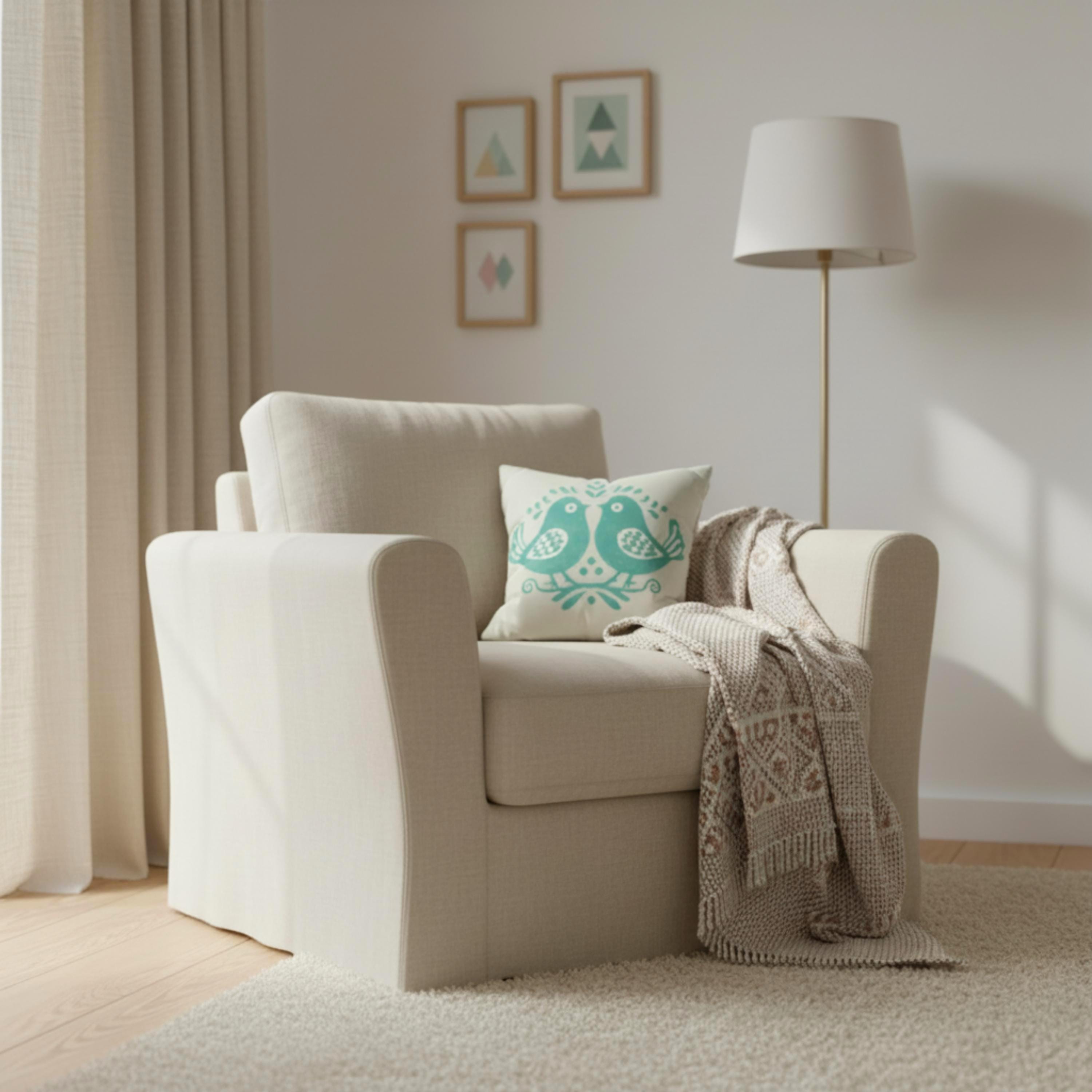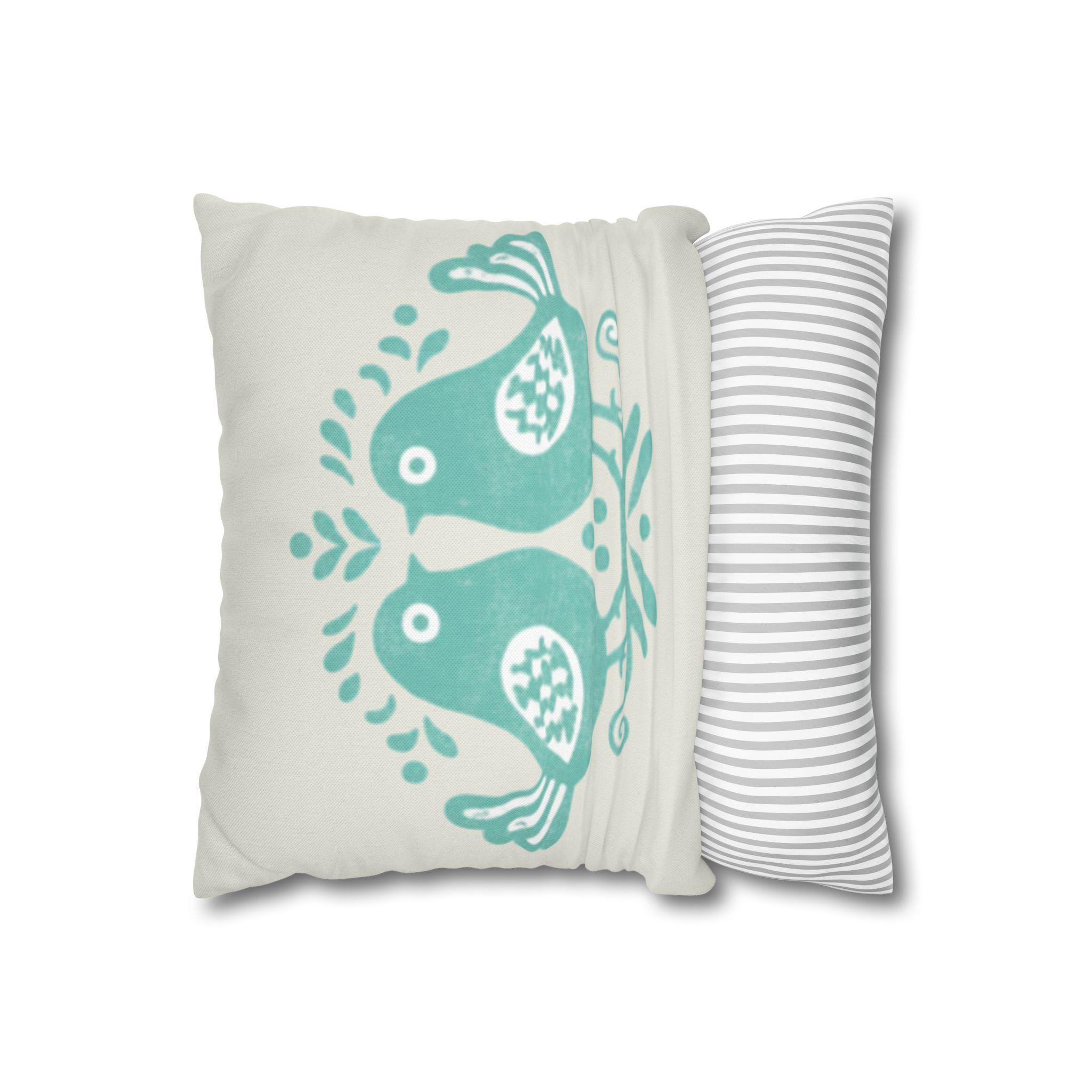 Bring a touch of folk charm and cozy warmth into your home with this beautiful teal lovebirds cushion cover.