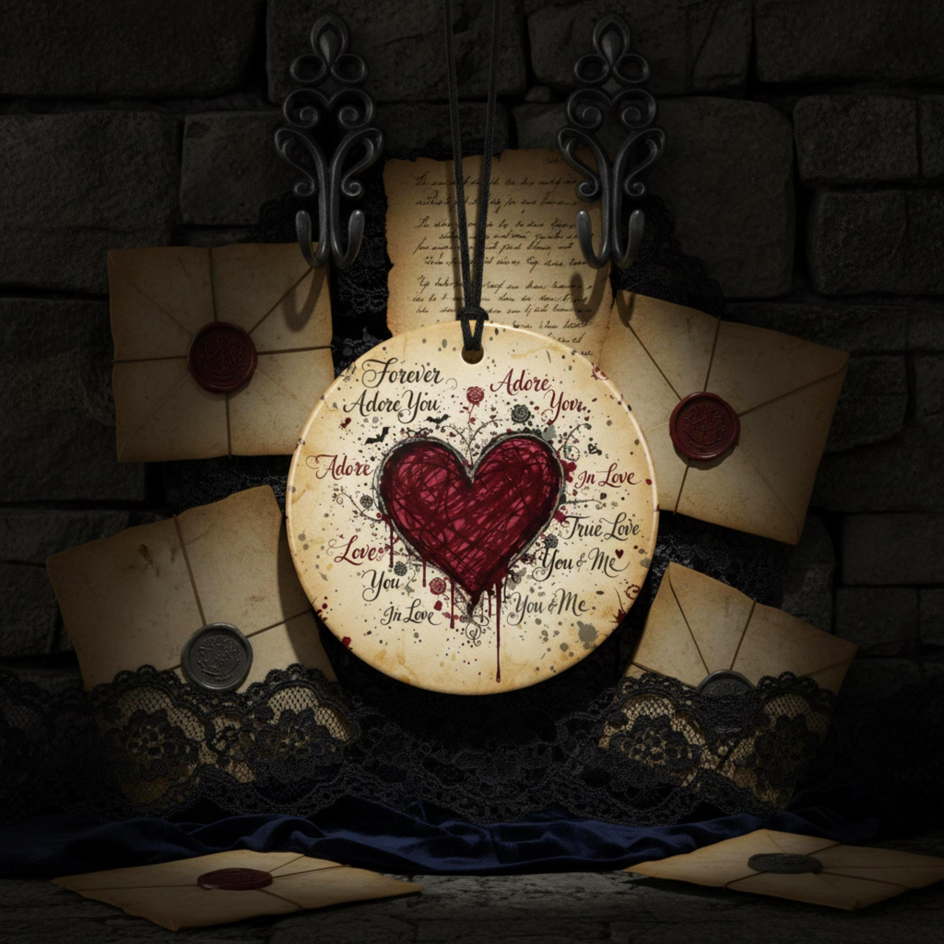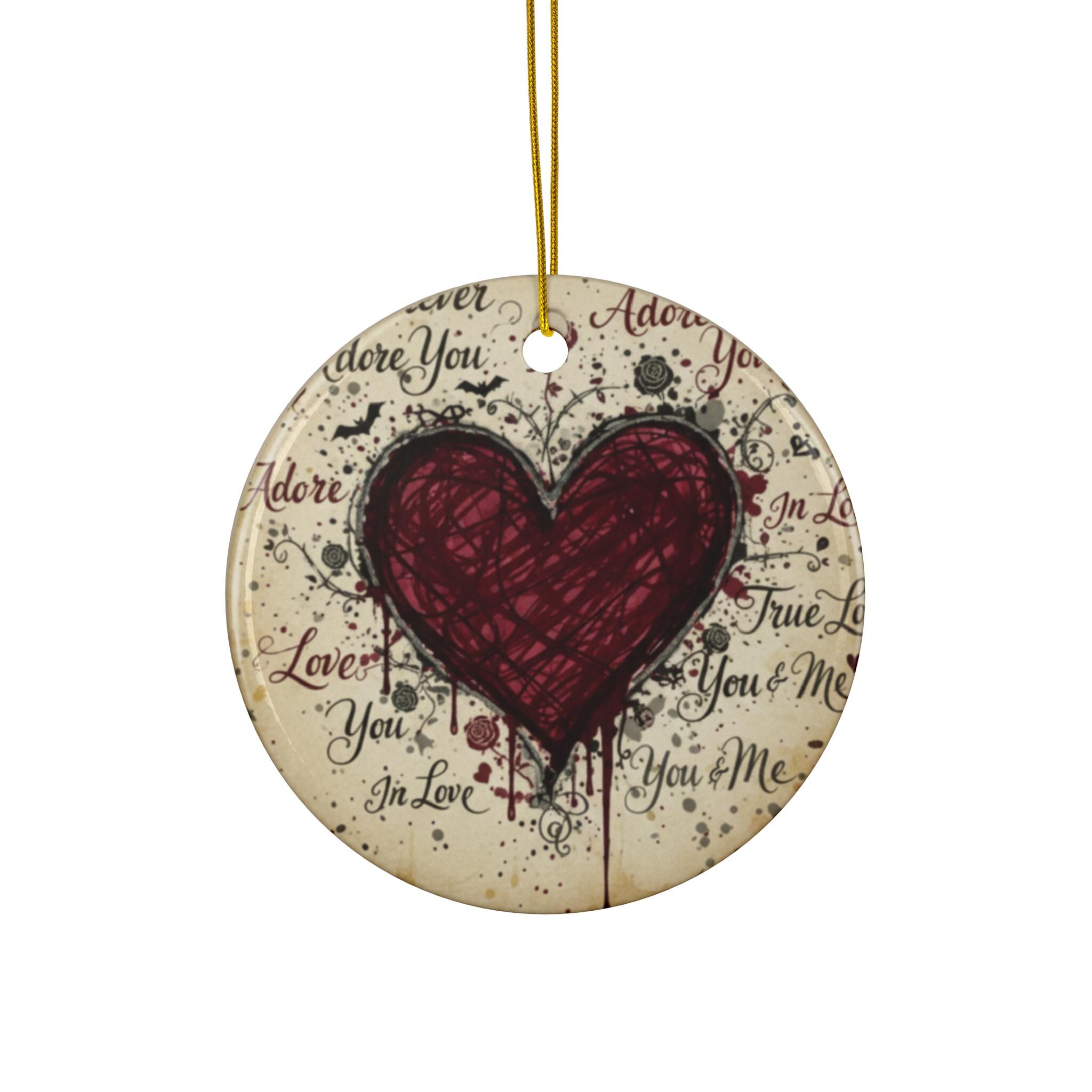 Crafted in elegant ceramic, this round ornament is inked with handwritten declarations of love in a hauntingly beautiful style. A striking scribbled heart sits at the center, surrounded by poetic chaos : words like "forever", "adore you", and "true love" swirl across the surface like a love letter from another realm.